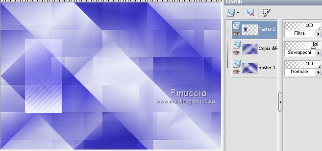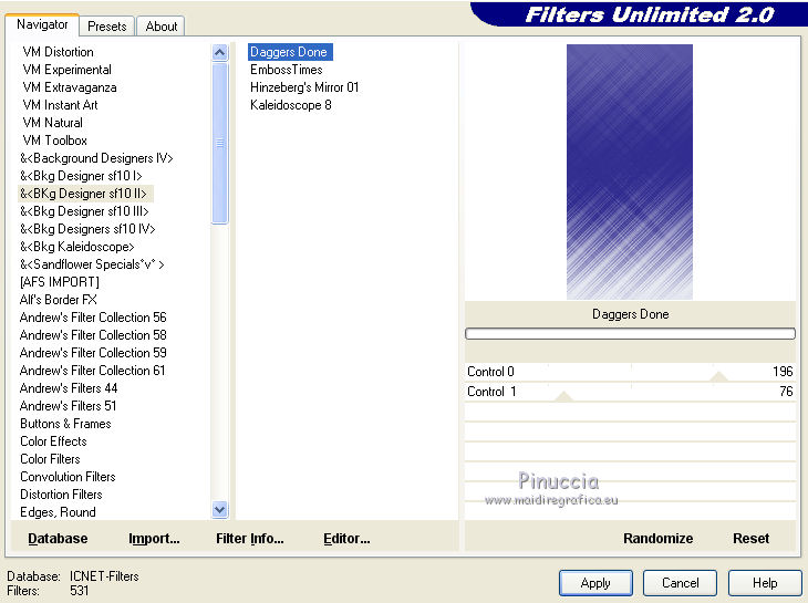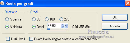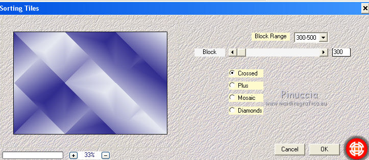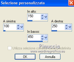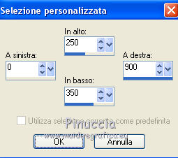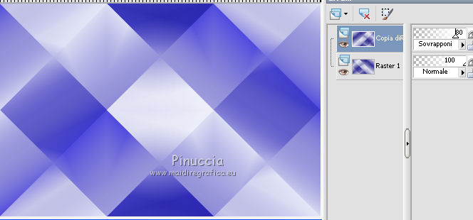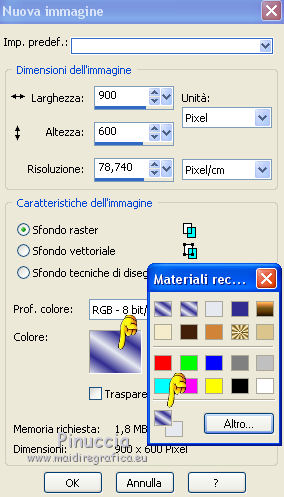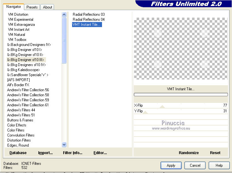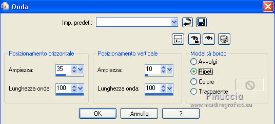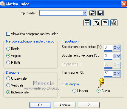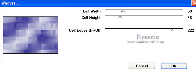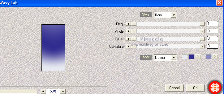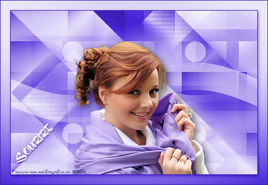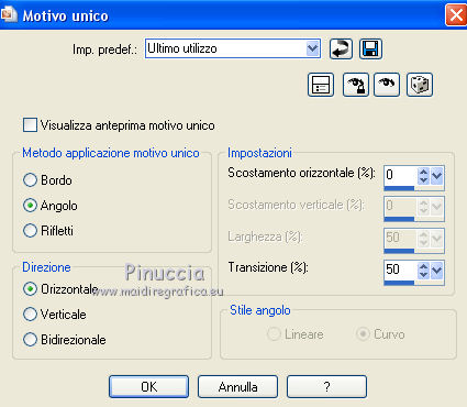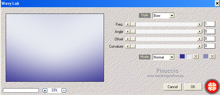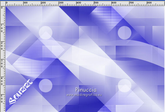 qui puoi trovare qualche risposta ai tuoi dubbi. Se l'argomento che ti interessa non è presente, ti prego di segnalarmelo. Questo tutorial è stato creato con CorelX3 e verificato con CorelX5, ma può essere realizzato anche con le altre versioni di PSP. Nelle versioni X4 e X5 il comando Immagine>Rifletti è stato sostituito con Immagine>Capovolgi in orizzontale, e il comando Immagine>Capovolgi con Immagine>Capovolgi in verticale. Nella versione X5, le funzioni sono state migliorate rendendo disponibili il menu Oggetti. Vedi la scheda sull'argomento qui Per tradurre questo tutorial ho usato PSP X. Occorrente: Un tube a scelta Il resto del materiale qui Per il tube della donna grazie TalaNat. I suoi tubes si condividono soltanto nei suoi gruppi. Filtri in caso di dubbi, ricorda di consultare la mia sezione filtri qui Filters Unlimited 2.0 qui &<Bkg Designersf10II> (da importare in Unlimited) qui &<Bkg Designer sf10III> (da importare in Unlimited) qui Mehdi - Wavy Lab, Sorting Tiles qui Toadies - Weaver qui I filtri Toadies si possono usare da soli o importati in Filters Unlimited. come fare vedi qui) Se un filtro fornito appare con questa icona ![]() Se utilizzi altri tubes e/o altri colori, puoi sperimentare le modalità di miscelatura e opacità più adatte. Apri il font e minimizzalo. Lo troverai nella lista dei font disponibili quando ti servirà. Metti la selezione nella cartella Selezioni. 1. Imposta il colore di primo piano con #312d90, e il colore di sfondo con #e7e9f1. ![]() Passa il colore di primo piano a Gradiente, stile Lineare, con i seguenti settaggi. ![]() 2. Apri una nuova immagine trasparente 900 x 600, sfondo impostato sul gradiente cliccando con il tasto sinistro del mouse sulla paletta del colore, avrai la tabella dei colori recenti; in basso a sinistra la paletta dei tuoi materiali; clicca sulla palettina corrispondente per impostare lo sfondo della nuova immagine. ![]() 3. Effetti>Plugins>Mehdi - Sorting Tiles. ![]() 4. Livelli>Duplica. Immagine>Rifletti. cambia la modalità di miscelatura di questo livello in Sovrapponi, e abbassa l'opacità all'80%. ![]() 5. Effetti>Plugins>Toadies - Weaver, con i settaggi standard. ![]() 6. Regola>Messa a fuoco>Accentua messa a fuoco. 7. Livelli>Nuovo livello raster. Attiva lo strumento Selezione ,clicca sull'icona Selezione personalizzata ![]() e imposta i seguenti settaggi: ![]() 8. Effetti>Plugins>Mehdi - Wavy Lab - Bow, con i settaggi standard. questo filtro lavora con i colori della paletta. Il primo è il colore di sfondo, il secondo quello di primo, lascia il terzo colore creato dal filtro in base ai primi due. ![]() 9. Effetti>Plugins>Filters Unlimited 2.0 - &<Bkg Designer sf 10II> - Daggers Done, con i settaggi standard. ![]() 10. Selezione>Deseleziona. Cambia la modalità di miscelatura di questo livello in Filtra. ![]() 11. Immagine>Ruota per gradi - 45 gradi a destra. ![]() 12. Effetti>Effetti di immagine>Motivo unico. ![]() Dovresti avere questo. ![]() 13. Livelli>Nuovo livello raster. Selezione>Carica/Salva selezione>Carica selezione da disco. Cerca e carica la selezione @qua_sourire_1. ![]() 14. Imposta il colore di sfondo con il colore bianco #ffffff. ![]() Imposta l'opacità dello strumento Riempimento a 50 ![]() Riempi la selezione con il colore bianco.Selezione>Deseleziona 15. Effetti>Plugins>Filters Unlimited 2.0 - &<Bkg Designer sf10III> - VMT Instant Tile ![]() 16. Livelli>Nuovo livello raster. Selezione personalizzata ![]() ![]() Riempi la selezione con il colore bianco #ffffff,sempre opacità 50 Selezione>Deseleziona. 17. Effetti>Effetti di distorsione>Onda. ![]() 18. Effetti>Effetti di immagine>Motivo unico. ![]() Risultato. ![]() 19. Attiva lo strumento Testo ![]() seleziona il font "0 racerCar Casual DNA", dimensione 48 ![]() Chiudi il colore di primo piano e mantieni il colore bianco come colore di sfondo. ![]() 20. Scrivi la parola "SOURIRE" o quello che preferisci. Livelli>Converti in livello raster. 21. Immagine>Ruota per gradi - 47 gradi a sinistra. ![]() Posiziona il testo in basso a sinistra,come nell'esempio. ![]() 22. Effetti>Effetti 3D>Sfalsa ombra. ![]() 23. Apri il tube della donna (il mio TalaNat_Leidi-25.21-02-2013) e vai a Modifica>Copia. Torna al tuo lavoro e vai a Modifica>Incolla come nuovo livello. Spostalo sul bordo inferiore,come nell'esempio ![]() 24. Effetti>Effetti 3D>Sfalsa ombra. ![]() 25. Regola>Messa a fuoco>Maschera di contrasto. ![]() 26. Attiva il livello copia di Raster 1. ![]() 27. Livelli>Duplica. Attiva nuovamente il livello superiore. Aggiungi il tuo nome e/o il tuo watermark su un nuovo livello. 28. Immagine>Aggiungi bordatura, 2 pixels, simmetriche, con il colore scuro #312d90. Immagine>Aggiungi bordatura, 35 pixels, simmetriche, con il colore chiaro #e7e9f1. Seleziona il bordo da 35 pixels con la bacchetta magica ![]() Riporta il colore di sfondo al colore iniziale, e inverti i colori della paletta (necessario per applicare il prossimo filtro). ![]() 29. Effetti>Plugins>Mehdi - Wavy Lab, con i settaggi precedenti. ![]() 30. Selezione>Inverti. Effetti>Effetti 3D>Sfalsa ombra. ![]() Selezione>Deseleziona. 31. Immagine>Aggiungi bordatura, 2 pixels, simmetriche, con il colore scuro #312d90. Salva in formato jpg. Per questi esempi ho usato tubes di TalaNat ![]() Maryse ![]() Grisi ![]() ![]() Se hai problemi o dubbi, o trovi un link non funzionante, o anche soltanto per un saluto, scrivimi. 29 Agosto 2013 |
