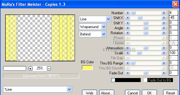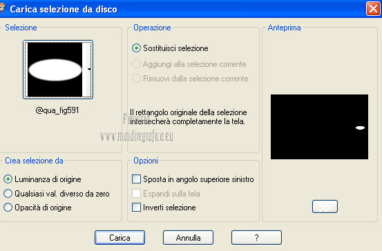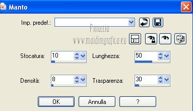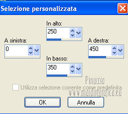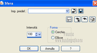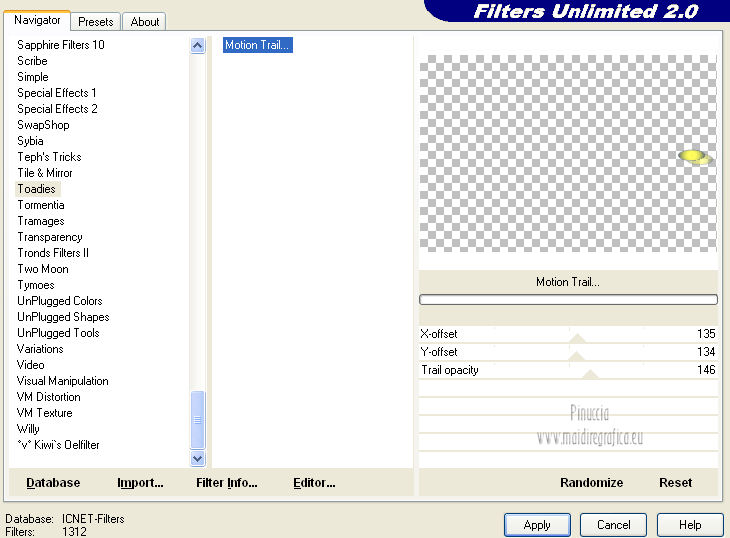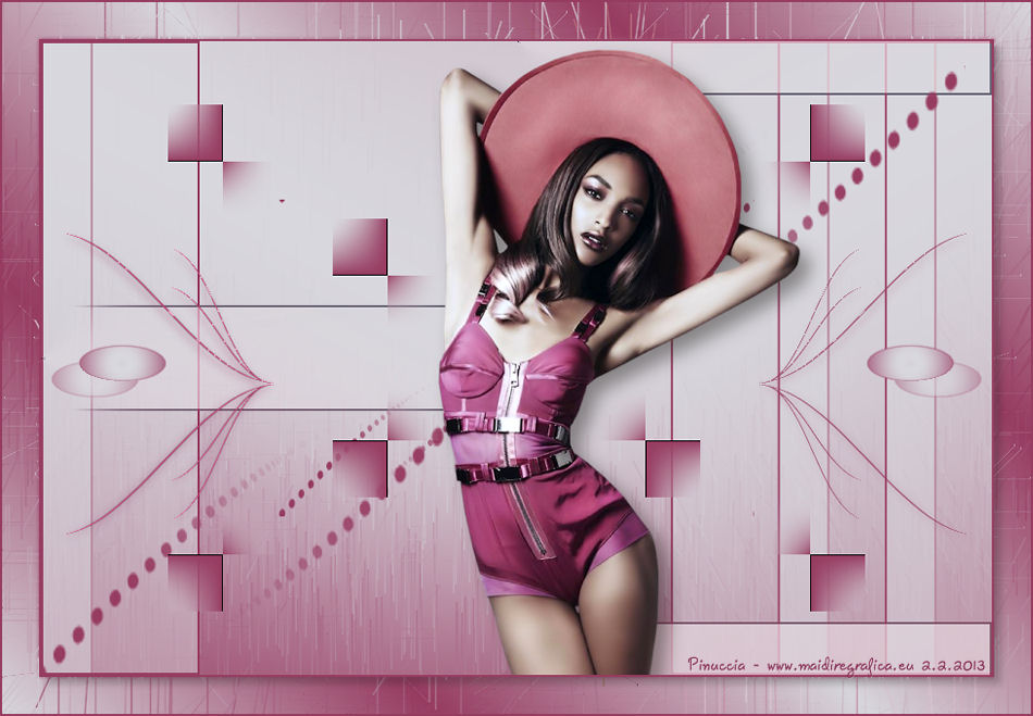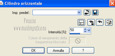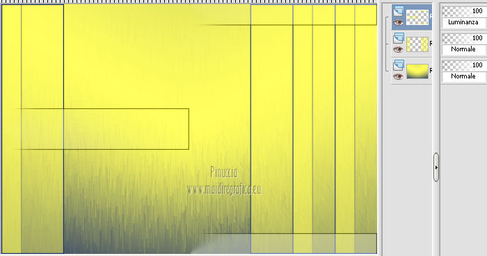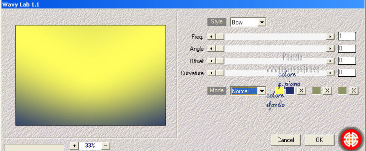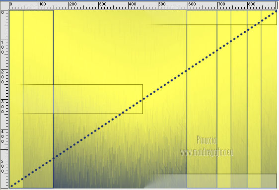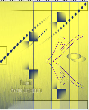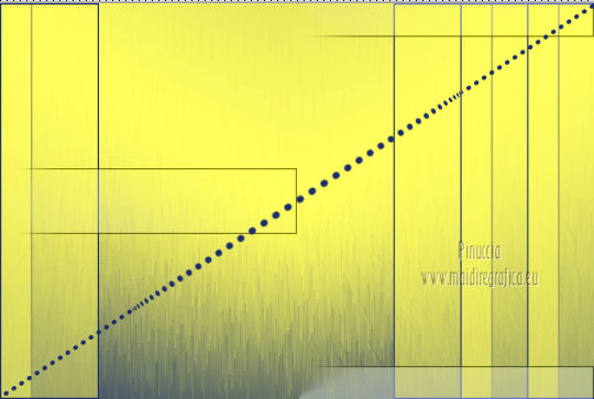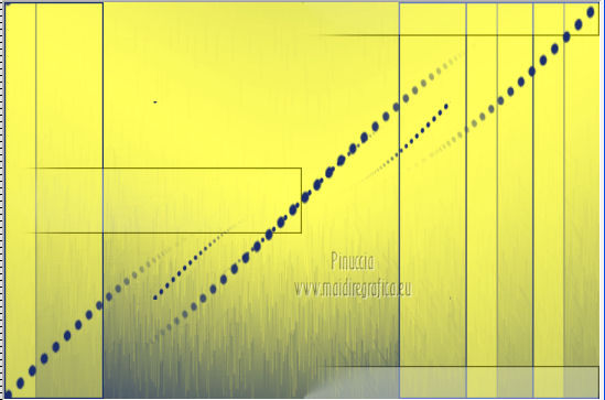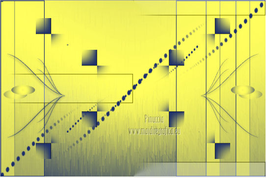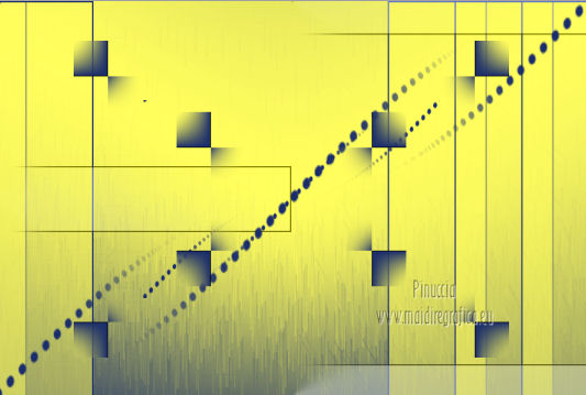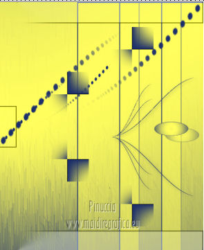 qui puoi trovare qualche risposta ai tuoi dubbi. Se l'argomento che ti interessa non è presente, ti prego di segnalarmelo. Questo tutorial è stato creato con PSP X3, ma può essere eseguito anche con le altre versioni di PSP. Per tradurlo, ho usato PSP X. Occorrente: Materiale qui Per il tube utilizzato grazie Jen. Filtri in caso di dubbi, ricorda di consultare la mia sezione filtri qui Filters Unlimited 2.0 qui Toadies qui Mehdi - Wavy Lab 1.1 qui Mura's Meister - Copies qui ![]() Apri il pennello in PSP ed esportalo come Pennello personalizzato. Vedi gli appunti sui pennelli qui Metti la linea di stile @qua-boules nella cartella Linee di stile. Metti la selezione nella cartella Selezioni. 1. Imposta il colore di primo piano con #1c2e6c, e il colore di sfondo con #fffd5d. ![]() 2. Apri una nuova immagine trasparente 900 x 600 pixels. 3. Effetti>Plugins>Mehdi - Wavy Lab 1.1 Il filtro lavora con i colori impostati. Il primo è il colore di sfondo, il secondo è il colore di primo piano. Non cambiare gli altri colori scelti dal filtro. ![]() 4. Effetti>Effetti di trama>Manto. ![]() 5. Livelli>Nuovo livello raster. Attiva lo strumento Selezione ,clicca sull'icona Selezione personalizzata ![]() e imposta i seguenti settaggi: ![]() Riempi la selezione con il colore scuro di primo piano.6. Selezione>Modifica>Contrai - 2 pixels. ![]() Premi sulla tastiera il tasto CANC. Imposta l'opacità dello strumento Riempimento a 50 ![]() Riempi la selezione con il colore chiaro di sfondo.Selezione>Deseleziona. 7. Effetti>Plugins>Mura's Meister - Copies. ![]() 8. Livelli>Nuovo livello raster. Selezione personalizzata ![]() ![]() Riempi la selezione con il colore scuro di primo piano, opacità 100 Selezione>Modifica>Contrai - 2 pixels. ![]() Premi sulla tastiera il tasto CANC. Riempi la selezione con il colore chiaro di sfondo, opacità 50 Selezione>Deseleziona. 9. Effetti>Effetti di immagine>Motivo unico, con i settaggi standard. ![]() Cambia la modalità di miscelatura di questo livello in Luminanza. ![]() 10. Attiva lo strumento Penna ![]() linea di stile @qua_boules ![]() larghezza 7 pixels Traccia una diagonale con il colore scuro di primo piano, come nell'esempio. ![]() Livelli>Converti in livello raster. 11. Effetti>Effetti geometrici>Sfera. ![]() Risultato. ![]() 12. Effetti>Effetti geometrici>Cilindro orizzontale. ![]() Risultato. ![]() 13. Effetti>Effetti di immagine>Motivo unico, con i settaggi precedenti. ![]() 14. Livelli>Duplica. Immagine>Ridimensiona, al 50%, tutti i livelli non selezionato. Dovresti avere questo. ![]() 15. Attiva nuovamente lo strumento Penna ![]() linea di stile Pieno - larghezza 7 pixels. ![]() Traccia una diagonale da sinistra a destra, sempre con il colore scuro di primo piano. ![]() Livelli>Converti in livello raster. 16. Effetti>Plugins>Toadies - Plain Mosaic Blur. ![]() 17. Livelli>Duplica. Immagine>Rifletti. Livelli>Unisci>Unisci giù. 18. Livelli>Duplica. Immagine>Capovolgi. Dovresti avere questo. ![]() 19. Livelli>Nuovo livello raster. Selezione>Carica/Salva selezione>Carica selezione da disco. Cerca e carica la selezione @qua_fig591. ![]() 20. Prima di applicare il filtro, che lavora con i colori impostati nella paletta, inverti i colori di primo piano/sfondo. ![]() Effetti>Plugins>Mehdi - Wavy Lab 1.1. ![]() Selezione>Deseleziona. 21. Effetti>Plugins>Toadies - Motion Trail. attenzione, questo effetto si trova anche in VM Toolbox, in VM Stylize e nelle Factory Gallery M, Per questo, se è già presente in questi filtri, per usare Motion Trail di Toadies, dovrai rimuovere gli altri filtri ![]() 22. Livelli>Duplica. Immagine>Rifletti. 23. Livelli>Nuovo livello raster. Attiva lo strumento Pennello ![]() cerca e seleziona il pennello @qua_1. ![]() Applica il pennello a destra con il colore scuro (che adesso si trova impostato come colore di sfondo, quindi per applicare il pennello dovrai cliccare con il tasto destro del mouse). ![]() Dovresti avere questo ![]() 24. Livelli>Duplica - 2 volte. Livelli>Unisci>Unisci giù. Immagine>Rifletti. Dovresti avere questo. ![]() Regola>Messa a fuoco>Metti a fuoco. 25. Apri il tube Jen_Vrouw179_11-01-2010 e vai a Modifica>Copia. Torna al tuo lavoro e vai a Modifica>Incolla come nuovo livello. Immagine>Ridimensiona, al 75%, tutti i livelli non selezionato. Immagine>Rifletti. Sposta il tube come nel mio esempio.26. Effetti>Effetti 3D>Sfalsa ombra. ![]() 27. Immagine>Aggiungi bordatura, 2 pixels, simmetriche, con il colore scuro. Immagine>Aggiungi bordatura, 35 pixels, simmetriche, con il colore chiaro. Seleziona questo bordo con la bacchetta magica ![]() 28. Passa il colore di primo piano a Gradiente lineare. ![]() Riempi la selezione con il gradiente, opacità 100 29. Effetti>Effetti di trama>Manto. ![]() Selezione>Inverti. 30. Effetti>Effetti 3D>Sfalsa ombra. ![]() Selezione>Deseleziona. 31. Immagine>Aggiungi bordatura, 2 pixels, simmetriche, con il colore scuro. 32. Firma il tuo lavoro e salva in formato jpg. Per questi esempi ho usato tubes di Mary ![]() ClaudiaViza ![]() Thafs ![]() ![]() Se hai problemi o dubbi, o trovi un link non funzionante, o anche soltanto per un saluto, scrivimi. 1 Febbraio 2013 |