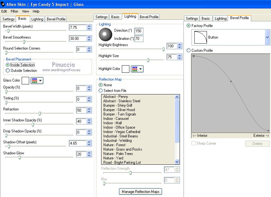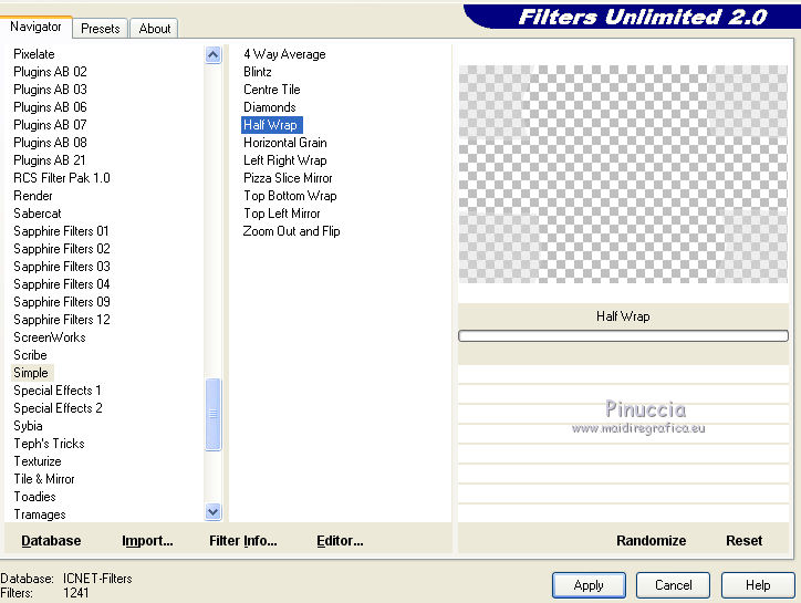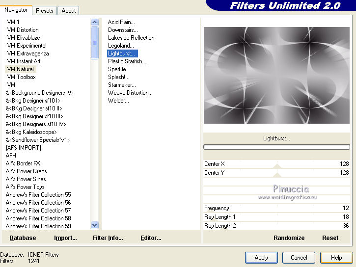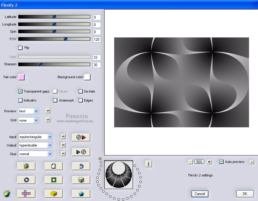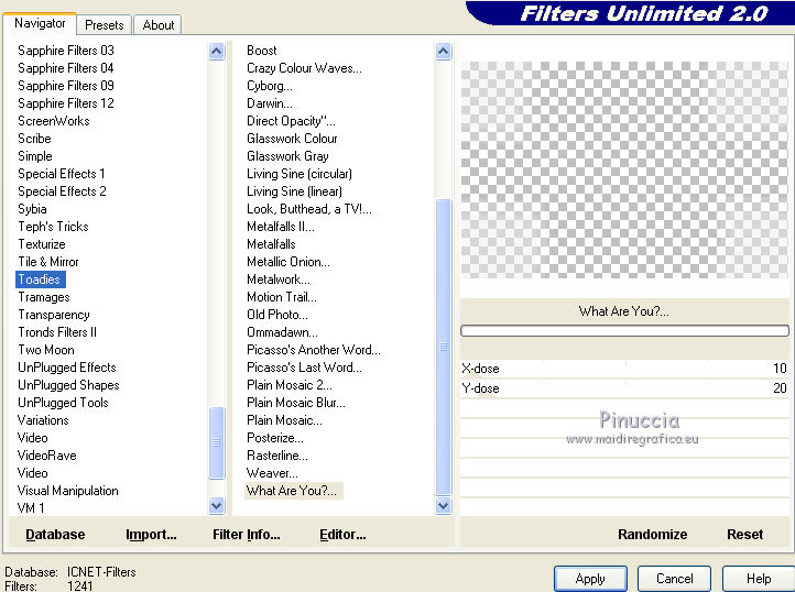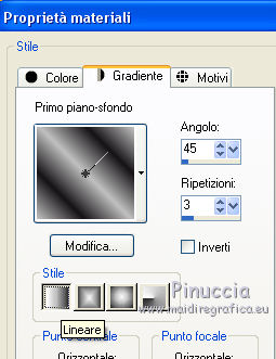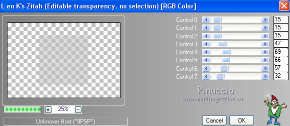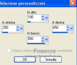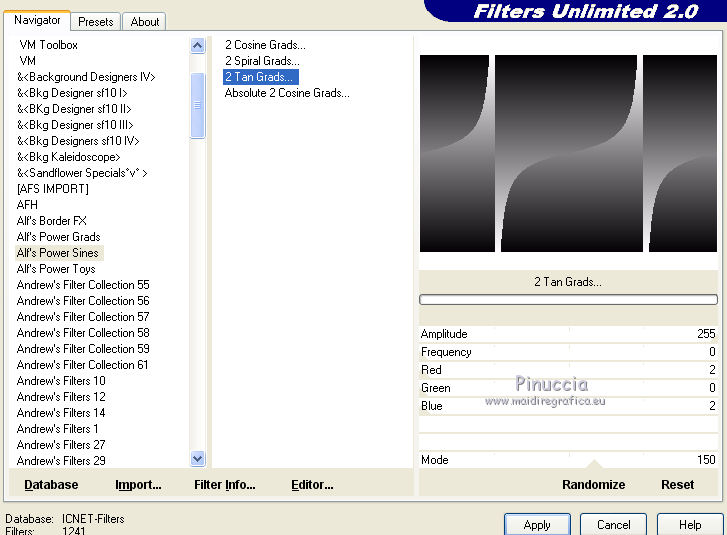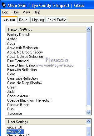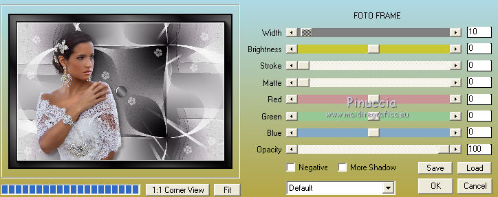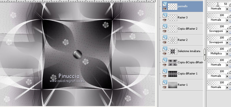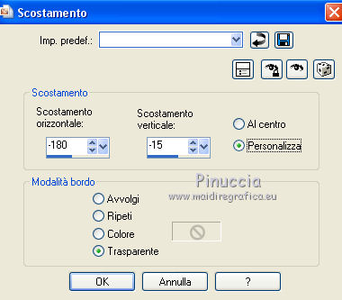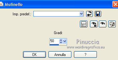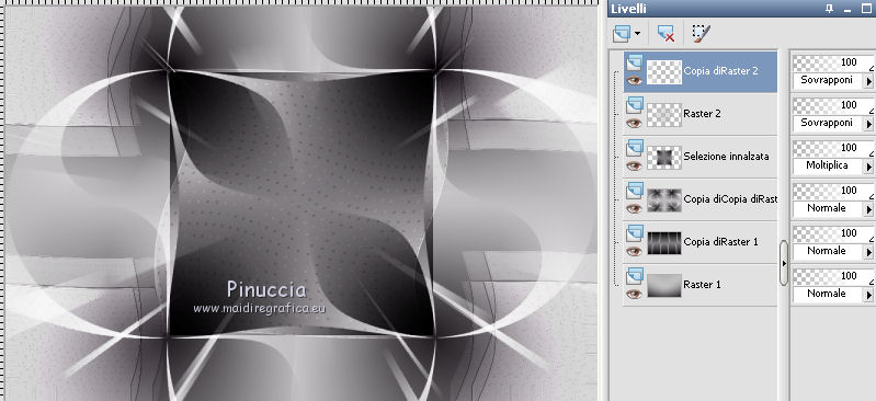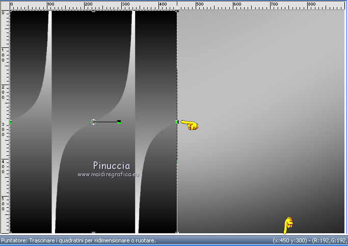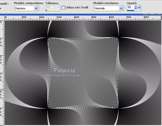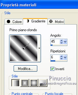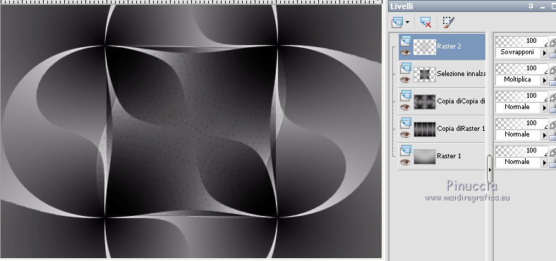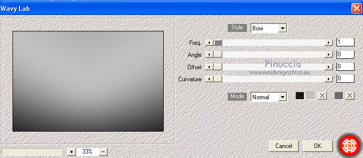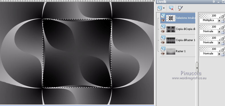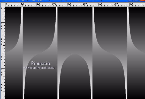 qui puoi trovare qualche risposta ai tuoi dubbi. Se l'argomento che ti interessa non è presente, ti prego di segnalarmelo. Questo tutorial è stato creato con CorelX7, ma può essere realizzato anche con le altre versioni di PSP. Dalla versione X4, il comando Immagine>Rifletti è stato sostituito con Immagine>Capovolgi in orizzontale, e il comando Immagine>Capovolgi con Immagine>Capovolgi in verticale. Nelle versioni X5 e X6, le funzioni sono state migliorate rendendo disponibile il menu Oggetti. Con la nuova versione X7, sono tornati Rifletti/Capovolgi, ma con nuove funzioni. Vedi la scheda sull'argomento qui Per tradurre questo tutorial ho usato PSP X. Occorrente: Materiale qui Per il tube della donna grazie Grisi. Filtri in caso di dubbi, ricorda di consultare la mia sezione filtri qui Filters Unlimited 2.0 qui Alf's Power Sines - 2tan Gras qui Mehdi - Wavy Lab qui L&K's - L&K's Zitah qui Alien Skin Eye Candy 5 Impact - Glass qui AAA Frames - Foto Frame qui Flaming Pear - Flexify 2 qui Simple qui I filtri Alf's Power Sines e Simple si possono usare da soli o importati in Filters Unlimited (come fare vedi qui) Se un filtro fornito appare con questa icona A seconda della versione di Unlimited utilizzata potresti ottenere risultati differenti. Per il mio esempio, per avere un risultato simile a quello del tutorial originale, ho usato la versione di Unlimited che non si installa, ma è composta da files in formato 8bf. La trovi qui ![]() Se utilizzi altri tubes e/o altri colori, puoi sperimentare le modalità di miscelatura e opacità più adatte. Metti il preset Cliccando sul file una o due volte (a seconda delle tue impostazioni), automaticamente il preset si installerà nella cartella corretta. perchè uno o due clic vedi qui Metti il pennello nella cartella Pennelli. Attenzione, il pennello è composto da due files che non devono essere separati. Vedi gli appunti sui pennelli qui 1. Imposta il colore di primo piano con #c0c0c0, e il colore di sfondo con #161316. ![]() 2. Apri selections_alpha_topgirl. Duplica l'immagine usando la combinazione di tasti maiuscola+D, oppure Modifica>Copia/Modifica>Incolla come nuova immagine. Chiudi l'originale e lavora sulla copia. L'immagine non è vuota, ma contiene una selezione salvata sul canale alfa. 3. Effetti>Plugins>Mehdi - Wavy Lab. questo filtro lavora con i colori della paletta: il primo è il colore di sfondo, il secondo quello di primo piano; mantieni il terzo colore creato dal filtro. ![]() 4. Livelli>Duplica. Effetti>Plugins>Filters Unlimited 2.0 - Alf's Power Sines - 2tan Gras. ![]() 5. Premi il tasto K per attivare lo strumento Puntatore ![]() se stai usando PSP 9 il tasto D per attivare lo strumento Deformazione ![]() in modalità Scala spingi il nodo centrale a destra,verso l'interno fino a 450 pixels. ![]() Premi il tasto M per deselezionare o lo strumento. 6. Livelli>Duplica. Immagine>Rifletti. Livelli>Unisci>Unisci giù. Dovresti avere questo. ![]() 7. Livelli>Duplica. Effetti>Plugins>Flaming Pear - Flexify 2 ![]() 8. Attiva lo strumento Selezione ![]() (non importa il tipo di selezione impostato, perchè con la selezione personalizzata si ottiene sempre un rettangolo) clicca sull'icona Selezione personalizzata ![]() e imposta i seguenti settaggi. ![]() 9. Selezione>Innalza selezione a livello. Cambia la modalità di miscelatura di questo livello in Moltiplica. ![]() 10. Livelli>Nuovo livello raster. Abbassa l'opacità dello strumento Riempimento a 50, e riempi la selezione con il colore chiaro di primo piano #c0c0c0.![]() Selezione>Deseleziona. 11. Effetti>Plugins>L&K's - L& K's Zitah. ![]() 12. Effetti>Effetti di bordo>Aumenta di più. 13. Effetti>Effetti di distorsione>Mulinello. ![]() 14. Cambia la modalità di miscelatura di questo livello in Sovrapponi, o secondo i tuoi colori. ![]() 15. Livelli>Duplica. Effetti>Plugins>Filters Unlimited 2.0 - Simple - Half Wrap. ![]() 16. Effetti>Plugins>Filters Unlimited - Toadies - What are you. ![]() Effetti>Effetti di bordo>Aumenta di più. 17. Dovresti avere questo. ![]() Se il livello ti sembra troppo spento o troppo pallido, cambia la modalità di miscelatura in Luce netta o secondo i tuoi colori. 18. Attiva il livello copia 2 di Raster 1. ![]() 19. Effetti>Plugins>Filters unlimited 2.0 - VM Natural - Lightburst, con i settaggi standard. ![]() 20. Attiva nuovamente il livello superiore. ![]() 21. Livelli>Nuovo livello raster. Selezione>Carica/Salva selezione>Carica selezione da canale alfa. La selezione sélection#1 è subito disponibile. Devi soltanto cliccare Carica. ![]() 22. Passa il colore di primo piano a Gradiente di primo piano/sfondo, stile Lineare. ![]() Riporta l'opacità dello strumento Riempimento a 100 ![]() e riempi la selezione con il gradiente.23. Effetti>Plugins>Alien Skin Eye Candy 5 Impact - Glass. Seleziona il preset @qua_21 e ok. ![]() Questi i settaggi che puoi copiare in caso di problemi con il preset. ![]() Selezione>Deseleziona. 24. Effetti>Effetti 3D>Sfalsa ombra. ![]() 25. Livelli>nuovo livello raster. Imposta il colore di primo piano con il colore bianco #ffffff. 26. Attiva lo strumento Pennello ![]() cerca e seleziona il pennello @qua_deco_girl ![]() e applicalo come nell'esempio, cliccando con il tasto sinistro del mouse per usare il colore bianco di primo piano. ![]() Effetti>Effetti 3D>Sfalsa ombra, con i settaggi precedenti. ![]() Per il mio esempio ho abbassato l'opacità di questo livello al 50%. ![]() 27. Apri il tube Grisi_Woman_824, e vai a Modifica>Copia. Torna al tuo lavoro e vai a Modifica>Incolla come nuovo livello. Immagine>Ridimensiona, al 60%, tutti i livelli non selezionato. Effetti>Effetti di immagine>Scostamento. ![]() Effetti>Effetti 3D>Sfalsa ombra., ![]() 28. Immagine>Aggiungi bordatura, 2 pixels, simmetriche, colore bianco #ffffff. Immagine>Aggiungi bordatura, 35 pixels, simmetriche, con il colore scuro #161316. 29. Attiva lo strumento Bacchetta magica ![]() e clicca nel bordo da 35 pixels per selezionarlo. 30. Cambia i settaggi d