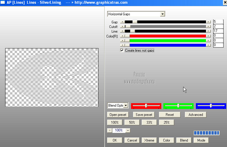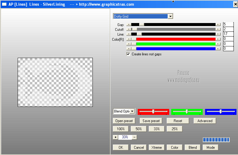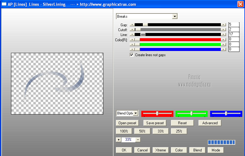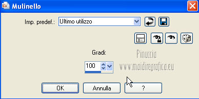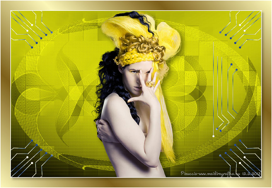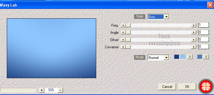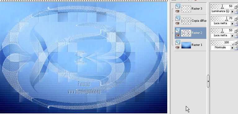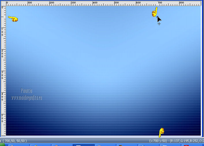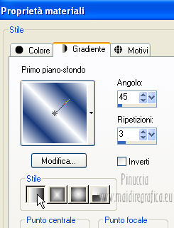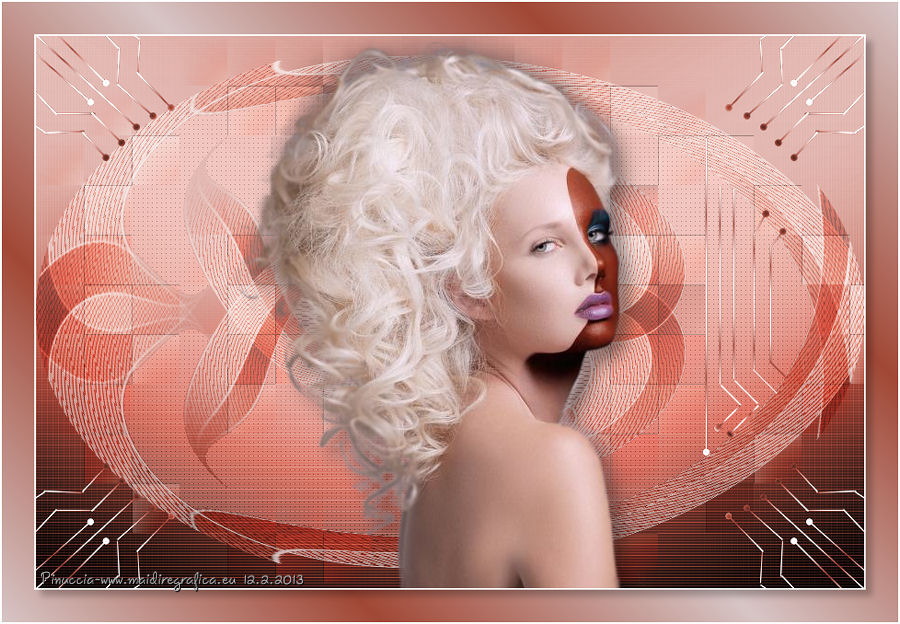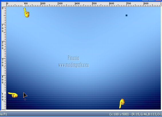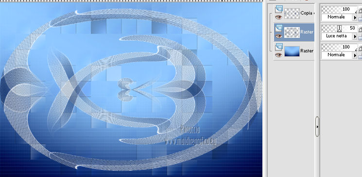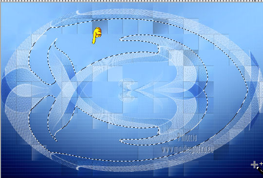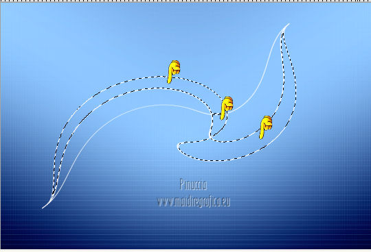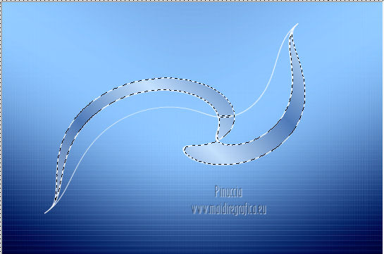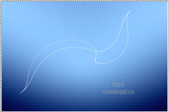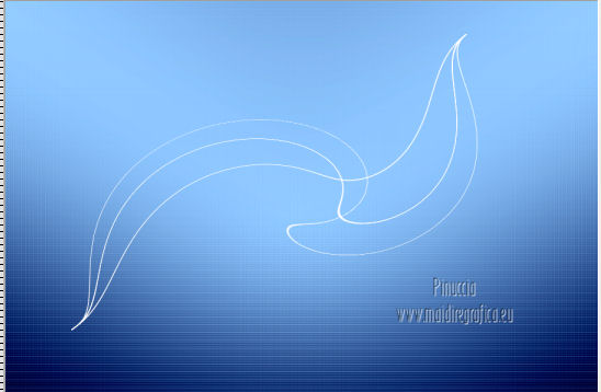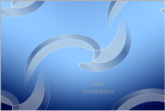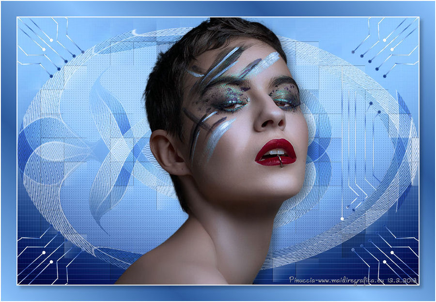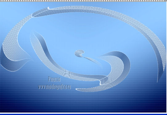 qui puoi trovare qualche risposta ai tuoi dubbi. Se l'argomento che ti interessa non è presente, ti prego di segnalarmelo. Questo tutorial è stato creato con PSP X3, ma può essere eseguito anche con le altre versioni di PSP. Per tradurlo, ho usato PSP X. Occorrente: Materiale qui Per il tube utilizzato grazie Karine. Filtri in caso di dubbi, ricorda di consultare la mia sezione filtri qui Filters Unlimited 2.0 qui AP Lines - Lines SilverLining qui Mehdi - Wavy Lab qui Andrew's Filters 51 qui Toadies qui I filtri Andrew's per essere usati devono prima essere convertiti. Come fare vedi qui Si usano importandoli in Filters Unlimited (come fare vedi qui) ma possono funzionare anche da soli. La collezione fornita è stata già convertita. Anche i filtri Toadies si possono usare da soli o importati in Unlimited. ![]() Metti la linea di stile @qua29 nella cartella Linee di stile. 1. Imposta il colore di primo piano con #8dc6ff, e il colore di sfondo con #18397a. ![]() 2. Apri una nuova immagine trasparente 900 x 600 pixels. 3. Effetti>Plugins>Mehdi - Wavy Lab. Il filtro lavora con i colori impostati. Il primo è il colore di sfondo, il secondo è il colore di primo piano. Non cambiare il terzo colore creato dal filtro. ![]() 4. Effetti>Plugins>Filters Unlimited 2.0 - Andrew's Filters 51 - Straight Lines 234. ![]() 5. Imposta il colore di primo piano con il colore bianco. ![]() 6. Attiva lo strumento Penna ![]() linea di stile Pieno, larghezza 2 pixels ![]() Traccia una diagonale partendo dalla coordinata verticale 50/orizzontale 700 (nella barra inferiore degli strumenti, puoi controllare la posizione). Cliccando nel punto di partenza, apparirà un piccolo quadro. ![]() Clicca sul punto di arrivo coordinate verticale 500/orizzontale 100: ![]() e la linea si traccerà da sola. ![]() Livelli>Converti in livello raster. 7. Effetti>Effetti di distorsione>Mulinello. ![]() Risultato. ![]() 8. Livelli>Duplica. Effetti>Effetti di distorsione>Mulinello. ![]() Risultato. ![]() 9. Livelli>Unisci>Unisci giù. 10. Livelli>Duplica. Effetti>Effetti di distorsione>Mulinello. ![]() Risultato. ![]() Livelli>Unisci>Unisci giù. 11. Attiva lo strumento Bacchetta magica ![]() e clicca nelle parti indicate sotto. ![]() 12. Passa il colore di primo piano a Gradiente, stile Lineare. ![]() Imposta l'opacità dello strumento Riempimento a 50 ![]() Riempi la selezione con il gradiente.Risultato. ![]() 13. Effetti>Plugins>AP Lines - Lines SilverLining - Breaks. ![]() Selezione>Deseleziona. 14. Seleziona con la bacchetta magica le altre parti della forma.![]() 15. Imposta il colore di primo piano con il colore bianco. Riempi la selezione con il colore bianco, opacità 50 ![]() 16. Effetti>Plugins>Ap lines - Lines SilverLining - Break, con i settaggi precedenti. Risultato. ![]() Selezione>Deseleziona. 17. Effetti>Effetti di immagine>Motivo unico, con i settaggi standard. ![]() Risultato. ![]() 18. Effetti>Effetti di distorsione>Coordinate polari. ![]() ![]() 19. Livelli>Duplica. Immagine>Capovolgi. Risultato. ![]() Livelli>Unisci>Unisci giù. 20. Livelli>Duplica. Attiva nuovamente il livello sottostante dell'originale - Raster 2. 21. Effetti>Plugins>Filters Unlimited 2.0 - Toadies - Plain Mosaic Blur. ![]() Cambia la modalità di miscelatura di questo livello in Luce netta, e abbassa l'opacità al 50%. ![]() 22. Attiva il livello superiore. Cambia la modalità di miscelatura di questo livello in Luce netta, e abbassa l'opacità al 70%. ![]() 23. Attiva nuovamente lo strumento Bacchetta magica ![]() e seleziona la parte esterna ![]() 24. Livelli>Nuovo livello raster. Riempi con il colore bianco, opacità 50 25. Effetti>Plugins>AP Lines - Lines SilverLining - Dotty Grid. ![]() Selezione>Deseleziona. 26. Cambia la modalità di miscelatura di questo livello in Luminanza (esistente), e abbassa l'opacità al 50%. ![]() 27. Attiva nuovamente il livello copia di Raster 2. ![]() 28. Seleziona la parte interna con la bacchetta magica ![]() ![]() 29. Livelli>Nuovo livello raster. Riempi la selezione con il colore bianco, opacità 50 30. Effetti>Plugins>AP Lines - Lines SilverLining - Horizontal Gaps. ![]() Selezione>Deseleziona. 31. Cambia la modalità di miscelatura di questo livello in Luce netta, e abbassa l'opacità al 50%. ![]() 32. Attiva il livello superiore. Apri il tube k@rine_dreams_Blond_Robot_2423_Janvier_2013 e vai a Modifica>Copia. Torna al tuo lavoro e vai a Modifica>Incolla come nuovo livello. Immagine>Ridimensiona, al 75%, bicubica, tutti i livelli non selezionato. ![]() 33. Effetti>Effetti 3D>Sfalsa ombra. ![]() 34. Riporta il colore di primo piano a Gradiente. ![]() 35. Attiva lo strumento Penna ![]() linea di stile @qua29, larghezza 2 ![]() Partendo dal basso (in questo modo il pallino sarà visibile appunto in basso) ![]() traccia la prima linea come nell'esempio. ![]() Cambia la linea di stile in Pieno, dimensione sempre 2 pixels. ![]() Traccia due linee accanto alla precedente. ![]() Con la linea di stile &@64;qua29, completa i tratti delle linee come nell'esempio (partendo dal punto in cui vuoi far comparire il pallino) ![]() Con la linea di stile Pieno, traccia altre due linee come nell'esempio. ![]() E completa con la linea di stile @qua29. ![]() Livelli>Converti in livello raster. Regola>Messa a fuoco>Accentua messa a fuoco. 36. Traccia ora, con gli stessi settaggi, e con le linee linee Pieno e @qua29 delle linee nell'angolo in alto a sinistra, come mostrato sotto. ![]() 37. Livelli>Converti in livello raster. Regola>Messa a fuoco>Accentua messa a fuoco. 38. Livelli>Duplica. Immagine>Rifletti. Livelli>Duplica. Immagine>Capovolgi. Livelli>Duplica. Immagine>Rifletti. 39. Immagine>Aggiungi bordatura, 2 pixels, simmetriche, con il colore bianco. Immagine>Aggiungi bordatura, 35 pixels, simmetriche, con il colore scuro di sfondo. Seleziona questo bordo con la bacchetta magica ![]() Riempi la selezione con il gradiente, opacità 100 40. Selezione>Inverti. 41. Effetti>Effetti 3D>Sfalsa ombra. ![]() Selezione>Dese