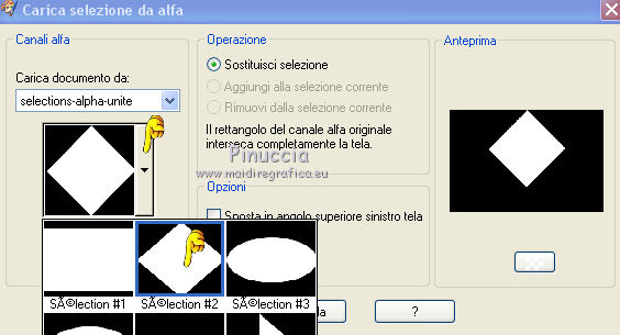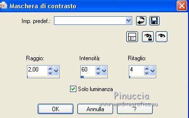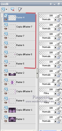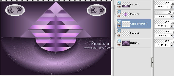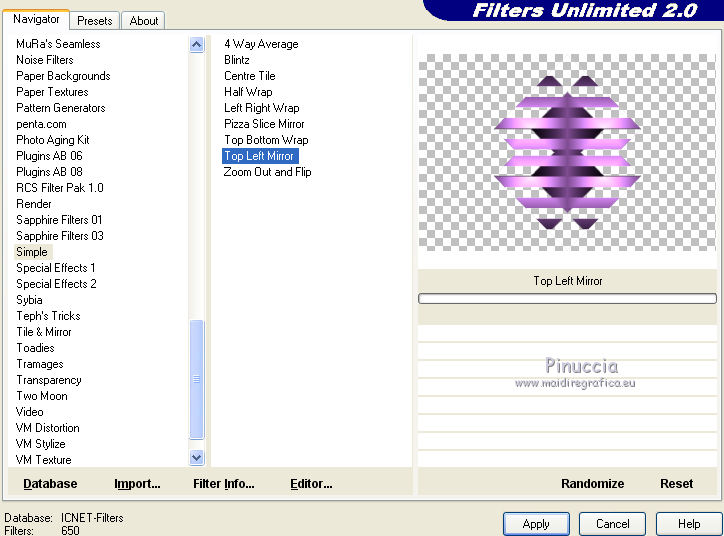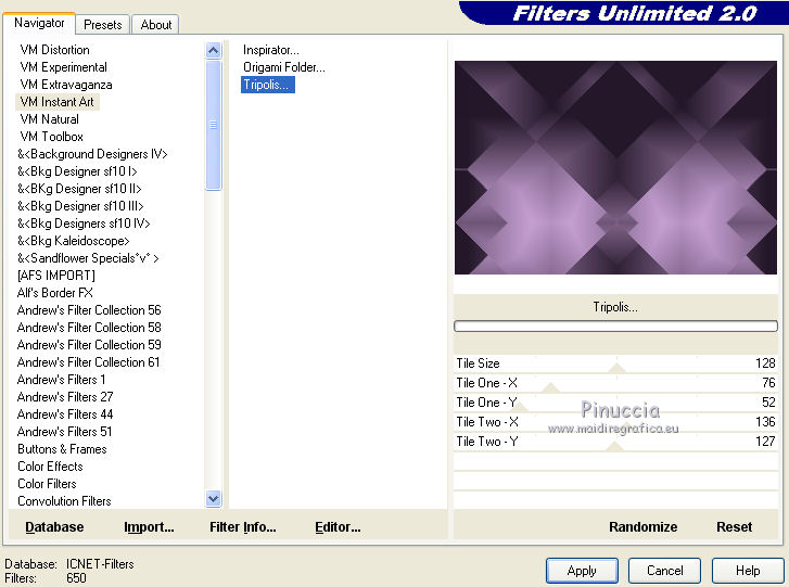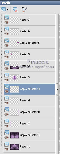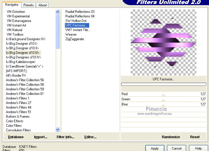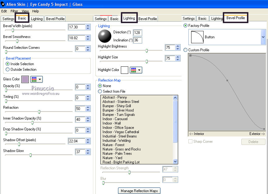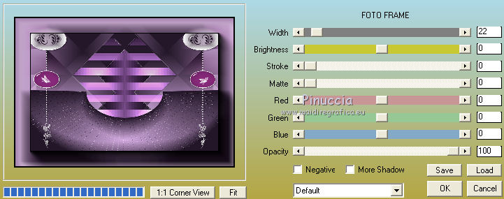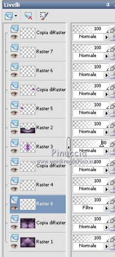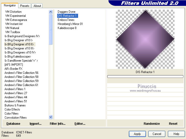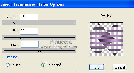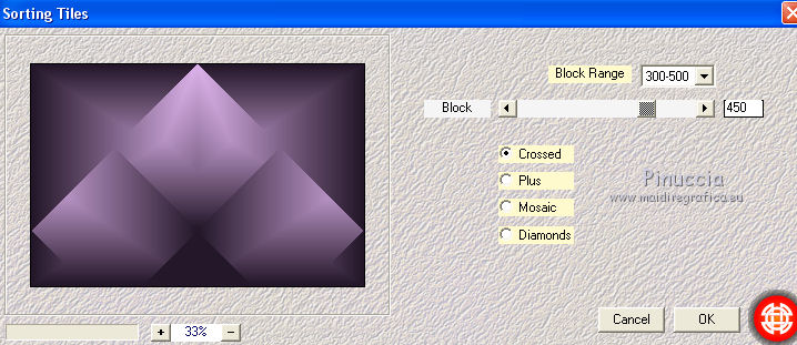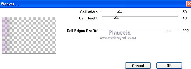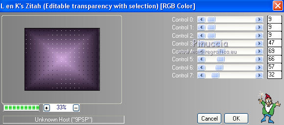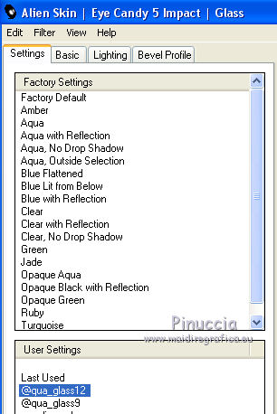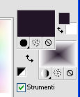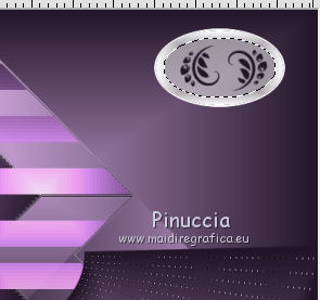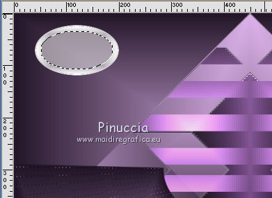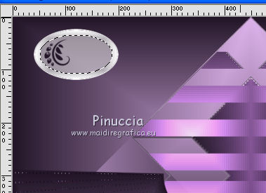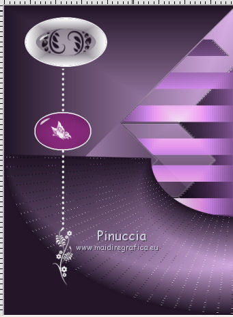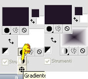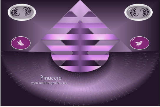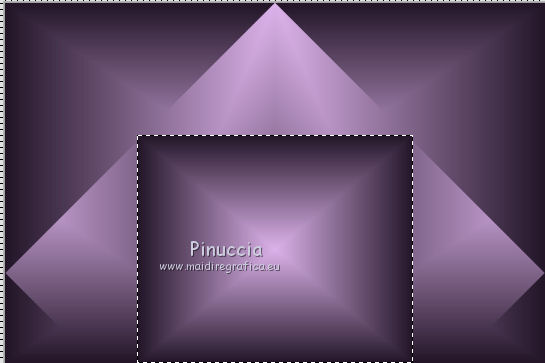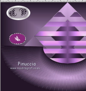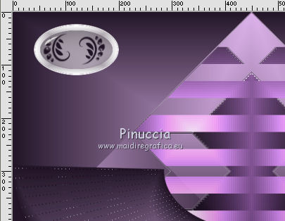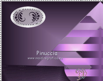 qui puoi trovare qualche risposta ai tuoi dubbi. Se l'argomento che ti interessa non è presente, ti prego di segnalarmelo. Questo tutorial è stato creato con CorelX6, ma può essere realizzato anche con le altre versioni di PSP. Per tradurlo ho usato PSP X, ma può essere eseguito anche con le altre versioni di PSP. Nelle versioni più recenti X4, X5 e X6, il comando Immagine>Rifletti è stato sostituito con Immagine>Capovolgi in orizzontale, e il comando Immagine>Capovolgi con Immagine>Capovolgi in verticale. Nelle versioni X5 e X6 le funzioni sono state migliorate con la disponibilità del menu "Oggetti". Vedi la scheda sull'argomento qui Occorrente: Materiale qui Per il tube della donna grazie Guismo. Filtri in caso di dubbi, ricorda di consultare la mia sezione filtri qui Mehdi - Wavy Lab, Sorting Tiles qui L&K's - L&'K Zitah qui Filters Unlimited 2.0 qui &<Bkg Designer sf10II> - DIS Refractor 1 (da importare in Unlimited) qui &<Bkg Designer sf10III> - UPC Factorize (da importare in Unlimited) qui Alien Skin Eye Candy 5 Impact - Glass qui DSB Flux - Linear Transmission qui Simple - Top Left Mirror qui VM Instant Art qui Toadies qui AAA Frames - Foto Frame qui i filtri Simple, VM Instant Art e Toadies si possono usare da soli o importati in Filters Unlimited. come fare vedi qui) Se un filtro fornito appare con questa icona ![]() Se utilizzi altri tubes e/o altri colori, puoi sperimentare le modalità di miscelatura e opacità più adatte. Metti il preset @qua_glass12 Cliccando sul file una o due volte (a seconda delle tue impostazioni), automaticamente il preset si installerà nella cartella corretta. perchè uno o due clic vedi qui Metti il pennello @M&M Floral-074 nella cartella Pennelli. Attenzione, il pennello è composto da due files che non devono essere separati. Vedi gli appunti sui pennelli qui Apri i pennelli fleur@qua e papillon@qua in PSP ed esportali come pennelli personalizzati. 1. Imposta il colore di primo piano con #dcb2ea, e il colore di sfondo con #231628. ![]() Passa il colore di primo piano a Gradiente, stile Rettangolare, con i seguenti settaggi. ![]() 2. Apri selections_alpha_unite. Duplica l'immagine usando la combinazione di tasti maiuscola+D. Chiudi l'originale e lavora sulla copia. L'immagine non è vuota, ma contiene le selezioni salvate sul canale alfa. Rinomina il livello Raster 1. 3. Riempi l'immagine trasparente con il gradiente.4. Effetti>Plugins>Mehdi - Sorting Tiles. ![]() 5. Livelli>Nuovo livello raster. Selezione>Carica/Salva selezione>Carica selezione da canale alfa. La selezione "sélection#1" è subito disponibile. Devi soltanto cliccare Carica. ![]() Riempi la selezione con il gradiente.![]() 6. Effetti>Plugins>L&K's - L&K's Zitah. ![]() Selezione>Deseleziona. 7. Effetti>Effetti di distorsione>Coordinate polari. ![]() Dovresti avere questo. ![]() 8. Regola>Messa a fuoco>metti a fuoco. Attiva nuovamente il livello Raster 1. 9. Livelli>Nuovo livello raster. Selezione>Carica/Salva selezione>Carica selezione da canale alfa. Apri il menu delle selezioni e carica "sélection#2". ![]() Riempi la selezione con il colore scuro #231628.10. Selezione>Modifica>Contrai - 2 pixels. ![]() Premi sulla tastiera il tasto CANC ![]() Riempi la selezione la selezione con il gradiente.11. Effetti>Plugins>Filters Unlimited 2.0 - &<Bkg Designer sf10II> - DIS Refractor 1 con i settaggi standard. ![]() 12. Effetti>Plugins>DSB Flux - Linear Transmission. ![]() 13. Effetti>Plugins>Filters Unlimited 2.0 - &<Bkg Designer sf10III> - UPC Factorize, con i settaggi standard. ![]() Selezione>Deseleziona. 14. Effetti>Plugins>Filters Unlimited 2.0 - Simple - Top Left Mirror. ![]() Abbassa l'opacità di questo livello all'80%. ![]() 15. Attiva nuovamente il livello Raster 1. Livelli>Nuovo livello raster. Selezione>Carica/Salva selezione>Carica selezione da canale alfa. Apri il menu delle selezioni e carica "sélection#3". ![]() 16. Imposta il colore di primo piano con il colore bianco #ffffff. ![]() Riempi la selezione con il colore bianco #ffffff.Selezione>Deseleziona. 17. Livelli>Duplica. Immagine>Rifletti. Attiva nuovamente il livello sottostante dell'originale (Raster 4). 18. Selezione>Seleziona tutto. Selezione>Mobile. Selezione>immobilizza. 19. Selezione>Modifica>Contrai - 2 pixels. ![]() Premi sulla tastiera il tasto CANC ![]() 20. Inverti i colori della paletta, cliccando sulla freccia al centro ![]() Apri il menu della paletta di sfondo e seleziona Gradiente, e avrai il gradiente, senza aprire la paletta del colore di sfondo. ![]() ![]() Riempi la selezione con il gradiente.21. Selezione>Modifica>Contrai - 10 pixels. ![]() Premi sulla tastiera il tasto CANC. 22. Imposta l'opacità dello strumento Riempimento a 50 ![]() e riempi la selezione con il colore bianco #ffffff.Dovresti avere questo. ![]() 23. Mantieni selezionato. Attiva lo strumento Pennello ![]() cerca e seleziona il pennello @M&M_Floral_074, dimensioni 50 ![]() e applica il pennello nella selezione cliccando con il tasto sinistro del mouse, per usare il colore scuro di primo piano #231628. ![]() Imposta la rotazione del pennello a 180 ![]() e applica nuovamente il pennello con il colore scuro ![]() 24. Effetti>Plugins>Alien Skin Eye Candy 5 Impact - Glass. Seleziona il preset @qua_glass12, e ok. ![]() Questi i settaggi che, in caso di problemi con il preset, puoi impostare manualmente. ![]() Selezione>Deseleziona. Dovresti avere questo. ![]() 25. Attiva il livello copia di Raster 4. Selezione>Seleziona tutto. Selezione>Mobile. Selezione>Immobilizza. 26. Ripeti i passaggi eseguiti per l'ovale di sinistra: Selezione>Modifica>Contrai - 2 pixels. ![]() Premi sulla tastiera il tasto CANC ![]() Imposta nuovamente il gradiente ![]() Riempi la selezione con il gradiente, opacità 100 Selezione>Modifica>Contrai - 10 pixels. Premi sulla tastiera il tasto CANC. Imposta nuovamente il colore bianco ![]() Riempi la selezione con il colore bianco #ffffff, opacità 50 Mantieni selezionato. Attiva lo strumento Pennello , che 