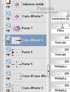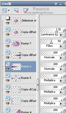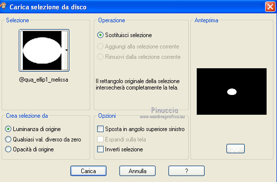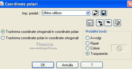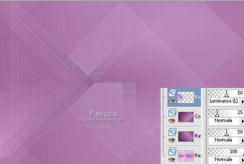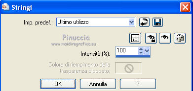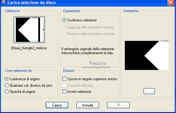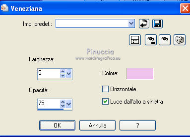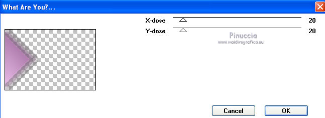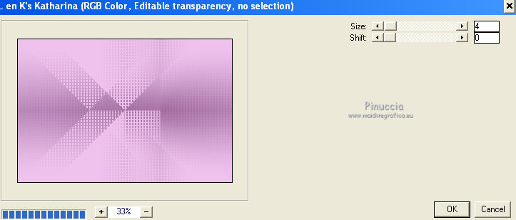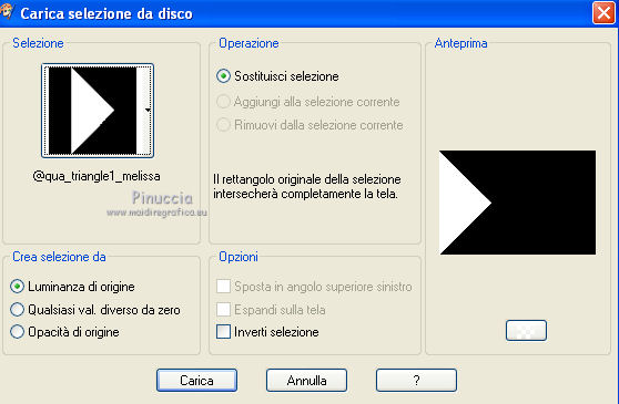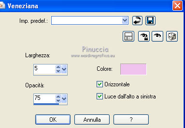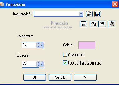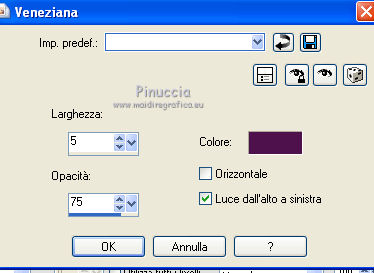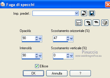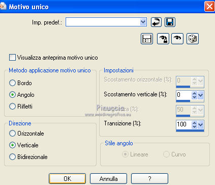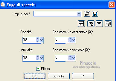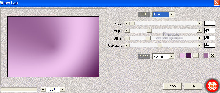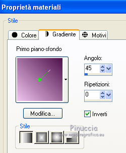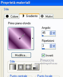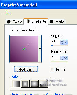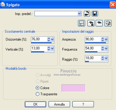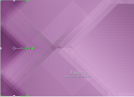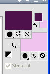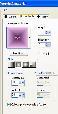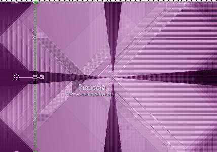 qui puoi trovare qualche risposta ai tuoi dubbi. Se l'argomento che ti interessa non è presente, ti prego di segnalarmelo. Questo tutorial è stato creato con PSP X3, ma può essere eseguito anche con le altre versioni di PSP. Per tradurlo, ho usato PSP X. Occorrente: Materiale qui Per i tubes utilizzati grazie Gina e Anna.br. Grazie a tutti i creatori di tubes che con il loro meraviglioso lavoro, permettono di creare questi tutorials. Lascia intatto il nome del tube. Il © appartiene all'artista originale. Mantieni il credito di chi ha creato il tube. Filtri in caso di dubbi, ricorda di consultare la mia sezione filtri qui Alien Skin Eye Candy 5 Impact qui Simple qui Mehdi qui Toadies qui L&K - L&K Katharina qui ![]() Metti le selezioni nella cartella Selezioni. 1. Imposta il colore di primo piano con il colore scuro #4e134b e il colore di sfondo con il colore chiaro #efc2ed. ![]() 2. Apri una nuova immagine trasparente 900 x 600 pixels. 3. Effetti>Plugins>Mehdi - Wavy lab. ![]() 4. Effetti>Plugins>Simple - Pizza slice mirror. 5. Effetti>Plugins>L&K - L&K Katharina. ![]() 6. Effetti>Effetti di bordo>Aumenta. 7. Livelli>Nuovo livello raster. Passa il colore di primo piano a Gradiente. ![]() 8. Effetti>Plugins>Simple - Blintz. Abbassa l'opacità di questo livello al 50%. 9. Livelli>Duplica. Immagine>Capovolgi. Abbassa l'opacità di questo livello al 25%. 10. Livelli>Nuovo livello raster. Selezione>Carica/Salva selezione>Carica selezione da disco. Cerca e carica la selezione @qua_triangle1_mélissa. ![]() Cambia i settaggi del gradiente, selezionando Inverti. ![]() Riempi la selezione con il gradiente.Selezione>Deseleziona. 11. Effetti>Effetti di trama>Veneziana, con il colore chiaro. ![]() Cambia la modalità di miscelatura di questo livello in Luminanza (esistente), e abbassa l'opacità al 50%. ![]() 12. Effetti>Plugins>Toadies - What are you? ![]() Effetti>Effetti di bordo>Aumenta. 13. Livelli>Duplica. Immagine>Ridimensiona, al 50%, tutti i livelli non selezionato. 14. Effetti>Effetti di immagine>Motivo unico. ![]() Cambia la modalità di miscelatura di questo livello in Moltiplica, opacità 100. 15. Sposta l'immagine a sinistra.![]() 16. Livelli>Duplica. Immagine>Rifletti. 17. Livelli>Nuovo livello raster. Selezione>Carica/Salva selezione>Carica selezione da disco. Cerca e carica la selezione @qua_triangle2_mélissa. ![]() Riempi con il gradiente precedente.Selezione>Deseleziona. 18. Effetti>Effetti di trama>Veneziana. ![]() 19. Effetti>Plugins>Toadies - What are you? con i settaggi precedenti. Effetti>Effetti di bordo>Aumenta. 20. Livelli>Disponi>Sposta giù - 2 volte. 21. Attiva il livello superiore. 22. Livelli>Nuovo livello raster. Selezione>Carica/Salva selezione>Carica selezione da disco. Cerca e carica la selezione @qua_triangle4_mélissa. ![]() 23. Cambia nuovamente i settaggi del gradiente. ![]() Riempi la selezione con il gradiente.Selezione>Deseleziona. 24. Effetti>Effetti di trama>Veneziana. ![]() Cambia la modalità di miscelatura di questo livello in Moltiplica, opacità 100. 25. Livelli>Nuovo livello raster. Selezione>Carica/Salva selezione>Carica selezione da disco. Carica nuovamente la selezione @qua_triangle1_mélissa. ![]() Riempi la selezione con il colore scuro.Selezione>Deseleziona. 26. Immagine>Ridimensiona, al 50%, tutti i livelli non selezionato. Effetti>Effetti di immagine>Motivo unico, con i settaggi precedenti. 27. Sposta l'immagine a sinistra.![]() 28. Effetti>Effetti di riflesso>Fuga di specchi. ![]() 29. Livelli>Duplica. Immagine>Rifletti. 30. Livelli>Nuovo livello raster. Attiva lo strumento Selezione ![]() clicca sull'icona Selezione personalizzata ![]() e imposta i seguenti settaggi. ![]() 31. Riempi la selezione con il gradiente 45/0, inverti selezionato.![]() Selezione>Deseleziona. 32. Effetti>Effetti di trama>Veneziana. ![]() 33. Effetti>Effetti di distorsione>Coordinate polari. ![]() 34. Livelli>Duplica. Attiva il livello sottostante dell'originale. Cambia la modalità di miscelatura di questo livello in Filtra, e abbassa l'opacità al 50%. 35. Effetti>Effetti 3D>Sfalsa ombra. ![]() Ripeti l'Effetto Sfalsa ombra, cambiando verticale e orizzontale con -5. ![]() 36. Attiva il livello superiore della copia. Immagine>Ridimensiona, al 90%, tutti i livelli non selezionato. 37. Effetti>Effetti di distorsione>Stringi. ![]() 38. Cambia la modalità di miscelatura di questo livello in Luminanza (esistente) e abbassa l'opacità al 75%. 39. Selezione>Seleziona tutto. Selezione>Mobile. Attiva il livello Raster 6. ![]() Premi sulla tastiera il tasto CANC. 40. Attiva il livello Copia di Raster 6. ![]() Selezione>Deseleziona. 41. Attiva nuovamente il livello superiore. Effetti>Effetti 3D>Sfalsa ombra. ![]() Ripeti l'Effetto Sfalsa ombra, cambiando verticale e orizzontale con -5. 42. Livelli>Nuovo livello raster. Selezione>Carica/Salva selezione>Carica selezione da disco. Carica nuovamente la selezione @qua_ellip1_melissa. ![]() 43. Cambia i settaggi del gradiente, in stile Rettangolare. ![]() Riempi la selezione con il gradiente.44. Effetti>Plugins>Alien Skin Eye Candy 5 Impact - Glass. Seleziona il preset Clear e ok. ![]() 45. Selezione>Modifica>Seleziona bordature selezione. ![]() 46. Livelli>Nuovo livello raster. Riempi la selezione con il colore scuro.se necessario, ingrandisci l'immagine per vedere meglio, attivando lo strumento Zoom o usando la rotellina del mouse![]() Selezione>Deseleziona. 47. Livelli>Nuovo livello raster. Selezione>Carica/Salva selezione>Carica selezione da disco. Carica nuovamente la selezione @qua_aig_melissa. ![]() Imposta il colore di primo piano con il colore bianco. Riempi la selezione con il colore bianco(ingrandisci l'immagine per vedere meglio lo spazio da riempire). Selezione>Deseleziona. 48. Effetti>Effetti di bordo>Aumenta. 49. Effetti>Effetti 3D>Sfalsa ombra. ![]() 50. Livelli>Nuovo livello raster. Selezione>Carica/Salva selezione>Carica selezione da disco. Carica nuovamente la selezione @qua_regle_melissa. ![]() Riempi la s