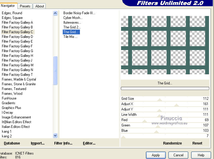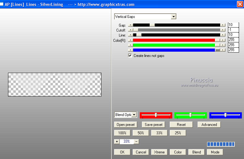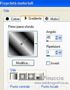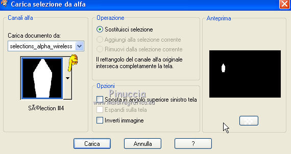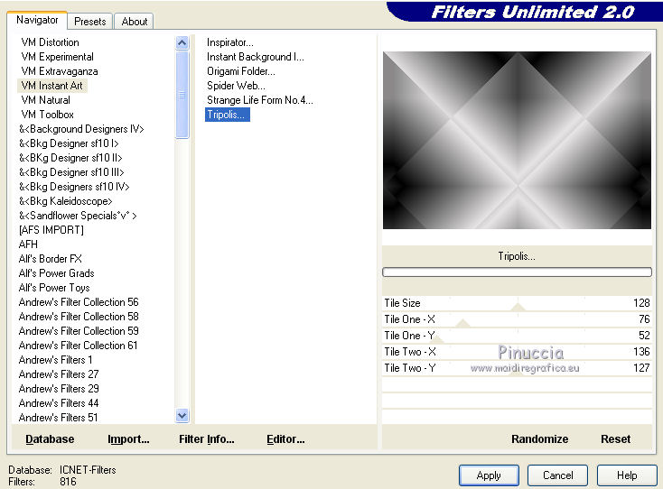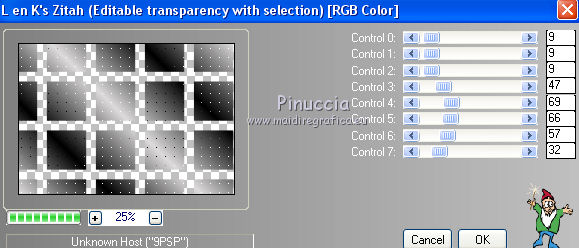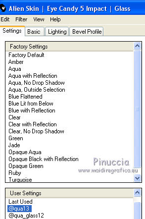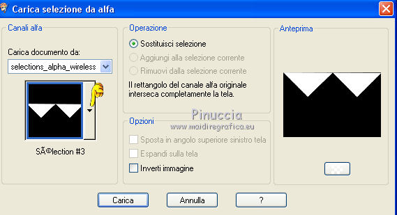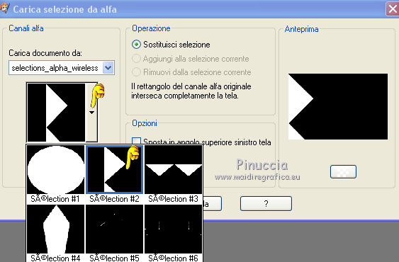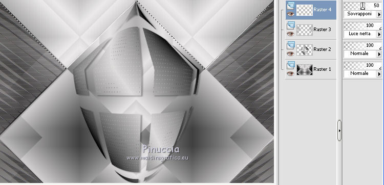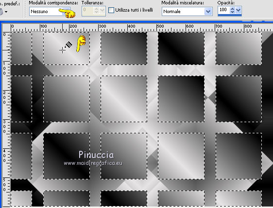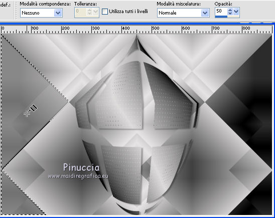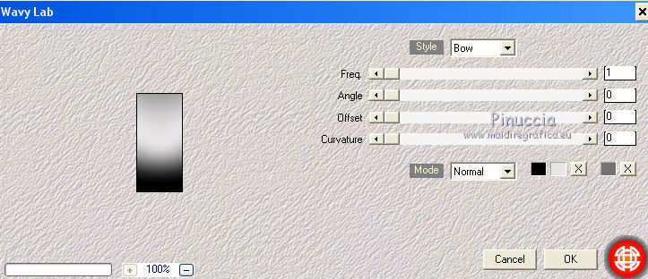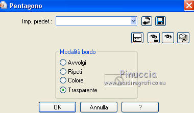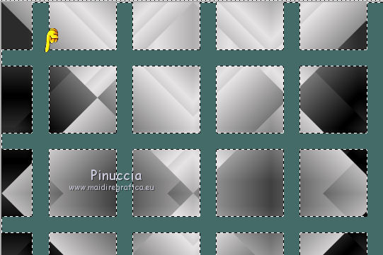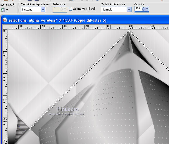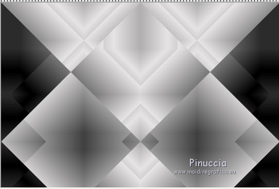 qui puoi trovare qualche risposta ai tuoi dubbi. Se l'argomento che ti interessa non è presente, ti prego di segnalarmelo. Questo tutorial è stato creato con CorelX6, ma può essere realizzato anche con le altre versioni di PSP. Per tradurlo ho usato PSP X, ma può essere eseguito anche con le altre versioni di PSP. Nelle versioni più recenti X4 e X5, il comando Immagine>Rifletti è stato sostituito con Immagine>Capovolgi in orizzontale, e il comando Immagine>Capovolgi con Immagine>Capovolgi in verticale. Nella versione X5 le funzioni sono state migliorate con la disponibilità del menu "Oggetti". Vedi la scheda sull'argomento qui Occorrente: Un tube a scelta. Il resto del materiale qui Per il tube della donna grazie Alies. Filtri in caso di dubbi, ricorda di consultare la mia sezione filtri qui Mehdi - Wavy Lab qui L&K's - L&'K Zitah qui L&K's - L&'K Elvida qui Alien Skin Eye Candy 5 Impact - Glass qui VM Instant Art qui Filter Factory Gallery C - Grid qui AP Lines - SilverLining qui Graphics Plus - Cross Shadow qui I filtri Factory Gallery, VM Instant ARt e Graphics Plus si possono usare da soli o importati in Filters Unlimited (come fare vedi qui) Se un filtro fornito appare con questa icona ![]() Se utilizzi altri tubes e/o altri colori, puoi sperimentare le modalità di miscelatura e opacità più adatte. Metti il preset Cliccando sul file una o due volte (a seconda delle tue impostazioni), automaticamente il preset si installerà nella cartella corretta. perchè uno o due clic vedi qui 1. Imposta il colore di primo piano con #e6e4e4, e il colore di sfondo con il colore nero #000000. ![]() Passa il colore di primo piano a Gradiente, stile Lineare, con i seguenti settaggi. ![]() 2. Apri selections_Alpha_wireless. il file è stato creato con X6. Se stai usando una versione precedente, potresti avere questo messaggio. Non preoccuparti, clicca ok e il file si aprirà. ![]() Duplica l'immagine usando la combinazione di tasti maiuscola+D. Chiudi l'originale e lavora sulla copia. L'immagine non è vuota, ma contiene le selezioni salvate sul canale alfa. Rinomina il livello Raster 1. Riempi l'immagine trasparente con il gradiente.3. Effetti>Plugins>Filters Unlimited 2.0 - VM Instant Art - Tripolis, con i settaggi standard. ![]() Ripeti il filtro Tripolis con gli stessi settaggi, e avrai questo. ![]() 4. Livelli>Nuovo livello raster. Effetti>Plugins>Filters Unlimited 2.0 - Filter Factory Gallery C - The Grid. ![]() 5. Attiva lo strumento Bacchetta magica ![]() e clicca nelle strisce per selezionarle. ![]() Premi sulla tastiera il tasto CANC ![]() 6. Selezione>Inverti. Riempi la selezione con il gradiente.Con la modalità di corrispondenza impostata in Nessuno, basterà un solo clic. ![]() 7. Effetti>Plugins>L& K's - L& K's Zitah ![]() Selezione>Deseleziona. 8. Effetti>Effetti geometrici>Sfera. ![]() 9. Selezione>Carica/Salva selezione>Carica selezione da canale alfa. La selezione sélection#1 è subito disponibile. Devi soltanto cliccare Carica. ![]() 10. Selezione>Inverti. Premi sulla tastiera il tasto CANC ![]() Selezione>Deseleziona. 11. Effetti>Effetti geometrici>Pentagono. ![]() 12. Effetti>Effetti 3D>Sfalsa ombra, colore nero. ![]() 13. Selezione>Carica/Salva selezione>Carica selezione da canale alfa. Apri il menu delle selezioni, e carica sélection#2. ![]() 14. Riporta il colore di primo piano a Colore. ![]() Imposta l'opacità dello strumento Riempimento a 50 ![]() Riempi la selezione con il colore chiaro di primo piano #e6e4e4.![]() 15. Effetti>Plugins>L&'K - L&'K Elvida. ![]() Selezione>Deseleziona. 16. Livelli>Duplica. Immagine>Rifletti. Livelli>Unisci>Unisci giù. 17. Effetti>Effetti 3D>Sfalsa ombra, con i settaggi precedenti. ![]() 18. Cambia la modalità di miscelatura di questo livello in Luce netta. 19. Livelli>Nuovo livello raster. Selezione>Carica/Salva selezione>Carica selezione da canale alfa. Apri il menu delle selezioni e carica selection#3. ![]() 20. Riempi la selezione con il colore chiaro #e6e4e4,opacità sempre a 50 21. Effetti>Plugins>AP Lines - SilverLining - Vertical Gaps. ![]() 22. Cambia la modalità di miscelatura di questo livello in Sovrapponi, e abbassa l'opacità al 50% (o secondo i tuoi colori). ![]() 23. Effetti>Effetti 3D>Sfalsa ombra, con i settaggi precedenti. ![]() Selezione>Deseleziona. 24. Livelli>Nuovo livello raster. Selezione>Carica/Salva selezione>Carica selezione da canale alfa. Apri il menu delle selezioni e carica sélection#4. ![]() 25. Effetti>Plugins>Mehdi - Wavy Lab - Bow il filtro lavora con i colori della paletta, il primo è il colore di sfondo, il secondo quello di primo piano; lascia il terzo colore creato dal filtro. ![]() 26. Effetti>Plugins>Alien Skin Eye Candy 5 Impact - Glass. Seleziona il preset @qua_glass13 e ok. ![]() Questi i settaggi che, in caso di problemi con il preset, puoi impostare manualmente. ![]() Selezione>Deseleziona. 27. Livelli>Duplica. Immagine>Rifletti. Effetti>Effetti 3D>Sfalsa ombra, con i settaggi precedenti. Attiva il livello sottostante del pentagono di sinistra. Modifica>Ripeti Sfalsa ombra. 28. Attiva nuovamente il livello superiore. Livelli>Nuovo livello raster. Selezione>Carica/Salva selezione>Carica selezione da canale alfa. Apri il menu delle selezioni e carica sélection#5. ![]() 29. Imposta il colore di primo piano con il colore bianco, e riporta l'opacità dello strumento Riempimento a 100, modalità di corrispondenza Nessuno. Ingrandisci l'immagine (o usa la rotellina del mouse) per visualizzare meglio lo spazio da riempire,e riempi la selezione con il colore bianco.![]() Selezione>Deseleziona. 30. Effetti>Effetti 3D>Sfalsa ombra, con i settaggi precedenti, ancora in memoria. ![]() 31. Livelli>Nuovo livello raster. Selezione>Carica/Salva selezione>Carica selezione da canale alfa. Apri il menu delle selezioni e carica sélection#6. ![]() Riempi con il colore bianco.Selezione>Deseleziona. 32. Effetti>Effetti 3D>Sfalsa ombra, con i settaggi precedenti. ![]() 33. Apri il tube della donna - per