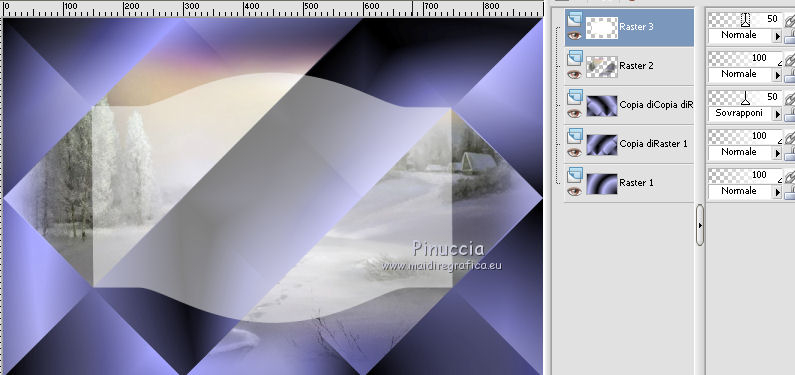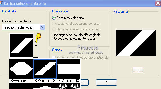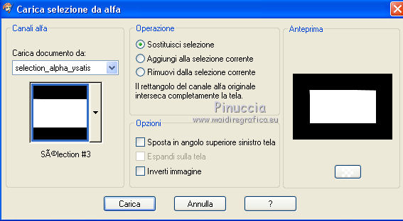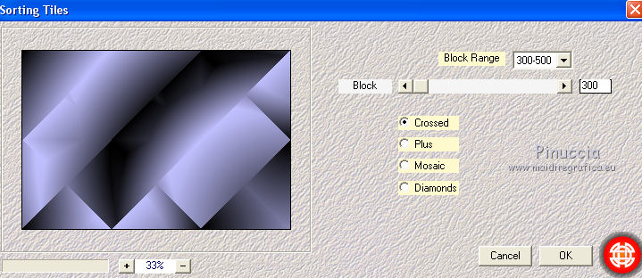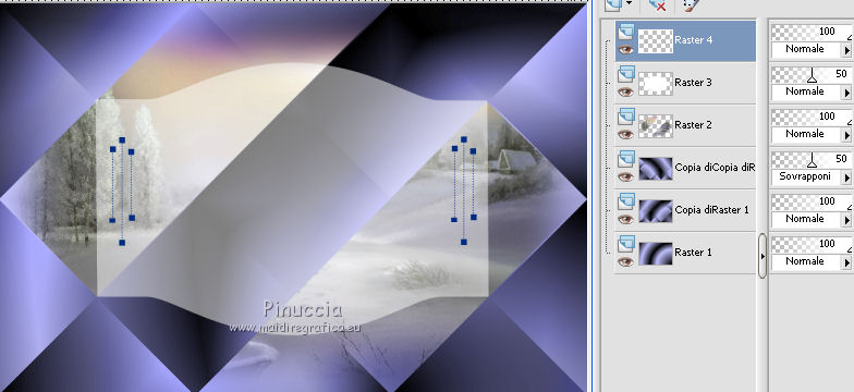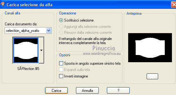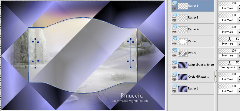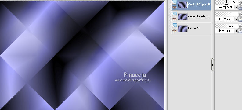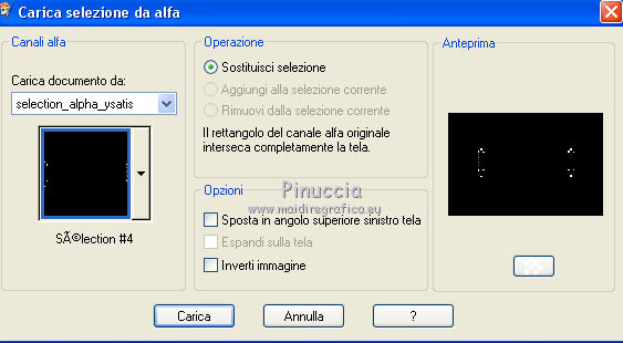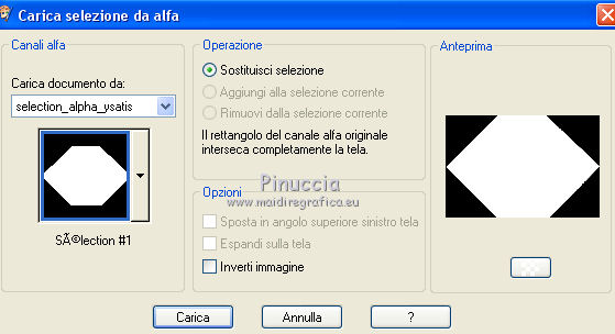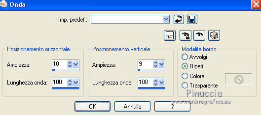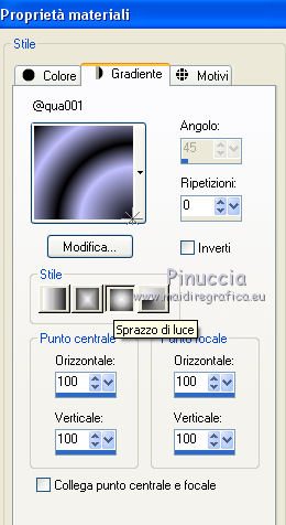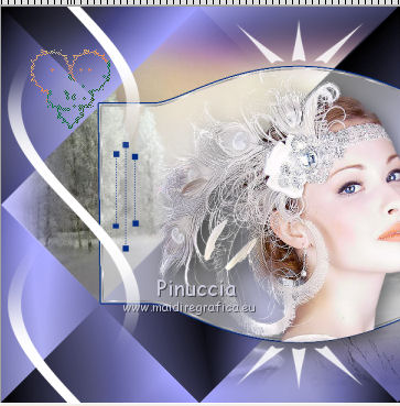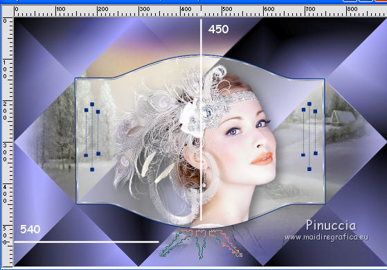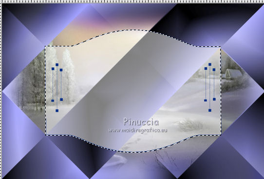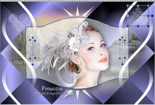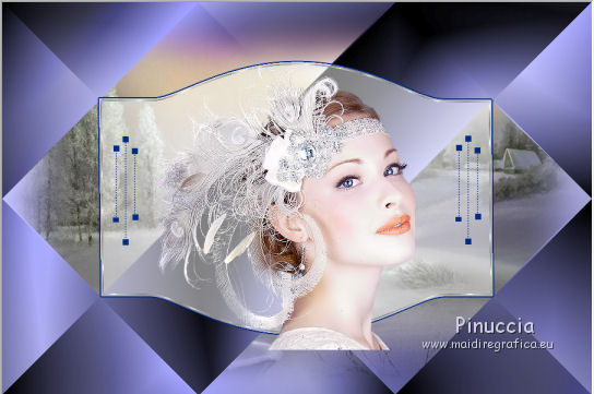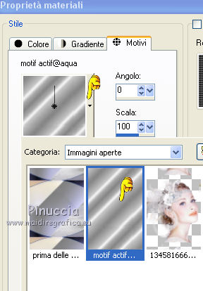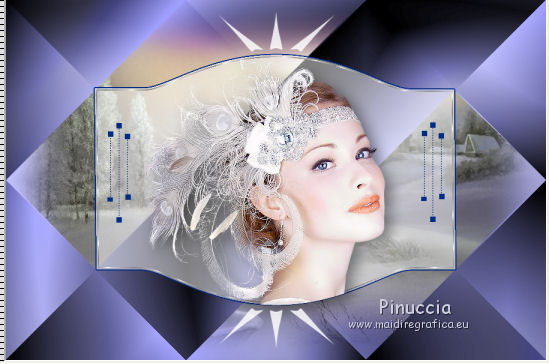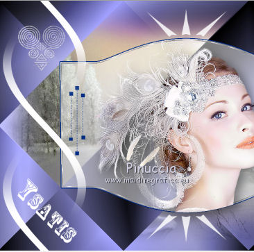 qui puoi trovare qualche risposta ai tuoi dubbi. Se l'argomento che ti interessa non è presente, ti prego di segnalarmelo. Questo tutorial è stato creato con CorelX6, ma può essere realizzato anche con le altre versioni di PSP. Per tradurlo ho usato PSP X, ma può essere eseguito anche con le altre versioni di PSP. Nelle versioni più recenti X4, X5 e X6, il comando Immagine>Rifletti è stato sostituito con Immagine>Capovolgi in orizzontale, e il comando Immagine>Capovolgi con Immagine>Capovolgi in verticale. Nelle versioni X5 e X6 le funzioni sono state migliorate con la disponibilità del menu "Oggetti". Vedi la scheda sull'argomento qui Occorrente: Materiale qui Il tube della donna è di Nikita. Puoi condividerlo, ma non cancellare il watermark e non cambiare il nome del tube. Filtri in caso di dubbi, ricorda di consultare la mia sezione filtri qui Mehdi - Sorting Tiles qui ![]() Se utilizzi altri tubes e/o altri colori, puoi sperimentare le modalità di miscelatura e opacità più adatte. Metti i pennelli nella cartella Pennelli. Attenzione, ogni pennello è composto da due files che non devono essere separati. Se i pennelli non funzionano nel tuo PSP, apri il file in jpg, ed esportalo come pennello personalizzato: File>Esporta>Pennello personalizzato, assegna un nome al pennello e ok. Vedi gli appunti sui pennelli qui Metti il gradiente @qua_002 nella cartella Gradienti. Apri il motivo motif_actif@aqua in PSP e minimizzalo con il resto del materiale. 1. Imposta il colore di primo piano con #c0c0ff, e il colore di sfondo con #000000. ![]() Passa il colore di primo piano a Gradiente, e seleziona il gradiente @qua001, con i seguenti settaggi. ![]() il gradiente assume i colori impostati nella paletta dei materiali. usando la funzione Modifica, alcuni PSP bloccano e chiudono il programma. Per questo, ti consiglio, se vuoi cambiare colore al gradiente, di cambiare i colori della paletta. ![]() 2. Apri selections_alpha_ysatis. Duplica l'immagine usando la combinazione di tasti maiuscola+D. Chiudi l'originale e lavora sulla copia. L'immagine non è vuota, ma contiene le selezioni salvate sul canale alfa. Rinomina il livello Raster 1. 3. Riempi l'immagine trasparente con il gradiente.4. Livelli>Duplica. Effetti>Plugins>Mehdi - Sorting Tiles. ![]() 5. Livelli>Duplica. Immagine>Rifletti. Cambia la modalità di miscelatura di questo livello in Sovrapponi, e abbassa l'opacità al 50%. ![]() 6. Livelli>Nuovo livello raster. Selezione>Carica/Salva selezione>Carica selezione da canale alfa. La selezione "sélection#1" è subito disponibile. Devi soltanto cliccare Carica. ![]() 7. Apri il tube Backgr332 e vai a Modifica>Copia. Torna al tuo lavoro e vai a Modifica>incolla nella selezione. 8. Selezione>Carica/Salva selezione>Carica selezione da canale alfa. Apri il menu delle selezioni e carica selection#2. la nuova selezione sostituirà la precedente ![]() Premi sulla tastiera il tasto CANC ![]() 9. Livelli>Nuovo livello raster. Selezione>Carica/Salva selezione>Carica selezione da canale alfa. Apri il menu delle selezioni e carica selection#3. ![]() 10. Imposta il colore di primo piano con il colore bianco. Riempi la selezione con il colore bianco.Selezione>Deseleziona. 11. Effetti>Effetti di distorsione>Distorsione. ![]() Abbbassa l'opacità di questo livello al 50%. ![]() 12. Livelli>Nuovo livello raster. Selezione>Carica/Salva selezione>Carica selezione da canale alfa. Apri il menu delle selezioni e carica selection#4. ![]() Imposta il colore di primo piano con #032c82, e riempi la selezione con questo colore.Selezione>Deseleziona. ![]() 13. Livelli>Nuovo livello raster. Selezione>Carica/Salva selezione>Carica selezione da canale alfa. Apri il menu delle selezioni e carica selection#5. ![]() 14. Selezione>Modifica>Seleziona bordature selezione. ![]() Riempi la selezione con il colore blu di primo piano #032c82.15. Livelli>Nuovo livello raster. Selezione>Carica/Salva selezione>Carica selezione da canale alfa. Apri il menu delle selezioni e carica nuovamente selection#5. ![]() Ancora la selezione sostituirà la precedente. ![]() 16. Selezione>Modifica>Contrai - 4 pixels. ![]() 17. Selezione>Modifica>Seleziona bordature selezione, con i settaggi precedenti. ![]() 18. Passa il colore di primo piano a Motivi e cerca, nella categoria Immagini aperte, il motivo motif actif@qua. ![]() Ingrandisci l'immagine per vedere meglio,e riempi la selezione con il motivo argento.![]() Selezione>Deseleziona. 19. Dovresti avere questo. ![]() 20. Apri il tube 1345816658_Nikita e vai a Modifica>Copia. Torna al tuo lavoro e vai a Modifica>Incolla come nuovo livello. Immagine>Ridimensiona, al 69%, tutti i livelli non selezionato. Posiziona il tube nell'area selezionata,in modo che le piume rimangano all'interno della figura. ![]() 21. Su questo livello: Selezione>Carica/Salva selezione>Carica selezione da canale alfa. Apri il menu delle selezioni e carica ancora una volta selection#5. ![]() Selezione>Inverti. Premi sulla tastiera il tasto CANC. Selezione>Deseleziona. 22. Effetti>Effetti 3D>Sfalsa ombra. ![]() 23. Imposta nuovamente il colore di primo piano con il colore bianco #ffffff. Livelli>Nuovo livello raster. Attiva lo strumento Pennello ![]() cerca e seleziona il pennello @pointes1 ![]() e applicalo sotto la figura sulle coordinate 450 in larghezza, e 540 in altezza. cliccando con il tasto sinistro del mouse per usare il colore bianco di primo piano. ![]() 24. Livelli>Duplica. Immagine>Capovolgi. Dovresti avere questo. ![]() 25. Attiva lo strumento Selezione ![]() clicca sull'icona Selezione personalizzata ![]() e imposta i seguenti settaggi. ![]() Riempi la selezione con il colore bianco.Selezione>Deseleziona. 26. Effetti>Effetti di distorsione>Onda. ![]() 27. Effetti>Effetti di immagine>Motivo unico. ![]() 28. Livelli>Duplica. Immagine>Rifletti. Livelli>Unisci>Unisci giù. 29. Livelli>Nuovo livello raster. Attiva nuovamente lo strumento Pennello ![]() cerca e seleziona il pennello @qua_spirale2. ![]() Applica