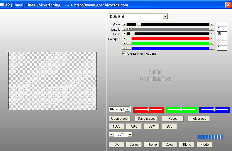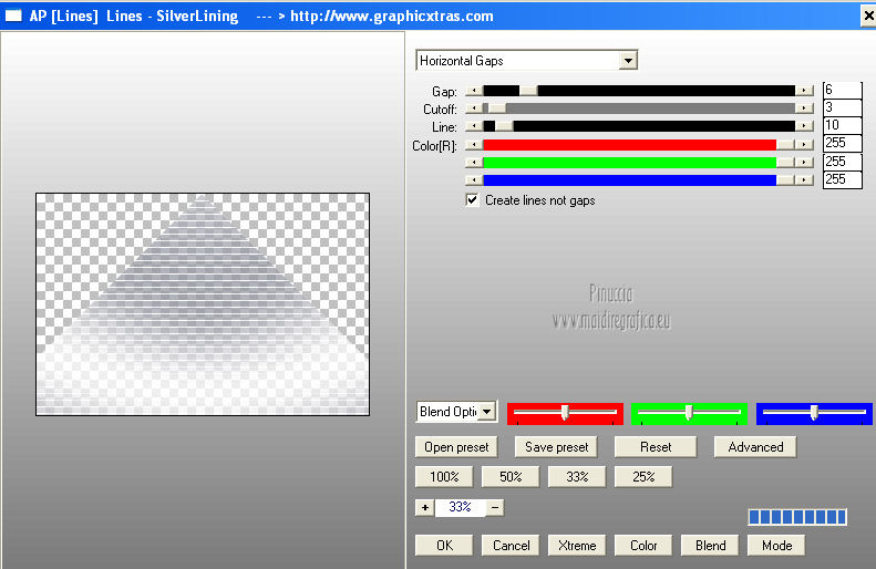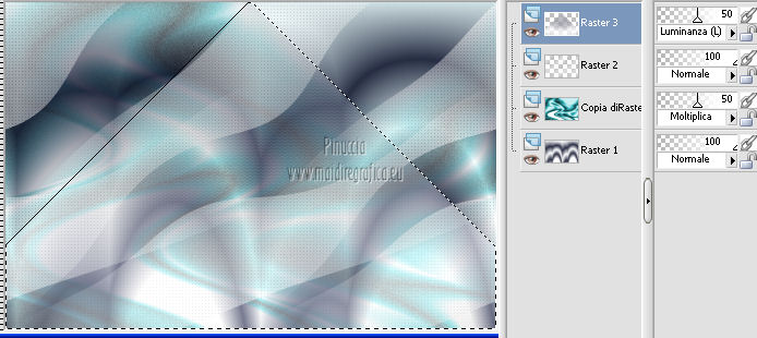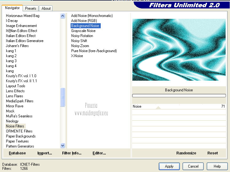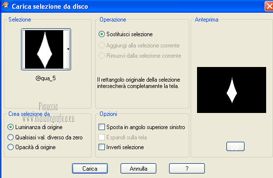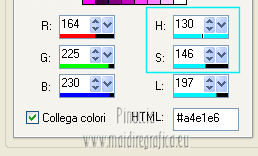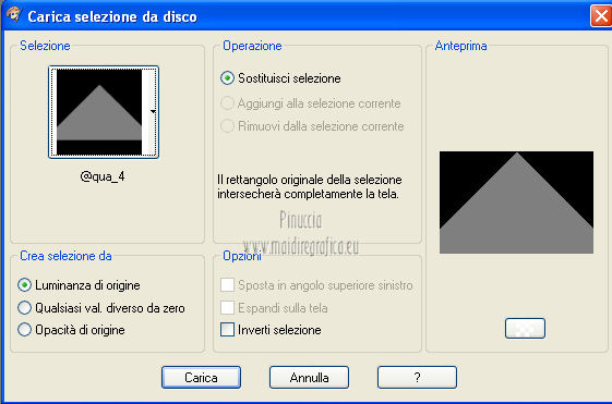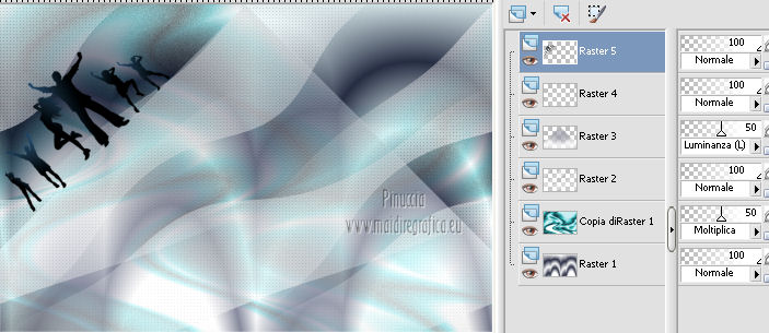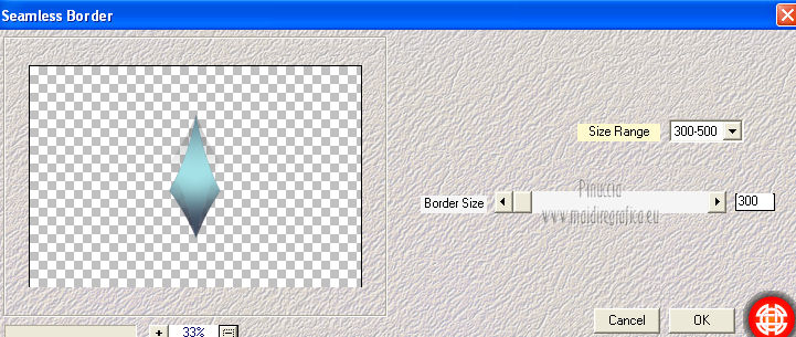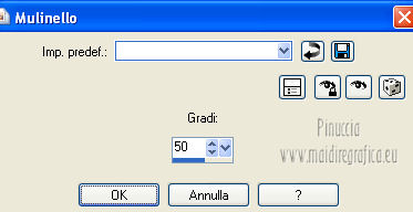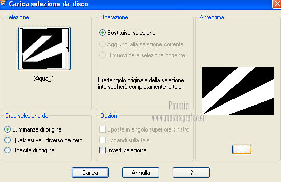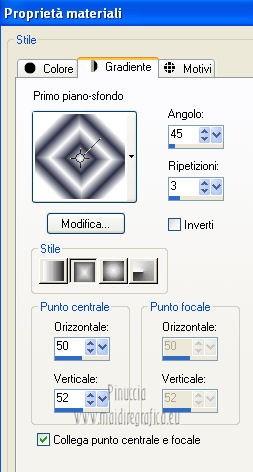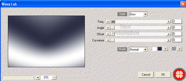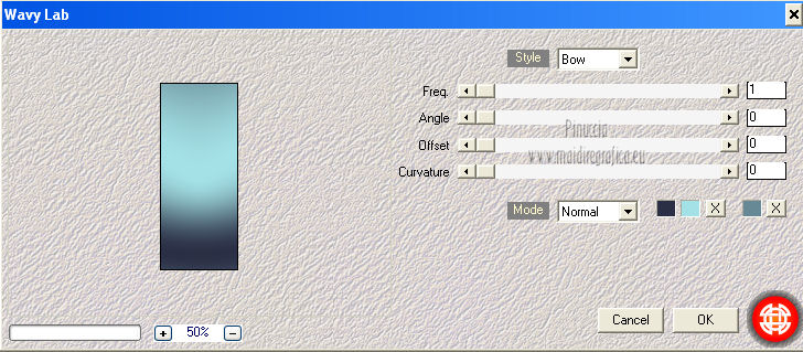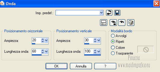 qui puoi trovare qualche risposta ai tuoi dubbi. Se l'argomento che ti interessa non è presente, ti prego di segnalarmelo. Questo tutorial è stato creato con PSP X3, ma può essere eseguito anche con le altre versioni di PSP. Per tradurlo, ho usato PSP X. Occorrente: Materiale qui Il tube della donna è di Cibi. Filtri in caso di dubbi, ricorda di consultare la mia sezione filtri qui Filters Unlimited 2.0 qui Mehdi qui AP Lines Lines - Lines SilverLining qui ![]() Metti le selezioni nella cartella Selezioni. Se utilizzi altri tubes e/o altri colori, puoi sperimentare le modalità di miscelatura e opacità più adatte. 1. Imposta il colore di primo piano con #ffffff, e il colore di sfondo con #2b2f45. ![]() Passa il colore di primo piano a Gradiente, stile Rettangolare ![]() 2. Apri una nuova immagine trasparente 900 x 600 pixels, e riempila con il gradiente.3. Effetti>Effetti di distorsione>Coordinate polari. ![]() 4. Livelli>Duplica. Regola>Tonalità e Saturazione>Viraggio, con i valori di Tonalità (H) e Saturazione (S) di un colore in armonia con il tuo lavoro; per l'esempio #a4e1e6. ![]() ![]() 5. Effetti>Effetti di distorsione>Onda. ![]() 6. Effetti>Plugins>Filters Unlimited 2.0 - Noise Filters - Background Noise. ![]() 7. Cambia la modalità di miscelatura di questo livello in Moltiplica, e abbassa l'opacità al 50%. ![]() 8. Livelli>Nuovo livello raster. Selezione>Carica/Salva selezione>Carica selezione da disco. Cerca e carica la selezione @qua_1. ![]() 9. Imposta l'opacità dello strumento Riempimento a 50,modalità di corrispondenza Nessuno (in questo modo, basterà un solo clic per riempire le selezioni. ![]() Riempi con il colore bianco.Selezione>Deseleziona. 10. Effetti>Effetti di distorsione>Mulinello. ![]() 11. Effetti>Effetti di immagine>Motivo unico. ![]() 12. Effetti>Plugins>Ap Lines - Lines SilverLining - Dotty Grid. ![]() 13. Selezione>Carica/Salva selezione>Carica selezione da disco. Cerca e carica la selezione @qua_4. ![]() 14. Inverti i colori nella paletta dei materiali (questo serve perchè il prossimo filtro lavora con i colori impostati nella paletta dei materiali). ![]() 15. Effetti>Plugins>Mehdi - Wavy Lab. come scritto sopra, il filtro lavora con i colori impostati, il primo è il colore di sfondo, il secondo è il colore di primo piano, mantieni il terzo colore impostato dal filtro. ![]() 16. Effetti>Plugins>AP Lines - Lines SilverLining - Horizontal Gaps. ![]() 17. Mantieni selezionato. Cambia la modalità di miscelatura di questo livello in Luminanza (esistente), e abbassa l'opacità di questo livello al 50%. ![]() 18. Livelli>Nuovo livello raster. Riporta l'opacità dello strumento Riempimento a 100 Riempi con il colore bianco.19. Selezione>Modifica>Contrai - 2 pixels. ![]() Premi sulla tastiera il tasto CANC ![]() Selezione>Deseleziona. 20. Apri il tube summer_beach e vai a Modifica>Copia. Torna al tuo lavoro e vai a Modifica>Incolla come nuovo livello. 21. Immagine>Ruota per gradi - 45 gradi a sinistra. ![]() Sposta il tube a sinistra sul bordo del triangolo.![]() 22. Livelli>Nuovo livello raster. Selezione>Carica/Salva selezione>Carica selezione da disco. Cerca e carica la selezione @qua_5. ![]() 23. Imposta il colore di primo piano con #b0f1f5, e il colore di sfondo con #2b2f45. ![]() 24. Effetti>Plugins>Mehdi - Wavy Lab il primo colore è il colore di sfondo, il secondo il colore di primo piano, mantieni il terzo colore creato dal filtro. ![]() Selezione>Deseleziona. 25. Effetti>Plugins>Mehdi - Seamless Border. ![]() 26. Sposta la forma a destra, come nell'esempio.![]() 27. Apri il tube Beauty_Georgina_CibiBijoux e vai a Modifica>Copia. Torna al tuo lavoro e vai a Modifica>Incolla come nuovo livello. Immagine>Ridimensiona, al 75%, tutti i livelli non selezionato. 28. Effetti>Effetti 3D>Sfalsa ombra, con il colore nero. ![]() 29. Sposta il tube leggermente più in basso.![]() 30. Immagine>Aggiungi bordatura, 2 pixels, simmetriche, con il colore #2b2f45. Immagine>Aggiungi bordatura, 35 pixels, simmetriche, con il colore #00f1f5. 31. Seleziona il bordo da 35 pixels con la bacchetta magica ![]() 32. Imposta il colore di primo piano con #00f1f5 (per il filtro Mehdi) ![]() 33. Effetti>Plugins>Mehdi - Wavy Lab. Mantieni il terzo colore creato dal filtro. ![]() 34. Selezione>Inverti. Effetti>Effetti 3D>Sfalsa ombra, con il colore nero. ![]() Selezione>Deseleziona. 35. Immagine>Aggiungi bordatura, 2 pixels, simmetriche, con il colore #2b2f45. Firma il tuo lavoro e salva in formato jpg. Per questi esempi ho usato tubes di Guismo ![]() Ket ![]() ![]() Se hai problemi o dubbi, o trovi un link non funzionante, o anche soltanto per un saluto, scrivimi. 8 Marzo 2013 |