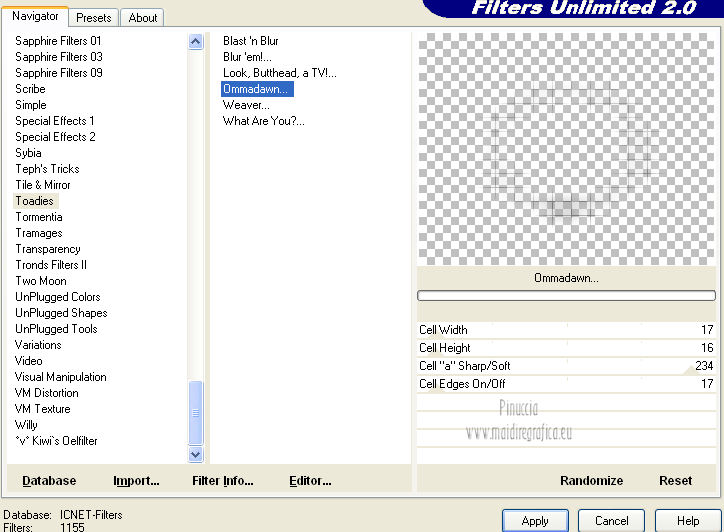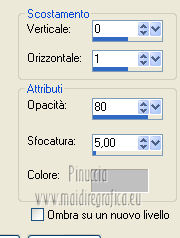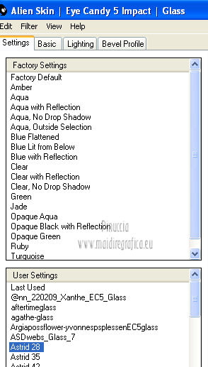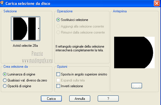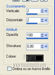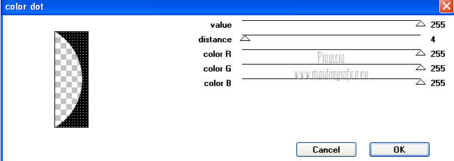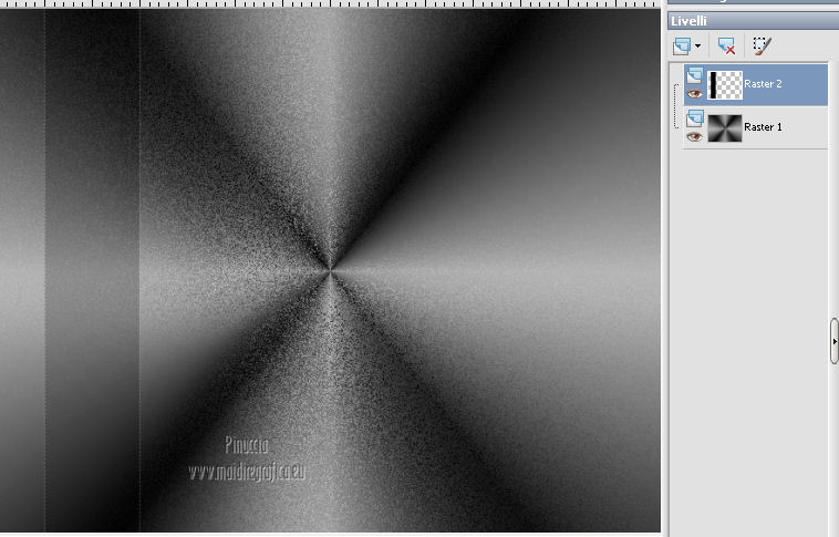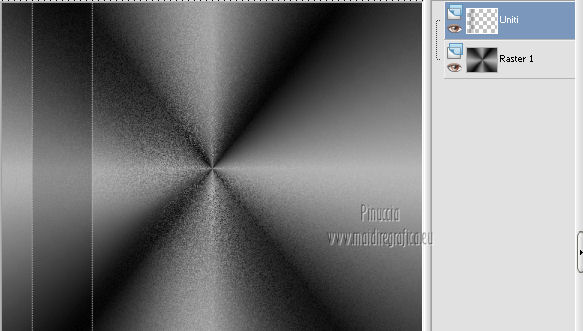qui puoi trovare qualche risposta ai tuoi dubbi. Se l'argomento che ti interessa non è presente, ti prego di segnalarmelo. Per tradurre questo tutorial ho usato PSP X. Questo tutorial è una creazione di ©Araemae e non può essere copiato su altri siti nè essere offerto per il download. Lo stesso vale per la mia traduzione. Il materiale viene da vari gruppi di condivisione. Il copyright appartiene ai rispettivi autori. Grazie ai creatori dei tubes che mettono a disposizione il loro lavoro in vari gruppi di condivisione. Occorrente: Materiale qui Il tube della donna è di Betsie Filtri: consulta, se necessario, la mia sezione filtri qui Filters Unlimited 2.0 qui VM Natural Speed qui Penta.com - Color dot qui Mura's Meister - Pole Transform qui Alien Skin Eye Candy 5 Impact - Glass, Perspective Shadow qui Toadies - Ommadawn qui I filtri VM Natural (come tutti quelli della serie Visman) e i filtri Toadies si possono usare da soli o importati in Unlimited ![]() Metti il preset "Astrid 28" nella cartella del filtro Alien Skin Eye Candy 5 Impact>Settings>Glass. Con un doppio clic sul file, il preset sarà automaticamente installato nella cartella corretta. Apri il font e minimizzalo. Lo troverai nella lista dei font disponibili quando ti servirà. Metti le selezioni nella cartella Selezioni. se stai usando altri colori, sei libero di sperimentare le modalità di miscelatura più adatte 1. Scegli due colori dal tuo tube imposta il colore di primo piano con il colore scuro (il mio #000000), e il colore di sfondo con il colore chiaro (il mio #c0c0c0). ![]() Passa il colore di primo piano a Gradiente, stile Radiale, con i seguenti settaggi. ![]() Apri una nuova immagine trasparente 800 x 600 pixels, e riempila con il gradiente.2. Effetti>Plugins>VM Natural - Speed. ![]() 3. Livelli>Nuovo livello raster. Attiva lo strumento Selezione ,clicca sull'icona Selezione personalizzata ![]() e imposta i seguenti settaggi: ![]() Riempi la selezione con il colore scuro.Selezione>Deseleziona. Abbassa l'opacità di questo livello al 20%. 4. Passa il colore chiaro a colore di primo piano, e chiudi il colore di sfondo. Attiva lo strumento Penna , linea di stile Punto.![]() Traccia una linea dall'alto in basso, come nell'esempio, tenendo premuto il tasto della maiuscola, per ottenere una linea perfettamente diritta. ![]() Livelli>Converti in livello raster. 5. Livelli>Duplica. Sposta la linea dall'altra parte della striscia.![]() Livelli>Unisci>Unisci giù. Se le linee "sbiadiscono" come nell'esempio sotto. ![]() annulla l'azione (Modifica>Annulla azione unione livello sottostante) chiudi il livello inferiore e usa il comando Unisci visibile Dovresti avere questo. ![]() 6. Livelli>Duplica. Immagine>Ruota per gradi - 90 gradi a sinistra. ![]() 7. Effetti>Effetti di distorsione>Vento - da sinistra, intensità 100. ![]() Rinomina questo livello "vento". 8. Livelli>Nuovo livello raster. Selezione personalizzata ![]() ![]() Riempi la selezione con il colore scuro.Selezione>Deseleziona. Abbassa l'opacità al 55%. 9. Imposta il colore di primo piano con il colore chiaro, e chiudi il colore di sfondo. Attiva nuovamente lo strumento Penna con i settaggi del punto 4.Traccia una linea da sinistra a destra, sopra la striscia nera creata al punto 8. ![]() Livelli>Converti in livello raster. Livelli>Unisci>Unisci giù. Livelli>Duplica. Immagine>Capovolgi. 10. Apri il tube 28.AstridBlokjes e vai a Modifica>Copia. Torna al tuo lavoro e vai a Modifica>Incolla come nuovo livello. Spostalo a sinistra, contro il bordo.11. Livelli>Nuovo livello raster. Selezione>Carica/Salva selezione>Carica selezione da disco. Cerca e carica la selezione "Astrid selectie 28". ![]() Riempi con il colore chiaro.12. Effetti>Plugins>Alien Skin Eye Candy 5 Impact - Glass, seleziona il preset "Astrid 28" e ok. ![]() Selezione>Deseleziona. Livelli>Duplica. Immagine>Capovolgi. 13. Attiva il livello Raster 1. Selezione>Seleziona tutto. Immagine>Ritaglia la selezione. 14. Attiva il livello "vento". Livelli>Duplica. Effetti>Plugins>Mura's Meister - Pole Transform. ![]() 15. Livelli>Duplica. Livelli>Unisci>Unisci giù. 16. Livelli>Duplica. Effetti>Effetti di bordo>Aumenta. Effetti>Effetti di distorsione>Vento, come al punto 7. ![]() 17. Attiva il livello superiore. Apri il tube "28 Astrid Bolletjes" e vai a Modifica>Copia. Torna al tuo lavoro e vai a Modifica>Incolla come nuovo livello. Effetti>Effetti di immagine>Scostamento. ![]() Effetti>Effetti 3D>Sfalsa ombra, con il colore nero. ![]() 17. Livelli>Nuovo livello raster. Selezione>Carica/Salva selezione>Carica selezione da disco. Cerca e carica la selezione "Astrid selectie 28a". ![]() Riempi con il colore scuro.Effetti>Plugins>Penta.com - Color Dot. ![]() Selezione>Deseleziona. Abbassa l'opacità di questo livello al 50%. Livelli>Disponi>Sposta giù - 5 volte. Rimani su questo livello. 18. Apri il tube "Betsie 631_02_02_2011" e vai a Modifica>Copia. Torna al tuo lavoro e vai a Modifica>Incolla come nuovo livello. Immagine>Ridimensiona, all'80%, tutti i livelli non selezionato. Sposta il tube a destra, contro il bordo.19. Effetti>Plugins>Alien Skin Eye Candy 5 Impact - Perspective Shadow. Seleziona il preset Drop Shadow,Blurry e ok. ![]() 20. Attiva nuovamente il livello "vento". Livelli>Duplica. Effetti>Effetti di distorsione>Coordinate polari. ![]() Livelli>Duplica. Immagine>Rifletti. Livelli>Unisci>Unisci giù. 21. Effetti>Plugins>Filters Unlimited 2.0 - Toadies - Ommadawn. ![]() (se stai usando altri colori, gioca con le modalità di miscelatura). 22. Attiva il livello superiore. Livelli>Nuovo livello raster. Imposta il colore di sfondo con il colore scuro, e chiudi il colore di primo piano. Attiva lo strumento Testo , font Balmoral LET,![]() Scrivi il testo "Attitude". Livelli>Converti in livello raster. Effetti>Effetti 3D>Sfalsa ombra, con il colore chiaro. ![]() 23. Immagine>Aggiungi bordatura, 1 pixel, simmetriche, con il colore scuro. Immagine>Aggiungi bordatura, 25 pixels, simmetriche, con il col