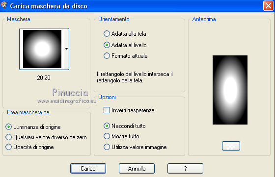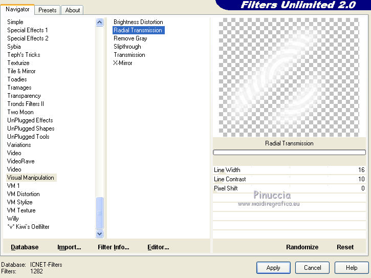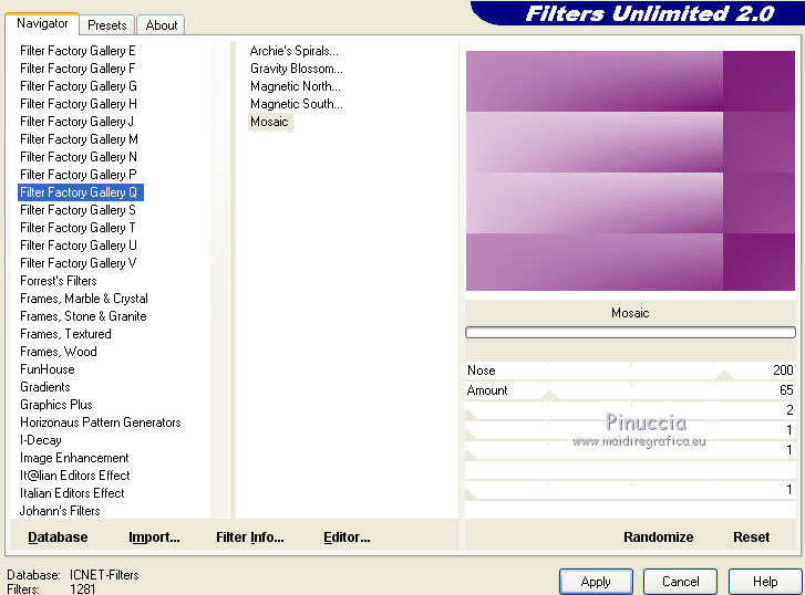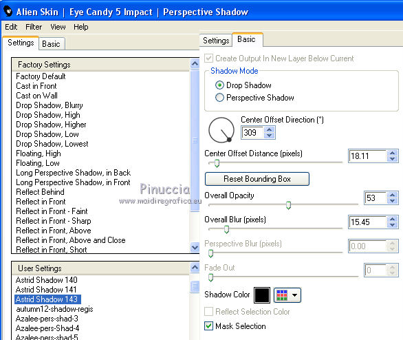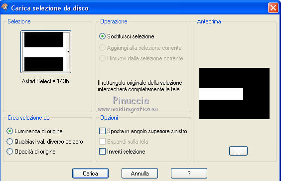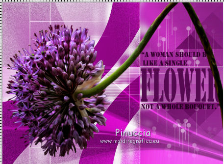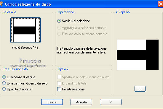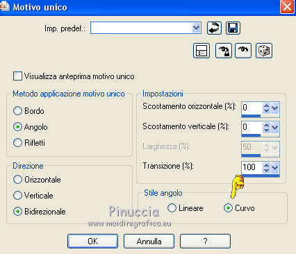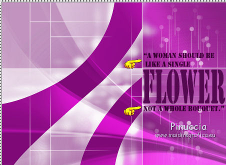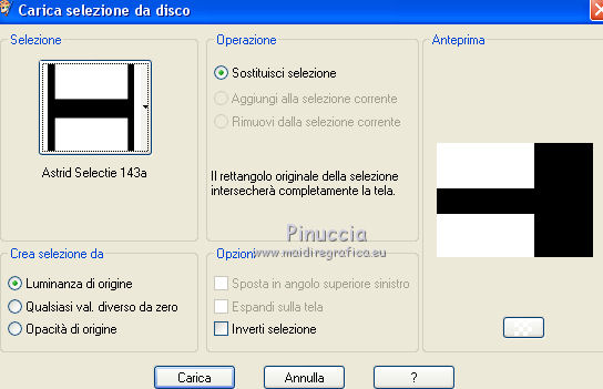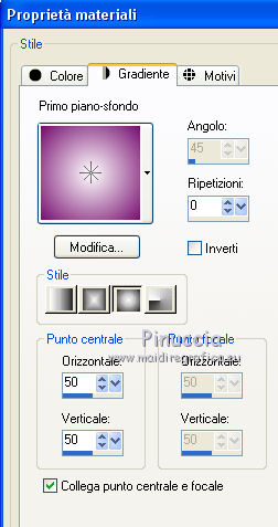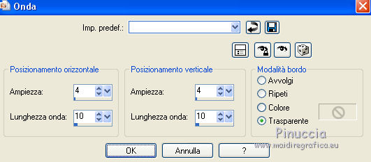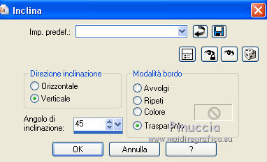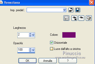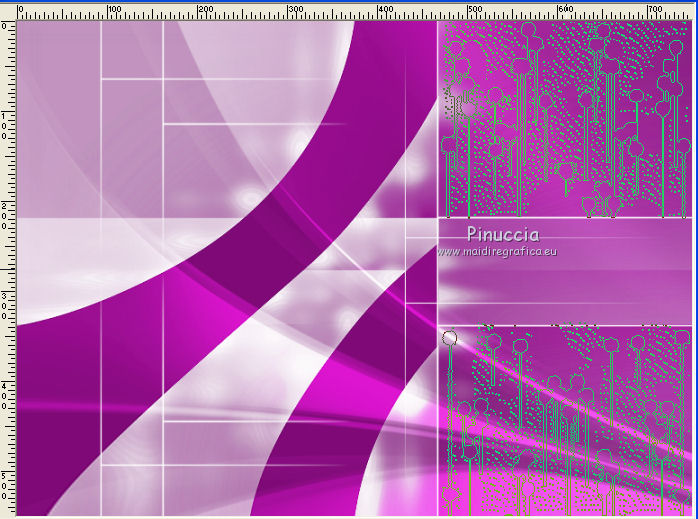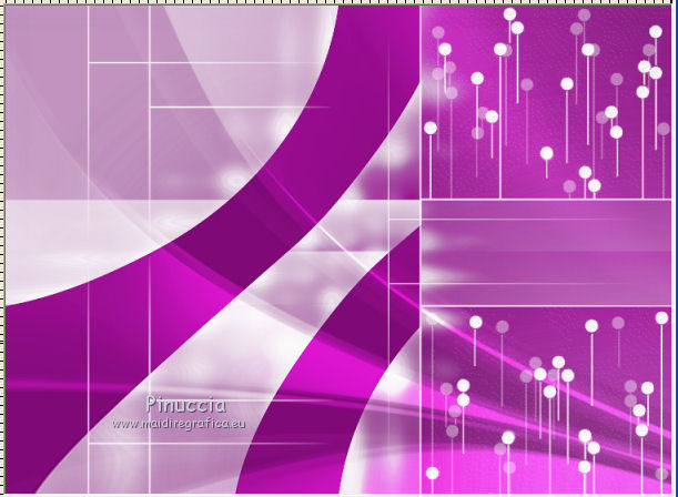 qui puoi trovare qualche risposta ai tuoi dubbi. Se l'argomento che ti interessa non è presente, ti prego di segnalarmelo. Per tradurre questo tutorial ho usato PSP X. Questo tutorial è stato creato con PspX5, ma può essere realizzato anche con le altre versioni di PSP. Dalla versione X4, il comando Immagine>Rifletti è stato sostituito con Immagine>Capovolgi in orizzontale, e il comando Immagine>Capovolgi con Immagine>Capovolgi in verticale. Nelle versioni X5 e X6, le funzioni sono state migliorate rendendo disponibile il menu Oggetti. Nella nuova versione X7 sono tornati Rifletti/Capovolgi, ma con nuove differenze. Vedi la scheda sull'argomento qui Per tradurre il tutorial ho usato PSPX. Occorrente: Materiale qui Per il tube del fiore grazie Yoka Filtri: consulta, se necessario, la mia sezione filtri qui Filters Unlimited 2.0 qui Filter Factory Gallery Q - Mosaic qui Visual Manipulation - Radial Transmission qui Alf's Border FX - Border Fade III qui Simple - 4Way Average qui Alien Skin Eye Candy 5 Impact - Perspective Shadow qui I filtri Factory Gallery, Visual Manipulation, Alf's Border e Simple si possono usare da soli o importati in Filters Unlimited (come fare vedi qui) Se un filtro fornito appare con questa icona ![]() se stai usando altri colori, sei libero di sperimentare le modalità di miscelatura più adatte Metti il preset Cliccando sul file una o due volte (a seconda delle tue impostazioni), automaticamente il preset si installerà nella cartella corretta. perchè uno o due clic vedi qui Metti il pennello nella cartella Pennelli. Attenzione, il pennello è composto da due files che non devono essere separati. Vedi gli appunti sui pennelli qui Metti le selezioni nella cartella Selezioni. Metti la maschera nella cartella Maschere. 1. Scegli due colori dal tuo tube e imposta il colore di primo piano con il colore chiaro, e il colore di sfondo con il colore scuro. I miei colori. ![]() Passa il colore di primo piano a Gradiente di primo piano/sfondo, stile Sprazzo di luce. ![]() Apri una nuova immagine trasparente 750 x 550 pixels, e riempila con il gradiente.2. Effetti>Plugins>Filters Unlimited 2.0 - Filter Factory Gallery Q - Mosaic. ![]() 3. Effetti>Effetti di distorsione>Stringi (nelle versioni più recenti è diventato Compressione). ![]() 4. Livelli>Nuovo livello raster. Selezione>Carica/Salva selezione>Carica selezione da disco. Cerca e carica la selezione "Astrid selectie 143". ![]() Riporta il colore di primo piano a Colore, e riempi la selezione con il colore di primo piano.Selezione>Deseleziona. 5. Effetti>Effetti geometrici>Inclina. ![]() 6. Effetti>Effetti 3D>Sfalsa ombra, colore bianco, ombra su nuovo livello selezionato. ![]() 7. Attiva il livello superiore e clicca sulla freccia rossa per eliminarlo. ![]() Rimani posizionato sul livello dell'ombra. ![]() 8. Effetti>Plugins>Filters Unlimited 2.0 - Visual Manipulation - Radial Transmission. ![]() 9. Effetti>Effetti di distorsione>Onda. ![]() 10. Livelli>Nuovo livello raster. Selezione>Carica/Salva selezione>Carica selezione da disco. Carica nuovamente la selezione "Astrid selectie 143". ![]() Riempi la selezione con il colore di sfondo.Selezione>Deseleziona. 11. Effetti>Effetti geometrici>Inclina. ![]() 12. Livelli>Unisci>Unisci visibile. 13. Effetti>Effetti di distorsione>Stringi (Compressione), con i settaggi precedenti. Dovresti avere questo. ![]() 14. Livelli>Nuovo livello raster. Riempi il livello con il colore di primo piano.15. Livelli>Carica/Salva maschera>Carica maschera da disco. Cerca e carica la maschera "Astrid masker 143". ![]() Livelli>Unisci>Unisci gruppo. Cambia la modalità di miscelatura di questo livello in Sovrapponi. 16. Attiva lo strumento Penna con i seguenti settaggi:![]() Traccia una linea verticale tenendo premuto il tasto della maiuscola per ottenere una linea perfettamente diritta, ![]() Per rimanere sullo stesso livello clicca su Applica nella barra superiore degli strumenti ![]() 17. Traccia ora due linee orizzontali, sempre tenendo premuto il tasto della maiuscola, sulle linee preesistenti a destra (cliccando Applica dopo averle tracciate). ![]() Livelli>Converti in livello raster. 18. Livelli>Duplica. Effetti>Effetti di immagine>Motivo unico. ![]() 19. Livelli>Duplica. Effetti>Effetti di distorsione>Stringi (Compressione), con i settaggi precedenti. Risultato: ![]() 20. Livelli>Nuovo livello raster. Attiva lo strumento Pennello ![]() cerca e seleziona il pennello "Astrid penseel 143" ![]() e applicalo sulla banda a destra cliccando con il tasto sinistro del mouse, per usare il colore bianco di primo piano. ![]() ![]() se il tuo PSP non supporta pennelli superiori a 500 pixels, dopo averlo applicato alla dimensione massima di 500 pixels attiva lo strumento Puntatore ![]() se stai usando PSP 9 lo strumento Deformazione ![]() ![]() in modalità Scala ![]() allarga il pennello sulla banda a destra usando i nodi centrali dello strumento. ![]() 21. Sullo stesso livello: Livelli>Carica/Salva maschera>Carica maschera da disco. Cerca e carica la maschera 20-20. ![]() Livelli>Unisci>Unisci gruppo. Cambia la modalità di miscelatura di questo livello in Filtra e abbassa l'opacità al 70%. 22. Apri "Astrid tekst 143". Attiva il livello "Tekst groot" e vai a Modifica>Copia. Torna al tuo lavoro e vai a Modifica>Incolla come nuovo livello. Spostalo sulla striscia a destra.![]() 23. Attiva nuovamente "Astrid tekst 143" e copia il livello "Tekst klein". Torna al tuo lavoro e vai a Modifica>Incolla come nuovo livello. Spostalo come nell'esempio.![]() Mantieni la modalità di miscelatura in Moltiplica. 24. Livelli>Nuovo livello raster. Selezione>Carica/Salva selezione>Carica selezione da disco. Cerca e carica la selezione "Astrid selectie 143a". ![]() Riempi la selezione con il colore di sfondo.25. Effetti>Plugins>Filters Unlimited 2.0 - Alf's Border FX - Border Fade III. ![]() Selezione>Deseleziona. Cambia la modalità di miscelatura di questo livello in Sovrapponi e abbassa l'opacità al 50%. 26.
