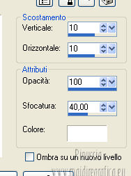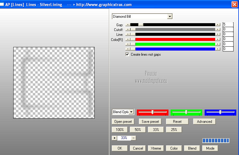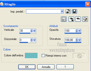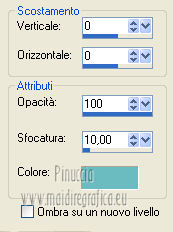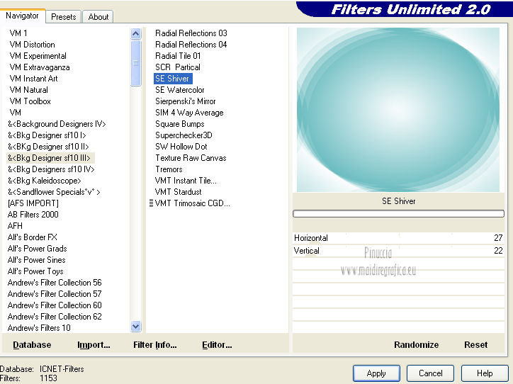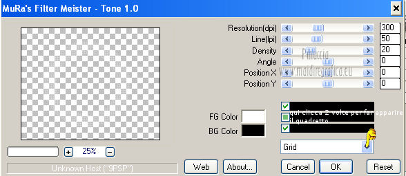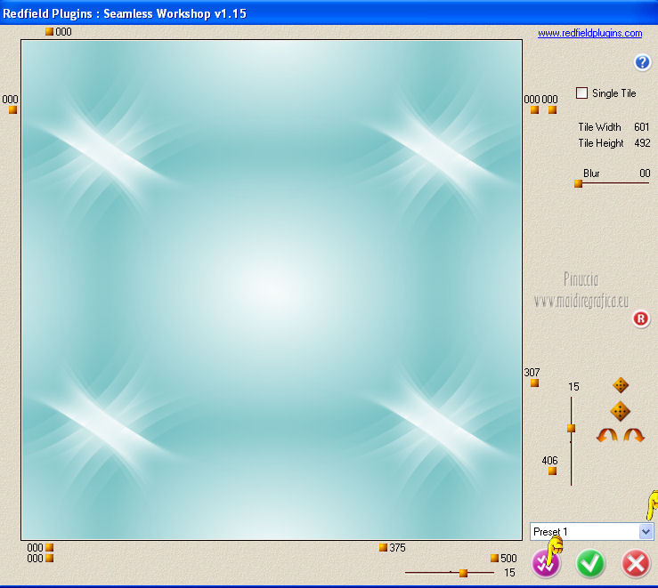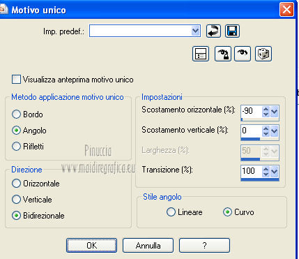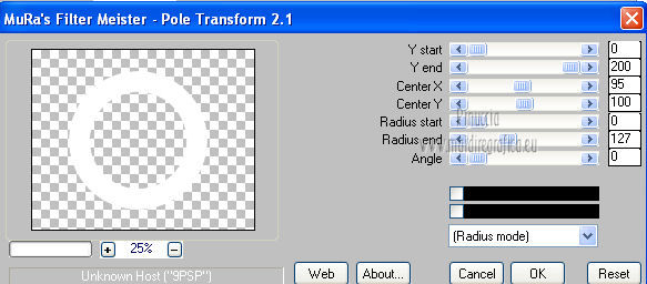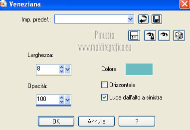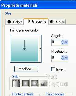 qui puoi trovare qualche risposta ai tuoi dubbi. Se l'argomento che ti interessa non è presente, ti prego di segnalarmelo. Per tradurre questo tutorial ho usato PSP X. Questo tutorial è una creazione di ©Araemae e non può essere copiato su altri siti nè essere offerto per il download. Lo stesso vale per la mia traduzione. Il materiale viene da vari gruppi di condivisione. Il copyright appartiene ai rispettivi autori. Grazie ai creatori dei tubes che mettono a disposizione il loro lavoro in vari gruppi di condivisione. Occorrente: Materiale qui Il tube della donna è di Betsie Filtri: consulta, se necessario, la mia sezione filtri qui FM Tile Tools - Blend Emboss qui Mura's Meister - Pole Transform qui Mura's Meister - Tone qui AP Lines - Lines SilverLining qui Filters Unlimited qui &<Bkg designer sf10 III> qui Redfield - Seamless Workshop qui ![]() Metti la selezione nella cartella Selezioni. se stai usando altri colori, sei libero di sperimentare le modalità di miscelatura più adatte 1. Scegli un colore dal tuo tube e impostalo come colore di primo piano (il mio #6abcc0). Imposta il colore di sfondo con il colore bianco. I miei colori. ![]() Passa il colore di primo piano a Gradiente, stile Lineare, con i seguenti settaggi. ![]() Apri una nuova immagine trasparente 800 x 650 pixels, e riempila con il gradiente.2. Effetti>Effetti di distorsione>Coordinate polari. ![]() 3. Effetti>Plugins>Filters Unlimited 2.0 - &<Bkg designer sf10 III> - SE Shiver. ![]() 4. Effetti>Plugins>Redfield Seamless Workshop. Seleziona il preset "Preset 1" e prima di cliccare ok, clicca sull'icona a sinistra (indicata dalla manina). ![]() Effetti>Effetti di bordo>Aumenta. 5. Effetti>Plugins>FM Tile Tools - Blend Emboss, con i settaggi standard. ![]() 6. Livelli>Nuovo livello raster. Attiva lo strumento Selezione ,clicca sull'icona Selezione personalizzata ![]() e imposta i seguenti settaggi: ![]() Riempi la selezione con il colore bianco.Selezione>Deseleziona. 7. Effetti>Plugins>Mura's Meister - Pole Transform. ![]() 8. Effetti>Plugins>Mura's Meister - Tone. imposta i colori FG con il colore bianco e BG con il colore nero e imposta i settaggi come indicato nella schermata ![]() 9. Effetti>Effetti di trama>Veneziana, con il colore di primo piano. ![]() 10. Effetti>Effetti di immagine>Motivo unico. ![]() Regola>Messa a fuoco>Metti a fuoco. Livelli>Duplica. Livelli>Unisci>Unisci giù. 11. Livelli>Nuovo livello raster. Selezione>Seleziona tutto. Selezione>Modifica>Contrai - 75 pixels. Riempi con il colore bianco.Selezione>Modifica>Contrai - 1 pixel. Riempi con il colore di primo piano.Selezione>Modifica>Contrai - 25 pixels. Premi sulla tastiera il tasto CANC. Selezione>Deseleziona. 12. Effetti>Effetti di immagine>Motivo unico. ![]() 13. Effetti>Effetti 3D>Sfalsa ombra, con il colore bianco, ombra su nuovo livello selezionato. ![]() Rimani posizionato sul livello dell'ombra. 14. Effetti>Plugins>AP lines - SilverLining - Diamond Bill. ![]() 15. Attiva il livello superiore. Livelli>Nuovo livello raster. Selezione>Carica/Salva selezione>Carica selezione da disco. Cerca e carica la selezione "Astrid selectie 34". ![]() 16. Effetti>Effetti 3D>Ritaglio, con il colore di primo piano. ![]() 17. Effetti>Plugins>AP lines - SilverLining - Dotty Grid. ![]() Selezione>Deseleziona. Livelli>Duplica. Livelli>Unisci>Unisci giù. 18. Livelli>Nuovo livello raster. Selezione>Seleziona tutto. Selezione>Modifica>Contrai - 125 pixels. Riempi con il colore bianco.Selezione>Modifica>Contrai - 2 pixels. Premi sulla tastiera il tasto CANC. Selezione>Deseleziona. 19. Effetti>Effetti di immagine>Motivo unico. ![]() 20. Effetti>Effetti 3D>Sfalsa ombra, con il colore di primo piano, non dimenticare di togliere la selezione a Ombra su nuovo livello. ![]() 21. Apri il tube "Astrid 34 Abstract" e vai a Modifica>Copia. Torna al tuo lavoro e via a Modifica>Incolla come nuovo livello. 22. Apri "Astrid 34 Test" e vai a Modifica>Copia. Torna al tuo lavoro e via a Modifica>Incolla come nuovo livello. Spostalo in basso.23. Apri il tube "Betsie 648_04-02-2011" e vai a Modifica>Copia. Torna al tuo lavoro e via a Modifica>Incolla come nuovo livello. Posiziona il tube contro il bordo superiore.Effetti>Effetti 3D>Sfalsa ombra, con il colore bianco. ![]() 24. Livelli>Unisci>Unisci tutto. Immagine>Ridimensiona, al 75%, tutti i livelli selezionato. Regola>Messa a fuoco>Metti a fuoco. 25. Immagine>Aggiungi bordatura, 2 pixels, simmetriche, con il colore bianco. Immagine>Aggiungi bordatura, 100 pixels, simmetriche, con il colore di primo piano. Immagine>Aggiungi bordatura, 2 pixels, simmetriche, con il colore bianco. 26. Aggiungi il tuo nome e/o il tuo watermark su un nuovo livello. Livelli>Unisci>Unisci tutto e salva in formato jpg. ![]() Se hai problemi o dubbi, o trovi un link non funzionante, o anche soltanto per un saluto, scrivimi. 4 Agosto 2012 |