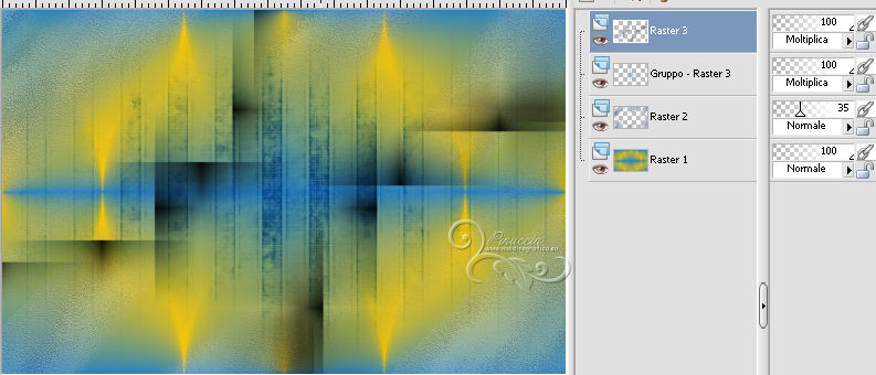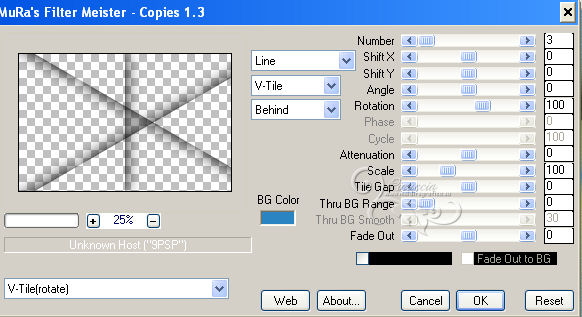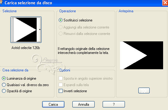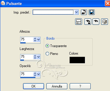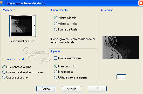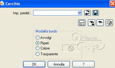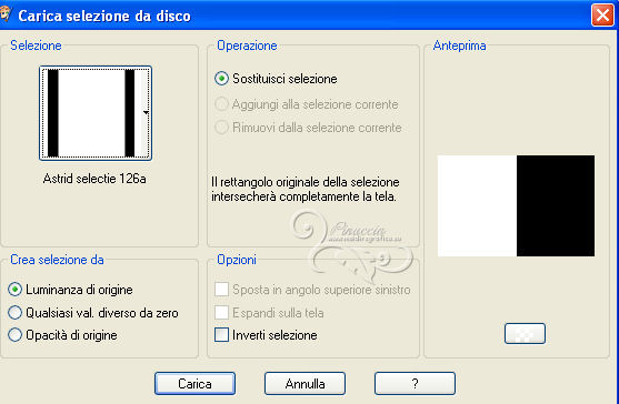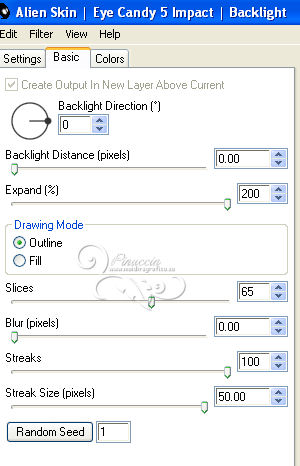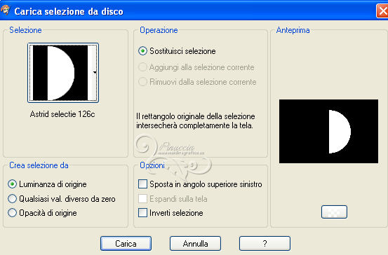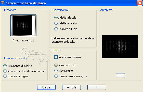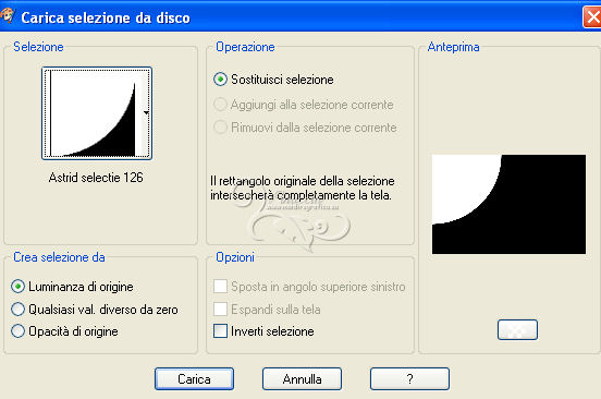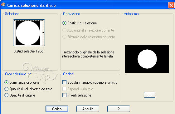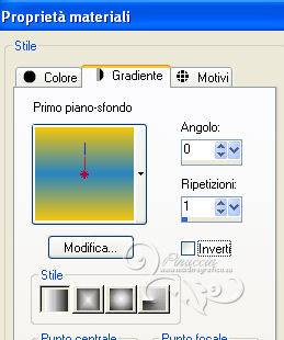 qui puoi trovare qualche risposta ai tuoi dubbi. Se l'argomento che ti interessa non è presente, ti prego di segnalarmelo. Per tradurre questo tutorial ho usato PSP X. Questo tutorial è una creazione di ©Araemae e non può essere copiato su altri siti nè essere offerto per il download. Lo stesso vale per la mia traduzione. Il materiale viene da vari gruppi di condivisione. Il copyright appartiene ai rispettivi autori. Grazie ai creatori dei tubes che mettono a disposizione il loro lavoro in vari gruppi di condivisione. Occorrente: Materiale qui Per il tube usato grazie Nikita. Filtri: consulta, se necessario, la mia sezione filtri qui Alien Skin Eye Candy 5 Impact - Backlight, Perspective Shadow qui Mehdi - Weaver qui Mura's Meister - Copies qui L and K landksiteofwonders - L en K's Zitah qui ![]() Metti i preset Cliccando sul file una o due volte (a seconda delle tue impostazioni), automaticamente il preset si installerà nella cartella corretta. perchè uno o due clic vedi qui Metti le selezioni nella cartella Selezioni. Metti le maschere nella cartella Maschere. se stai usando altri colori, sei libero di sperimentare le modalità di miscelatura più adatte 1. Scegli due colori, e imposta il colore di primo piano con il colore chiaro, e il colore di sfondo con il colore scuro. I miei colori. ![]() Passa il colore di primo piano a Gradiente, stile Lineare, con i seguenti settaggi. ![]() Apri una nuova immagine trasparente 850 x 550 pixels, e riempila con il gradiente.2. Effetti>Effetti geometrici>Cerchio. ![]() 3. Effetti>Effetti di immagine>Motivo unico. ![]() 4. Apri "Astrid deco 126" e vai a Modifica>Copia. Torna al tuo lavoro e vai a Modifica>Incolla come nuovo livello. Abbassa l'opacità di questo livello al 35%. 5. Livelli>Nuovo livello raster. Riempi con il colore di sfondo.6. Livelli>Carica/Salva maschera>Carica maschera da disco. Cerca e carica la maschera "Astrid masker 126". ![]() Livelli>Unisci>Unisci gruppo. Cambia la modalità di miscelatura di questo livello in Moltiplica. 7. Livelli>Nuovo livello raster. Selezione>Carica/Salva selezione>Carica selezione da disco. Cerca e carica la selezione "Astrid selectie 126". ![]() 8. Effetti>Effetti 3D>Sfalsa ombra. ![]() Selezione>Deseleziona. 9. Livelli>Duplica. Immagine>Rifletti. Immagine>Capovolgi. Livelli>Unisci>Unisci giù. 10. Effetti>Plugins>Mehdi - Weaver. ![]() 11. Livelli>Duplica. Livelli>Unisci>Unisci giù. Cambia la modalità di miscelatura di questo livello in Moltiplica. ![]() 12. Livelli>Nuovo livello raster. Selezione>Carica/Salva selezione>Carica selezione da disco. Cerca e carica la selezione "Astrid selectie 126a". ![]() 13. Effetti>Effetti 3D>Sfalsa ombra, con i settaggi precedenti. ![]() Selezione>Deseleziona. 14. Effetti>Plugins>Mura's Meister - Copies. ![]() 15. Effetti>effetti di immagine>Motivo unico, con i settaggi precedenti. ![]() Cambia la modalità di miscelatura di questo livello in Rafforza. 16. Livelli>Nuovo livello raster. Selezione>Carica/Salva selezione>Carica selezione da disco. Cerca e carica la selezione "Astrid selectie 126b". ![]() 17. Riempi la selezione con il gradiente del punto 1.![]() Selezione>Deseleziona. 18. Effetti>Effetti di immagine>Motivo unico, con i settaggi precedenti. ![]() 19. Effetti>Plugins>L and K landksiteofwonders - L and K's Zitah. ![]() Cambia la modalità di miscelatura di questo livello in Sovrapponi. ![]() 20. Livelli>Unisci>Unisci visibile. 21. Livelli>Nuovo livello raster. Selezione>Carica/Salva selezione>Carica selezione da disco. Cerca e carica la selezione "Astrid selectie 126c". ![]() 22. Riempi la selezione con il colore di sfondo.Selezione>Deseleziona. Cambia la modalità di miscelatura di questo livello in Moltiplica, e abbassa l'opacità al 30%. 23. Livelli>Duplica. Immagine>Ridimensiona, all'80%, tutti i livelli non selezionato. Cambia la modalità di miscelatura di questo livello in Filtra, e aumenta l'opacità al 50%. 24. Livelli>Duplica. Immagine>Ridimensiona, al 75%, tutti i livelli non selezionato. Mantieni la modalità di miscelatura in Filtra e l'opacità al 50%. 25. Livelli>Duplica. Immagine>Rifletti. Immagine>Ridimensiona, al 50%, tutti i livelli non selezionato. Cambia la modalità di miscelatura di questo livello in Moltiplica, e riporta l'opacità a 100. ![]() 26. Livelli>Unisci>Unisci visibile. 27. Livelli>Nuovo livello raster. Selezione>Carica/Salva selezione>Carica selezione da disco. Cerca e carica la selezione "Astrid selectie 126d". ![]() 28. Riempi la selezione con il colore di sfondo.Selezione>Modifica>Contrai - 4 pixels. Premi sulla tastiera il tasto CANC ![]() Selezione>Deseleziona. 29. Effetti>Plugins>Alien Skin Eye Candy 5 Impact - Backlight. Seleziona il preset Astrid Backlight 126 e ok. ![]() Questi i settaggi che, in caso di problemi con il preset, puoi impostare manualmente. ![]() 30. Selezione>Carica/Salva selezione>Carica selezione da disco. Carica nuovamente la selezione "Astrid selectie 126d". ![]() Premi sulla tastiera il tasto CANC. Selezione>Deseleziona. 31. Apri "Astrid tekst 126" e vai a Modifica>Copia. Torna al tuo lavoro e vai a Modifica>Incolla come nuovo livello. Spostalo contro il bordo a destra.Mantieni la modalità di miscelatura già impostata in Luce diffusa. ![]() 32. Livelli>Nuovo livello raster. Riempi il livello con il colore di sfondo.33. Livelli>Carica/Salva maschera>Carica maschera da disco. Cerca e carica la maschera "Astrid masker 126a". ![]() Livelli>Unisci>Unisci gruppo. Cambia la modalità di miscelatura di questo livello in Moltiplica. ![]() 34. Inverti i colori nella paletta dei materiali e chiudi il colore di sfondo. ![]() 35. Attiva lo strumento Penna ![]() linea di stile Punto, larghezza 2. ![]() 36. Traccia una linea come nell'esempio. ![]() Livelli>Converti in livello raster. Cambia la modalità di miscelatura di questo livello in Moltiplica. 37. Livelli>Duplica. Immagine>Capovolgi. Livelli>Unisci>Unisci giù. 38. Effetti>Effetti di immagine>Motivo unico, con i settaggi precedenti. ![](