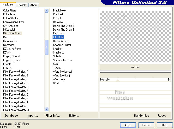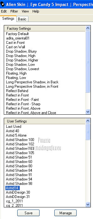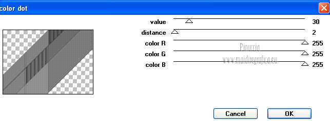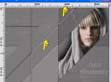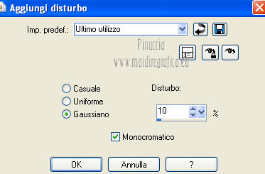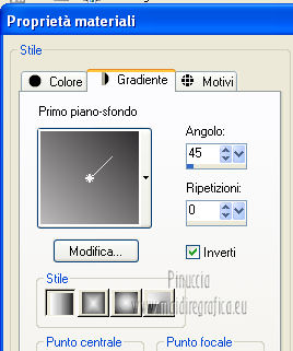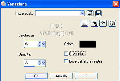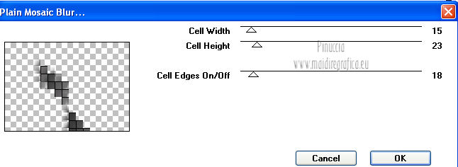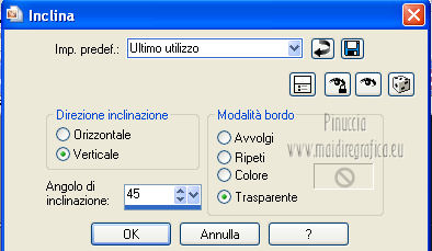 qui puoi trovare qualche risposta ai tuoi dubbi. Se l'argomento che ti interessa non è presente, ti prego di segnalarmelo. Per tradurre questo tutorial ho usato PSP X. Questo tutorial è una creazione di ©Araemae e non può essere copiato su altri siti nè essere offerto per il download. Lo stesso vale per la mia traduzione. Il materiale viene da vari gruppi di condivisione. Il copyright appartiene ai rispettivi autori. Grazie ai creatori dei tubes che mettono a disposizione il loro lavoro in vari gruppi di condivisione. Occorrente: Materiale qui Non conosco l'autore dei tubes. Filtri: consulta, se necessario, la mia sezione filtri qui L&K - L&K Jouri qui L&K - L&K Zitah qui Simple - Center Tile qui Filters Unlimited 2.0 qui Penta.com - Color Dot qui Alien Skin Eye Candy 5 Impact - Perspective Shadow qui Toadies - Plain Mosaic Blur qui ![]() Metti il preset "Astrid 14" nella cartella del filtro Alien Skin Eye Candy 5 Impact>Settings>Shadow. Cliccando sul file, il preset sarà automaticamente installato nella cartella corretta. se stai usando altri colori, sei libero di sperimentare le modalità di miscelatura più adatte 1. Scegli due colori dal tuo tube. Imposta il colore scuro come colore di primo piano, e il colore chiaro come colore di sfondo. ![]() Passa il colore di primo piano a Gradiente. ![]() Apri una nuova immagine trasparente 700 x 500 pixels, e riempila con il gradiente.2. Effetti>Plugins>L&K's - L&K Youri. ![]() 3. Effetti>Plugins>Simple - Center Tile. 4. Attiva lo strumento Bacchetta magica ![]() ![]() Clicca nei piccoli bordi per selezionarli ingrandisci l'immagine per vedere meglio usando la rotellina del mouse. ![]() 5. Livelli>Nuovo livello raster. Riempi la selezione con il colore chiaro.Selezione>Deseleziona. 6. Attiva il livello Raster 1. Livelli>Duplica. Effetti>Effetti geometrici>Inclina. ![]() Rinomina questo livello "inclinato". 7. Attiva il livello Raster 1. Effetti>Plugins>L&K's - L&K Zitah. ![]() 8. Regola>Aggiungi/Rimuovi disturbo>Aggiungi disturbo. ![]() 9. Attiva il livello Raster 2. Effetti>Plugins>Filters Unlimited 2.0 - Distortion Filters - Inktblots. ![]() Regola>Sfocatura>Sfocatura gaussiana - raggio 5. ![]() Immagine>Rifletti. 10. Attiva il livello "inclinato". Clicca nel riquadro indicato nella schermata con la bacchetta magica ![]() ![]() Livelli>Nuovo livello raster. 11. Apri il tube "Femmepullgrisface". Assicurati di essere posizionato sul livello del tube. Effetti>Plugins>Alien Skin Eye Candy 5 Impact - Perspective Shadow. Seleziona il preset Astrid 14 e ok. ![]() Modifica>Copia. Torna al tuo lavoro e vai a Modifica>Incolla nella selezione. Selezione>Deseleziona. 12. Attiva nuovamente il livello "inclinato". Seleziona con la bacchetta magica ![]() le due sezioni mostrate nell'esempio sotto. ![]() Effetti>Effetti di trama>Veneziana - colore nero. ![]() Selezione>Innalza selezione a livello. Selezione>Deseleziona. 13. Immagine>Capovolgi. Effetti>Plugins>Toadies - Plain Mosaic Blur. ![]() Effetti>Effetti di bordo>Aumenta. 14. Livelli>Duplica, e attiva il livello sottostante dell'originale. Effetti>Effetti di distorsione>Vento - da sinistra, intensità 100. ![]() 15. Attiva nuovamente il livello "inclinato". Effetti>Plugins>Penta.com - Color dot. ![]() Effetti>Effetti 3D>Sfalsa ombra, con il colore nero. ![]() 16. Attiva il livello superiore. Apri il tube "Femmepullgrisecote" e vai a Modifica>Copia. Torna al tuo lavoro e vai a Modifica>Incolla come nuovo livello. Immagine>Ridimensiona, all'80%, tutti i livelli non selezionato. Immagine>Rifletti. Spostalo nell'angolo in basso a sinistra.Effetti>Plugins>Alien Skin Eye Candy 5 Impact - Perspective Shadow. Preset Astrid 14, come al punto 10, e ok. 17. Apri il tube "Astrid-Beyourself" e vai a Modifica>Copia. Torna al tuo lavoro e vai a Modifica>Incolla come nuovo livello. Spostalo in basso a destra.18. Immagine>Aggiungi bordatura, 1 pixel, simmetriche, con il colore chiaro. Immagine>Aggiungi bordatura, 50 pixels, simmetriche, con il colore scuro. Immagine>Aggiungi bordatura, 1 pixel, simmetriche, con il colore chiaro. 19. Aggiungi il tuo nome e/o il tuo watermark su un nuovo livello. Livelli>Unisci>Unisci tutto e salva in formato jpg. ![]() Se hai problemi o dubbi, o trovi un link non funzionante, o anche soltanto per un saluto, scrivimi. 10 Agosto 2012 |