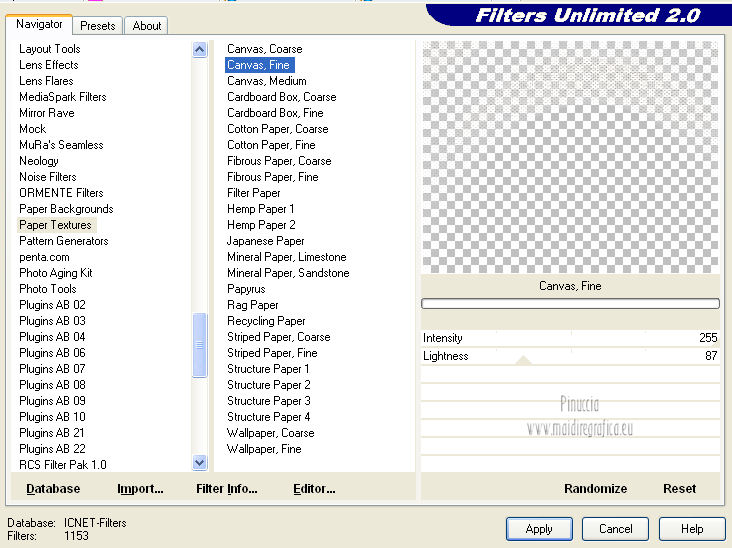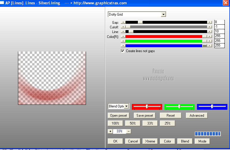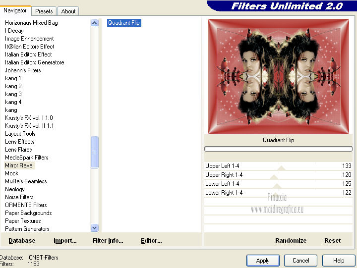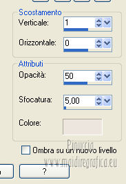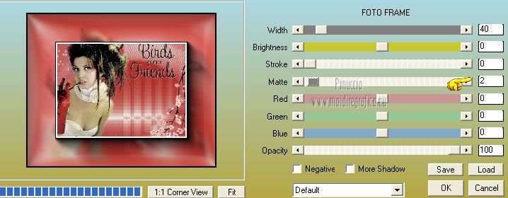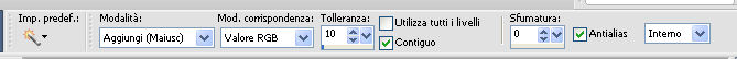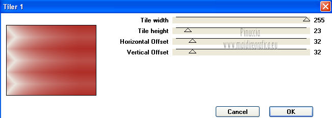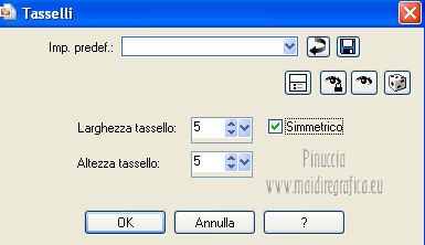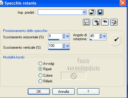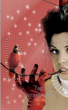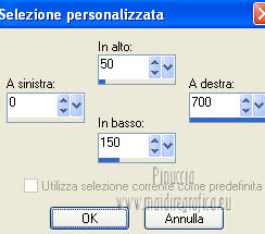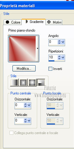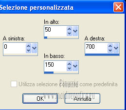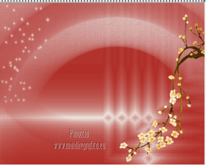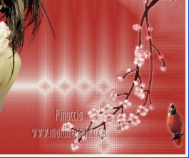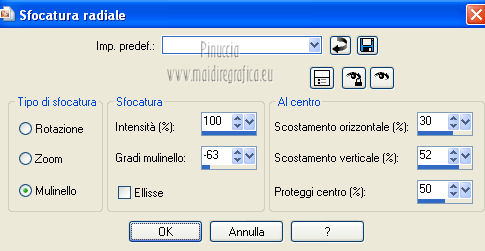 qui puoi trovare qualche risposta ai tuoi dubbi. Se l'argomento che ti interessa non è presente, ti prego di segnalarmelo. Per tradurre questo tutorial ho usato PSP X. Questo tutorial è una creazione di ©Araemae e non può essere copiato su altri siti nè essere offerto per il download. Lo stesso vale per la mia traduzione. Il materiale viene da vari gruppi di condivisione. Il copyright appartiene ai rispettivi autori. Grazie ai creatori dei tubes che mettono a disposizione il loro lavoro in vari gruppi di condivisione. Occorrente: Materiale qui Il tube della donna è di Anna.br Il tube del fiore è di Patries. Grazie. Filtri: consulta, se necessario, la mia sezione filtri qui Filters Unlimited 2.0 qui AP Lines - Lines SilverLining qui AAA Frames - Foto Frame qui Neology - Tyler 1 qui ![]() Metti la maschera nella cartella Maschere. se stai usando altri colori, sei libero di sperimentare le modalità di miscelatura più adatte 1. Scegli due colori dal tuo tube. Imposta il colore di primo piano con il colore chiaro (il mio #ede6de), e il colore di sfondo con il colore scuro (il mio #b12d28). ![]() Passa il colore di primo piano a Gradiente, stile Radiale, con i seguenti settaggi. ![]() Apri una nuova immagine trasparente 700 x 550 pixels, e riempila con il gradiente.2. Effetti>Neology - Tyler 1. ![]() Effetti>Effetti di bordo>Aumenta. 3. Effetti>Effetti di distorsione>Tasselli. ![]() Effetti>Effetti di bordo>Aumenta. 4. Effetti>Effetti di riflesso>Specchio rotante. ![]() 5. Apri il tube "29.AstridSterretjes" e vai a Modifica>Copia. Torna al tuo lavoro e vai a Modifica>Incolla come nuovo livello. Sposta il tube nell'angolo in alto a sinistra.![]() 6. Livelli>Nuovo livello raster. Attiva lo strumento Selezione ![]() clicca sull'icona Selezione personalizzata ![]() e imposta i seguenti settaggi. ![]() Passa il colore di primo piano da Gradiente al colore chiaro. Riempi la selezione con il colore chiaro.Selezione>Deseleziona. 7. Regola>Sfocatura>Sfocatura radiale. ![]() 8. Effetti>Plugins>Filters Unlimited 2.0 - Paper Textures - Canvas Fine. ![]() 9. Livelli>Nuovo livello raster. Selezione personalizzata ![]() ![]() Riempi la selezione con il colore scuro.Selezione>Deseleziona. 10. Regola>Sfocatura>Sfocatura radiale, con i settaggi precedenti. ![]() Immagine>Rifletti. Immagine>Capovolgi. 11. Effetti>Plugins>AP Lines - Lines SilverLining - Dotty Grid. ![]() 12. Livelli>Carica/Salva maschera>Carica maschera da disco. Cerca e carica la mashera 20-20. ![]() Livelli>Unisci>Unisci gruppo. 13. Apri il tube "1Patries_SpringChorus" e vai a Modifica>Copia. Torna al tuo lavoro e vai a Modifica>Incolla come nuovo livello. Immagine>Ridimensiona, all'80%, tutti i livelli non selezionato. Spostalo a destra,lasciando il tronco fuori dal bordo. ![]() Cambia la modalità di miscelatura di questo livello in Luminanza. Effetti>Effetti 3D>Sfalsa ombra, con il colore chiaro. ![]() 14. Apri il tube "anna.br_amigos" e vai a Modifica>Copia. Torna al tuo lavoro e vai a Modifica>Incolla come nuovo livello. Immagine>Ridimensiona, all'80%, tutti i livelli non selezionato. Spostalo nell'angolo in basso a sinistra.15. Attiva lo strumento Selezione , rettangolo,![]() e traccia una selezione intorno all'uccello, come nell'esempio. ![]() Modifica>Copia. Modifica>Incolla come nuova immagine. Attiva lo strumento Gomma ![]() usa la rotellina del mouse per ingrandire il lavoro per vedere meglio, e cancella il pezzetto di ramo a destra ![]() Modifica>Copia. Torna al tuo lavoro e vai a Modifica>Incolla come nuovo livello. Immagine>Rifletti. Sposta l'uccellino in basso a destra.![]() Regola>Messa a fuoco>Metti a fuoco. Effetti>Effetti 3D>Sfalsa ombra, con il colore chiaro. ![]() 16. Attiva il livello sottostante del tube di Patries. Effetti>Effetti 3D>Sfalsa ombra, con i settaggi precedenti. ![]() 17. Attiva il livello superiore. Apri il tube 29.AstridTekst e vai a Modifica>Copia. Torna al tuo lavoro e vai a Modifica>Incolla come nuovo livello. Posiziona il testo dove preferisci,o vedi il mio esempio. Effetti>Effetti 3D>Sfalsa ombra, con il colore chiaro. ![]() 18. immagine>Aggiungi bordatura, 1 pixel, simmetriche, con il colore chiaro. Immagine>Aggiungi bordatura, 50 pixels, simmetriche, con il colore scuro. Seleziona questo bordo con la bacchetta magica ![]() ![]() Riporta il colore di primo piano al gradiente iniziale. ![]() Riempi la selezione con il gradiente.19. Effetti>Plugins>Filters Unlimited 2.0 - Mirror Rave - Quadrant Flip. ![]() 20. Effetti>Plugins>AAA Frames - Foto Frame. ![]() Selezione>Deseleziona. 21. Aggiungi il tuo nome e/o il tuo watermark su un nuovo livello. Livelli>Unisci>Unisci tutto e salva in formato jpg. ![]() Se hai problemi o dubbi, o trovi un link non funzionante, o anche soltanto per un saluto, scrivimi. 4 Agosto 2012 |