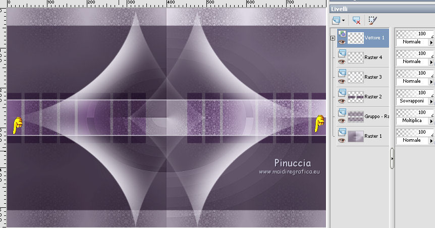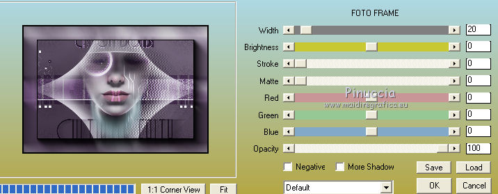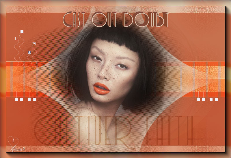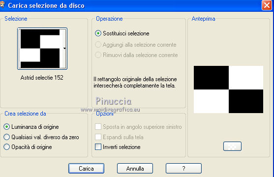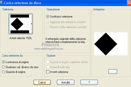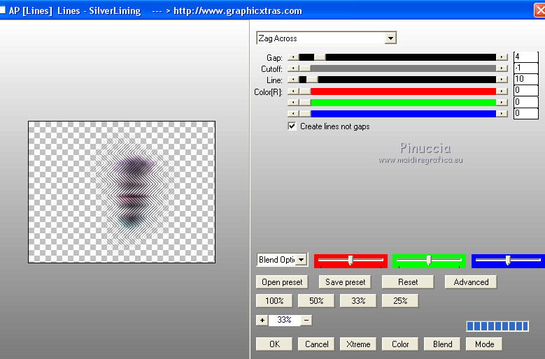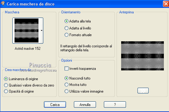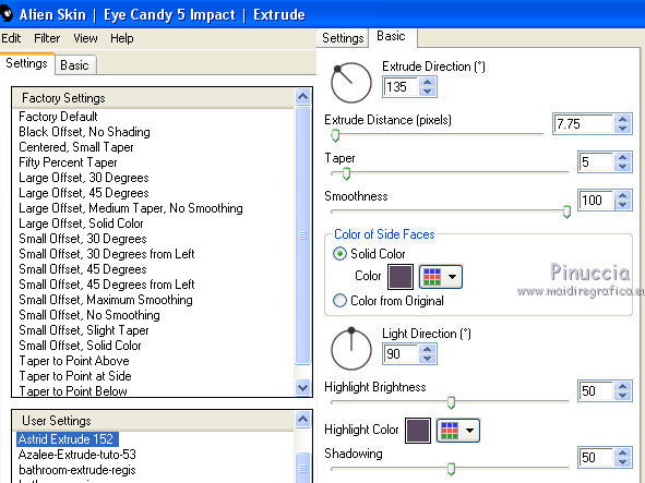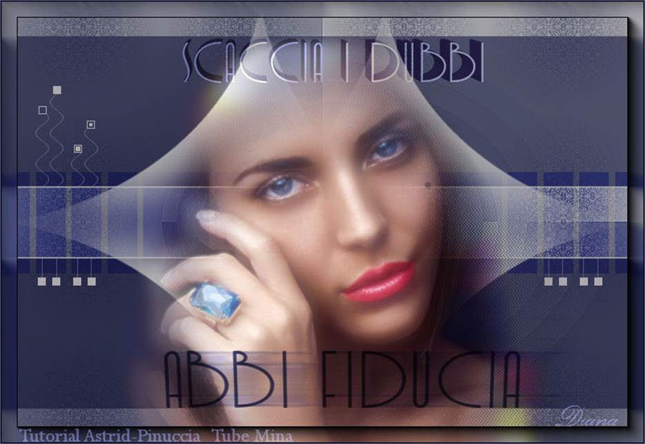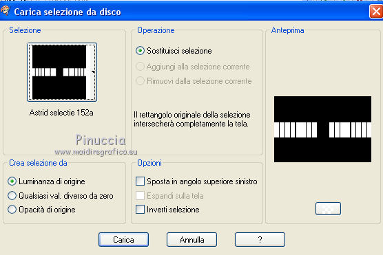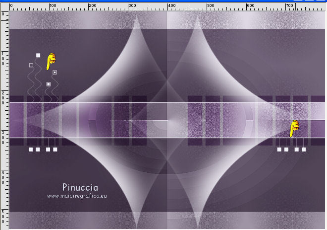qui puoi trovare qualche risposta ai tuoi dubbi. Se l'argomento che ti interessa non è presente, ti prego di segnalarmelo. Questo tutorial è stato creato con PSPX5 e tradotto con PSPX, ma può essere eseguito anche con le altre versioni di PSP. Dalla versione X4, il comando Immagine>Rifletti è stato sostituito con Immagine>Capovolgi in orizzontale, e il comando Immagine>Capovolgi con Immagine>Capovolgi in verticale. Nelle versioni X5 e X6, le funzioni sono state migliorate rendendo disponibile il menu Oggetti. Con la versione X7 sono tornati i comandi Immagine>Rifletti e Immagine>Capovolgi, ma con nuove funzioni. Vedi la scheda sull'argomento qui Occorrente: Materiale qui Per il tube utilizzato grazie K@rine (in questa pagina trovi i links ai loro siti). Filtri: consulta, se necessario, la mia sezione filtri qui AP Lines - Lines SilverLining qui Alien Skin Eye Candy 5 Impact - Extrude qui AAA Frames - Foto Frame qui ![]() se stai usando altri colori, sei libero di sperimentare le modalità di miscelatura più adatte Nelle ultime versioni di PSP non c'è il gradiente di primo piano/sfondo (Corel_06_029) Trovi i gradienti delle versioni precedenti qui Metti il preset Cliccando sul file una o due volte (a seconda delle tue impostazioni), automaticamente il preset si installerà nella cartella corretta. perchè uno o due clic vedi qui Metti le selezioni nella cartella Selezioni. Metti la maschera nella cartella Maschere. 1. Scegli due colori dal tube e imposta il colore di primo piano con il colore chiaro, e il colore di sfondo con il colore scuro. I miei colori. ![]() Passa il colore di primo piano a Gradiente di primo piano/sfondo, stile Lineare. ![]() Apri una nuova immagine trasparente 800 x 550 pixels, e riempila con il gradiente.2. Effetti>Effetti di distorsione>Tasselli. ![]() 3. Sullo stesso livello. Selezione>Carica/Salva selezione>Carica selezione da disco. Cerca e carica la selezione Astrid selectie 152. ![]() 4. Regola>Sfocatura>Sfocatura gaussiana - raggio 100. ![]() Selezione>Deseleziona. 5. Effetti>Effetti di distorsione>Coordinate polari. ![]() 6. Effetti>Effetti di bordo>Aumenta. 7. Livelli>Nuovo livello raster. Riempi con il colore di sfondo.8. Livelli>Carica/Salva maschera>Carica maschera da disco. Cerca e carica la maschera Astrid masker 152. ![]() Livelli>Unisci>Unisci gruppo. Cambia la modalità di miscelatura di questo livello in Moltiplica. ![]() 9. Livelli>Nuovo livello raster. Selezione>Carica/Salva selezione>Carica selezione da disco. Cerca e carica la selezione Astrid selectie 152a. ![]() 10. Riempi la selezione con il colore di sfondo.Cambia la modalità di miscelatura di questo livello in Sovrapponi. ![]() Selezione>Deseleziona. 11. Livelli>Nuovo livello raster. Selezione>Carica/Salva selezione>Carica selezione da disco. Cerca e carica la selezione Astrid selectie 152b. ![]() 12. Effetti>Effetti 3D>Sfalsa ombra, colore di primo piano. ![]() Selezione>Deseleziona. 13. Effetti>Effetti di distorsione>Stringi (nelle nuove versioni è diventato Compressione). ![]() 14. Livelli>Duplica. Immagine>Rifletti. Livelli>Unisci>Unisci giù. 15. Attiva lo strumento Penna ![]() ![]() 16. Tenendo premuto il tasto della maiuscola, per ottenere una linea perfettamente diritta, traccia una linea con il colore di primo piano come nell'esempio. ![]() Clicca sul segno di spunta nella barra superiore degli strumenti per terminare l'operazionese è necessario posizionare meglio la linea, questo è il momento, per facilitare lo spostamento, che sarà minimo, usa le frecce della tastiera. Sullo stesso livello, traccia una seconda linea più in basso, come nell'esempio. ![]() Livelli>Converti in livello raster. 17. Apri Astrid Deco 152, e vai a Modifica>Copia. Torna al tuo lavoro e vai a Modifica>Incolla come nuovo livello. Posiziona correttamente il tube, come nell'esempio.![]() 18. Apri il tube k@rine_dreams_Misted_Face_3207_Mai_2015 e vai a Modifica>Copia. Torna al tuo lavoro e vai a Modifica>Incolla come nuovo livello. Immagine>Ridimensiona, al 75%, tutti i livelli non selezionato. 19. Livelli>Duplica. Effetti>Effetti di distorsione>Vento - da sinistra, intensità 100. ![]() Modifica>Ripeti Vento. 20. Effetti>Plugins>AP Lines - Lines SilverLining. ![]() Cambia la modalità di miscelatura di questo livello in Moltiplica. Livelli>Disponi>Sposta giù. ![]() 21. Livelli>Nuovo livello raster. Inverti i colori della paletta e chiudi il colore di primo piano. ![]() 22. Attiva lo strumento Testo , font Soerjaputera![]() Scrivi Cast out Doubt in alto al centro ![]() Livelli>Converti in livello raster. 23. Effetti>Plugins>Alien Skin Eye Candy 5 Impact - Extrude. Seleziona il preset Astrid Extrude 152 e ok. Questi i settaggi, in caso di problemi con il preset. Solid Color e Hightlight Color: il tuo colore di sfondo. ![]() Cambia la modalità di miscelatura di questo livello in Sovrapponi. 30. Inverti nuovamente i colori della paletta e chiudi il colore di primo piano. ![]() 31. Attiva nuovamente lo strumento Testo ![]() ![]() 32. Scrivi il testo Cultivate Faith ![]() Livelli>Converti in livello raster. Cambia la modalità di miscelatura di questo livello in Moltiplica. 33. Livelli>Duplica. Effetti>Effetti di distorsione>Vento, da sinistra, intensità 100 ![]() 34. Livelli>Disponi>Sposta giù. 35. Livelli>Unisci>Unisci visibile. 36. Effetti>Plugins>AAA Frames - Foto Frame. ![]() 37. Firma il tuo lavoro su un nuovo livello. Livelli>Unisci>Unisci tutto e salva in formato jpg. Le vostre versioni. Grazie ![]() ![]() Cat's Graffitis ![]() Nicole P ![]() Olimpia ![]() Diana ![]() Alessandra ![]() Se hai problemi o dubbi, o trovi un link non funzionante, o anche soltanto per un saluto, scrivimi. 21 Novembre 2016 |