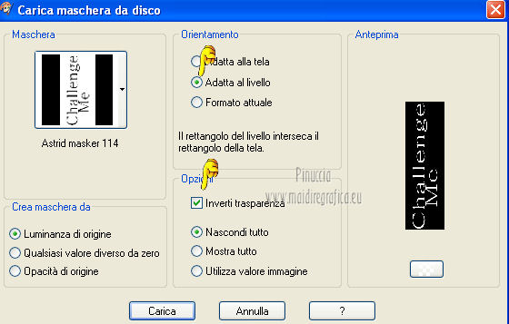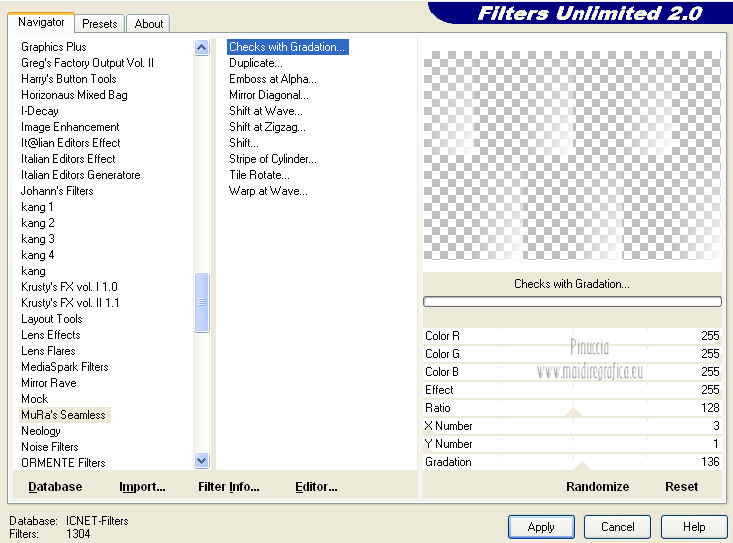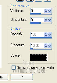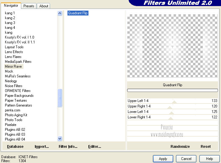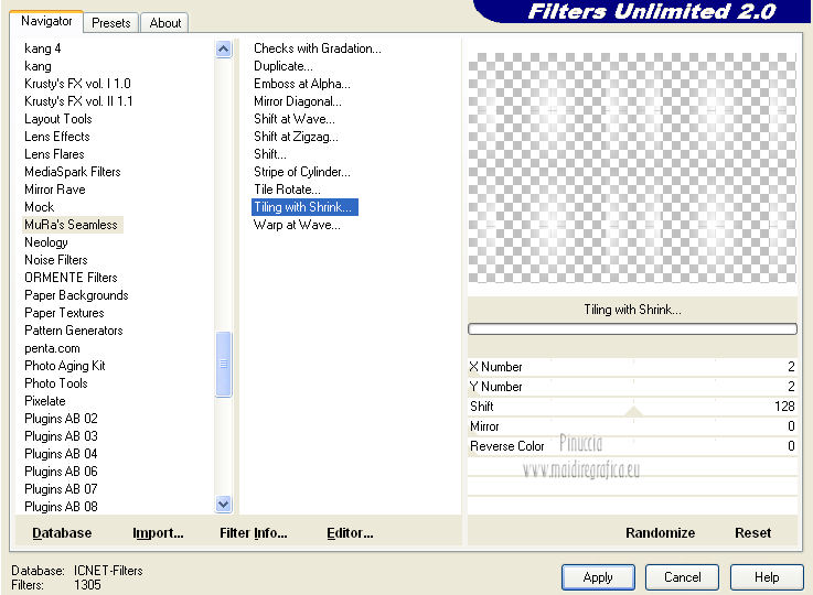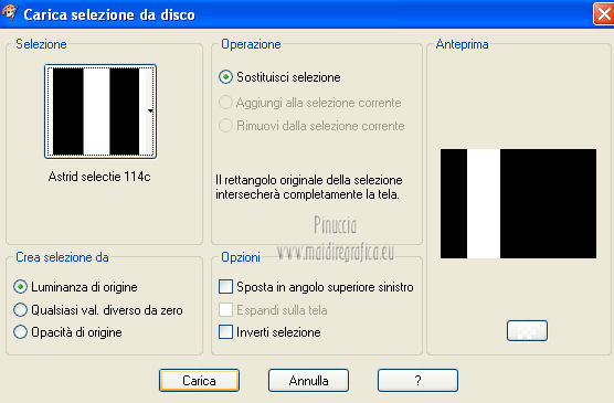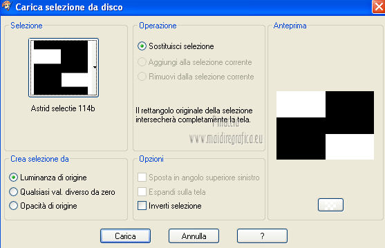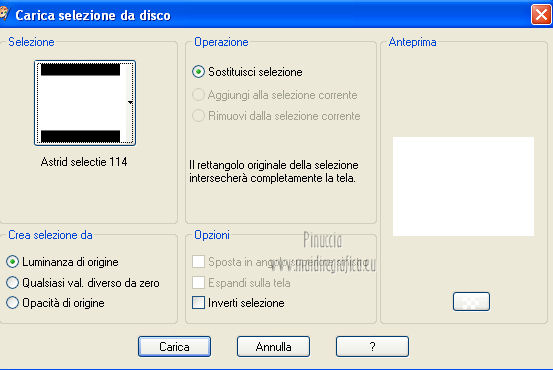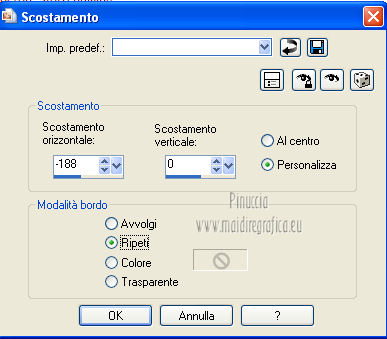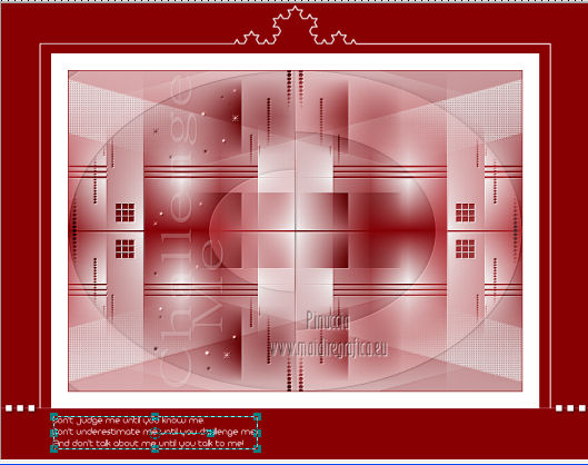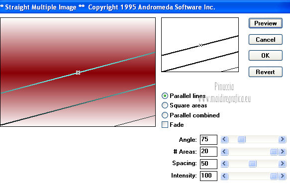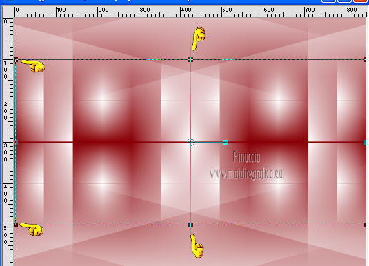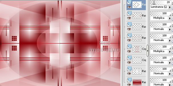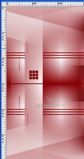 qui puoi trovare qualche risposta ai tuoi dubbi. Se l'argomento che ti interessa non è presente, ti prego di segnalarmelo. Per tradurre questo tutorial ho usato PSP X. Questo tutorial è una creazione di ©Araemae e non può essere copiato su altri siti nè essere offerto per il download. Lo stesso vale per la mia traduzione. Il materiale viene da vari gruppi di condivisione. Il copyright appartiene ai rispettivi autori. Grazie ai creatori dei tubes che mettono a disposizione il loro lavoro in vari gruppi di condivisione. Occorrente: Materiale qui Per il tube utilizzato grazie Karine. Filtri: consulta, se necessario, la mia sezione filtri qui Andromeda - SMulti qui MuRa's Seamless - Checks with Gradation, Tiling with Shrink qui Mirror Rave - Quadrant Flip qui FM TileTools - Blend Emboss qui Alien Skin Eye Candy 5 Impact - Perspective Shadow qui ![]() Metti il preset "Astrid_Glass_114" nella cartella del filtro Alien Skin Eye Candy 5 Impact>Settings>Shadow. Cliccando sul file una o due volte (a seconda delle tue impostazioni), automaticamente il preset si installerà nella cartella corretta. Metti la maschera nella cartella Maschere. Metti il pennello nella cartella Pennelli. Attenzione, il pennello è composto da due files che non devono essere separati. Vedi gli appunti sui pennelli qui Metti la maschera nella cartella Maschere. Metti le selezioni nella cartella Selezioni. se stai usando altri colori, sei libero di sperimentare le modalità di miscelatura più adatte 1. Imposta il colore di primo piano con il colore bianco, e il colore di sfondo con il colore rosso #890006. ![]() Passa il colore di primo piano a Gradiente. ![]() Apri una nuova immagine trasparente 850 x 600 pixels, e riempila con il gradiente.2. Effetti>Plugins>Andromeda - SMulti. ![]() 3. Livelli>Duplica. Immagine>Capovolgi. Abbassa l'opacità di questo livello al 50%. Livelli>Unisci>Unisci giù. 4. Livelli>Duplica. Immagine>Rifletti. Abbassa l'opacità di questo livello al 50%. Livelli>Unisci>Unisci giù. 5. Livelli>Nuovo livello raster. Effetti>Plugins>Mura's Seamless - Checks with Gradation. ![]() 6. Effetti>Plugins>Mirror Rave - Quadrant Flip. ![]() 7. Livelli>Duplica. Effetti>Plugins>Mura's Seamless - Tiling with Shrink. ![]() 8. Premi sulla tastiera il tasto D per attivare lo strumento Deformazione ![]() in modalità scala abbassa il nodo superiore centrale fino a 100 pixels, e alza il nodo centrale inferiore fino a 500 pixels. ![]() Premi il tasto M per deselezionare lo strumento. 9. Livelli>Duplica. Effetti>Effetti di trama>Veneziana - con il colore di sfondo. ![]() 10. Immagine>Ruota per gradi - 90 gradi a destra. ![]() 11. Selezione>Carica/Salva selezione>Carica selezione da disco. Cerca e carica la selezione "Astrid selectie 114". ![]() Immagine>Ritaglia la selezione. Cambia la modalità di miscelatura di questo livello in Moltiplica. 12. Livelli>Nuovo livello raster. Selezione>Carica/Salva selezione>Carica selezione da disco. Cerca e carica la selezione "Astrid selectie 114a". ![]() 13. Riempi la selezione con il colore di sfondo.Selezione>Deseleziona. 14. Livelli>Duplica. Immagine>Capovolgi. Livelli>Unisci giù. 15. Apri "Astrid deco 114" e vai a Modifica>Copia. Torna al tuo lavoro e vai a Modifica>Incolla come nuovo livello. 16. Apri "Astrid deco 114a" e vai a Modifica>Copia. Torna al tuo lavoro e vai a Modifica>Incolla come nuovo livello. Mantieni la modalità di miscelatura in Moltiplica. 17. Livelli>Nuovo livello raster. Attiva lo strumento Pennello ![]() cerca e seleziona il pennello "Astrid penseel 114". ![]() Applica il pennello come nell'esempio, cliccando con il tasto destro del mouse per usare il colore di sfondo. ![]() 18. Livelli>Duplica. Immagine>Capovolgi. Livelli>Unisci>Unisci giù. 19. Livelli>Duplica. Immagine>Rifletti. Livelli>Unisci>Unisci giù. 20. Livelli>Nuovo livello raster. Selezione>Carica/Salva selezione>Carica selezione da disco. Cerca e carica la selezione "Astrid selectie 114b". ![]() 21. Riempi la selezione con il colore bianco di primo piano.Selezione>Deseleziona. 22. Effetti>Effetti di distorsione>Coordinate polari. ![]() Cambia la modalità di miscelatura di questo livello in Luminanza (esistente), e abbassa l'opacità al 20%. ![]() 23. Effetti>Effetti 3D>Sfalsa ombra. ![]() 24. Livelli>Nuovo livello raster. Selezione>Carica/Salva selezione>Carica selezione da disco. Cerca e carica la selezione "Astrid selectie 114c". ![]() 25. Riempi la selezione con il colore bianco di primo piano.Selezione>Deseleziona. 26. Livelli>Carica/Salva maschera>Carica maschera da disco. Cerca e carica la maschera "Astrid masker 114". ![]() Livelli>Unisci>Unisci gruppo. Abbassa l'opacità di questo livello al 20%. 27. Apri "Astrid deco 114b" e vai a Modifica>Copia. Torna al tuo lavoro e vai a Modifica>Incolla come nuovo livello. Mantieni la modalità di miscelatura in Luminanza (esistente). 28. Effetti>Effetti di immagine>Scostamento. ![]() 29. Livelli>Unisci>Unisci visibile. 30. Immagine>Ridimensiona, all'80%, tutti i livelli selezionato. 31. Effetti>Plugins>FM Tile Tools - Blend Emboss, con i settaggi standard. ![]() 32. Immagine>Aggiungi bordatura, 1 pixel, simmetriche, con il colore di sfondo. Immagine>Aggiungi bordatura, 25 pixels, simmetriche, con il colore bianco di primo piano. Immagine>Aggiungi bordatura, 75 pixels, simmetriche, con il colore di sfondo. 33. Livelli>Innalza livello di sfondo. 34. Apri "Astrid deco 114c" e vai a Modifica>Copia. Torna al tuo lavoro e vai a Modifica>Incolla come nuovo livello. 35. Effetti>Effetti di immagine>Scostamento. ![]() 36. Apri "Astrid tekst 114" e vai a Modifica>Copia. Torna al tuo lavoro e vai a Modifica>Incolla come nuovo livello. Sposta il testo in basso a sinistra.![]() 37. Apri il tube "k@rine_ dreams _Pretty_Woman_2284_Septembre_2012" e vai a Modifica>Copia. Torna al tuo lavoro e vai a Modifica>Incolla come nuovo livello. Immagine>Ridimensiona, all'80%, tutti i livelli non selezionato. Spostalo sul bordo inferiore.38. Effetti>Plugins>Alien Ski