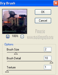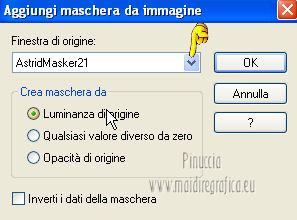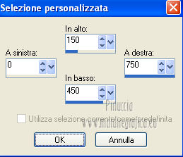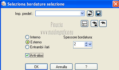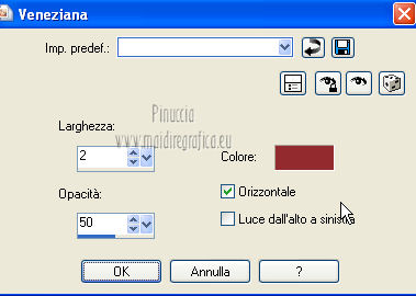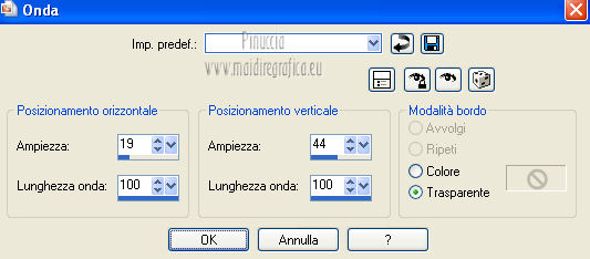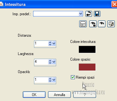 qui puoi trovare qualche risposta ai tuoi dubbi. Se l'argomento che ti interessa non è presente, ti prego di segnalarmelo. Per tradurre questo tutorial ho usato PSP X. Questo tutorial è una creazione di ©Araemae e non può essere copiato su altri siti nè essere offerto per il download. Lo stesso vale per la mia traduzione. Il materiale viene da vari gruppi di condivisione. Il copyright appartiene ai rispettivi autori. Grazie ai creatori dei tubes che mettono a disposizione il loro lavoro in vari gruppi di condivisione. Occorrente: Materiale qui Per il tube grazie Nikita Filtri: consulta, se necessario, la mia sezione filtri qui Alien Skin Eye Candy 5 Impact - Perspective Shadow qui Nik Software - Color Efex 3.0 qui Artistics - Dry brush qui ![]() se stai usando altri colori, sei libero di sperimentare le modalità di miscelatura più adatte Metti la selezione nella cartella Selezioni. Ti servirà anche la maschera 20-20. Se non ce l'hai prendila qui Mettila nella cartella Maschere. Apri la maschera "AstridMasker21" in PSP e minimizzala con il resto del materiale. 1. Scegli un colore dal tuo tubes, e impostalo come colore di primo piano. Imposta il colore di sfondo con il nero #000000. ![]() Apri una nuova immagine trasparente 750 x 600 pixels, e riempila con il colore di primo piano.Livelli>Nuovo livello raster. Riempi con il colore nero.2. Livelli>Nuovo livello maschera>Da immagine. Apri il menu sotto la finestra di origine e vedrai la lista dei files aperti. Seleziona la maschera AstridMasker21. ![]() Livelli>Unisci>Unisci gruppo. Cambia la modalità di miscelatura di questo livello in Luce netta. 3. Attiva lo strumento Selezione ,clicca sull'icona Selezione personalizzata ![]() e imposta i seguenti settaggi: ![]() Premi sulla tastiera il tasto CANC. Riempi la selezione con il colore nero.4. Livelli>Nuovo livello raster, e rinomina questo livello "centro". Apri il tube Melbourne e vai a Modifica>Copia. Torna al tuo lavoro e vai a Modifica>Incolla nella selezione. 5. Effetti>Plugins>Artistics - Dry brush. ![]() 6. Effetti>Plugins>Nik Software - Color Efex Pro seleziona B/W Conversion e ok. ![]() Abbassa l'opacità di questo livello al 50%. 7. Selezione>Modifica>Seleziona bordature selezione. ![]() Livelli>Nuovo livello raster. Riempi la selezione con il colore di primo piano.Rinomina questo livello "bordi" Mantieni selezionato. 8. Livelli>Duplica e premi sulla tastiera il tasto CANC. Riempi la selezione con il colore nero.Effetti>Effetti di distorsione>Onda. ![]() 9. Selezione>Innalza selezione a livello. Selezione>Deseleziona. Attiva lo strumento Bacchetta magica ![]() e clicca nell'onda per selezionarla. la selezione, chiudendo gli altri livelli, si presenta così: ![]() Riempi la selezione con il colore nero.Effetti>Effetti di trama>Intessitura, colore intessitura nero - riempi spazi colore di primo piano. ![]() Selezione>Deseleziona. Abbassa l'opacità di questo livello al 50%. 10. Livelli>Disponi>Sposta giù - 2 volte. Attiva il livello "centro". Livelli>Carica/Salva maschera>Carica maschera da disco. Cerca e carica la maschera 20-20. ![]() Livelli>Unisci>Unisci gruppo. 11. Attiva il livello superiore. Livelli>Nuovo livello raster. Selezione>Carica/Salva selezione>Carica selezione da disco. Cerca e carica la selezione "Astrid Selectie 21a". ![]() Riempi con il colore di primo piano.Selezione>Deseleziona. Livelli>Duplica. Immagine>Capovolgi. Immagine>Rifletti. 12. Attiva il livello "bordi". Livelli>Duplica. Effetti>Effetti di distorsione>Coordinate polari. ![]() Livelli>Unisci>Unisci giù. 13. Clicca nei semicerchi in alto e in basso con la bacchetta magica ![]() ![]() Livelli>Nuovo livello raster. Riempi con il colore nero.14. Attiva nuovamente il livello "bordi", e seleziona le parti esterne a destra e a sinistra con la bacchetta magica ![]() ![]() Livelli>Nuovo livello raster. Riempi con il colore nero.15. Effetti>Effetti di trama>Veneziana, con il colore di primo piano. ![]() Selezione>Deseleziona. 16. Attiva il livello superiore. Apri il tube "21.AstridSterretjes" e vai a Modifica>Copia. Torna al tuo lavoro e vai a Modifica>Incolla come nuovo livello. 17. Apri il tube "12479955074_femmes_Nikita" e vai a Modifica>Copia. Torna al tuo lavoro e vai a Modifica>Incolla come nuovo livello. 18. Effetti>Plugins>Alien Skin Eye Candy 5 Impact - Perspective Shadow. Seleziona il preset Drop Shadow,Blurry e ok. ![]() Ripeti l'Effetto una seconda volta. 19. Immagine>Aggiungi bordatura, 1 pixel, simmetriche, con il colore di primo piano. Immagine>Aggiungi bordatura, 35 pixels, simmetriche, con il colore nero. 20. Aggiungi il tuo nome e/o il tuo watermark su un nuovo livello. Livelli>Unisci>Unisci tutto e salva in formato jpg. ![]() Se hai problemi o dubbi, o trovi un link non funzionante, o anche soltanto per un saluto, scrivimi. 10 Agosto 2012 |