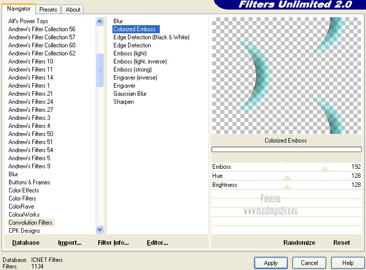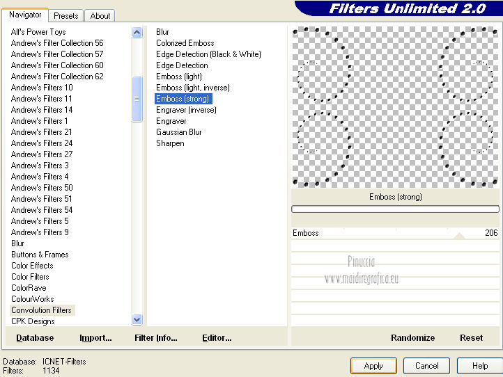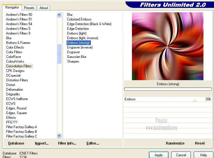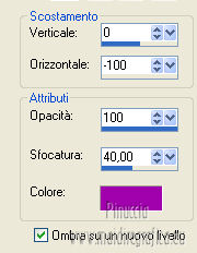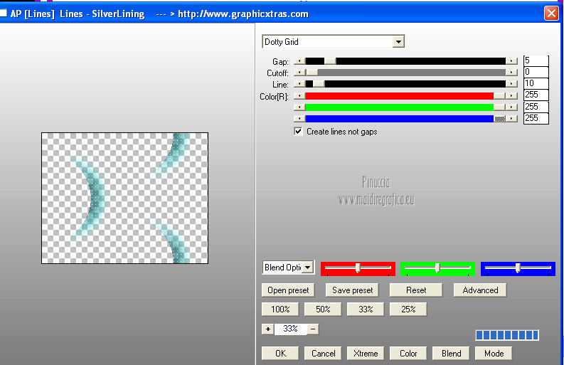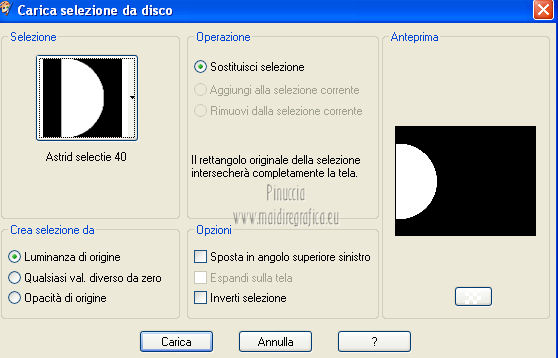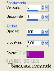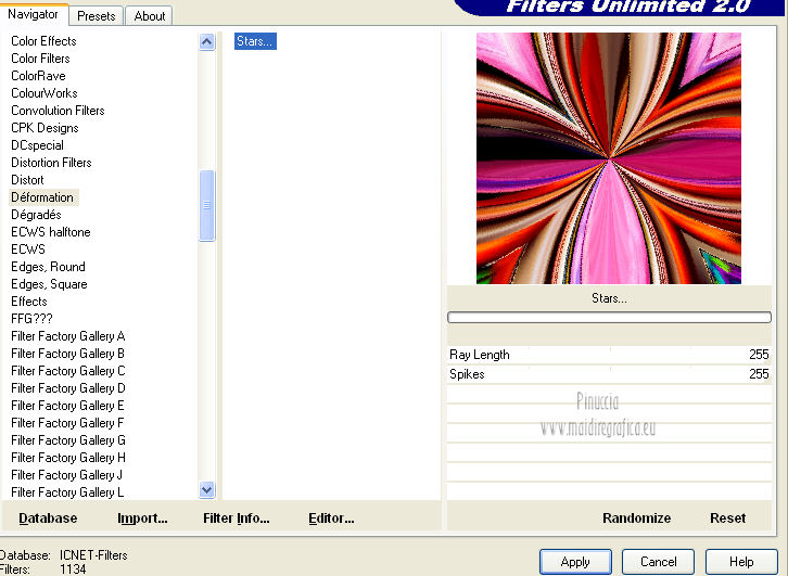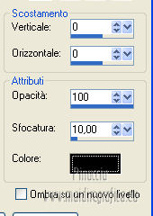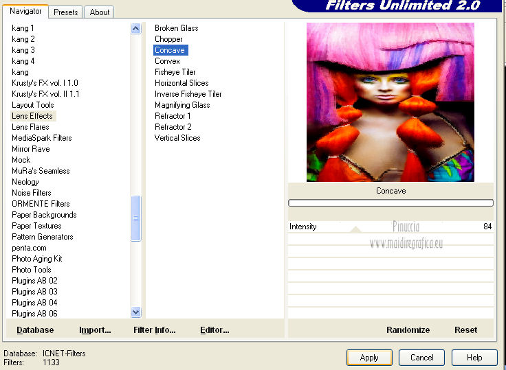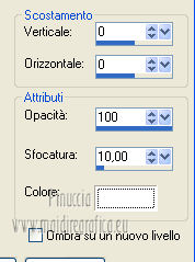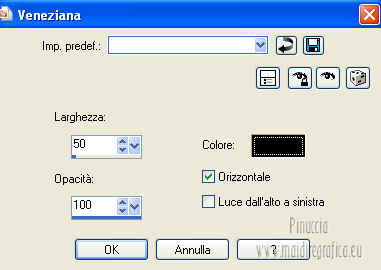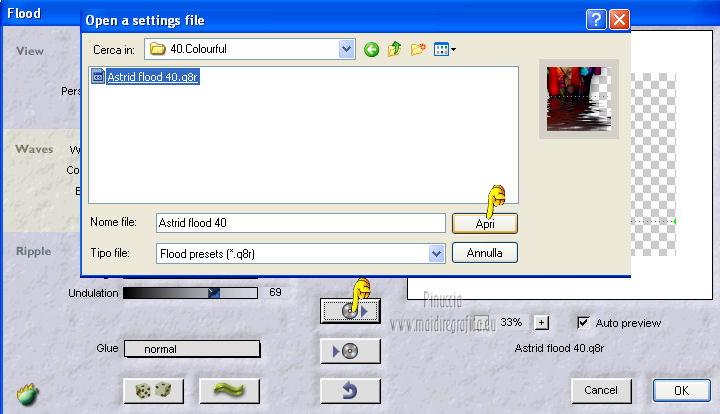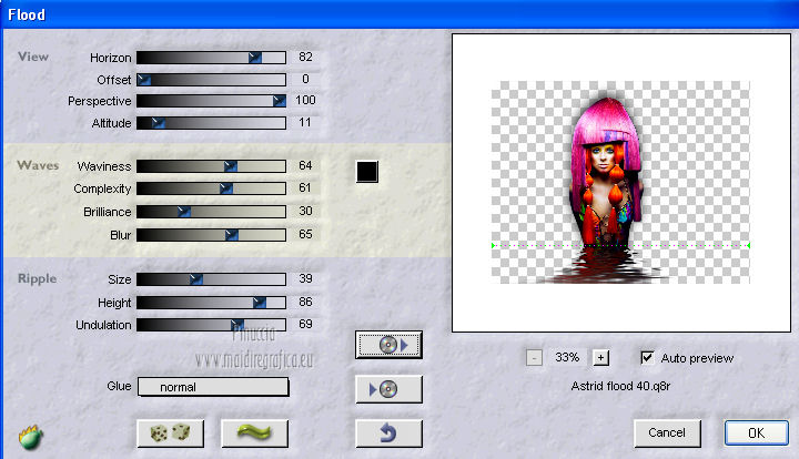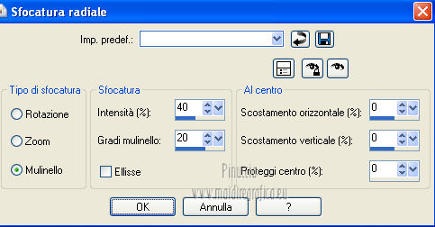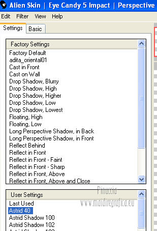 qui puoi trovare qualche risposta ai tuoi dubbi. Se l'argomento che ti interessa non è presente, ti prego di segnalarmelo. Per tradurre questo tutorial ho usato PSP X. Questo tutorial è una creazione di ©Araemae e non può essere copiato su altri siti nè essere offerto per il download. Lo stesso vale per la mia traduzione. Il materiale viene da vari gruppi di condivisione. Il copyright appartiene ai rispettivi autori. Grazie ai creatori dei tubes che mettono a disposizione il loro lavoro in vari gruppi di condivisione. Occorrente: Materiale qui Il tube della donna è di K@rine Filtri: consulta, se necessario, la mia sezione filtri qui Filters Unlimited 2.0 qui Deformation - Stars qui AP lines - Lines SilverLining qui Simple - Top Left Mirror qui Flaming Pear - Flood qui Alien Skin Eye Candy 5 Impact - Perspective Shadow qui ![]() se stai usando altri colori, sei libero di sperimentare le modalità di miscelatura più adatte Metti il preset "Astrid 40" nella cartella del filtro. Con un doppio clic sul file, il preset sarà automaticamente installato nella cartella corretta. Il preset del filtro flood "Astrid flood.q8r" potrai importarlo direttamente dalla cartella in cui lo hai copiato, quando ti servirà. Metti le selezioni nella cartella Selezioni. Scegli un colore brillante dal tuo tube. Il mio: ![]() 1. Apri una nuova immagine trasparente 700 x 550 pixels. Apri il tube "k@rine_ dreams _Amazing_Hair_1690_Mai_2011" e vai a Modifica>Copia. non chiuderlo perchè ti servirà ancora Torna al tuo lavoro e vai a Modifica>Incolla come nuovo livello. 2. Premi il tasto D (valido per tutte le versioni) per attivare lo strumento Deformazione ![]() e, in modalità Scala, spingi i nodi centrali ![]() fino ai bordi. ![]() Premi il tasto M per deselezionare la griglia dello strumento. 3. Effetti>Plugins>Filters Unlimited 2.0 - Lens Effects - Concave ![]() Se stai usando altri colori, gioca sui settaggi di Intensity. 4. Effetti>Plugins>Filters Unlimited 2.0 - Deformation - Stars. ![]() 5. Regola>Sfocatura>Sfocatura radiale. ![]() 6. Effetti>Plugins>Filters Unlimited 2.0 - Convolution Filters - Emboss(strong). ![]() Livelli>Disponi>Porta sotto. 7. Attiva il livello superiore, che è ancora trasparente. Selezione>Seleziona tutto. Selezione>Modifica>Contrai - 100 pixels. Riempi la selezione con il colore di primo piano.Cambia la modalità di miscelatura di questo livello in Rafforza, e abbassa l'opacità al 25%. 8. Livelli>Nuovo livello raster. Selezione>Carica/Salva selezione>Carica selezione da disco. Cerca e carica la selezione "Astrid selectie 40". ![]() Effetti>Effetti 3D>Sfalsa ombra, con il colore nero, ombra su nuovo livello selezionato ![]() Selezione>Deseleziona. 9. Effetti>Effetti di immagine>Motivo unico. ![]() 10. Effetti>Plugins>Filters Unlimited 2.0 - Convolution Filters - Colorized Emboss. ![]() 11. Effetti>Plugins>AP lines - Silverlining - Dotty Grid. ![]() Abbassa l'opacità di questo livello al 75%. 12. Effetti>Effetti 3D>Sfalsa ombra, con il colore di primo piano, ombra su nuovo livello selezionato. ![]() Livelli>Duplica. Livelli>Unisci>Unisci giù. 13. Effetti>Effetti di trama>Veneziana. ![]() Effetti>Effetti di bordo>Aumenta. 14. Attiva il livello superiore. Apri il tube "Astrid 40 deco 01" e vai a Modifica>Copia. Torna al tuo lavoro e vai a Modifica>Incolla come nuovo livello. Spostalo nell'angolo in alto a sinistra.Effetti>Plugins>Simple - Top Left Mirror. Cambia la modalità di miscelatura di questo livello in Sovrapponi. 15. Effetti>Plugins>Filters Unlimited 2.0 - Convolution Filters - Emboss(strong). ![]() 16. Livelli>Nuovo livello raster. Selezione>Carica/Salva selezione>Carica selezione da disco. Cerca e carica la selezione "Astrid selectie 40a". ![]() Effetti>Effetti 3D>Sfalsa ombra, con il colore bianco, (non dimenticare di togliere la selezione a Ombra su nuovo livello). ![]() Selezione>Deseleziona. Cambia la modalità di miscelatura di questo livello in Indebolisci. 17. Apri il tube "Astrid 40 deco 02" e vai a Modifica>Copia. Torna al tuo lavoro e vai a Modifica>Incolla come nuovo livello. Cambia la modalità di miscelatura di questo livello in Sovrapponi. 18. Apri il tube "Astrid 40 deco 03" e vai a Modifica>Copia. Torna al tuo lavoro e vai a Modifica>Incolla come nuovo livello. Cambia la modalità di miscelatura di questo livello in Sovrapponi. 19. Apri il tube "Astrid 40 Tekst 01" e vai a Modifica>Copia. Torna al tuo lavoro e vai a Modifica>Incolla come nuovo livello. Cambia la modalità di miscelatura di questo livello in Indebolisci. Livelli>Duplica. Livelli>Unisci>Unisci giù. 20. Apri il tube "k@rine_ dreams _Amazing_Hair_1690_Mai_2011" e vai a Modifica>Copia. Torna al tuo lavoro e vai a Modifica>Incolla come nuovo livello. Immagine>Ridimensiona, al 60%, tutti i livelli non selezionato. 21. Effetti>Effetti di immagine>Scostamento. ![]() 22. Effetti>Plugins>Alien Skin Eye Candy5 Impact - Perspective Shadow seleziona il preset "Astrid 40" e ok. ![]() 23. Effetti>Plugins>Flaming Pear - Flood, clicca sull'icona della freccia a destra (in alcune versioni è di colore diverso), e cerca - nella cartella in cui lo hai salvato - il preset "Astrid 40 flood.q8r" ![]() Dopo aver cliccato Apri avrai questi settaggi. Ricorda che i preset sono settaggi salvati per poterli utilizzare successivamente. Se hai problemi con il preset, puoi copiare manualmente i settaggi che vedi nella schermata. ![]() 24. Apri il tube "Astrid 40 Tekst 02" e vai a Modifica>Copia. Torna al tuo lavoro e vai a Modifica>Incolla come nuovo livello. Posiziona il testo come preferisci,o vedi il mio esempio. Effetti>Effetti 3D>Sfalsa ombra, con il colore di primo piano. ![]() 25. Livelli>Duplica, e attiva il livello sottostante dell'originale. Effetti>Effetti di distorsione>Vento - da sinistra, intensità 100. ![]() Effetti>Effetti di bordo>Aumenta. 26. Immagine>Aggiungi bordatura, 1 pixel, simmetriche, con il colore nero. Livelli>Duplica. Immagine>Ridimensiona, al 90%, tutti i livelli non selezionato. Effe