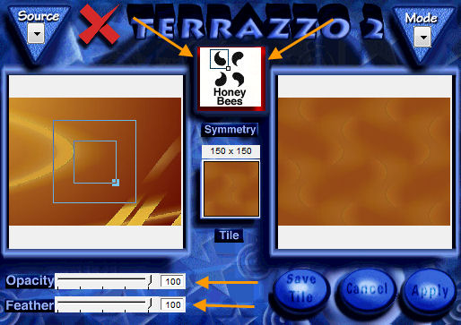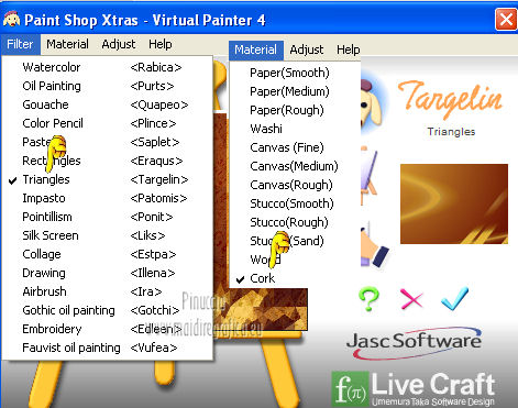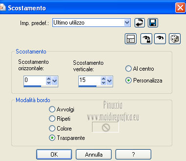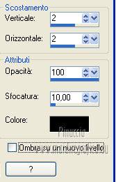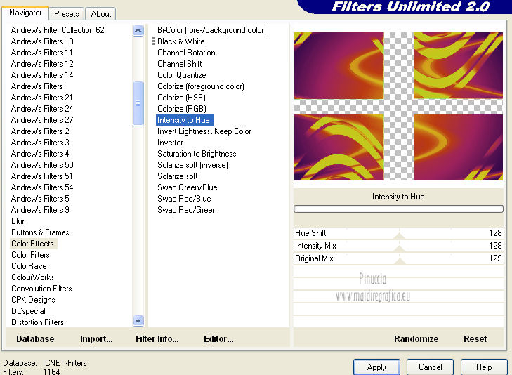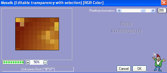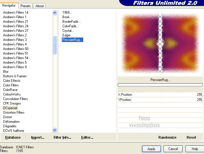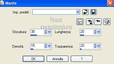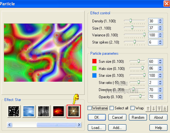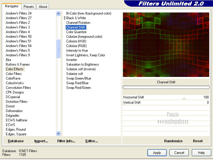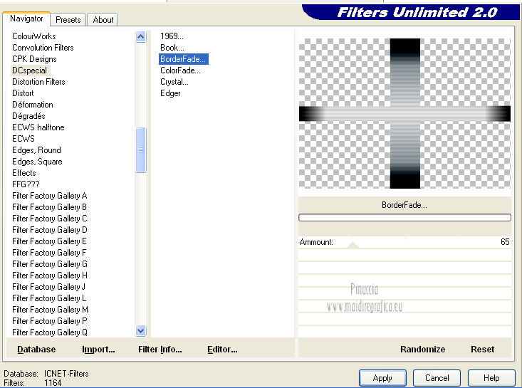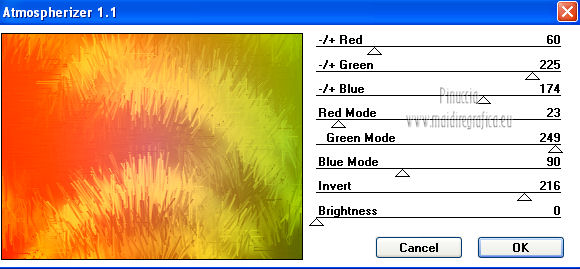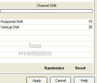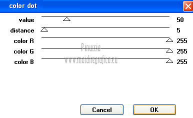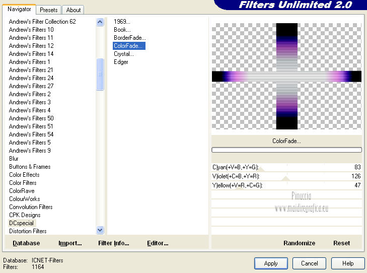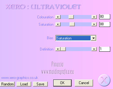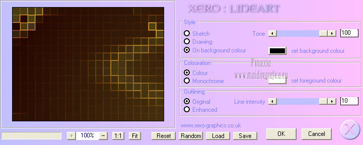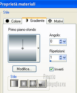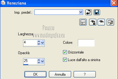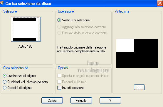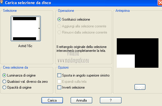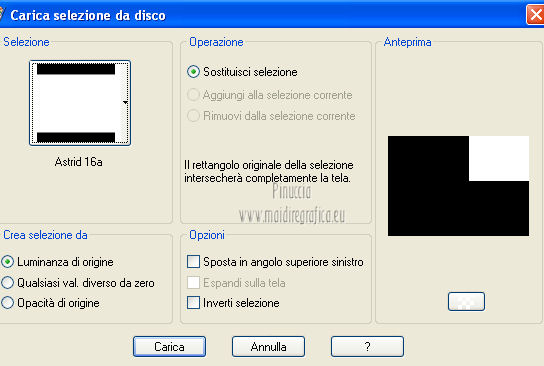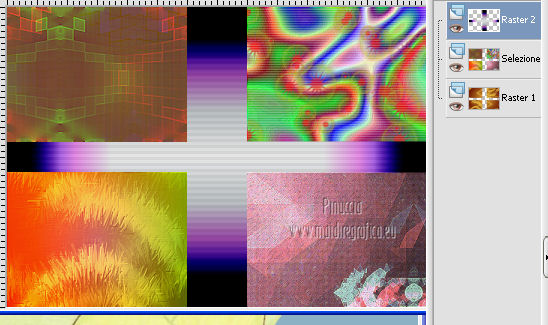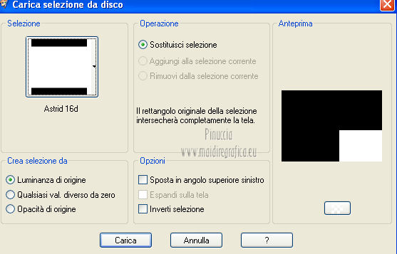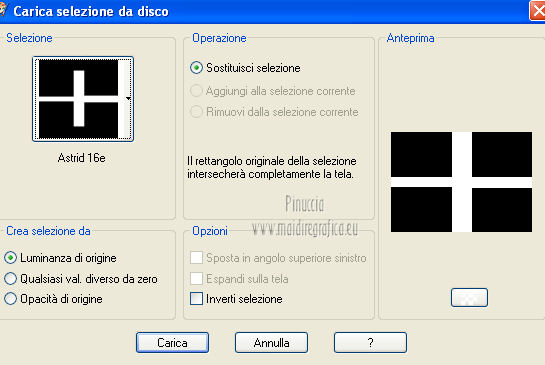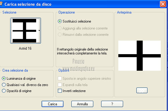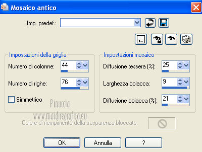 qui puoi trovare qualche risposta ai tuoi dubbi. Se l'argomento che ti interessa non è presente, ti prego di segnalarmelo. Per tradurre questo tutorial ho usato PSP X. Questo tutorial è una creazione di ©Araemae e non può essere copiato su altri siti nè essere offerto per il download. Lo stesso vale per la mia traduzione. Il materiale viene da vari gruppi di condivisione. Il copyright appartiene ai rispettivi autori. Grazie ai creatori dei tubes che mettono a disposizione il loro lavoro in vari gruppi di condivisione. Occorrente: Materiale qui Per il tube grazie LuzCristina Filtri: consulta, se necessario, la mia sezione filtri qui Filters Unlimited 2.0 qui Alien Skin Eye Candy 5 Impact - Perspective Shadow qui Ulead - Particle qui FM Tile Tools - Blend emboss qui Birgits Chaos - Mosaik qui Xero - Lineart qui Xero - Ultraviolet qui Flaming Pear - Make cube Tile qui ColorRave - Atmospherizer 1.1 qui Xaos Tools - Terrazzo 2 qui Penta.Com - Color Dot qui Dc Special - BorderFade, ColorFade, PerssiannRug qui ![]() se stai usando altri colori, sei libero di sperimentare le modalità di miscelatura più adatte Metti le selezioni nella cartella Selezioni. 1. Apri una nuova immagine trasparente 700 x 500 pixels. Selezione>Carica/Salva selezione>Carica selezione da disco. Cerca e carica la selezione "Astrid selectie 16". ![]() Apri l'immagine di sfondo "Astridbg16" e vai a Modifica>Copia. Torna al tuo lavoro e vai a Modifica>Incolla nella selezione. Selezione>Deseleziona. 2. Selezione>Carica/Salva selezione>Carica selezione da disco. Cerca e carica la selezione "Astrid selectie 16a". ![]() Selezione>Innalza selezione a livello. 3. Effetti>Effetti artistici>Stagnola colorata - con un colore scelto dal tuo tube. ![]() 4. Effetti>Plugins>Ulead - Particle. Seleziona Stars con i seguenti settaggi. ![]() 5. Effetti>Effetti di trama>Veneziana. ![]() 6. Effetti>Plugins>FM Tile Tools - Blend emboss, con i settaggi standard. ![]() Selezione>Deseleziona. 7. Attiva il livello Raster 1. Selezione>Carica/Salva selezione>Carica selezione da disco. Cerca e carica la selezione "Astrid selectie 16b". ![]() Selezione>Innalza selezione a livello. Effetti>Plugins>Birgits Chaos - Mosaik. ![]() 8. Effetti>Plugins>Xero - Lineart. ![]() Effetti>Plugins>Flaming Pear - Make cube Tile. 9. Effetti>Plugins>Filters Unlimited 2.0 - Color effects - Channel Shift. ![]() Effetti>Effetti di bordo>Aumenta. Selezione>Deseleziona. 10. Attiva nuovamente il livello Raster 1. Selezione>Carica/Salva selezione>Carica selezione da disco. Cerca e carica la selezione "Astrid selectie 16c". ![]() Selezione>Innalza selezione a livello. Effetti>Effetti di trama>Manto. ![]() 11. Effetti>Plugins>ColorRave - Atmospherizer 1.1. ![]() Effetti>Plugins>FM Tile Tools - Blend emboss, con i settaggi standard. ![]() Selezione>Deseleziona. 12. Attiva nuovamente il livello Raster 1. Selezione>Carica/Salva selezione>Carica selezione da disco. Cerca e carica la selezione "Astrid selectie 16d". ![]() Selezione>Innalza selezione a livello. attenzione, prima di continuare salva il lavoro, perchè il prossimo filtro potrebbe bloccare e chiudere il tuo Psp. La schermata del filtro è di Astrid. Se il tuo PSP non ti dà problemi nell'applicazione del filtro continua, altrimenti vedi le note successive alla schermata Effetti>Plugins>Xaos Tools - Terrazzo 2. ![]() se, come è successo a me, non riesci a usare il filtro, riapri PSP e apri l'immagine salvata con la selezione ancora attiva. In alternativa puoi usare un effetto Trama (Effetti>Effetti di trama>Trama) a tuo piacimento, oppure un altro filtro. Nell'esempio in alto ho usato il filtro Virtual Painter ![]() nell'esempio sotto il tutorial ho usato un effetto Trama Effetti>Effetti di bordo>Aumenta. 13. Effetti>Plugins>Filters Unlimited 2.0 - Color effects - Channel Shift. ![]() 14. Effetti>Plugins>Penta.Com - Color Dot. ![]() 15. Effetti>Plugins>Xero - Ultraviolet. ![]() Selezione>Deseleziona. 16. Attiva il livello superiore. Livelli>Unisci>Unisci giù - 3 volte. Livelli>Nuovo livello raster. Selezione>Carica/Salva selezione>Carica selezione da disco. Cerca e carica la selezione "Astrid selectie 16e". ![]() 17. Imposta il colore di primo piano con il bianco, e il colore di sfondo con un colore scelto dal tuo tube. Passa il colore di primo piano a Gradiente, stile Lineare. ![]() Riempi la selezione con il gradiente.18. Effetti>Effetti di trama>Veneziana. ![]() 19. Effetti>Plugins>Filters Unlimited 2.0 - Dc Special - BorderFade. ![]() 20. Effetti>Plugins>Filters Unlimited 2.0 - Dc Special - ColorFade. ![]() Selezione>Deseleziona. 21. Dovresti avere questo. ![]() Attiva il livello centrale. Immagine>Ridimensiona, all'80%, tutti i livelli non selezionato. Effetti>Effetti 3D>Sfalsa ombra, con il colore nero. ![]() Ripeti l'Effetto Sfalsa ombra, cambiando verticale e orizzontale con -2. 22. Attiva il livello raster 1. Effetti>Plugins>Filters Unlimited - Color effects - Intensity to Hue. ![]() 23. Regola>Sfocatura>Sfocatura gaussiana - raggio 10. ![]() Effetti>Effetti di trama>Mosaico antico. ![]() 24. Effetti>Plugins>Filters Unlimited 2.0 - DC Special - Perssian Rug. ![]() 25. Attiva il livello superiore. Apri il tube "2484-luzcristina" e vai a Modifica>Copia. Torna al tuo lavoro e vai a Modifica>Incolla come nuovo livello. Livelli>Duplica. Livelli>Unisci>Unisci giù. 26. Effetti>Plugins>Alien Skin Eye Candy 5 Impact - Perspective Shadow. Seleziona il preset Drop Shadow Blurry e ok. ![]() Ripeti l'Effetto una seconda volta. 27. Apri Tube "AstriDDesignColours" e vai a Modifica>Copia. Torna al tuo lavoro e vai a Modifica>Incolla come nuovo livello. Effetti>Effetti di immagine>Scostamento. ![]() Livelli>Disponi>Sposta giù. 28. Immagine>Aggiungi bordatura, 1 pixel, simmetriche, con il colore nero. Immagine>Aggiungi bordatura, 50 pixels, simmetriche, con il colore bianco. Immagine>Aggiungi bordatura, 1 pixel, simmetriche, con il colore nero. 29. Aggiungi il tuo nome e/o il tuo watermark su un nuovo livello. Livelli>Uni