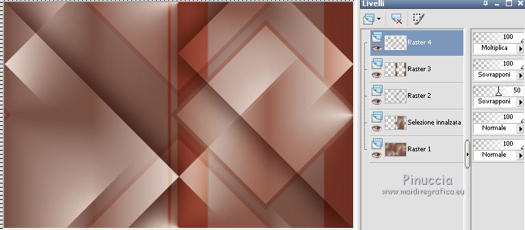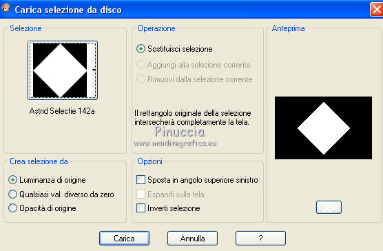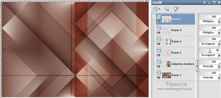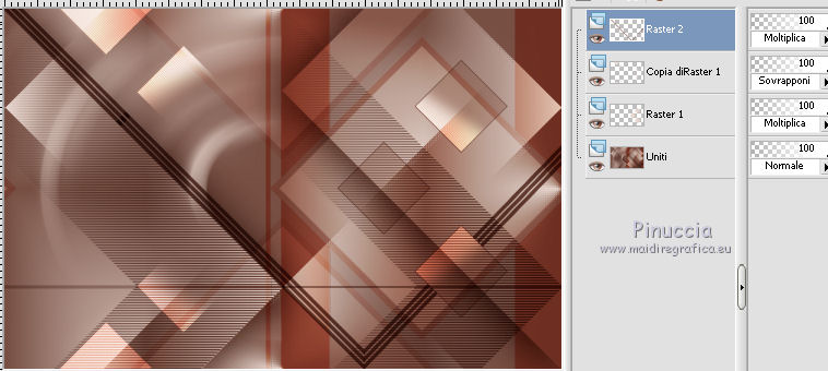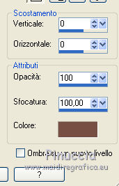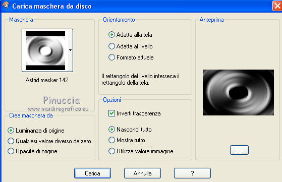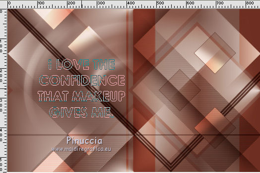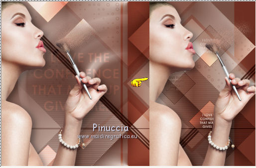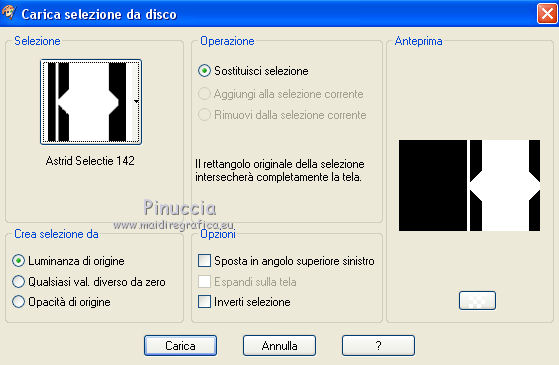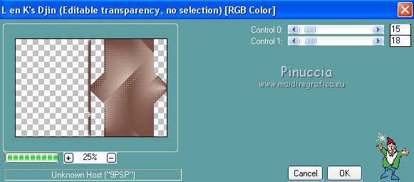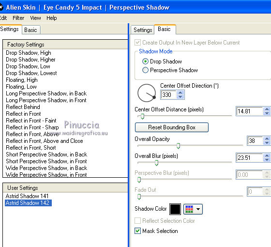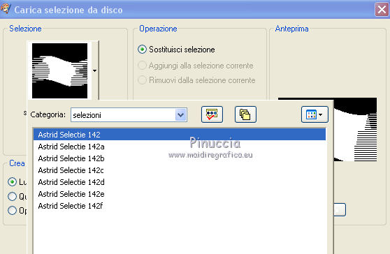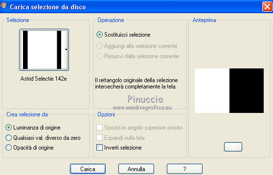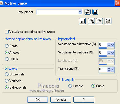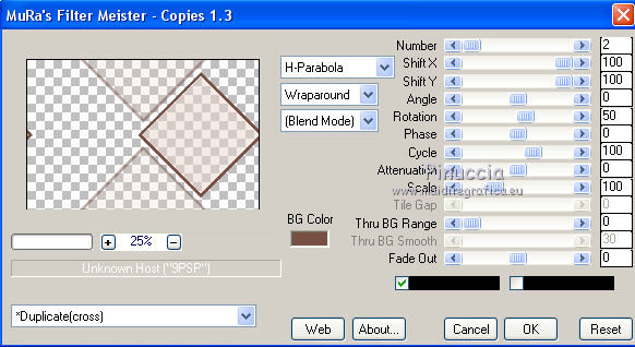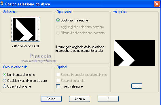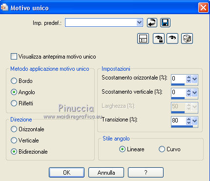 qui puoi trovare qualche risposta ai tuoi dubbi. Se l'argomento che ti interessa non è presente, ti prego di segnalarmelo. Per tradurre questo tutorial ho usato PSP X. Questo tutorial è stato creato con PspX5, ma può essere realizzato anche con le altre versioni di PSP. Dalla versione X4, il comando Immagine>Rifletti è stato sostituito con Immagine>Capovolgi in orizzontale, e il comando Immagine>Capovolgi con Immagine>Capovolgi in verticale. Nelle versioni X5 e X6, le funzioni sono state migliorate rendendo disponibile il menu Oggetti. Nella nuova versione X7 sono tornati Rifletti/Capovolgi, ma con nuove differenze. Vedi la scheda sull'argomento qui Per tradurre il tutorial ho usato PSPX. Occorrente: Materiale qui Per il tube utilizzato grazie Alies Filtri: consulta, se necessario, la mia sezione filtri qui Filters Unlimited 2.0 qui VM Instant Art - Tripolis qui VM Extravaganza - Transmission qui L&K's - L&K's Djin qui AP Lines - Lines SilverLining qui Mura's Meister - Copies qui Alien Skin Eye Candy 5 Impact - Perspective Shadow qui I filtri VM Instant Art e VM Extravaganza si possono usare da soli o importati in Filters Unlimited (come fare vedi qui) Se un filtro fornito appare con questa icona ![]() se stai usando altri colori, sei libero di sperimentare le modalità di miscelatura più adatte Metti il preset Cliccando sul file una o due volte (a seconda delle tue impostazioni), automaticamente il preset si installerà nella cartella corretta. perchè uno o due clic vedi qui Metti il pennello nella cartella Pennelli. Attenzione, il pennello è composto da due files che non devono essere separati. Vedi gli appunti sui pennelli qui Metti le selezioni nella cartella Selezioni. Se non vuoi appesantire la cartella di PSP, puoi aggiungere nei Percorsi Files la cartella in cui hai salvato il materiale. In questo modo le selezioni saranno subito visibili quando ti serviranno, e potrai eliminare la cartella dalle Preferenze Files, quando non ne avrai più bisogno ![]() 1. Scegli due colori dal tuo tube e imposta il colore di primo piano con il colore chiaro, e il colore di sfondo con il colore scuro. I miei colori. ![]() Passa il colore di primo piano a Gradiente di primo piano/sfondo, stile Lineare. ![]() Apri una nuova immagine trasparente 850 x 550 pixels, e riempila con il gradiente.2. Effetti>Plugins>Filters Unlimited 2.0 - VM Instant Art - Tripolis. ![]() 3. Effetti>Effetti di immagine>Motivo unico. ![]() 4. Su questo livello: Selezione>Carica/Salva selezione>Carica selezione da disco. Cerca e carica la selezione "Astrid selectie 142". ![]() Selezione>Innalza selezione a livello. Selezione>Deseleziona. 5. Effetti>Plugins>L&K's - L&K's Djin. ![]() 6. Livelli>Nuovo livello raster. Selezione>Carica/Salva selezione>Carica selezione da disco. Cerca e carica la selezione "Astrid selectie 142a". ![]() Riempi la selezione con il colore di sfondo.7. Selezione>Modifica>Contrai - 10 pixels. Premi sulla tastiera il tasto CANC ![]() Mantieni selezionato. 8. Livelli>Nuovo livello raster. Riporta il colore di primo piano a Colore, e riempi il livello con il colore di primo piano.Abbassa l'opacità di questo livello al 50%. Selezione>Deseleziona. Livelli>Unisci>Unisci giù. 9. Effetti>Plugins>Mura's Meister - Copies. ![]() Cambia la modalità di miscelatura di questo livello in Sovrapponi, e abbassa l'opacità al 50%. ![]() 10. Livelli>Nuovo livello raster. Selezione>Carica/Salva selezione>Carica selezione da disco. Cerca e carica la selezione "Astrid selectie 142b". ![]() Riempi la selezione con il colore di sfondo.Selezione>Deseleziona. Cambia la modalità di miscelatura di questo livello in Sovrapponi. ![]() 11. Livelli>Nuovo livello raster. Selezione>Carica/Salva selezione>Carica selezione da disco. Cerca e carica la selezione "Astrid selectie 142c". ![]() 12. Effetti>Effetti 3D>Sfalsa ombra, colore di sfondo. ![]() Selezione>Deseleziona. 13. Livelli>Duplica. Immagine>Rifletti. Immagine>Capovolgi. Livelli>Unisci>Unisci giù. Cambia la modalità di miscelatura di questo livello in Moltiplica. ![]() 14. Regola>Aggiungi/Rimuovi disturbo>Aggiungi disturbo. ![]() 15. Livelli>Nuovo livello raster. Selezione>Carica/Salva selezione>Carica selezione da disco. Cerca e carica la selezione "Astrid selectie 142d". ![]() Riempi la selezione con il colore di sfondo.Selezione>Deseleziona. 16. Effetti>Effetti di immagine>Motivo unico. ![]() 17. Effetti>Plugins>Filters Unlimited 2.0 - VM Extravaganza - Transmission. ![]() Cambia la modalità di miscelatura di questo livello in Moltiplica. ![]() 18. Livelli>Nuovo livello raster. Selezione>Carica/Salva selezione>Carica selezione da disco. Cerca e carica la selezione "Astrid selectie 142e". ![]() Riempi la selezione con il colore di primo piano.Selezione>Deseleziona. 19. Livelli>Carica/Salva maschera>Carica maschera da disco. Cerca e carica la maschera "Astrid masker 142". ![]() Livelli>Duplica - 2 volte. ![]() Livelli>Unisci>Unisci gruppo. 20. Dovresti avere questo: ![]() Livelli>Unisci>Unisci visibile. 21. Livelli>Nuovo livello raster. Selezione>Carica/Salva selezione>Carica selezione da disco. Cerca e carica la selezione "Astrid selectie 142f". ![]() 22. Riempi la selezione con il colore di sfondo.Selezione>Modifica>Contrai - 1 pixels. Riempi la selezione con il colore di primo piano.Selezione>Deseleziona. Cambia la modalità di miscelatura di questo livello in Moltiplica. 23. Livelli>Duplica. Cambia la modalità di miscelatura di questo livello in Sovrapponi. ![]() 24. Effetti>Effetti di immagine>Motivo unico. ![]() 25. Effetti>Plugins>AP Lines - Lines SilverLining. ![]() 26. Attiva lo strumento Gomma ![]() e cancella il blocco al centro. ![]() Risultato. ![]() 27. Apri "Astrid Deco 142" e vai a Modifica>Copia. Torna al tuo lavoro e vai a Modifica>Incolla come nuovo livello. Cambia la modalità di miscelatura di questo livello in Moltiplica. ![]() 28. Apri il pennello "Astrid penseel 142". File>Esporta>Pennello personalizzato, assegna un nome al pennello e ok. !