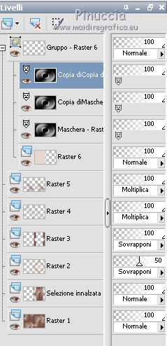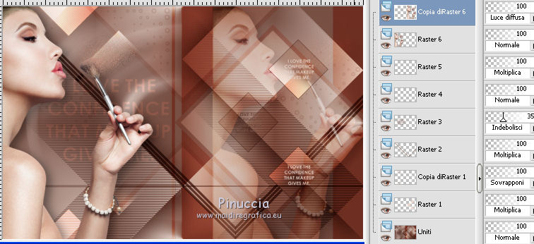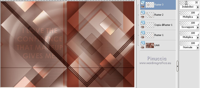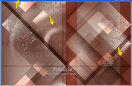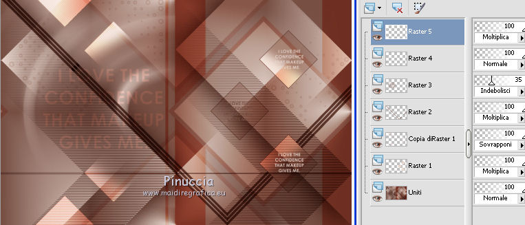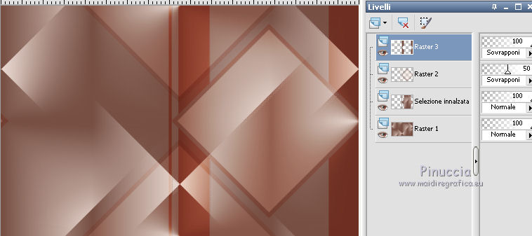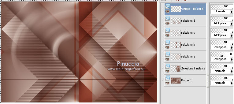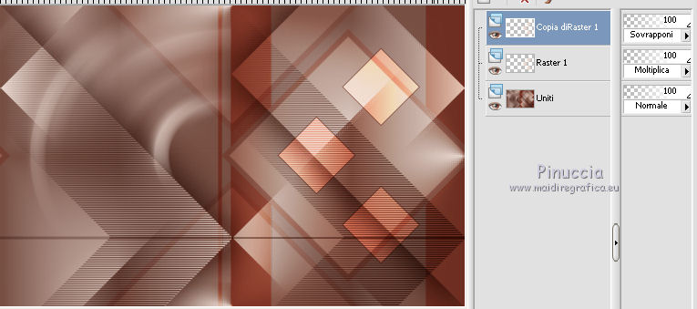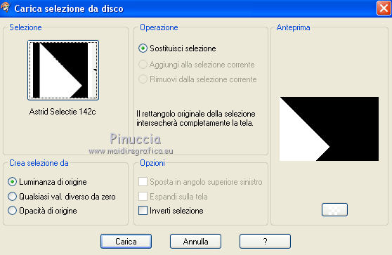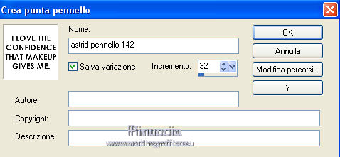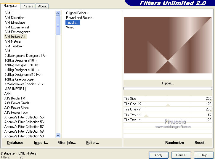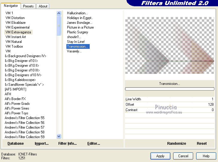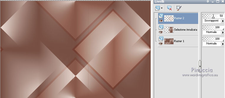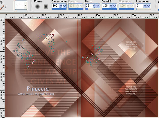 qui puoi trovare qualche risposta ai tuoi dubbi. Se l'argomento che ti interessa non è presente, ti prego di segnalarmelo. Per tradurre questo tutorial ho usato PSP X. Questo tutorial è stato creato con PspX5, ma può essere realizzato anche con le altre versioni di PSP. Dalla versione X4, il comando Immagine>Rifletti è stato sostituito con Immagine>Capovolgi in orizzontale, e il comando Immagine>Capovolgi con Immagine>Capovolgi in verticale. Nelle versioni X5 e X6, le funzioni sono state migliorate rendendo disponibile il menu Oggetti. Nella nuova versione X7 sono tornati Rifletti/Capovolgi, ma con nuove differenze. Vedi la scheda sull'argomento qui Per tradurre il tutorial ho usato PSPX. Occorrente: Materiale qui Per il tube utilizzato grazie Alies Filtri: consulta, se necessario, la mia sezione filtri qui Filters Unlimited 2.0 qui VM Instant Art - Tripolis qui VM Extravaganza - Transmission qui L&K's - L&K's Djin qui AP Lines - Lines SilverLining qui Mura's Meister - Copies qui Alien Skin Eye Candy 5 Impact - Perspective Shadow qui I filtri VM Instant Art e VM Extravaganza si possono usare da soli o importati in Filters Unlimited (come fare vedi qui) Se un filtro fornito appare con questa icona ![]() se stai usando altri colori, sei libero di sperimentare le modalità di miscelatura più adatte Metti il preset Cliccando sul file una o due volte (a seconda delle tue impostazioni), automaticamente il preset si installerà nella cartella corretta. perchè uno o due clic vedi qui Metti il pennello nella cartella Pennelli. Attenzione, il pennello è composto da due files che non devono essere separati. Vedi gli appunti sui pennelli qui Metti le selezioni nella cartella Selezioni. Se non vuoi appesantire la cartella di PSP, puoi aggiungere nei Percorsi Files la cartella in cui hai salvato il materiale. In questo modo le selezioni saranno subito visibili quando ti serviranno, e potrai eliminare la cartella dalle Preferenze Files, quando non ne avrai più bisogno ![]() 1. Scegli due colori dal tuo tube e imposta il colore di primo piano con il colore chiaro, e il colore di sfondo con il colore scuro. I miei colori. ![]() Passa il colore di primo piano a Gradiente di primo piano/sfondo, stile Lineare. ![]() Apri una nuova immagine trasparente 850 x 550 pixels, e riempila con il gradiente.2. Effetti>Plugins>Filters Unlimited 2.0 - VM Instant Art - Tripolis. ![]() 3. Effetti>Effetti di immagine>Motivo unico. ![]() 4. Su questo livello: Selezione>Carica/Salva selezione>Carica selezione da disco. Cerca e carica la selezione "Astrid selectie 142". ![]() Selezione>Innalza selezione a livello. Selezione>Deseleziona. 5. Effetti>Plugins>L&K's - L&K's Djin. ![]() 6. Livelli>Nuovo livello raster. Selezione>Carica/Salva selezione>Carica selezione da disco. Cerca e carica la selezione "Astrid selectie 142a". ![]() Riempi la selezione con il colore di sfondo.7. Selezione>Modifica>Contrai - 10 pixels. Premi sulla tastiera il tasto CANC ![]() Mantieni selezionato. 8. Livelli>Nuovo livello raster. Riporta il colore di primo piano a Colore, e riempi il livello con il colore di primo piano.Abbassa l'opacità di questo livello al 50%. Selezione>Deseleziona. Livelli>Unisci>Unisci giù. 9. Effetti>Plugins>Mura's Meister - Copies. ![]() Cambia la modalità di miscelatura di questo livello in Sovrapponi, e abbassa l'opacità al 50%. ![]() 10. Livelli>Nuovo livello raster. Selezione>Carica/Salva selezione>Carica selezione da disco. Cerca e carica la selezione "Astrid selectie 142b". ![]() Riempi la selezione con il colore di sfondo.Selezione>Deseleziona. Cambia la modalità di miscelatura di questo livello in Sovrapponi. ![]() 11. Livelli>Nuovo livello raster. Selezione>Carica/Salva selezione>Carica selezione da disco. Cerca e carica la selezione "Astrid selectie 142c". ![]() 12. Effetti>Effetti 3D>Sfalsa ombra, colore di sfondo. ![]() Selezione>Deseleziona. 13. Livelli>Duplica. Immagine>Rifletti. Immagine>Capovolgi. Livelli>Unisci>Unisci giù. Cambia la modalità di miscelatura di questo livello in Moltiplica. ![]() 14. Regola>Aggiungi/Rimuovi disturbo>Aggiungi disturbo. ![]() 15. Livelli>Nuovo livello raster. Selezione>Carica/Salva selezione>Carica selezione da disco. Cerca e carica la selezione "Astrid selectie 142d". ![]() Riempi la selezione con il colore di sfondo.Selezione>Deseleziona. 16. Effetti>Effetti di immagine>Motivo unico. ![]() 17. Effetti>Plugins>Filters Unlimited 2.0 - VM Extravaganza - Transmission. ![]() Cambia la modalità di miscelatura di questo livello in Moltiplica. ![]() 18. Livelli>Nuovo livello raster. Selezione>Carica/Salva selezione>Carica selezione da disco. Cerca e carica la selezione "Astrid selectie 142e". ![]() Riempi la selezione con il colore di primo piano.Selezione>Deseleziona. 19. Livelli>Carica/Salva maschera>Carica maschera da disco. Cerca e carica la maschera "Astrid masker 142". ![]() Livelli>Duplica - 2 volte. ![]() Livelli>Unisci>Unisci gruppo. 20. Dovresti avere questo: ![]() Livelli>Unisci>Unisci visibile. 21. Livelli>Nuovo livello raster. Selezione>Carica/Salva selezione>Carica selezione da disco. Cerca e carica la selezione "Astrid selectie 142f". ![]() 22. Riempi la selezione con il colore di sfondo.Selezione>Modifica>Contrai - 1 pixels. Riempi la selezione con il colore di primo piano.Selezione>Deseleziona. Cambia la modalità di miscelatura di questo livello in Moltiplica. 23. Livelli>Duplica. Cambia la modalità di miscelatura di questo livello in Sovrapponi. ![]() 24. Effetti>Effetti di immagine>Motivo unico. ![]() 25. Effetti>Plugins>AP Lines - Lines SilverLining. ![]() 26. Attiva lo strumento Gomma ![]() e cancella il blocco al centro. ![]() Risultato. ![]() 27. Apri "Astrid Deco 142" e vai a Modifica>Copia. Torna al tuo lavoro e vai a Modifica>Incolla come nuovo livello. Cambia la modalità di miscelatura di questo livello in Moltiplica. ![]() 28. Apri il pennello "Astrid penseel 142". File>Esporta>Pennello personalizzato, assegna un nome al pennello e ok. !