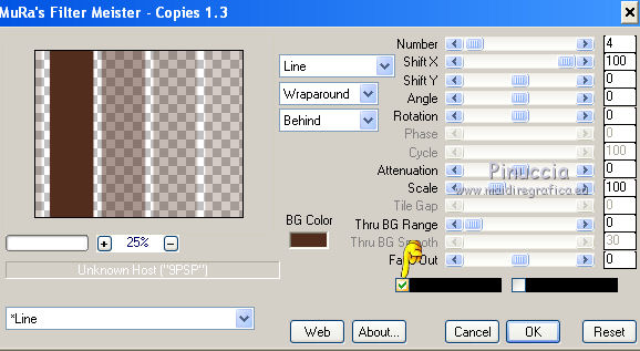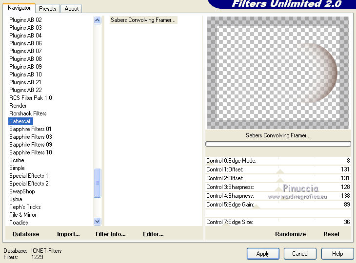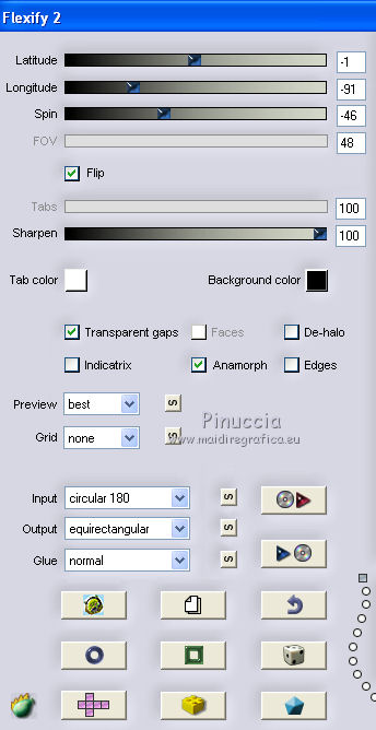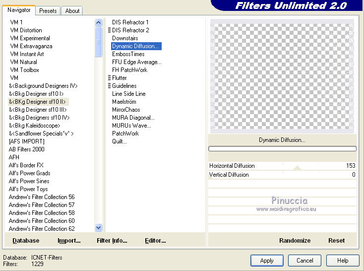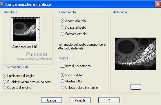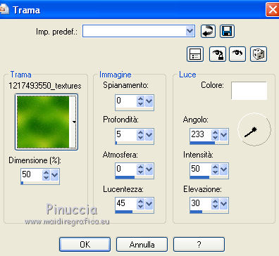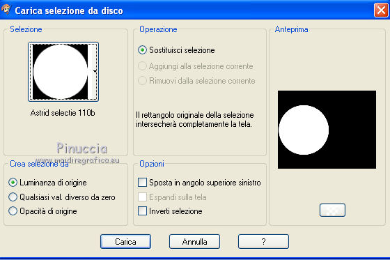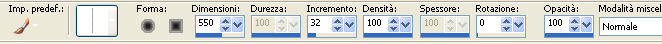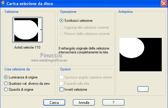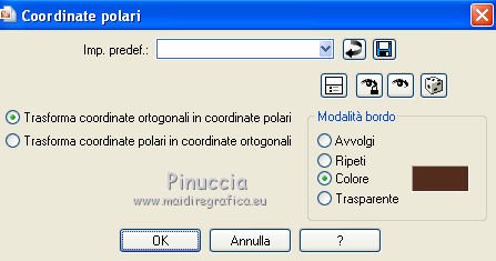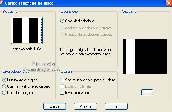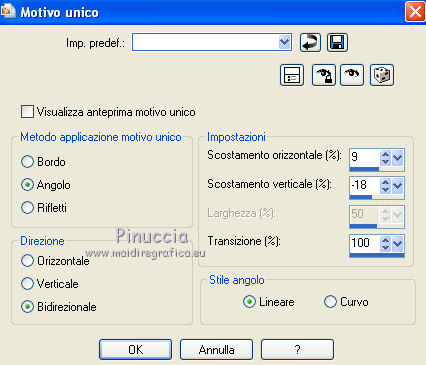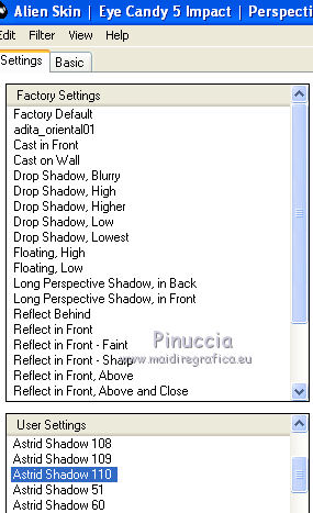 qui puoi trovare qualche risposta ai tuoi dubbi. Se l'argomento che ti interessa non è presente, ti prego di segnalarmelo. Per tradurre questo tutorial ho usato PSP X. Questo tutorial è una creazione di ©Araemae e non può essere copiato su altri siti nè essere offerto per il download. Lo stesso vale per la mia traduzione. Il materiale viene da vari gruppi di condivisione. Il copyright appartiene ai rispettivi autori. Grazie ai creatori dei tubes che mettono a disposizione il loro lavoro in vari gruppi di condivisione. Occorrente: Materiale qui Per il tube utilizzato grazie AnaRidzi Per la trama grazie Nikita Filtri: consulta, se necessario, la mia sezione filtri qui Simple - Blintz qui Filters Unlimited 2.0 qui &<Bkg Designer sf10II> - Dynamic Diffusion qui Sabercat - Sabers Convolving Framer qui Flaming Pear Flexify 2 qui Alien Skin Eye Candy 5 Impact qui Mura's Meister - Copies qui ![]() Metti il preset "Astrid_Shadow_110" nella cartella del filtro Alien Skin Eye Candy 5 Impact>Settings>Shadow. Cliccando sul file una o due volte (a seconda delle tue impostazioni), automaticamente il preset si installerà nella cartella corretta. Metti le maschere nella cartella Maschere. Metti la trama "1217493550_textures" nella cartella Trame. Metti le selezioni nella cartella Selezioni. se stai usando altri colori, sei libero di sperimentare le modalità di miscelatura più adatte 1. Scegli due colori dal tuo tube, imposta il colore di primo piano con il colore chiaro, e il colore di sfondo con il colore scuro. I miei colori: ![]() Passa il colore di primo piano a Gradiente, stile Sprazzo di luce. ![]() Apri una nuova immagine trasparente 800 x 600 pixels, e riempila con il gradiente.2. Livelli>Nuovo livello raster. Riporta il colore di primo piano al colore iniziale, e riempi con il colore di primo piano.3. Livelli>Carica/Salva maschera>Carica maschera da disco. Cerca e carica la maschera "Astrid masker 110". ![]() Livelli>Unisci>Unisci gruppo. 4. Selezione>Carica/Salva selezione>Carica selezione da disco. Cerca e carica la selezione "Astrid selectie 110". ![]() Premi sulla tastiera il tasto CANC. Selezione>Deseleziona. 5. Effetti>Effetti di bordo>Aumenta. 6. Passa il colore di primo piano a Gradiente, con i seguenti settaggi. ![]() 7. Livelli>Nuovo livello raster. Riempi il livello con il gradiente.8. Effetti>Plugins>Flaming Pear - Flexify 2. ![]() 9. Sposta la forma contro il bordo superiore.![]() 10. Livelli>Duplica. Immagine>Capovolgi. Livelli>Unisci>Unisci giù. 11. Effetti>Effetti di immagine>Motivo unico. ![]() Regola>Messa a fuoco>Metti a fuoco. 12. Livelli>Nuovo livello raster. Selezione>Carica/Salva selezione>Carica selezione da disco. Cerca e carica la selezione "Astrid selectie 110a". ![]() 13. Riempi la selezione con il colore di sfondo.Selezione>Deseleziona. 14. Effetti>Plugins>Mura's Meister - Copies. ![]() Abbassa l'opacità di questo livello al 50%. 15. Livelli>Nuovo livello raster. Selezione>Seleziona tutto. Riempi la selezione con il colore di primo piano.Selezione>Modifica>Contrai - 25 pixels. Premi sulla tastiera il tasto CANC. Selezione>Deseleziona. 16. Effetti>Plugins>Filters Unlimited 2.0 - &<BKg Designer sf10 II> - Dynamic Diffusion... ![]() 17. Livelli>Carica/Salva maschera>Carica maschera da disco. Cerca e carica la maschera 20-20. ![]() 18. Livelli>Duplica (il livello della maschera). ![]() Livelli>Unisci>Unisci gruppo. 19. Livelli>Nuovo livello raster. Selezione>Carica/Salva selezione>Carica selezione da disco. Cerca e carica la selezione "Astrid selectie 110b". ![]() Riempi la selezione con il colore di sfondo.Selezione>Deseleziona. 20. Livelli>Carica/Salva maschera>Carica maschera da disco. Carica nuovamente la maschera 20-20. ![]() 21. Livelli>Duplica. Livelli>Unisci>Unisci gruppo. Cambia la modalità di miscelatura di questo livello in Moltiplica. 22. Livelli>Duplica. Immagine>Rifletti. 23. Immagine>Ridimensiona, all'85%, tutti i livelli non selezionato. 24. Effetti>Plugins>Filters Unlimited 2.0 - Sabercat - Sabers Convolving Framer... ![]() 25. Apri "Astrid deco 110" e vai a Modifica>Copia. Torna al tuo lavoro e vai a Modifica>Incolla come nuovo livello. 26. Sposta l'elemento a destra,come nell'esempio. ![]() 27. Apri il tube "AR798" e vai a Modifica>Copia. non chiuderlo perchè ti servirà ancora Torna al tuo lavoro e vai a Modifica>Incolla come nuovo livello. 28. Regola>Sfocatura>Sfocatura gaussiana - raggio 10. ![]() 29. Effetti>Effetti di immagine>Motivo unico. ![]() 30. Effetti>Effetti di trama>Trama, seleziona la trama "1217493550_textures" con i seguenti settaggi. ![]() Cambia la modalità di miscelatura di questo livello in Luminanza (esistente). 31. Cambia nuovamente i settaggi del gradiente. ![]() 32. Apri "Astrid penseel 110". File>Esporta>Pennello personalizzato. Assegna un nome al pennello e ok. 33. Attiva lo strumento Pennello ![]() cerca il pennello che hai appena esportato ![]() e applicalo nella striscia chiara a sinistra, cliccando con il tasto sinistro del mouse per usare il gradiente di primo piano. ![]() Se il tuo PSP non supporta pennelli superiori a 500 pixels: prima di esportare il pennello: Immagine>Ridimensiona a 550 pixels di altezza, tutti i livelli selezionati. Dopo aver esportato e applicato il pennello, premi il tasto D per attivare lo strumento Deformazione ![]() e allunga il pennello come nell'esempio, allargandolo leggermente. ![]() 34. Effetti>Effetti 3D>Smusso a incasso. ![]() 35. Apri "Astrid tekst 110" e vai a Modifica>Copia. Torna al tuo lavoro e vai a Modifica>Incolla come nuovo livello. Sposta questo testo a destra.![]() Abbassa l'opacità di questo livello all'80%. 35. Apri "Astrid tekst 110a" e vai a Modifica>Copia. Torna al tuo lavoro e vai a Modifica>Incolla come nuovo livello. Sposta questo testo a sinistra.![]() Cambia la modalità di miscelatura di qusto livello in Moltiplica, e abbassa l'opacità all'80%. 36. Attiva lo strumento Penna ![]() ![]() 37. Inverti i colori della paletta dei materiali. ![]() 38. Tracci