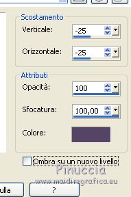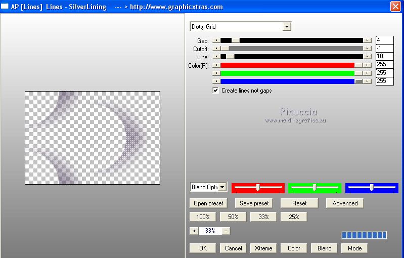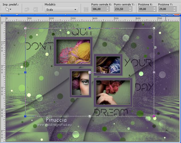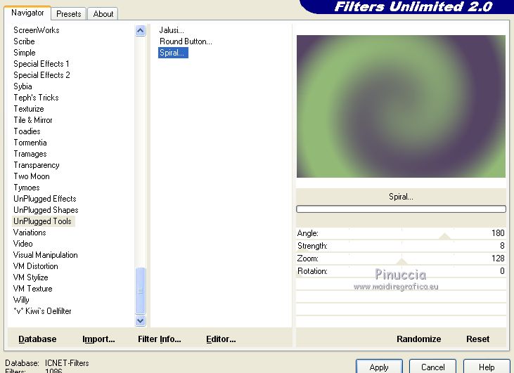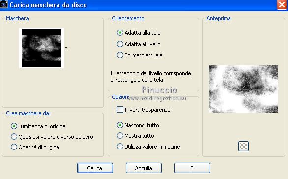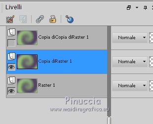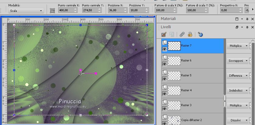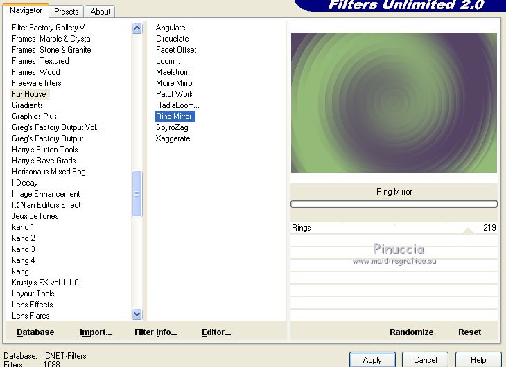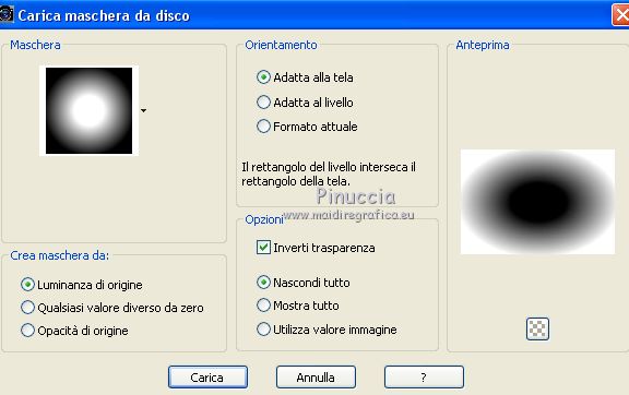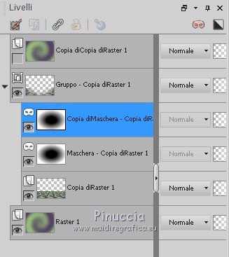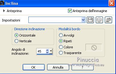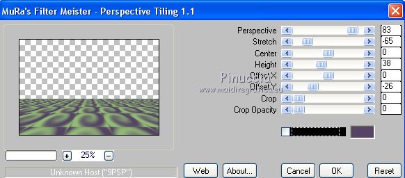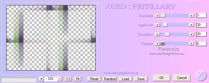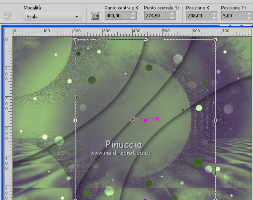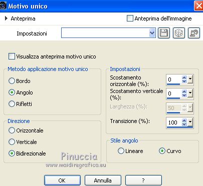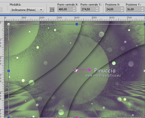 qui puoi trovare qualche risposta ai tuoi dubbi. Se l'argomento che ti interessa non è presente, ti prego di segnalarmelo. Questo tutorial è stato creato con PSPX8 e tradotto con PSPX, ma può essere eseguito anche con le altre versioni di PSP. Dalla versione X4, il comando Immagine>Rifletti è stato sostituito con Immagine>Capovolgi in orizzontale, e il comando Immagine>Capovolgi con Immagine>Capovolgi in verticale. Nelle versioni X5 e X6, le funzioni sono state migliorate rendendo disponibile il menu Oggetti. Con la versione X7 sono tornati i comandi Immagine>Rifletti e Immagine>Capovolgi, ma con nuove funzioni. Vedi la scheda sull'argomento qui le vostre versioni Occorrente: Materiale qui Per il tube della donna grazie Yoka (in questa pagina trovi i links ai siti dei creatori di tubes) Filtri: consulta, se necessario, la mia sezione filtri qui Filters Unlimited 2.0 qui Unplugged Tools - Spiral qui Funhouse - Ring Mirror qui Mura's Meister - Perspective Tiling qui Alien Skin Eye Candy 5 Impact - Perspective Shadow qui Ap [Lines] - Lines SilverLining qui Xero - Fritillary qui I filtri Unplugged Tools e Funhouse si possono usare da soli o importati in Filters Unlimited (come fare vedi qui) Se un filtro fornito appare con questa icona ![]() se stai usando altri colori, sei libero di sperimentare le modalità di miscelatura più adatte Nelle ultime versioni di PSP non c'è il gradiente di primo piano/sfondo (Corel_06_029) Puoi usare i gradienti delle versioni precedenti. Trovi qui i gradienti Corel X. Metti le selezioni nella cartella Selezioni. Apri la maschera e minimizzala con il resto del materiale. 1. Scegli due colori dal tuo tube. Imposta il colore di primo piano con il colore chiaro (per me #93ba77) e il colore di sfondo con il colore scuro (per me #554464). ![]() Passa il colore di primo piano a Gradiente di primo piano/sfondo, stile Lineare. ![]() Apri una nuova immagine trasparente 800 x 550 pixels, e riempila con il gradiente.2. Effetti>Plugins>Filters Unlimited 2.0 - Unplugged Tools - Spiral. ![]() 3. Effetti>Plugins>Filters Unlimited 2.0 - Funhouse - Ring Mirror ![]() 4. Livelli>Duplica - 2 volte. Chiudi il livello superiore e attiva il livello centrale della prima copia. ![]() 5. Effetti>Plugins>Mura's Meister - Perspective Tiling. ![]() 6. Sullo stesso livello. Livelli>Carica/Salva maschera>Carica maschera da disco Cerca e carica la maschera 20-20. ![]() Livelli>Duplica ![]() Livelli>Unisci>Unisci gruppo. 7. Riapri e attiva il livello superiore. Immagine>Capovolgi. 8. Livelli>Carica/Salva maschera>Carica maschera da disco. Cerca e carica la maschera Astrid masker 161. ![]() Livelli>Unisci>Unisci gruppo. 9. Livelli>Nuovo livello raster. Selezione>Carica/Salva selezione>Carica selezione da disco. Cerca e carica la selezione Astrid selectie 161. ![]() 10. Effetti>Effetti 3D>Sfalsa ombra, colore di sfondo. ![]() Selezione>Deseleziona. 11. Effetti>Effetti di immagine>Motivo unico. ![]() 12. Cambia la modalità di miscelatura di questo livello in Sovrapponi. 13. Livelli>Duplica. Effetti>Plugins>AP Lines - Lines SilverLining. ![]() Cambia la modalità di miscelatura di questo livello in Dissolvi. ![]() 14. Selezione>Carica/Salva selezione>Carica selezione da disco. Cerca e carica la selezione Astrid selectie 161a. ![]() Riempi la selezione con il colore di sfondo.Selezione>Deseleziona. 15. Effetti>Effetti di distorsione>Vento, da sinistra, intensità 75. ![]() 16. Effetti>Effetti geometrici>Inclina. ![]() 17. Effetti>Effetti di distorsione>Stringi - nelle versioni più recenti è diventato Compressione ![]() Cambia la modalità di miscelatura di questo livello in Moltiplica. 18. Apri il tube Astrid Deco 161, che è composto da vari livelli. Attiva il livello "Stippen Tegenhouden". ![]() Modifica>Copia e minimizza il tube. Torna al tuo lavoro e vai a Modifica>Incolla come nuovo livello. 19. Tasto K sulla tastiera per attivare lo strumento Puntatore ![]() e imposta Posizione X: 24,00 e Posizione Y: 16.00. ![]() Mantieni la modalità di miscelatura di questo livello in Indebolisci. 20. Tube Astrid Deco 161 e attiva il livello "Stippen Verschil". Modifica>Copia e minimizza il tube. Torna al tuo lavoro e vai a Modifica>Incolla come nuovo livello. 21. Strumento Puntatore ![]() e imposta Posizione X: 208,00 e Posizione Y: 109.00. ![]() Mantieni la modalità di miscelatura di questo livello in Differenza. 22. Tube Astrid Deco 161, attiva il livello Stippen Overlay e vai a Modifica>Copia. Minimizza il tube. Torna al tuo lavoro e vai a Modifica>Incolla come nuovo livello. 23. Strumento Puntatore ![]() e imposta Posizione X: 0,00 e Posizione Y: 1.00. ![]() Cambia la modalità di miscelatura di questo livello in Sovrapponi. 24. Tube Astrid Deco 161, attiva il livello "Stippen Vermenigvuldigen" e vai a Modifica>Copia. (adesso puoi chiudere il tube) Torna al tuo lavoro e vai a Modifica>Incolla come nuovo livello. 25. Strumento Puntatore ![]() e imposta Posizione X: 36,00 e Posizione Y: 10.00. Cambia la modalità di miscelatura di questo livello in Moltiplica. ![]() Tasto M per deselezionare lo strumento. 26. Livelli>Nuovo livello raster. Selezione>Carica/Salva selezione>Carica selezione da disco. Cerca e carica la selezione Astrid selectie 161b. ![]() Riempi la selezione con il colore di sfondo.27. Selezione>Modifica>Contrai - 1 pixel. Riporta il colore di primo piano a Colore. Riempi la selezione con il colore di primo piano.Selezione>Modifica>Contrai - 1 pixel. Riempi la selezione con il colore di sfondo.Selezione>Modifica>Contrai - 10 pixels. Riempi la selezione con il colore di primo piano.Selezione>Modifica>Contrai - 1 pixel. Premi sulla tastiera il tasto CANC ![]() Mantieni selezionato. 28. Apri il tube Yoka-StrangeHairdo-240917 e vai a Modifica>Copia. Torna al tuo lavoro e vai a Modifica>Incolla come nuovo livello. Posiziona il tube sulla selezione.![]() Selezione>Inverti. Prei sulla tastiera il tasto CANC. Mantieni ancora selezionato. 29. Effetti>Plugins>Alien Skin Eye Candy 5 Impact 