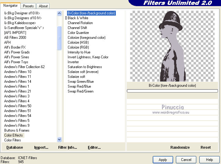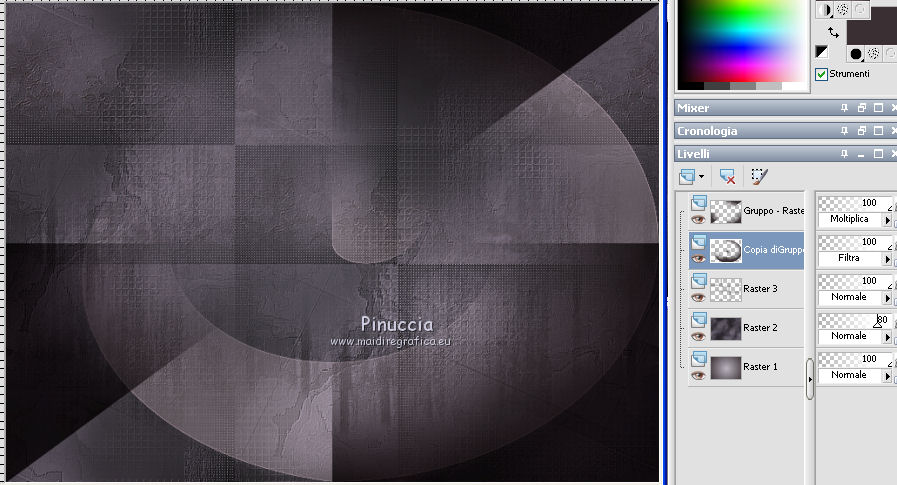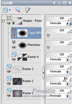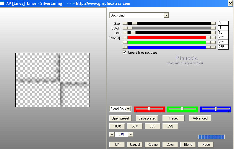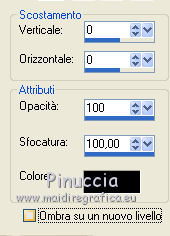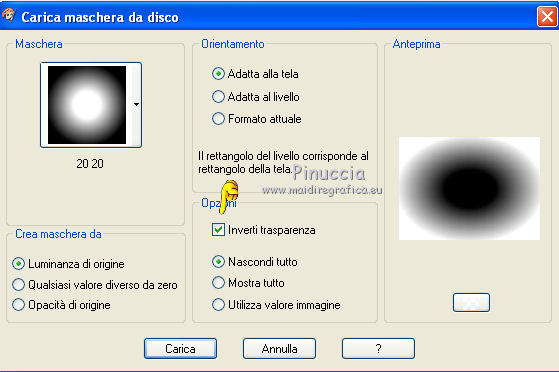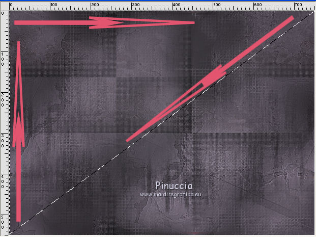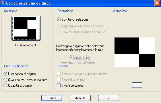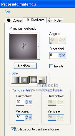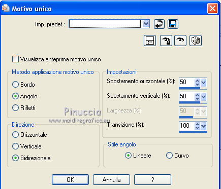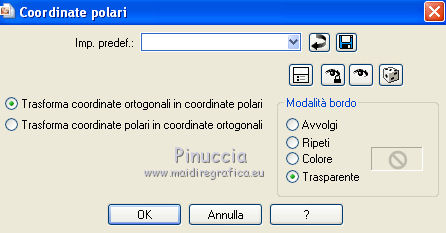 qui puoi trovare qualche risposta ai tuoi dubbi. Se l'argomento che ti interessa non è presente, ti prego di segnalarmelo. Per tradurre questo tutorial ho usato PSP X. Questo tutorial è una creazione di ©Araemae e non può essere copiato su altri siti nè essere offerto per il download. Lo stesso vale per la mia traduzione. Il materiale viene da vari gruppi di condivisione. Il copyright appartiene ai rispettivi autori. Grazie ai creatori dei tubes che mettono a disposizione il loro lavoro in vari gruppi di condivisione. Occorrente: Materiale qui Il tube della donna è di Annelies. Filtri: consulta, se necessario, la mia sezione filtri qui Filters Unlimited 2.0 qui FM Tile Tools - Blend Emboss qui Simple - Half Wrap qui AP Lines - Lines SilverLining qui Graphics Plus - Cross Shadow qui ![]() Metti le selezioni nella cartella Selezioni. Metti la maschera nella cartella Maschere. se stai usando altri colori, sei libero di sperimentare le modalità di miscelatura più adatte 1. Scegli due colori dal tuo tube, imposta il colore di primo piano con il colore chiaro, e il colore di sfondo con il colore scuro. ![]() Passa il colore di primo piano a Gradiente, stile Sprazzo di luce, con i seguenti settaggi. ![]() Apri una nuova immagine trasparente 750 x 550 pixels, e riempila con il gradiente.2. Livelli>Nuovo livello raster. Selezione>Seleziona tutto. Apri "Astrid texture 90" e vai a Modifica>Copia. Torna al tuo lavoro e vai a Modifica>Incolla nella selezione. Selezione>Deseleziona. Abbassa l'opacità di questo livello all'80%. 3. Livelli>Nuovo livello raster. Selezione>Carica/Salva selezione>Carica selezione da disco. Cerca e carica la selezione "Astrid selectie 90". ![]() Effetti>Effetti 3D>Sfalsa ombra. ![]() Selezione>Deseleziona. 4. Effetti>Plugins>AP Lines - Lines SilverLining seleziona Dotty Grid con i seguenti settaggi. ![]() 5. Effetti>Effetti di immagine>Motivo unico. ![]() 6. Attiva lo strumento Selezione a mano libera , da punto a punto.![]() Traccia una selezione come nell'esempio. ![]() Livelli>Nuovo livello raster. Riempi la selezione con il colore di sfondo.Selezione>Deseleziona. 7. Effetti>Plugins>Simple - Half Wrap. 8. Livelli>Carica/Salva maschera>Carica maschera da disco. Cerca e carica la maschera 20-20. ![]() Duplica il livello della maschera (Livelli>Duplica). ![]() Livelli>Unisci>Unisci gruppo. Cambia la modalità di miscelatura di questo livello in Moltiplica. 9. Livelli>Duplica. Effetti>Effetti di distorsione>Coordinate polari. ![]() 10. Immagine>Capovolgi. Cambia la modalità di miscelatura di questo livello in Filtra. Effetti>Effetti di bordo>Aumenta. Livelli>Disponi>Sposta giù. ![]() 11. Attiva il livello superiore. Apri il tube "Alies841-woman-13042012" e vai a Modifica>Copia. Torna al tuo lavoro e vai a Modifica>Incolla come nuovo livello. 12. Effetti>Plugins>Filters Unlimited 2.0 - Color Effects - Bi Color (fore-/background color). ![]() Cambia la modalità di miscelatura di questo livello in Moltiplica. 13. Livelli>Nuovo livello raster. Selezione>Seleziona tutto. Riempi la selezione con il colore di primo piano.14. Selezione>Modifica>Contrai - 50 pixels. Premi sulla tastiera il tasto CANC. Selezione>Deseleziona. Abbassa l'opacità di questo livello al 20%. Effetti>Effetti di bordo>Aumenta. 15. Apri "Astrid penseel 90". File>Esporta>Pennello personalizzato, assegna un nome al pennello e ok. 16. Livelli>Nuovo livello raster. Attiva lo strumento Pennello ![]() cerca e seleziona il pennello che hai appena esportato ![]() applicalo nell'angolo in basso a sinistra, cliccando con il tasto sinistro del mouse per usare il colore di primo piano. 17. Livelli>Duplica. Immagine>Rifletti. Immagine>Capovolgi. Cambia la modalità di miscelatura di questo livello in Filtra. 18. Apri il tube "Astrid Tekst 90" e vai a Modifica>Copia. Torna al tuo lavoro e vai a Modifica>Incolla come nuovo livello. Spostalo in alto come nel mio esempio.Cambia la modalità di miscelatura di questo livello in Filtra. 19. Livelli>Disponi>Sposta giù. Ripeti ancora 3 volte (deve trovarsi sotto il livello del tube). 20. Attiva il livello superiore. Apri il tube "Alies 841-woman-13042012" e vai a Modifica>Copia. Torna al tuo lavoro e vai a Modifica>Incolla come nuovo livello. Spostalo in po' più a destra,come nel mio esempio. 21. Effetti>Effetti 3D>Sfalsa ombra. ![]() 22. Apri il tube "Astrid Tekst 90a" e vai a Modifica>Copia. Torna al tuo lavoro e vai a Modifica>Incolla come nuovo livello. Spostalo al centro, come nel mio esempio.23. Immagine>Aggiungi bordatura, 1 pixel, simmetriche, con il colore di primo piano. Immagine>Aggiungi bordatura, 10 pixels, simmetriche, con il colore di sfondo. Immagine>Aggiungi bordatura, 1 pixel, simmetriche, con il colore di primo piano. Immagine>Aggiungi bordatura, 30 pixels, simmetriche, con il colore di sfondo. 24. Seleziona il bordo da 30 pixels con la bacchetta magica ![]() Livelli>Nuovo livello raster. Riempi la selezione con il colore di primo piano.25. Effetti>Plugins>Graphics Plus - Cross Shadow, con i settaggi standard. ![]() Selezione>Deseleziona. 26. Immagine>Aggiungi bordatura, 1 pixel, simmetriche, con il colore di primo piano. 27. Aggiungi il tuo nome e/o il tuo watermark su un nuovo livello. 28. Livelli>Unisci>Unisci tutto e salva in formato jpg. Per questo esempio ho usato un tube di White Diamond. ![]() ![]() Le vostre versioni. Grazie ![]() Olimpia ![]() Gianni ![]() Se hai problemi o dubbi, o trovi un link non funzionante, o anche soltanto per un saluto, scrivimi. 1 Maggio 2012 |