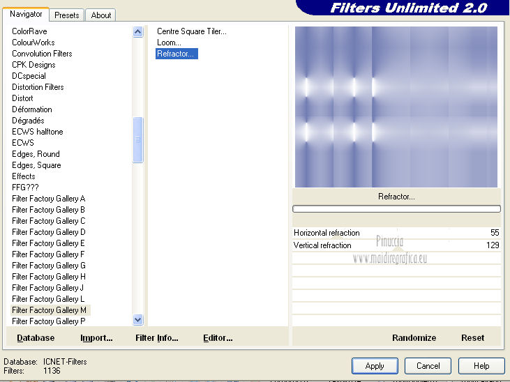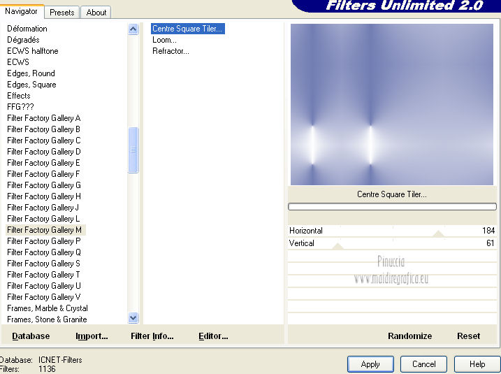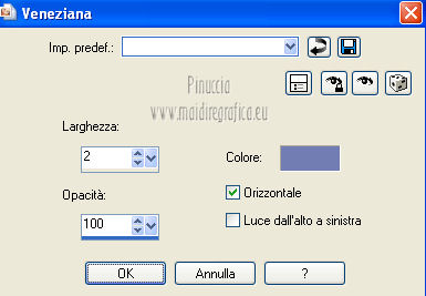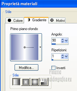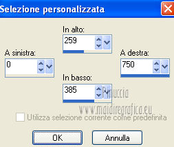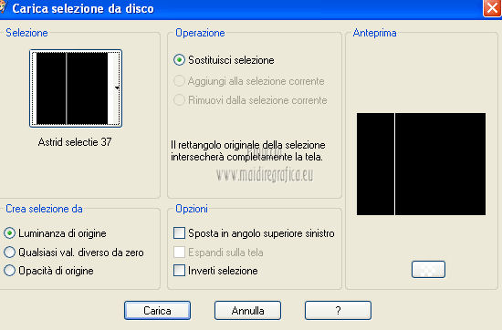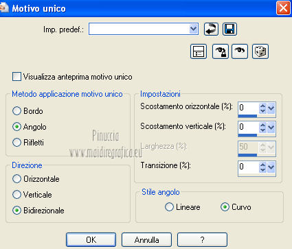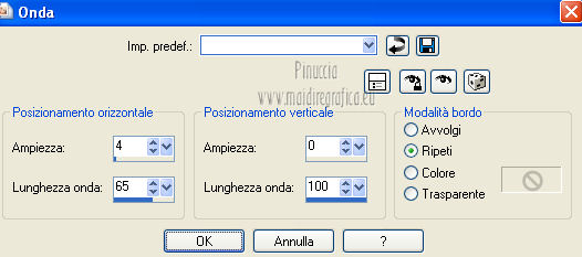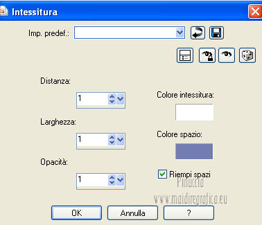 qui puoi trovare qualche risposta ai tuoi dubbi. Se l'argomento che ti interessa non è presente, ti prego di segnalarmelo. Per tradurre questo tutorial ho usato PSP X. Questo tutorial è una creazione di ©Araemae e non può essere copiato su altri siti nè essere offerto per il download. Lo stesso vale per la mia traduzione. Il materiale viene da vari gruppi di condivisione. Il copyright appartiene ai rispettivi autori. Grazie ai creatori dei tubes che mettono a disposizione il loro lavoro in vari gruppi di condivisione. Occorrente: Materiale qui Il tube della donna è di Nikita Filtri: consulta, se necessario, la mia sezione filtri qui Filters Unlimited 2.0 qui Filter Factory Gallery M qui FM Tile Tools - Blend Emboss qui L&K - L&K Zitah qui Flaming Pear - Flood qui ![]() se stai usando altri colori, sei libero di sperimentare le modalità di miscelatura più adatte Metti le maschere nella cartella Maschere. Metti le selezioni nella cartella Selezioni. Scegli un colore dal tuo tube e impostalo come colore di primo piano. Imposta il colore di sfondo con il bianco. ![]() Passa il colore di primo piano a Gradiente. ![]() Apri una nuova immagine trasparente 750 x 600 pixels, e riempila con il gradiente.2. Effetti>Plugins>Filter Factory Gallery M - Centre Square Tiler. ![]() Ripeti l'Effetto una seconda volta. 3. Effetti>Plugins>Filter Factory Gallery M - Refractor. ![]() Effetti>Effetti di bordo>Aumenta. 4. Effetti>Effetti di distorsione>Onda. ![]() 5. Effetti>Plugins>FM Tile Tools - Blend Emboss. ![]() 6. Livelli>Duplica. Effetti>Plugins>L&K - L&K; Zitah. ![]() 7. Livelli>Carica/Salva maschera>Carica maschera da disco. Cerca e carica la maschera 20-20. ![]() Livelli>Unisci>Unisci gruppo. Livelli>Unisci>Unisci giù. 8. Livelli>Nuovo livello raster. Selezione>Carica/Salva selezione>Carica selezione da disco. Cerca e carica la selezione "Astrid Selectie 37". ![]() Riempi la selezione con il colore bianco.Selezione>Deseleziona. 9. Effetti>Effetti di distorsione>Onda. ![]() 10. Effetti>Effetti di immagine>Motivo unico. ![]() 11. Livelli>Nuovo livello raster. Selezione>Carica/Salva selezione>Carica selezione da disco. Cerca e carica la selezione "Astrid Selectie 37a". ![]() Riempi la selezione con il colore bianco.Selezione>Modifica>Contrai - 1 pixel. Premi sulla tastiera il tasto CANC. Selezione>Deseleziona. 12. Effetti>Effetti di distorsione>Onda. ![]() 13. Effetti>Effetti di immagine>Motivo unico. ![]() 14. Livelli>Nuovo livello raster. Attiva lo strumento Selezione ,clicca sull'icona Selezione personalizzata ![]() e imposta i seguenti settaggi: ![]() Riempi la selezione con il colore bianco.Selezione>Deseleziona. Abbassa l'opacità di questo livello al 40%. 15. Effetti>Plugins>Flaming Pear - Flood. ![]() Cambia la modalità di miscelatura di questo livello in Filtra. 16. Apri il tube "Astrid 37 Bollen" e vai a Modifica>Copia. Torna al tuo lavoro e vai a Modifica>Incolla come nuovo livello. Spostalo in alto a sinistra.Abbassa l'opacità di questo livello al 50%. Livelli>Duplica e attiva il livello sottostante dell'originale. 17. Effetti>Effetti di trama>Veneziana, con il colore di primo piano. ![]() Attiva il livello superiore. Livelli>Unisci>Unisci giù. 19. Apri il tube "37 Astrid Tekst" e vai a Modifica>Copia. Torna al tuo lavoro e vai a Modifica>Incolla come nuovo livello. Spostalo a destra contro il bordo.![]() 19. Livelli>Nuovo livello raster. Selezione>Carica/Salva selezione>Carica selezione da disco. Cerca e carica la selezione "Astrid Selectie 37b". ![]() 20. Apri il tube "12479954757_femmes" e vai a Modifica>Copia. Torna al tuo lavoro e vai a Modifica>Incolla come nuovo livello. Posiziona il tube nell'area selezionata.Selezione>Inverti. Premi sulla tastiera il tasto CANC. Selezione>Inverti. 21. Effetti>Plugins>FM Tile Tools - Blend Emboss. ![]() 22. Selezione>Modifica>Seleziona bordature selezione. ![]() 23. Cambia i settaggi del gradiente in stile Lineare. ![]() Riempi la selezione con il gradiente.Selezione>Deseleziona. Effetti>Effetti 3D>Sfalsa ombra, con il colore di primo piano. ![]() 24. Livelli>Nuovo livello raster. Selezione>Carica/Salva selezione>Carica selezione da disco. Cerca e carica la selezione "Astrid Selectie 37c". ![]() Riempi la selezione con il colore di primo piano.Abbassa l'opacità di questo livello al 30%. 25. Livelli>Nuovo livello raster. Selezione personalizzata ![]() ![]() Riempi con il gradiente del punto 23.Selezione>Deseleziona. Effetti>Effetti di bordo>Aumenta. 26. Riporta il colore di primo piano a Colore. ![]() Attiva lo strumento Testo ![]() ![]() Scrivi Dream your dream nella striscia. Livelli>Converti in livello raster. 27. Livelli>Unisci>Unisci visibile. Selezione>Seleziona tutto. Selezione>Modifica>Contrai - 1 pixel. Selezione>Inverti. Riempi la selezione con il colore di primo piano.Selezione>Deseleziona. 28. Livelli>Duplica - 2 volte. 29. Attiva il livello superiore. Immagine>Ridimensiona, al 75%, tutti i livelli non selezionato. 30. Attiva il livello centrale. Immagine>Ridimensiona, all'80%, tutti i livelli non selezionato. Effetti>Effetti di trama>Intessitura colore intessitura bianco; colore spazio: colore di primo piano. ![]() 31. Attiva il livello inferiore. Regola>Sfocatura>Sfocatura gaussiana - raggio 10. ![]() Livelli>Unisci>Unisci tutto. Immagine>Aggiungi bordatura, 1 pixel, simmetriche, con il colore di primo piano. 32. Aggiungi il tuo nome e/o il tuo watermark su un nuovo livello. Livelli>Unisci>Unisci tutto. ![]() Se hai problemi o dubbi, o trovi un link non funzionante, o anche soltanto per un saluto, scrivimi. 26 Luglio 2012 |
