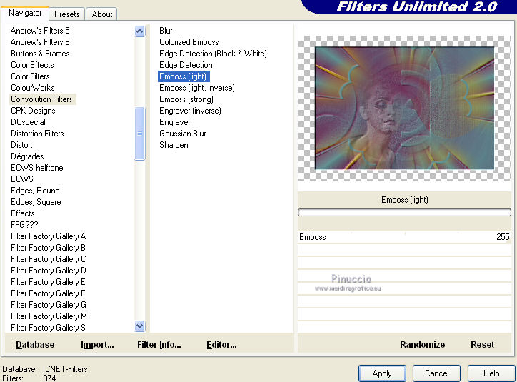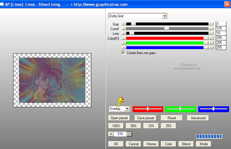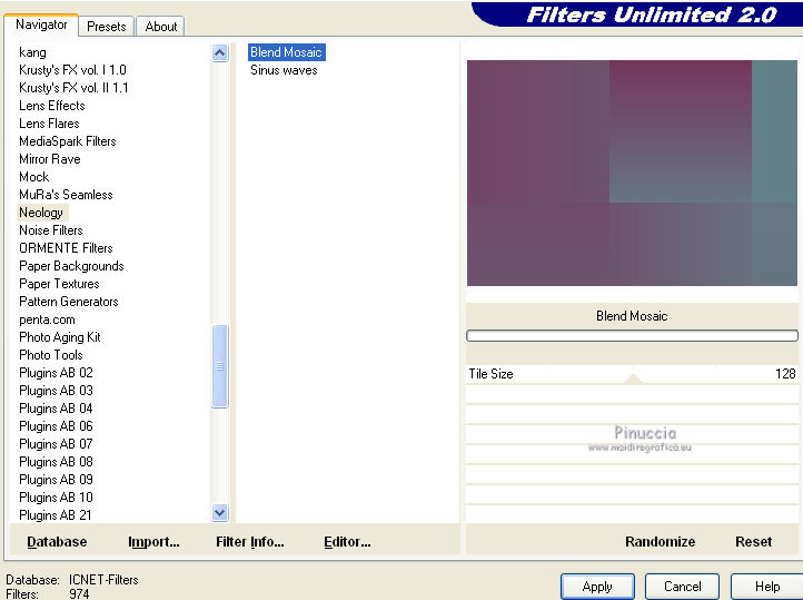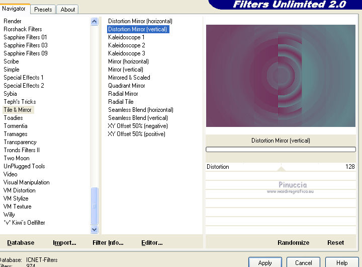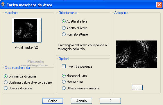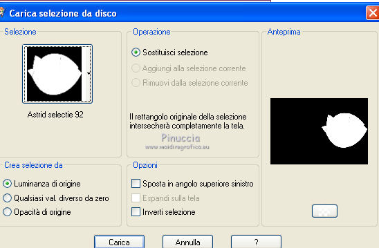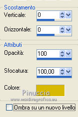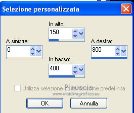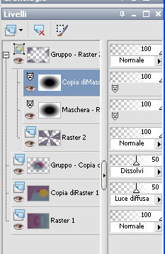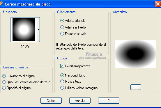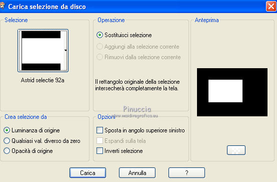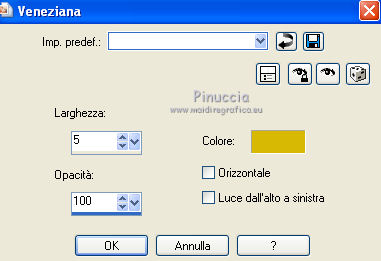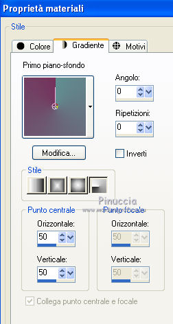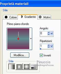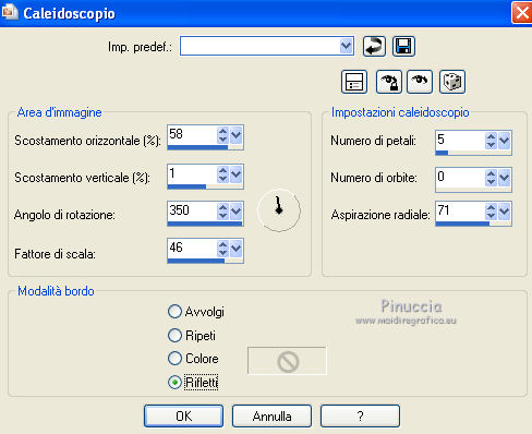 qui puoi trovare qualche risposta ai tuoi dubbi. Se l'argomento che ti interessa non è presente, ti prego di segnalarmelo. Per tradurre questo tutorial ho usato PSP X. Questo tutorial è una creazione di ©Araemae e non può essere copiato su altri siti nè essere offerto per il download. Lo stesso vale per la mia traduzione. Il materiale viene da vari gruppi di condivisione. Il copyright appartiene ai rispettivi autori. Grazie ai creatori dei tubes che mettono a disposizione il loro lavoro in vari gruppi di condivisione. Occorrente: Materiale qui Per il tube grazie K@rine Filtri: consulta, se necessario, la mia sezione filtri qui Filters Unlimited 2.0 qui Neology - Blend Mosaic qui Flaming Pear - Flexify 2 qui AP Lines - Lines SilverLining qui ![]() Metti le selezioni nella cartella Selezioni. Metti le maschere nella cartella Maschere. se stai usando altri colori, sei libero di sperimentare le modalità di miscelatura più adatte 1. Scegli due colori dal tuo tube, per il mio esempio colore di primo piano 609091, colore di sfondo #75325b. ![]() Passa il colore di primo piano a Gradiente, stile Radiale, con i seguenti settaggi. ![]() 2. Apri una nuova immagine trasparente 800 x 550 pixels, e riempila con il gradiente.3. Effetti>Plugins>Filters Unlimited 2.0 - Neology - Blend Mosaic. ![]() Effetti>Effetti di bordo>Aumenta. 4. Livelli>Duplica, e attiva il livello sottostante dell'originale. 5. Effetti>Plugins>Filters Unlimited 2.0 - Tile & Mirror - Distortion Mirror(vertical). ![]() 6. Attiva il livello superiore. Effetti>Plugins>Flaming Pear - Flexify. ![]() Cambia la modalità di miscelatura di questo livello in Luce diffusa, e abbassa l'opacità al 50%. 6. Livelli>Duplica. Livelli>Carica/Salva maschera>Carica maschera da disco. Cerca e carica la maschera 20-20. ![]() Livelli>Duplica. ![]() Livelli>Unisci>Unisci gruppo. Cambia la modalità di miscelatura di questo livello in Dissolvi. 7. Attiva il livello centrale. ![]() 8. Selezione>Carica/Salva selezione>Carica selezione da disco. Cerca e carica la selezione "Astrid selectie 92". ![]() 9. Effetti>Effetti di trama>Veneziana, scegli un colore in sintonia con i tuoi; per l'esempio #d7b903. ![]() Selezione>Deseleziona. 10. Attiva il livello superiore. Livelli>Nuovo livello raster. 11. Attiva lo strumento Selezione ![]() clicca sull'icona Selezione personalizzata ![]() e imposta i seguenti settaggi. ![]() 12. Cambia i settaggi del gradiente. ![]() Riempi la selezione con il gradiente.Selezione>Deseleziona. 13. Effetti>Effetti di riflesso>Caleidoscopio. ![]() 14. Livelli>Carica/Salva maschera>Carica maschera da disco. Carica nuovamente la maschera 20-20, questa volta Inverti trasparenza selezionato. ![]() Livelli>Duplica. ![]() Livelli>Unisci>Unisci gruppo. 15. Effetti>Effetti 3D>Sfalsa ombra, con il colore usato per l'effetto Veneziana. ![]() 16. Livelli>Nuovo livello raster. 17. Selezione>Carica/Salva selezione>Carica selezione da disco. Cerca e carica la selezione "Astrid selectie 92a". ![]() Riempi la selezione con il colore di primo piano.18. Selezione>Modifica>Contrai - 5 pixels. Premi sulla tastiera il tasto CANC. Selezione>Deseleziona. 19. Effetti>Effetti di riflesso>Caleidoscopio, con i settaggi precedenti. ![]() 20. Effetti>Effetti 3D>Sfalsa ombra, con i settaggi precedenti. ![]() 21. Livelli>Nuovo livello raster. Riempi con il colore di primo piano.22. Livelli>Carica/Salva maschera>Carica maschera da disco. Cerca e carica la maschera "Astrid masker 92". ![]() Livelli>Unisci>Unisci gruppo. 23. Apri il tube "k@rine_dreams_Pretty_Face_2229_Avril_2012" e vai a Modifica>Copia. non chiuderlo perchè ti servirà ancora Torna al tuo lavoro e vai a Modifica>Incolla come nuovo livello. Immagine>Ridimensiona, all'80%, tutti i livelli non selezionato. Immagine>Rifletti. 24. Livelli>Carica/Salva maschera>Carica maschera da disco. Carica nuovamente la maschera 20-20. ![]() Livelli>Unisci>Unisci gruppo. Sposta il tube un po' più a sinistra e in basso.![]() 25. Livelli>Unisci>Unisci visibile. 26. Livelli>Duplica. Immagine>Ridimensiona, all'85%, tutti i livelli non selezionato. 27. Effetti>Plugins>Filters Unlimited 2.0 - Convolution Filters - Emboss (light). ![]() 28. Effetti>Plugins>AP Lines - Lines SilverLining. ![]() 29. Apri "Astrid deco 92" e vai a Modifica>Copia. Torna al tuo lavoro e vai a Modifica>Incolla come nuovo livello. 30. Attiva nuovamente il tube "k@rine_dreams_Pretty_Face_2229_Avril_2012" e vai a Modifica>Copia. Torna al tuo lavoro e vai a Modifica>Incolla come nuovo livello. Immagine>Ridimensiona, all'85%, tutti i livelli non selezionato. Spostalo a destra.31. Effetti>Effetti 3D>Sfalsa ombra, con il colore nero. ![]() 32. Apri "Astrid Tekst 92" e vai a Modifica>Copia. Torna al tuo lavoro e vai a Modifica>Incolla come nuovo livello. Spostalo come nel mio esempio.33. Attiva il livello inferiore. Regola>Sfocatura>Sfocatura gaussiana - raggio 5. ![]() 34. Immagine>Aggiungi bordatura, 1 pixel, simmetriche, con il colore nero. 35. Aggiungi il tuo nome e/o il tuo watermark su un nuovo livello. 36. Livelli>Unisci>Unisci tutto e salva in formato jpg. ![]() Se hai problemi o dubbi, o trovi un link non funzionante, o anche soltanto per un saluto, scrivimi. 13 Maggio 2012 |