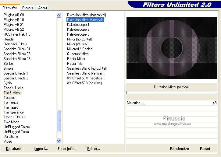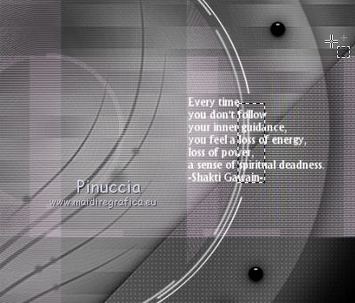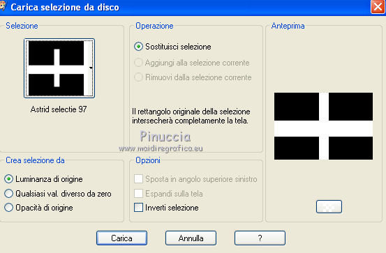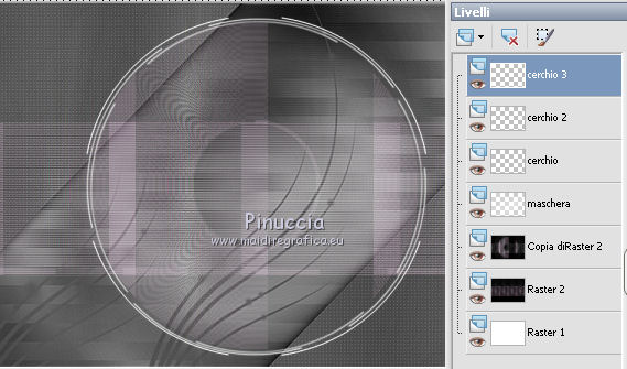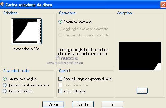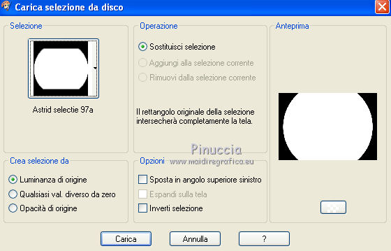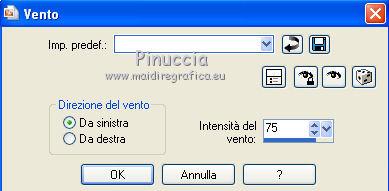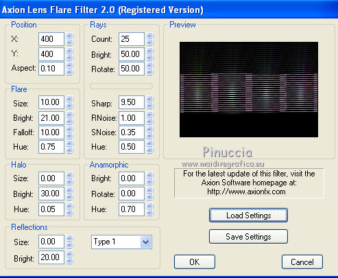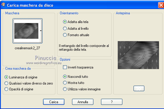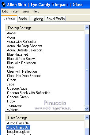 qui puoi trovare qualche risposta ai tuoi dubbi. Se l'argomento che ti interessa non è presente, ti prego di segnalarmelo. Per tradurre questo tutorial ho usato PSP X. Questo tutorial è una creazione di ©Araemae e non può essere copiato su altri siti nè essere offerto per il download. Lo stesso vale per la mia traduzione. Il materiale viene da vari gruppi di condivisione. Il copyright appartiene ai rispettivi autori. Grazie ai creatori dei tubes che mettono a disposizione il loro lavoro in vari gruppi di condivisione. Occorrente: Materiale qui Per il tube grazie Annelies Per la maschera grazie Crealine. Filtri: consulta, se necessario, la mia sezione filtri qui Filters Unlimited 2.0 qui Axion - Lens Flare qui Alien Skin Eye Candy 5 Impact qui ![]() Metti il preset Astrid_Glass97 nella cartella del filtro Alien Skin Eye Candy 5 Impact>Settings>Glass. Doppio clic sul file e il preset sarà automaticamente copiato nella cartella corretta. Metti le selezioni nella cartella Selezioni. Metti la maschera nella cartella Maschere. se stai usando altri colori, sei libero di sperimentare le modalità di miscelatura più adatte 1. Imposta il colore di primo piano con un colore chiaro, e il colore di sfondo con un colore scuro. Questi i miei colori. ![]() Apri una nuova immagine trasparente 800 x 550 pixels, e riempila con il colore di sfondo.2. Effetti>Plugins>Axion - Lens Flare. ![]() 3. Livelli>Duplica. Effetti>Plugins>Filters Unlimited 2.0 - Tile & Mirror - Distortion Mirror (vertical). ![]() Abbassa l'opacità di questo livello al 45%. 4. Livelli>Nuovo livello raster. Riempi con il colore di primo piano.5. Livelli>Carica/Salva maschera>Carica maschera da disco. Cerca e carica la maschera "crealinemask2_27". ![]() Livelli>Unisci>Unisci gruppo. 6. Attiva lo strumento Selezione , cerchio,![]() Traccia un cerchio intorno a quello esistente. ![]() Riempi il cerchio con il colore di primo piano.Selezione>Modifica>Contrai - 2 pixels. Premi sulla tastiera il tasto CANC. Selezione>Deseleziona. 7. Selezione>Carica/Salva selezione>Carica selezione da disco. Cerca e carica la selezione "Astrid selectie 97". ![]() Premi sulla tastiera il tasto CANC. Selezione>Deseleziona. 8. Livelli>Duplica. Immagine>Ridimensiona, al 98%, tutti i livelli non selezionato. 9. Immagine>Ruota per gradi - 25 gradi a sinistra. ![]() 10. Livelli>Duplica. Immagine>Ridimensiona, al 98%, tutti i livelli non selezionato. Immagine>Ruota per gradi - 25 gradi a sinistra. Dovresti avere questo. ![]() 11. Livelli>Unisci>Unisci giù - 2 volte. 12. Livelli>Nuovo livello raster. Selezione>Carica/Salva selezione>Carica selezione da disco. Cerca e carica la selezione "Astrid selectie 97a". ![]() 13. Effetti>Effetti 3D>Sfalsa ombra, con il colore di sfondo. ![]() Selezione>Deseleziona. 14. Livelli>Nuovo livello raster. Selezione>Carica/Salva selezione>Carica selezione da disco. Cerca e carica la selezione "Astrid selectie 97b". ![]() Riempi la selezione con il colore di sfondo.Selezione>Deseleziona. 15. Effetti>Effetti di distorsione>Vento - da destra, intensità 100. ![]() 16. Livelli>Nuovo livello raster. Selezione>Carica/Salva selezione>Carica selezione da disco. Cerca e carica la selezione "Astrid selectie 97c". ![]() Riempi la selezione con il colore di sfondo.Selezione>Deseleziona. 17. Effetti>Effetti di distorsione>Vento - da sinistra, intensità 100. ![]() 18. Livelli>Nuovo livello raster. Selezione>Carica/Salva selezione>Carica selezione da disco. Cerca e carica la selezione "Astrid selectie 96d". ![]() Riempi la selezione con il colore di primo piano.Effetti>Effetti di distorsione>Vento - da sinistra, intensità 75. ![]() 19. Livelli>Nuovo livello raster. Selezione>Carica/Salva selezione>Carica selezione da disco. Cerca e carica la selezione "Astrid selectie 96e". ![]() Riempi la selezione con il colore di sfondo.Selezione>Deseleziona. 20. Livelli>Duplica, e attiva il livello sottostante dell'originale. Regola>Sfocatura>Sfocatura gaussiana - raggio 10. ![]() 21. Attiva il livello superiore. Effetti>Plugins>Alien Skin Eye Candy 5 Impact - Glass, seleziona il preset Astrid Glass 97 e ok. ![]() 22. Apri "Astrid tekst 97" e vai a Modifica>Copia. Torna al tuo lavoro e vai a Modifica>Incolla come nuovo livello. Spostalo a destra, come nel mio esempio.23. Attiva il livello dei cerchi, e cancella la parte dei cerchi sotto il testo.se preferisci, puoi usare lo strumento Selezione e premere il tasto CANC![]() 24. Attiva il livello superiore. Apri il tube "Alies 837-woman-09042012" e vai a Modifica>Copia. Torna al tuo lavoro e vai a Modifica>Incolla come nuovo livello. Immagine>Ridimensiona, al 75%, tutti i livelli non selezionato. Posiziona correttamente il tube.25. Effetti>Effetti 3D>Sfalsa ombra, con il colore di sfondo. ![]() 26. Immagine>Aggiungi bordatura, 1 pixel, simmetriche, con il colore di primo piano. Immagine>Aggiungi bordatura, 10 pixels, simmetriche, con il colore di sfondo. 27. Aggiungi il tuo nome e/o il tuo watermark su un nuovo livello. Livelli>Unisci>Unisci tutto e salva in formato jpg. Per questo esempio ho usato un tube di Castorke. ![]() ![]() Se hai problemi o dubbi, o trovi un link non funzionante, o anche soltanto per un saluto, scrivimi. 8 Giugno 2012 |
