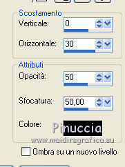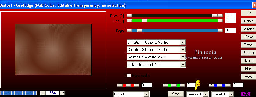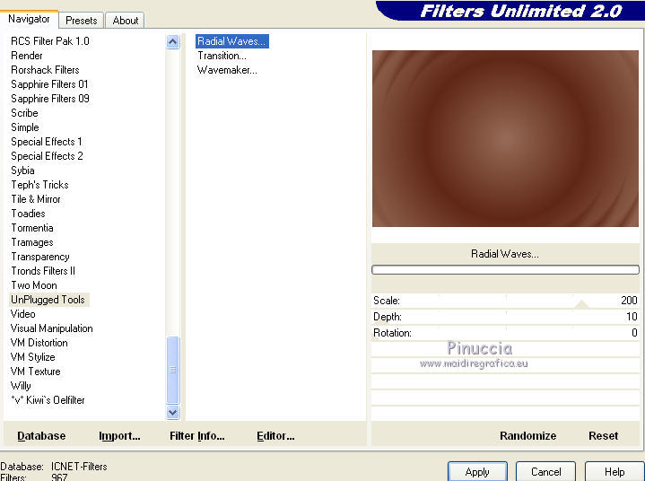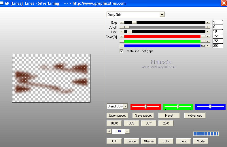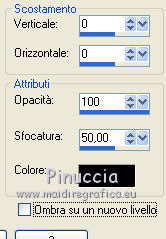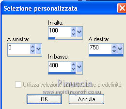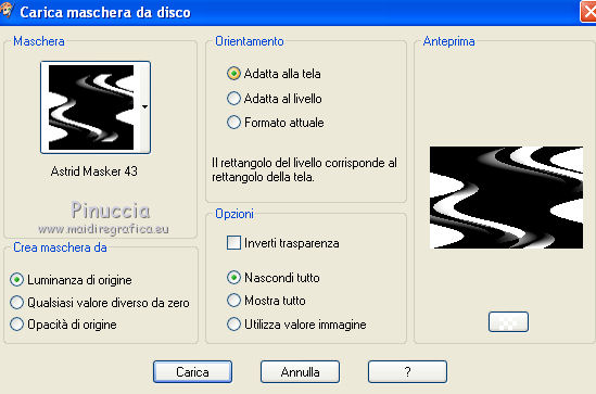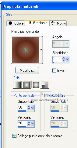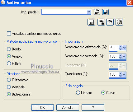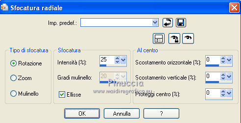 qui puoi trovare qualche risposta ai tuoi dubbi. Se l'argomento che ti interessa non è presente, ti prego di segnalarmelo. Per tradurre questo tutorial ho usato PSP X. Questo tutorial è una creazione di ©Araemae e non può essere copiato su altri siti nè essere offerto per il download. Lo stesso vale per la mia traduzione. Il materiale viene da vari gruppi di condivisione. Il copyright appartiene ai rispettivi autori. Grazie ai creatori dei tubes che mettono a disposizione il loro lavoro in vari gruppi di condivisione. Occorrente: Materiale qui Per il tube della donna grazie JHanna Filtri: consulta, se necessario, la mia sezione filtri qui Filters Unlimited 2.0 qui Unplugged Tools qui FM Tile Tools - Blend Emboss qui Simple - Zoom out and Flip qui AP [Lines] - Lines SilverLining qui AP 16 [Power Blend] - Distort-GridEdge qui ![]() Metti la maschera nella cartella Maschere. se stai usando altri colori, sei libero di sperimentare le modalità di miscelatura più adatte 1. Scegli due colori dal tuo tube, imposta il colore di primo piano con il colore chiaro, e il colore di sfondo con il colore scuro. ![]() Passa il colore di primo piano a Gradiente, con i seguenti settaggi. ![]() Apri una nuova immagine trasparente 750 x 500 pixels, e riempila con il gradiente.2. Effetti>Plugins>Filters Unlimited 2.0 - Unplugged Tools - Radial Waves. ![]() 3. Effetti>Effetti di immagine>Motivo unico. ![]() 4. Effetti>Plugins>AP 16 [Power Blend] - Distort-GridEdge. ![]() 5. Effetti>Plugins>FM Tile Tools - Blend Emboss. ![]() 6. Livelli>Nuovo livello raster. Riempi il livello con il colore di primo piano.Livelli>Carica/Salva maschera>Carica maschera da disco. Cerca e carica la maschera "Astrid Masker 43". ![]() Livelli>Unisci>Unisci gruppo. 7. Attiva lo strumento Puntatore ![]() deformazione se stai usando PSP 9,oppure premi sulla tastiera il tasto D (valido per tutte le versioni), usando i nodi centrali in alto e in basso, porta l'immagine tra 100 e 400 pixels. ![]() Premi il tasto M per liberarti dalla griglia dello strumento. Cambia la modalità di miscelatura di questo livello in Moltiplica. 8. Effetti>Effetti 3D>Sfalsa ombra, con il colore di sfondo, ombra su nuovo livello selezionato. ![]() 9. Effetti>Plugins>AP [Lines] - Lines Silverlining. Seleziona Dotty Grid con i seguenti settaggi. ![]() 10. Attiva il livello superiore. Effetti>Effetti 3D>Sfalsa ombra, con i settaggi precedenti, ma togli la selezione a Ombra su nuovo livello. ![]() 11. Attiva lo strumento Penna ![]() Linea di stile Punto ![]() Tenendo premuto il tasto della maiuscola per avere una linea perfettamente diritta, traccia una linea a 100 pixels. ![]() Livelli>Converti in livello raster. 12. Livelli>Duplica. Immagine>Capovolgi. Livelli>Unisci>Unisci giù. Livelli>Duplica. Effetti>Plugins>Simple - Zoom out and Flip. Attiva lo strumento Gomma ![]() e cancella le due linee centrali. ![]() Livelli>Unisci>Unisci giù. 13. Apri il tube "Jhanna_518_tube" e vai a Modifica>Copia. Torna al tuo lavoro e vai a Modifica>Incolla come nuovo livello. Non spostarlo, lascialo come sta. Attiva lo strumento Selezione ,clicca sull'icona Selezione personalizzata ![]() e imposta i seguenti settaggi: ![]() Premi sulla tastiera il tasto CANC. Selezione>Inverti. 14. Regola>Sfocatura>Sfocatura radiale. ![]() Selezione>Deseleziona. Effetti>Effetti di bordo>Aumenta - 2 volte. Cambia la modalità di miscelatura di questo livello in Moltiplica. Livelli>Disponi>Sposta giù. 15. Apri una nuova immagine trasparente 150 x 160 pixels, e riempila con il colore di primo piano.Selezione>Seleziona tutto. Selezione>Modifica>Contrai - 1 pixel. Premi sulla tastiera il tasto CANC. Mantieni selezionato. 16. Livelli>Nuovo livello raster. Riempi con il colore di primo piano.Selezione>Modifica>Contrai - 25 pixels. Premi sulla tastiera il tasto CANC. Abbassa l'opacità di questo livello al 50%. Mantieni selezionato. 17. Livelli>Nuovo livello raster. Riempi con il colore di primo piano.Selezione>Modifica>Contrai - 1 pixel. Riempi con il colore di sfondo.Mantieni ancora selezionato. 18. Attiva nuovamente il tube. Attiva lo strumento Selezione ,e seleziona una parte del tube. Modifica>Copia. Torna alla piccola immagine con la selezione attiva, e vai a Modifica>Incolla come nuovo livello. Se necessario, posiziona correttamente la parte del tube nell'area selezionata.Selezione>Inverti. Premi sulla tastiera il tasto CANC. Selezione>Deseleziona. Abbassa l'opacità di questo livello al 50%. Livelli>Unisci>Unisci tutto. Modifica>Copia. 19. Torna al tuo lavoro, attiva il livello superiore e vai a Modifica>Incolla come nuovo livello. 20. Effetti>Effetti di immagine>Scostamento. ![]() 21. Livelli>Duplica. Immagine>Capovolgi. Livelli>Unisci>Unisci giù. 22. Livelli>Duplica. Immagine>Ridimensiona, all'80%, tutti i livelli non selezionato. 23. Attiva per l'ultima volta il tube "JHanna_517_tube". Selezione>Deseleziona. Modifica>Copia. Torna al tuo lavoro e vai a Modifica>Incolla come nuovo livello. Spostalo a sinistra.Effetti>Effetti 3D>Sfalsa ombra, con il colore nero. ![]() 24. Apri il tube "Astrid 43 tekst" e vai a Modifica>Copia. Torna al tuo lavoro e vai a Modifica>Incolla come nuovo livello. Livelli>Disponi>Sposta giù. 25. Livelli>Unisci>Unisci visibile. Livelli>Duplica. Immagine>Ridimensiona, all'80%, tutti i livelli non selezionato. Effetti>Effetti 3D>Sfalsa ombra, con il colore nero. ![]() Modifica>Ripeti Sfalsa ombra. 26. Attiva il livello inferiore. Effetti>Effetti di trama>Nappa. ![]() 27. Immagine>Aggiungi bordatura, 1 pixel, simmetriche, con il colore di sfondo. 28. Aggiungi il tuo nome e/o il tuo watermark su un nuovo livello. Livelli>Unisci>Unisci tutto e salva in formato jpg. ![]() Se hai problemi o dubbi, o trovi un link non funzionante, o anche soltanto per un saluto, scrivimi. 1 Maggio 2012 |