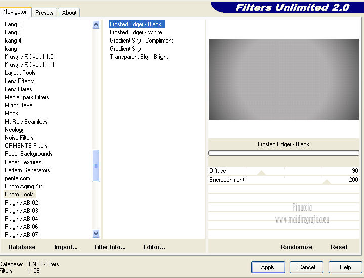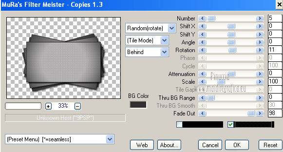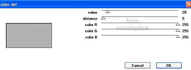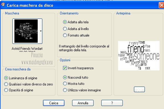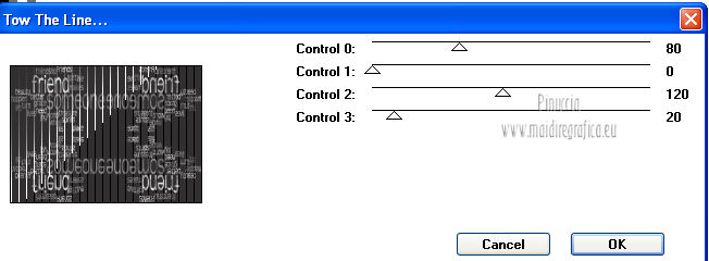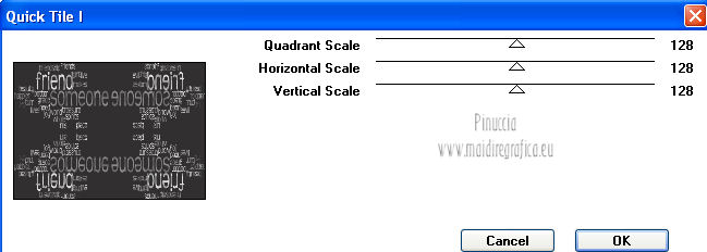 qui puoi trovare qualche risposta ai tuoi dubbi. Se l'argomento che ti interessa non è presente, ti prego di segnalarmelo. Per tradurre questo tutorial ho usato PSP X. Questo tutorial è una creazione di ©Araemae e non può essere copiato su altri siti nè essere offerto per il download. Lo stesso vale per la mia traduzione. Il materiale viene da vari gruppi di condivisione. Il copyright appartiene ai rispettivi autori. Grazie ai creatori dei tubes che mettono a disposizione il loro lavoro in vari gruppi di condivisione. Occorrente: Materiale qui Il tube è di Vicky. Filtri: consulta, se necessario, la mia sezione filtri qui Mura's Meister - Copies qui Phototools - Frosted Edger-Black qui Eye Candy 3.1 - Drop Shadow qui Penta.com - Color Dot qui Tramages - Tow the line qui Graphics Plus - Quick Tile 1 qui Filters Unlimited 2.0 qui ![]() Metti la maschera nella cartella Maschere. se stai usando altri colori, sei libero di sperimentare le modalità di miscelatura più adatte 1. Scegli due colori dal tuo tube. Imposta il colore chiaro come colore di primo piano, e il colore scuro come colore di sfondo. Apri una nuova immagine trasparente 700 x 500 pixels, e riempila con il colore chiaro.2. Livelli>Nuovo livello raster. Riempi con il colore scuro.3. Livelli>Carica/Salva maschera>Carica maschera da disco. Cerca e carica la maschera "Astrid Friends Wordart 08-08-2010". ![]() Livelli>Unisci>Unisci gruppo. 4. Effetti>Plugins>Graphics Plus - Quick Tile 1. ![]() 5. Livelli>Nuovo livello raster. Attiva lo strumento Selezione ,clicca sull'icona Selezione personalizzata ![]() e imposta i seguenti settaggi: ![]() Riempi con il colore scuro.Selezione>Modifica>Contrai - 2 pixels. Riempi con il colore chiaro.Mantieni selezionato. 6. Effetti>Effetti di trama>Veneziana - colore nero. ![]() 7. Effetti>Plugins>Penta Com - Color Dot. ![]() 8. Effetti>Plugins>Filters Unlimited 2.0 - Phototools - Frosted Edger-Black. ![]() 9. Effetti>Plugins>Eye Candy 3.1 - DropShadow - colore nero. ![]() Selezione>Deseleziona. 10. Effetti>Plugins>Mura's Meister - Copies. ![]() 11. Apri il tube "VG-stack_friends-feb 17-2009" e vai a Modifica>Copia. Torna al tuo lavoro e vai a Modifica>Incolla come nuovo livello. Effetti>Effetti di immagine>Scostamento. ![]() Effetti>Effetti 3D>Sfalsa ombra, con il colore nero. ![]() 12. Attiva il livello della maschera. Effetti>Plugins>Tramages - Tow the line. ![]() 13. Immagine>Aggiungi bordatura, 1 pixel, simmetriche, con il colore chiaro. Immagine>Aggiungi bordatura, 50 pixels, simmetriche, con il colore scuro. 14. Aggiungi il tuo nome e/o il tuo watermark su un nuovo livello. Livelli>Unisci>Unisci tutto. Se vuoi: Immagine>Ridimensiona, all'80% e salva in formato jpg. ![]() Se hai problemi o dubbi, o trovi un link non funzionante, o anche soltanto per un saluto, scrivimi. 10 Agosto 2012 |