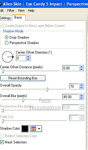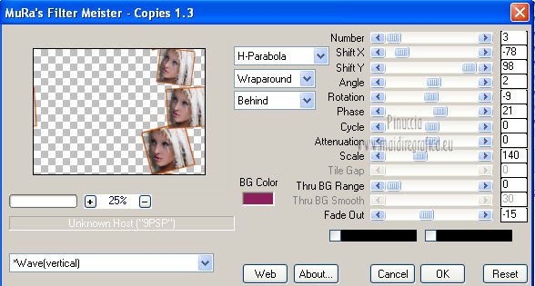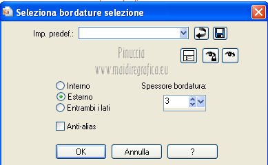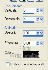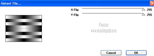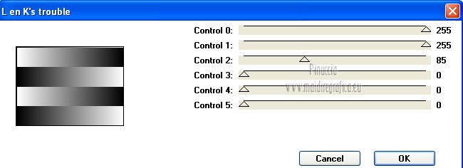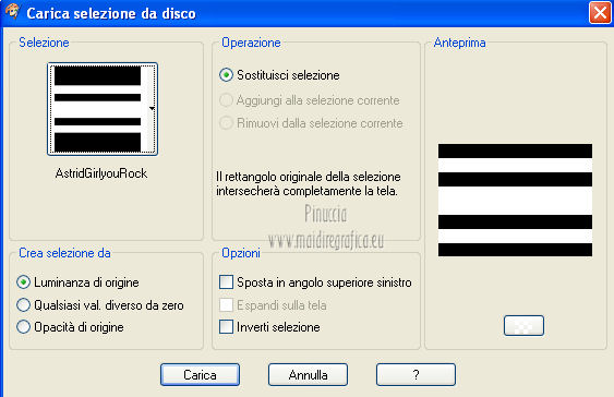 qui puoi trovare qualche risposta ai tuoi dubbi. Se l'argomento che ti interessa non è presente, ti prego di segnalarmelo. Per tradurre questo tutorial ho usato PSP X. Questo tutorial è una creazione di ©Araemae e non può essere copiato su altri siti nè essere offerto per il download. Lo stesso vale per la mia traduzione. Il materiale viene da vari gruppi di condivisione. Il copyright appartiene ai rispettivi autori. Grazie ai creatori dei tubes che mettono a disposizione il loro lavoro in vari gruppi di condivisione. Occorrente: Materiale qui Per il tube grazie Gerry Filtri: consulta, se necessario, la mia sezione filtri qui L&K's Trouble qui Alien Skin Eye Candy 5 Impact qui Mura's Meister - Copies qui VM Toolbox qui ![]() se stai usando altri colori, sei libero di sperimentare le modalità di miscelatura più adatte Metti la selezione nella cartella Selezioni. Imposta il colore di primo piano con #808080. Apri una nuova immagine trasparente 750 x 550 pixels, e riempila con il colore di primo piano.Livelli>Duplica, e attiva il livello sottostante dell'originale. Effetti>Effetti di trama>Veneziana. ![]() Ripeti l'Effetto Veneziana, selezionando Orizzontale. ![]() 2. Attiva il livello superiore. Effetti>Plugins>L&K landksiteofwonders - L&K Trouble. ![]() Rinomina questo livello "Trouble 1". Effetti>Effetti di bordo>Aumenta. 3. Effetti>Plugins>VM Toolbox - Instant Tile. ![]() 4. Livelli>Duplica, e rinomina questo livello "trouble 2". 5. Rimani posizionato sul livello "trouble 2". Selezione>Carica/Salva selezione>Carica selezione da disco. Cerca e carica la selezione "AstridGirlyourock". ![]() Selezione>Inverti. Premi sulla tastiera il tasto CANC. Selezione>Inverti. Effetti>Effetti 3D>Sfalsa ombra, con il colore nero. ![]() Selezione>Deseleziona. 6. Attiva il livello "trouble 1". Abbassa l'opacità di questo livello al 50%. Effetti>Effetti geometrici>Cerchio. ![]() Regola>Sfocatura>Sfocatura gaussiana - raggio 10. ![]() 7. Attiva il livello superiore. Apri il tube "Gerry Lady 140" e vai a Modifica>Copia. Torna al tuo lavoro e vai a Modifica>Incolla come nuovo livello. Spostalo nell'angolo in basso a sinistra.Effetti>Plugins>Alien Skin Eye Candy 5 Impact - Perspective Shadow. ![]() 8. Livelli>Duplica. Immagine>Rifletti. Attiva lo strumento Selezione ![]() clicca sull'icona Selezione personalizzata ![]() e imposta i seguenti settaggi. ![]() La selezione deve comprendere la testa del tube. Se stai usando un altro tube, dovrai regolarti di conseguenza, o posizionando correttamente il tube nella selezione e/o ridimensionando il tube. ![]() Selezione>Inverti. Premi sulla tastiera il tasto CANC. Di nuovo Selezione>Inverti. Selezione>Modifica>Seleziona bordature selezione. ![]() Scegli un colore dal tuo tube e impostalo come colore di primo piano. Riempi la selezione con il colore di primo piano.Selezione>Deseleziona. 9. Effetti>Plugins>Mura's Meister - Copies. ![]() Attiva lo strumento Gomma ![]() e cancella il piccolo pezzo a sinistra, effetto del filtro precedente. ![]() Effetti>Plugins>Alien Skin Eye Candy 5 Impact - Perspective Shadow, con i settaggi precedenti. 10. Apri "Girl you rock" e vai a Modifica>Copia. Torna al tuo lavoro e vai a Modifica>Incolla come nuovo livello. Spostalo in alto, come nel mio esempio.Effetti>Plugins>Alien Skin Eye Candy 5 Impact - Perspective Shadow, con i settaggi precedenti. 11. Immagine>Aggiungi bordatura, 2 pixels, simmetriche, con il colore di primo piano. Immagine>Aggiungi bordatura, 5 pixels, simmetriche, con il colore nero. Immagine>Aggiungi bordatura, 1 pixel, simmetriche, con il colore di primo piano. Immagine>Aggiungi bordatura, 35 pixels, simmetriche, con il colore nero. Immagine>Aggiungi bordatura, 1 pixel, simmetriche, con il colore di primo piano. Immagine>Aggiungi bordatura, 5 pixels, simmetriche, con il colore nero. Immagine>Aggiungi bordatura, 2 pixels, simmetriche, con il colore di primo piano. 12. Aggiungi il tuo nome e/o il tuo watermark su un nuovo livello. Livelli>Unisci>Unisci tutto e salva in formato jpg. ![]() Se hai problemi o dubbi, o trovi un link non funzionante, o anche soltanto per un saluto, scrivimi. 10 Agosto 2012 |