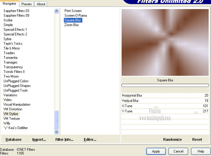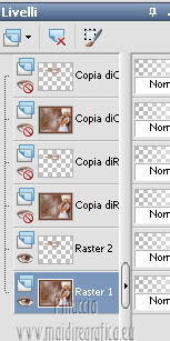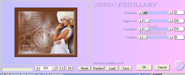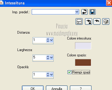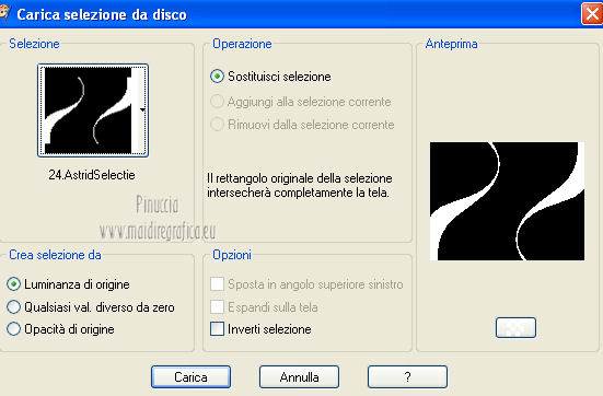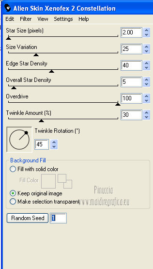qui puoi trovare qualche risposta ai tuoi dubbi. Se l'argomento che ti interessa non è presente, ti prego di segnalarmelo. Per tradurre questo tutorial ho usato PSP X. Questo tutorial è una creazione di ©Araemae e non può essere copiato su altri siti nè essere offerto per il download. Lo stesso vale per la mia traduzione. Il materiale viene da vari gruppi di condivisione. Il copyright appartiene ai rispettivi autori. Grazie ai creatori dei tubes che mettono a disposizione il loro lavoro in vari gruppi di condivisione. Occorrente: Materiale qui Il tube della donna è di Annelies Il tube "1228324179_divers" è di Nikita Filtri: consulta, se necessario, la mia sezione filtri qui VM Stylize qui Filters Unlimited 2.0 qui FM Tile Tools - Blend Emboss qui Xero - Fritillary qui Alien Skin Eye Candy 5 Impact qui Alien Skin Xenofex 2.0 - Constellation qui Animation Shop 3.1 qui ![]() Metti la maschera nella cartella Maschere. Metti la selezione nella cartella Selezioni. se stai usando altri colori, sei libero di sperimentare le modalità di miscelatura più adatte 1. Scegli due colori dal tube. Imposta il colore di primo piano con il colore scuro, e il colore di sfondo con il colore chiaro. ![]() Apri una nuova immagine trasparente 650 x 500 pixels, e riempila con il colore di primo piano.2. Livelli>Nuovo livello raster. Passa il colore di primo piano a Gradiente. ![]() Riempi il livello con il gradiente.3. Effetti>Plugins>Filters Unlimited 2.0 - VM Stylize - Square Blur. ![]() Effetti>Effetti di bordo>Aumenta - 2 volte. 4. Livelli>Carica/Salva maschera>Carica maschera da disco. Cerca e carica la maschera 20-20. ![]() Livelli>Unisci>Unisci gruppo. 5. Effetti>Effetti di immagine>Motivo unico. ![]() 6. Effetti>Plugins>FM Tile Tools - Blend Emboss, con i settaggi standard. ![]() 7. Livelli>Nuovo livello raster. Selezione>Carica/Salva selezione>Carica selezione da disco. Cerca e carica la selezione "24.Astrid selectie". ![]() Riempi la selezione con il gradiente.Selezione>Deseleziona. 8. Regola>Sfocatura>Sfocatura gaussiana - raggio 5. ![]() Effetti>Effetti di trama>Intessitura. colore intessitura: colore di sfondo - riempi spazi: colore di primo piano. ![]() Effetti>Effetti 3D>Sfalsa ombra, con il colore di primo piano. ![]() Modifica>Ripeti Sfalsa ombra. 9. Livelli>Nuovo livello raster. Attiva lo strumento Clonazione ![]() ![]() Apri il tube "Alies 349-wrouwen-2011201". Clicca con il tasto destro del mouse sulla testa del tube. ![]() Torna al tuo lavoro. Clicca con il tasto sinistro del mouse in alto a sinistra. ![]() Livelli>Disponi>Sposta giù - 2 volte. 10. Apri il tube "24.Astrid" e vai a Modifica>Copia. Torna al tuo lavoro e vai a Modifica>Incolla come nuovo livello. Spostalo nell'angolo in alto a sinistra.![]() Livelli>Duplica. Immagine>Rifletti. Immagine>Capovolgi. Livelli>Unisci>Unisci giù. 11. Attiva il livello superiore. Apri il tube "1228324179_Divers" e vai a Modifica>Copia. Torna al tuo lavoro e vai a Modifica>Incolla come nuovo livello. Immagine>Ridimensiona, all'80%, tutti i livelli non selezionato. Spostalo nell'angolo in basso a sinistra.Cambia la modalità di miscelatura di questo livello in Luce netta, e abbassa l'opacità al 30%. 12. Apri il tube "Alies 349-wrouwen-2011201" e vai a Modifica>Copia. Torna al tuo lavoro e vai a Modifica>Incolla come nuovo livello. Immagine>Ridimensiona, all'80%, tutti i livelli non selezionato. Immagine>Rifletti. Spostalo contro il bordo a destra.Effetti>Plugins>Alien Skin Eye Candy 5 Impact - Perspective Shadow. Seleziona il preset Drop Shadow Blurry e ok. ![]() 13. Aggiungi il tuo nome e/o il tuo watermark su un nuovo livello. Livelli>Unisci>Unisci tutto. 14. Immagine>Aggiungi bordatura, 1 pixel, simmetriche, con il colore di primo piano. Immagine>Aggiungi bordatura, 2 pixels, simmetriche, con il colore di sfondo. Immagine>Aggiungi bordatura, 10 pixels, simmetriche, con il colore di primo piano. Immagine>Aggiungi bordatura, 2 pixels, simmetriche, con il colore di sfondo. Immagine>Aggiungi bordatura, 25 pixels, simmetriche, con il colore di primo piano. 15. Selezione>Seleziona tutto. Selezione>Modifica>Contrai - 25 pixels. Selezione>Inverti. Effetti>Plugins>Xero - Fritillary. ![]() Effetti>Effetti di bordo>Aumenta. Selezione>Deseleziona. 16. Livelli>Innalza livello di sfondo. Attiva lo strumento Bacchetta magica ![]() ![]() e clicca nei due piccoli bordi chiari per selezionarli. Livelli>Duplica - 2 volte. Attiva il livello inferiore. Effetti>Plugins>Alien Skin Xenofex 2.0 - Constellation. ![]() Attiva il livello della prima copia. Effetti>Plugins>Alien Skin Xenofex 2.0 - Constellation, clicca su Random Seed e ok. Chiudi il livello e attiva il livello della seconda copia. Effetti>Plugins>Alien Skin Xenofex 2.0 - Constellation - clicca su Random Seed e ok. Chiudi il livello. Selezione>Deseleziona. Attiva il livello Raster 1. Apri il tube "24.Astridtekst" e vai a Modifica>Copia. Torna al tuo lavoro e vai a Modifica>Incolla come nuovo livello. Posiziona il testo in alto, come nel mio esempio.Livelli>Duplica - 2 volte. Attiva il livello del testo originale. Effetti>Plugins>Alien Skin Xenofex 2.0 - Constellation. ![]() Attiva il livello della prima copia. Effetti>Plugins>Alien Skin Xenofex 2.0 - Constellation, clicca su Random seed e ok. Chiudi questo livello e attiva il livello della seconda copia. Effetti>Plugins>Alien Skin Xenofex 2.0 - Constellation, clicca su Random Seed e ok. Chiudi questo livello. Per comodità, disponi ogni livello di testo sopra i livelli Raster 1. ![]() Modifica>Copia Unione. Apri Animation Shop e vai a Modifica>Incolla>Incolla come nuova animazione. 18. Torna in PSP. Chiudi i due livelli inferiori e apri i successivi livelli della prima copia. ![]() Modifica>Copia Unione. Torna in Animation Shop e vai a Modifica>Incolla>Incolla dopo il fotogramma corrente. 19. Di nuovo in PSP. Chiudi i livelli della prima copia e apri i due livelli superiori della seconda copia. Modifica>Copia Unione. In Animation Shop: Modifica>Incolla>