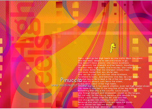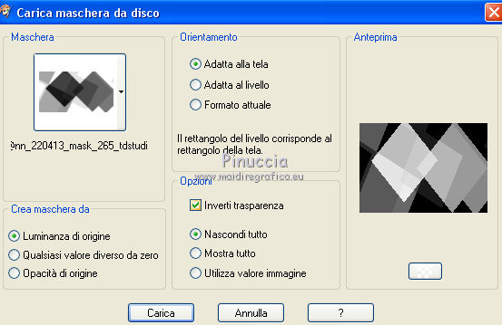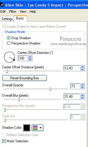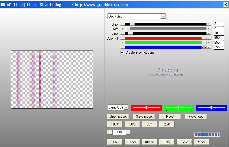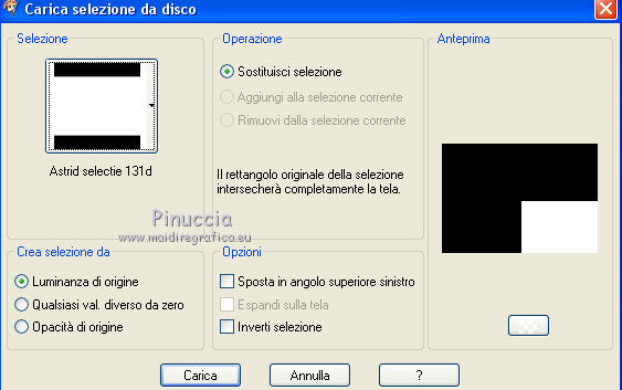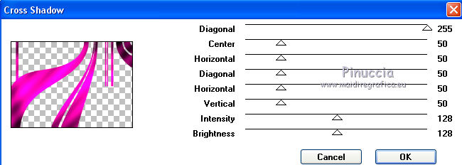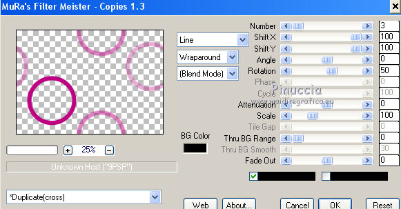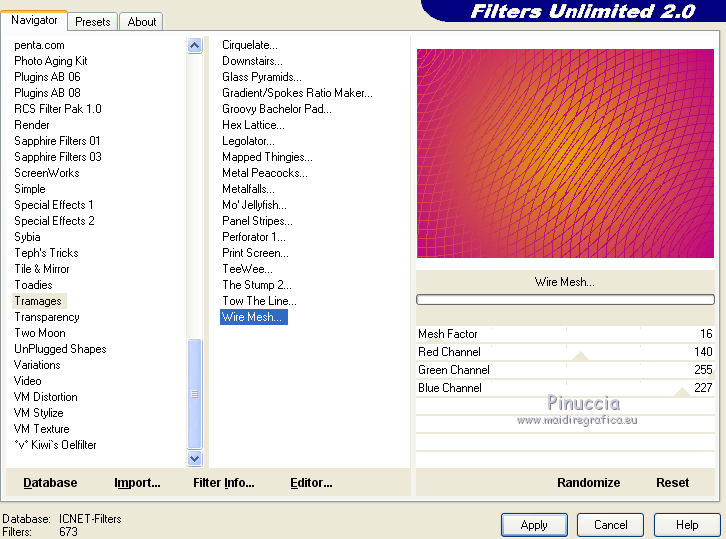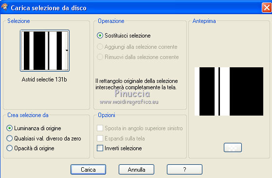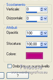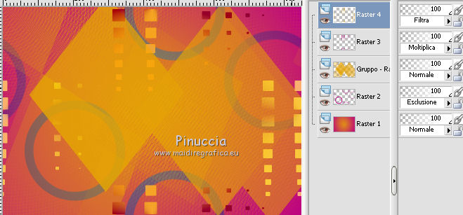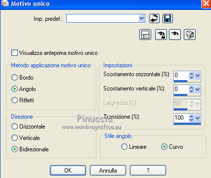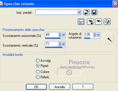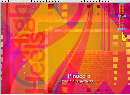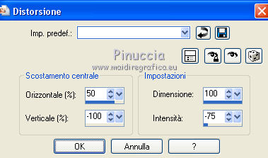 qui puoi trovare qualche risposta ai tuoi dubbi. Se l'argomento che ti interessa non è presente, ti prego di segnalarmelo. Per tradurre questo tutorial ho usato PSP X. Questo tutorial è una creazione di ©Araemae e non può essere copiato su altri siti nè essere offerto per il download. Lo stesso vale per la mia traduzione. Il materiale viene da vari gruppi di condivisione. Il copyright appartiene ai rispettivi autori. Grazie ai creatori dei tubes che mettono a disposizione il loro lavoro in vari gruppi di condivisione. Occorrente: Materiale qui Ti servirà anche la maschera 20-20. Se non hai questa maschera prendila qui Per il tube usato grazie Joanie Filtri: consulta, se necessario, la mia sezione filtri qui Filters Unlimited 2.0 qui Graphics Plus - Cross Shadow qui AP Lines - Lines SilverLining qui Mura's Meister - Copies qui Tramages - Wire Mesh qui Alien Skin Eye Candy 5 Impact - Perspective Shadow qui I filtri Tramage e Graphics plus si possono usare da soli o importati in Filters Unlimited. (come fare vedi qui). Se un filtro fornito appare con questa icona ![]() Metti il preset Cliccando sul file una o due volte (a seconda delle tue impostazioni), automaticamente il preset si installerà nella cartella corretta. perchè uno o due clic vedi qui Metti le selezioni nella cartella Selezioni. Metti le maschere nella cartella Maschere. se stai usando altri colori, sei libero di sperimentare le modalità di miscelatura più adatte 1. Scegli due colori dal tuo tube e imposta il colore di primo piano con un colore chiaro, e il colore di sfondo con un colore scuro. I miei colori (#e5a406; bd0382) ![]() Passa il colore di primo piano a Gradiente, stile Sprazzo di luce. ![]() Apri una nuova immagine trasparente 850 x 600 pixels, e riempila con il gradiente.2. Effetti>Plugins>Filters Unlimited 2.0 - Tramages - Wire Mesh. ![]() 4. Livelli>Nuovo livello raster. Selezione>Carica/Salva selezione>Carica selezione da disco. Cerca e carica la selezione "Astrid selectie 131". ![]() Riempi la selezione con il colore di sfondo.4. Selezione>Modifica>Contrai - 25 pixels. Premi sulla tastiera il tasto CANC ![]() Selezione>Deseleziona. 5. Effetti>Plugins>Mura's Meister - Copies. ![]() Cambia la modalità di miscelatura di questo livello in Esclusione. 6. Riporta il colore di primo piano a Colore. Livelli>Nuovo livello raster. Riempi il livello con il colore di primo piano.7. Livelli>Carica/Salva maschera>Carica maschera da disco. Cerca e carica la maschera @nn_220413_mask_265_tdstudio". ![]() Livelli>Unisci>Unisci gruppo. 8. Livelli>Nuovo livello raster. Selezione>Carica/Salva selezione>Carica selezione da disco. Cerca e carica la selezione "Astrid selectie 131a". ![]() Riempi la selezione con il colore di sfondo.Cambia la modalità di miscelatura di questo livello in Moltiplica. Mantieni selezionato. 9. Livelli>Nuovo livello raster. Riempi il livello con il colore di primo piano.Selezione>Deseleziona. 10. Effetti>Effetti di immagine>Motivo unico. ![]() Cambia la modalità di miscelatura di questo livello in Filtra. ![]() 11. Livelli>Nuovo livello raster. Selezione>Carica/Salva selezione>Carica selezione da disco. Cerca e carica la selezione "Astrid selectie 131b". ![]() Riempi la selezione con il colore di sfondo.Selezione>Deseleziona. 12. Effetti>Effetti di distorsione>Distorsione. ![]() Cambia la modalità di miscelatura di questo livello in Luce diffusa. 13. Livelli>Nuovo livello raster. Selezione>Carica/Salva selezione>Carica selezione da disco. Cerca e carica la selezione "Astrid selectie 131c". ![]() Riempi la selezione con il colore di sfondo.Selezione>Deseleziona. 14. Effetti>Plugins>Graphics Plus - Cross Shadow. ![]() 15. Livelli>Nuovo livello raster. Riempi il livello con il colore di sfondo.16. Livelli>Carica/Salva maschera>Carica maschera da disco. Cerca e carica la maschera "Astrid masker 131". ![]() Livelli>Unisci>Unisci gruppo. Cambia la modalità di miscelatura di questo livello in Sovrapponi, e abbassa l'opacità al 50%. 17. Livelli>Nuovo livello raster. Selezione>Carica/Salva selezione>Carica selezione da disco. Cerca e carica nuovamente la selezione "Astrid selectie 131b". ![]() 18. Effetti>Effetti 3D>Sfalsa ombra, con il colore di sfondo. ![]() Selezione>Deseleziona. 19. Effetti>Plugins>AP Lines - Lines SilverLining - Dotty Grid. ![]() 20. Effetti>Effetti di riflesso>Specchio rotante. ![]() Cambia la modalità di miscelatura di questo livello in Indebolisci. 21. Livelli>Nuovo livello raster. Selezione>Carica/Salva selezione>Carica selezione da disco. Cerca e carica la selezione "Astrid selectie 131d". ![]() Riempi la selezione con il colore di sfondo.Cambia la modalità di miscelatura di questo livello in Sovrapponi, e abbassa l'opacità al 40%. Selezione>Deseleziona. 22. Apri "Astrid tekst 131" e vai a Modifica>Copia. Torna al tuo lavoro e vai a Modifica>Incolla come nuovo livello. Spostalo in basso nell'area della precedente selezione.![]() Cambia la modalità di miscelatura di questo livello in Sovrapponi, e abbassa l'opacità al 50%. 23. Apri "Astrid Deco 131" e vai a Modifica>Copia. Torna al tuo lavoro e vai a Modifica>Incolla come nuovo livello. Spostalo in alto a destra:![]() 24. Immagine>Aggiungi bordatura, 1 pixel, simmetriche, con il colore di primo piano. Immagine>Aggiungi bordatura, 35 pixels simmetriche, con il colore di sfondo. 25. Seleziona il bordo da 35 pixels con la bacchetta magica ![]() Selezione>Inverti. 26. Effetti>Effetti 3D>Sfalsa ombra, colore nero. ![]() Selezione>Deseleziona. 27. Apri il tube "kittys-PLASTIC MARTYR" e vai a Modifica>Copia. Torna al tuo lavoro e vai a Modifica>Incolla come nuovo livello. Immagine>Ridimensiona, all'80%, tutti i livelli non selezionato. Spostalo un po' più in basso e a sinistra.28. Effetti>Plugins>Alien Skin Eye Candy 5 Impact - Perspective Shadow. Seleziona il preset astrid131 e ok. ![]() Questi i settaggi che, in caso di problemi con il preset, puoi impostare manualmente. ![]() 29. Aggiungi il tuo nome e/o il tuo watermark 