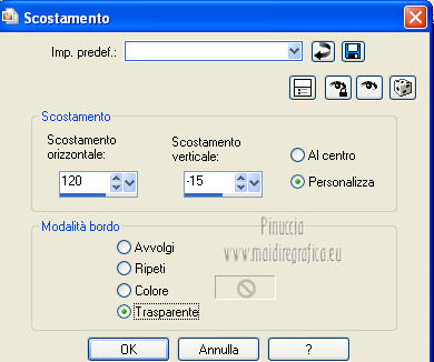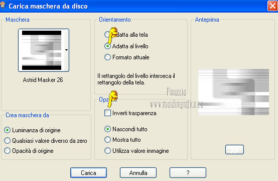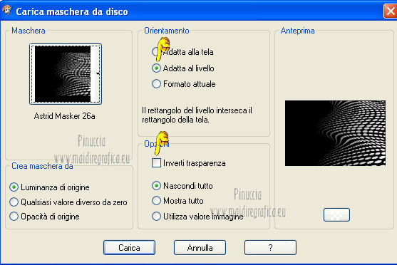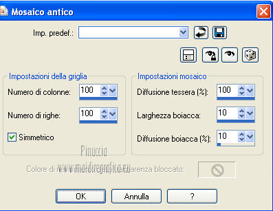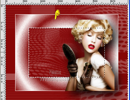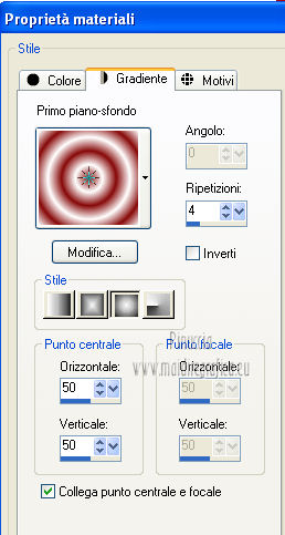 qui puoi trovare qualche risposta ai tuoi dubbi. Se l'argomento che ti interessa non è presente, ti prego di segnalarmelo. Per tradurre questo tutorial ho usato PSP X. Questo tutorial è una creazione di ©Araemae e non può essere copiato su altri siti nè essere offerto per il download. Lo stesso vale per la mia traduzione. Il materiale viene da vari gruppi di condivisione. Il copyright appartiene ai rispettivi autori. Grazie ai creatori dei tubes che mettono a disposizione il loro lavoro in vari gruppi di condivisione. Occorrente: Materiale qui Il tube della donna è di K@rine Il tube della scarpa è di Heidi Il tube del fiore è di Gerry. Filtri: consulta, se necessario, la mia sezione filtri qui AAA Frames - Foto Frame qui Alien Skin Eye Candy 5 Impact - Perspective Shadow qui ![]() Metti le maschere nella cartella Maschere. se stai usando altri colori, sei libero di sperimentare le modalità di miscelatura più adatte 1. Scegli un colore dal tuo tube e impostalo come colore di primo piano (il mio #870909). Imposta il colore di sfondo con il colore bianco. 2. Apri una nuova immagine trasparente 700 x 550 pixels, e riempila con il colore di primo piano.Livelli>Nuovo livello raster. Riempi con il colore bianco.3. Livelli>Carica/Salva maschera>Carica maschera da disco. Cerca e carica la maschera "Astrid Masker 26". ![]() Livelli>Unisci>Unisci gruppo. 4. Livelli>Nuovo livello raster. Riempi con il colore di primo piano.Livelli>Carica/Salva maschera>Carica maschera da disco. Cerca e carica la maschera "Astrid Masker 26a". ![]() Livelli>Unisci>Unisci gruppo. Livelli>Unisci>Unisci giù. 5. Livelli>Nuovo livello raster. Selezione>Seleziona tutto. Selezione>Modifica>Contrai - 55 pixels. Riempi con il colore bianco.Selezione>Modifica>Contrai - 2 pixels. Premi sulla tastiera il tasto CANC. Mantieni selezionato. 6. Livelli>Nuovo livello raster. Passa il colore di primo piano a Gradiente, stile Sprazzo di luce con i seguenti settaggi. ![]() il risultato del tutorial originale dimostra che il gradiente è stato usato senza selezionare Inverti. Per questo ho eseguito due versioni, con il gradiente del tutorial originale, e con il gradiente senza selezionare Inverti. ![]() La versione senza Inverti selezionato - che è uguale a quella del tutorial originale - è in alto. La versione con Inverti selezionato è in fondo al tutorial. Decidi tu come procedere. Riempi il livello con il gradiente.7. Effetti>Effetti di trama>Mosaico antico. ![]() Livelli>Unisci>Unisci giù. 8. Livelli>Nuovo livello raster. Selezione>Modifica>Contrai - 75 pixels. Riempi la selezione con il colore bianco.Selezione>Modifica>Contrai - 2 pixels. Premi sulla tastiera il tasto CANC. 9. Livelli>Nuovo livello raster. Riempi il livello con il colore di primo piano.Livelli>Carica/Salva maschera>Carica maschera da disco. Carica nuovamente la maschera "Astrid Masker 26", con i seguenti settaggi. ![]() Livelli>Unisci>Unisci gruppo. Rinomina questo livello "centro". 10. Livelli>Nuovo livello raster. Riempi con il colore bianco.Livelli>Carica/Salva maschera>Carica maschera da disco. Carica nuovamente la maschera "Astrid Masker 26a", con i seguenti settaggi. ![]() Livelli>Unisci>Unisci gruppo. Abbassa l'opacità di questo livello al 20%. Selezione>Deseleziona. Immagine>Rifletti. 11. Apri il tube "k@rine_dreams_Vintage_Beauty_1413_janvier_2011" e vai a Modifica>Copia. Torna al tuo lavoro e vai a Modifica>Incolla come nuovo livello. Immagine>Ridimensiona, al 50%, tutti i livelli non selezionato. Effetti>Plugins>Alien Skin Eye Candy 5 Impact - Perspective Shadow. Seleziona il preset Drop Shadow,Blurry e ok. ![]() Effetti>Effetti di immagine>Scostamento. ![]() 12. Attiva il livello "centro". Attiva lo strumento Bacchetta magica ![]() e clicca nel bordo esterno per selezionarlo. ![]() Attiva il livello superiore del tube e premi sulla tastiera il tasto CANC. Selezione>Deseleziona. 13. Livelli>Duplica. Immagine>Rifletti. Cambia la modalità di miscelatura di questo livello in Luminanza (esistente), e abbassa l'opacità al 20%. Livelli>Disponi>Sposta giù. 14. Apri il tube "Gerry_bloemen 90-24 februari 2010" e vai a Modifica>Copia. Torna al tuo lavoro e vai a Modifica>Incolla come nuovo livello. Immagine>Capovolgi. Spostalo in alto contro il bordo.Effetti>Effetti di bordo>Aumenta. Effetti>Effetti 3D>Sfalsa ombra, con il colore nero. ![]() 15. Livelli>Duplica. Immagine>Ridimensiona, all'80%, tutti i livelli non selezionato. Sposta questo tube un po' più in alto.16. Apri "Astrid penseel 26". File>Esporta>Pennello personalizzato - assegna un nome al pennello e ok. Livelli>Nuovo livello raster. Attiva lo strumento Pennello ![]() cerca e seleziona il pennello che hai appena esportato ![]() e applicalo in basso a destra cliccando con il tasto sinistro del mouse per usare il colore di primo piano. Livelli>Duplica. Livelli>Unisci>Unisci giù. Effetti>Plugins>Alien Skin Eye Candy 5 Impact - Perspective Shadow, con i settaggi precedenti. 17. Livelli>Nuovo livello raster. Cambia la dimensione del pennello a 250, e applicalo, accanto al precedente, cliccando con il tasto destro del mouse, per usare il colore bianco di sfondo. Livelli>Duplica. Livelli>Unisci>Unisci giù. Effetti>Plugins>Alien Skin Eye Candy 5 Impact - Perspective Shadow, con i settaggi precedenti. 18. Apri il tube "Schoen_met_lipstick1" e vai a Modifica>Copia. Torna al tuo lavoro e vai a Modifica>Incolla come nuovo livello. Immagine>Ridimensiona, al 50%, tutti i livelli non selezionato. Spostalo in basso, come nel mio esempio.Effetti>Plugins>Alien Skin Eye Candy 5 Impact - Perspective Shadow, con i settaggi precedenti. 19. Apri il tube "2.IAmWhatIAm" e vai a Modifica>Copia. Torna al tuo lavoro e vai a Modifica>Incolla come nuovo livello. Spostalo in alto, come nel mio esempio.20. Attiva il livello inferiore. Effetti>Plugins>AAA Frames -Foto Frame. ![]() 21. Immagine>Aggiungi bordatura, 2 pixels, simmetriche, con il colore bianco. 22. Aggiungi il tuo nome e/o il tuo watermark su un nuovo li