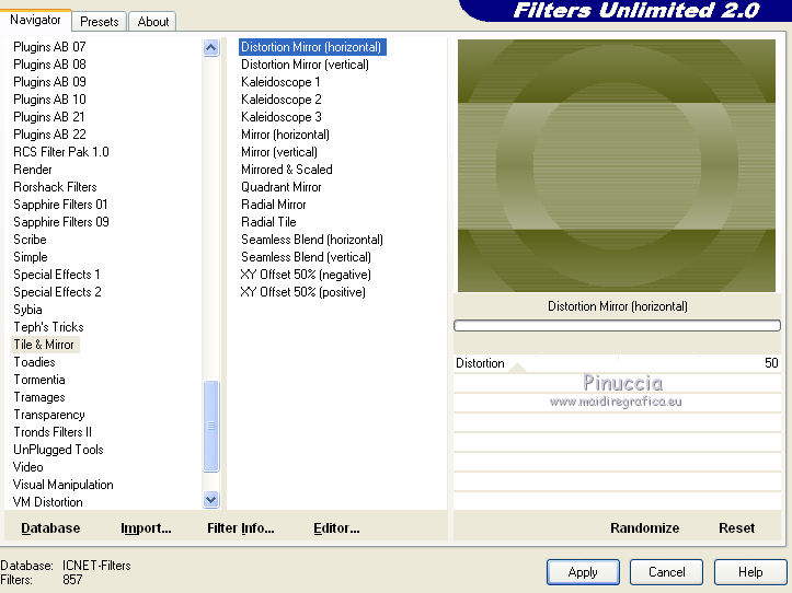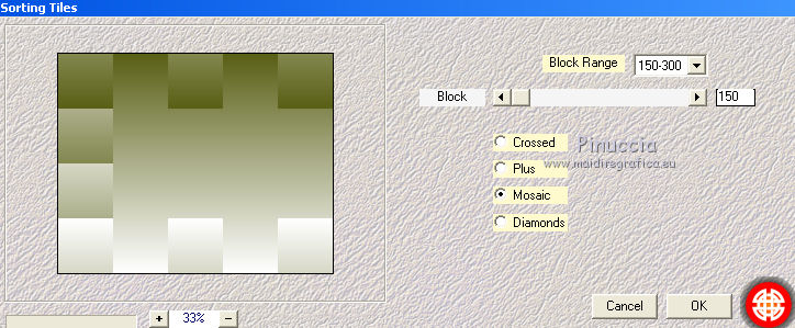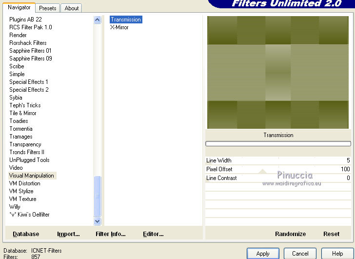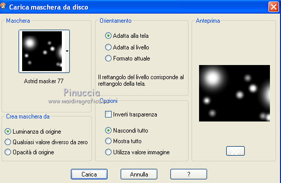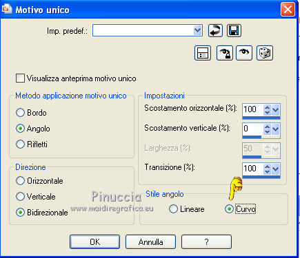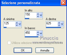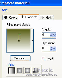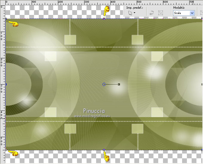 qui puoi trovare qualche risposta ai tuoi dubbi. Se l'argomento che ti interessa non è presente, ti prego di segnalarmelo. Per tradurre questo tutorial ho usato PSP X. Questo tutorial è una creazione di ©Araemae e non può essere copiato su altri siti nè essere offerto per il download. Lo stesso vale per la mia traduzione. Il materiale viene da vari gruppi di condivisione. Il copyright appartiene ai rispettivi autori. Grazie ai creatori dei tubes che mettono a disposizione il loro lavoro in vari gruppi di condivisione. Occorrente: Materiale qui Il tube "12930417440_fleurs_nikita" Nikita Filtri: consulta, se necessario, la mia sezione filtri qui Mehdi - Sorting Tiles qui Simple - Top Left Mirror qui Simple - Left Right Wrap (bonus) qui FM Tile Tools - Blend Emboss qui Filters Unlimited 2.0 qui Visual Manipulation - Transmission qui ![]() se stai usando altri colori, sei libero di sperimentare le modalità di miscelatura più adatte Metti le maschere nella cartella Maschere. Metti le selezioni nella cartella Selezioni. 1. Scegli il colore bianco come colore di primo piano, e un colore scuro del tuo tube come colore di sfondo. Questi i miei colori. ![]() Passa il colore di primo piano a Gradiente, con i seguenti settaggi. ![]() 2. Apri una nuova immagine trasparente 750 x 600 pixels, e riempila con il gradiente.3. Effetti>Plugins>Mehdi - Sorting Tiles. ![]() 4. Effetti>Plugins>Simple - Top Left Mirror. 5. Effetti>Plugins>Filters Unlimited 2.0 - Visual Manipulation - Transmission. ![]() 6. Effetti>Plugins>Filters Unlimited 2.0 - Tile & Mirror - Distortion Mirror (Horizontal). ![]() 7. Livelli>Nuovo livello raster. Selezione>Carica/Salva selezione>Carica selezione da disco. Cerca e carica la selezione "Astrid selectie 77". ![]() Riporta il colore di primo piano a Colore. Riempi la selezione con il colore bianco di primo piano.Selezione>Deseleziona. Cambia la modalità di miscelatura di questo livello in Luminanza (esistente), e abbassa l'opacità al 25%. Livelli>Unisci>Unisci visibile. 8. Effetti>Plugins>Simple - Left Right Wrap. 9. Attiva lo strumento Selezione ,clicca sull'icona Selezione personalizzata ![]() e imposta i seguenti settaggi: ![]() Selezione>Innalza selezione a livello. Selezione>Deseleziona. 10. Effetti>Plugins>Simple - Left Right Wrap. 11. Cambia la modalità di miscelatura di questo livello in Luminanza (esistente), e abbassa l'opacità al 30%. 12. Effetti>Effetti di immagine>Motivo unico. ![]() 13. Attiva il livello inferiore. Selezione>Carica/Salva selezione>Carica selezione da disco. Carica nuovamente la selezione "Astrid selectie 77". ![]() Selezione>Innalza selezione a livello. Selezione>Deseleziona. 14. Immagine>Ridimensiona, al 50%, tutti i livelli non selezionato. 15. Effetti>Plugins>Simple - Left Right Wrap. Cambia la modalità di miscelatura di questo livello in Moltiplica. 16. Attiva il livello superiore. Livelli>Nuovo livello raster. Riempi con il colore bianco.17. Livelli>Carica/Salva maschera>Carica maschera da disco. Cerca e carica la maschera "Astrid masker 77". ![]() Livelli>Unisci>Unisci gruppo. Abbassa l'opacità di questo livello al 75%. 18. Livelli>Nuovo livello raster. Riempi con il colore bianco.19. Livelli>Carica/Salva maschera>Carica maschera da disco. Cerca e carica la maschera "Astrid masker 77a". ![]() Livelli>Unisci>Unisci gruppo. Cambia la modalità di miscelatura di questo livello in Luminanza (Esistente), e abbassa l'opacità al 50%. 20. Livelli>Nuovo livello raster. Selezione>Carica/Salva selezione>Carica selezione da disco. Cerca e carica la selezione "Astrid selectie 77a". ![]() Riempi con il colore bianco.Selezione>Modifica>Contrai - 1 pixel. Premi sulla tastiera il tasto CANC. 21. Livelli>Nuovo livello raster. Riempi con il colore bianco.Selezione>Deseleziona. Cambia la modalità di miscelatura di questo livello in Luminanza (esistente), e abbassa l'opacità al 50%. ![]() 22. Livelli>Unisci>Unisci visibile. 23. Attiva lo strumento Penna ![]() Stile linea: Punto: ![]() Traccia una linea in alto su tutta la larghezza dell'immagine. ![]() Livelli>Converti in livello raster. 24. Livelli>Duplica. Immagine>Capovolgi. 25. Traccia una piccola linea verticale sopra il primo riquadro a sinistra. ![]() Livelli>Converti in livello raster. 26. Livelli>Duplica. Immagine>Rifletti. Livelli>Unisci>Unisci giù. Livelli>Duplica. Immagine>Capovolgi. Livelli>Unisci>Unisci visibile. 27. Premi il tasto D (valido per tutte le versioni di PSP) per attivare lo strumento Deformazione ![]() e - in modalità Scala - usando il nodo centrale in alto spingi l'immagine all'interno fino a 50 pixels; usando il nodo centrale in basso spingi l'immagine fino a 550 pixels. se non vedi i Righelli, vai a Visualizza>Righelli ![]() Per non visualizzare più la griglia dello strumento premi sulla tastiera il tasto M. 28. Effetti>Plugins>FM Tile Tools - Blend Emboss. ![]() 29. Livelli>Nuovo livello raster. Riempi con il colore bianco.Livelli>Disponi>Porta sotto. 30. Attiva il livello superiore. Apri "Astrid tekst 77" e vai a Modifica>Copia. Torna al tuo lavoro e vai a Modifica>Incolla come nuovo livello. Spostalo sul bordo bianco in alto.31. Livelli>Duplica. Sposta questo testo sul bordo bianco in basso.31. Apri il tube "12930417440_fleurs_nikita" e vai a Modifica>Copia. Torna al tuo lavoro e vai a Modifica>Incolla come nuovo livello. Immagine>Ridimensiona, al 75%, tutti i livelli non selezionato. Spostalo in alto contro il bordo.Regola>Messa a fuoco>Metti a fuoco. 32. Effetti>Effetti 3D>Sfalsa ombra, con il colore di sfondo. ![]() 33. Livelli>Unisci>Unisci tutto. 34. Immagine>Aggiungi bordatura, 1 pixel, simmetriche, con il colore di sfondo. Livelli>Innalza livello di sfondo. Immagine>Ridimensiona, all'80%, tutti i livelli non selezionato. 35. Livelli>Nuovo livello raster. Riempilo con il colore bianco.Livelli>Disponi>Porta sotto. Immagine>Aggiungi bordatura, 1 pixel, simmetriche, con il colore di sfondo. 36. Aggiungi il tuo nome e/o il tuo watermark su un nuovo livello. Livel