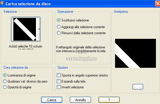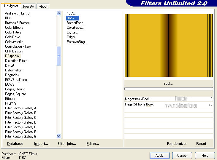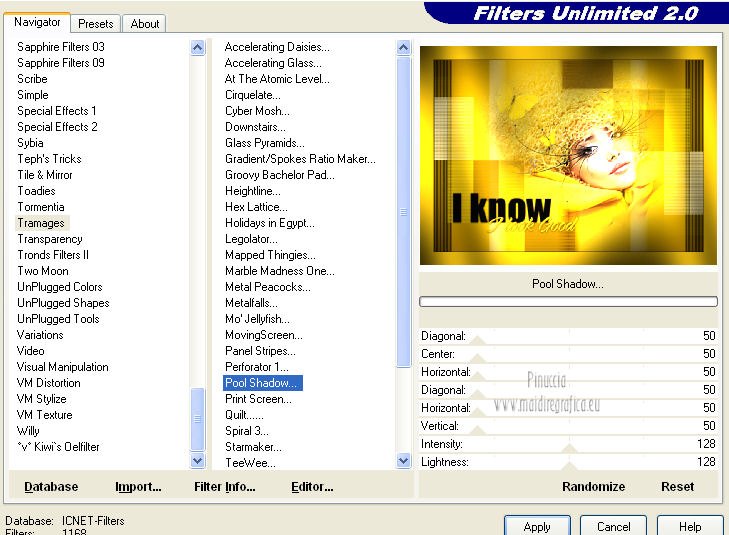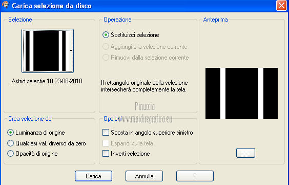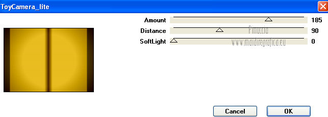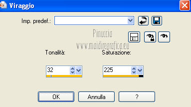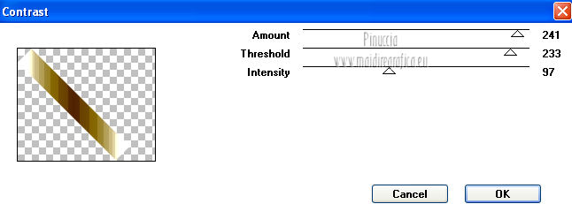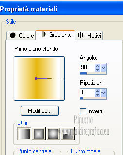 qui puoi trovare qualche risposta ai tuoi dubbi. Se l'argomento che ti interessa non è presente, ti prego di segnalarmelo. Per tradurre questo tutorial ho usato PSP X. Questo tutorial è una creazione di ©Araemae e non può essere copiato su altri siti nè essere offerto per il download. Lo stesso vale per la mia traduzione. Il materiale viene da vari gruppi di condivisione. Il copyright appartiene ai rispettivi autori. Grazie ai creatori dei tubes che mettono a disposizione il loro lavoro in vari gruppi di condivisione. Occorrente: Materiale qui Il tube della donna è di Querida Il wordart è di Beth Grazie. Filtri: consulta, se necessario, la mia sezione filtri qui DC Special - Book qui Penta.com - Toy Camera Lite qui Graphics Plus - Contrast qui Filters Unlimited 2.0 qui Tramages - Pool Shadow qui L&K LandKsiteofwonders - L&K Jouri qui Phpshares hdj1 qui Flaming Pear - Transline qui FM Tile Tools - Blend Emboss qui I filtri DC Special e Tramages si possono usare da soli o importati in Filters Unlimited ![]() se stai usando altri colori, sei libero di sperimentare le modalità di miscelatura più adatte Metti le selezioni nella cartella Selezioni. 1. Imposta il colore di primo piano con il colore bianco, e il colore di sfondo con un colore del tuo tube (il mio #e7b70f). ![]() Apri una nuova immagine trasparente 700 x 500 pixels, e riempila con il colore di sfondo.Effetti>Effetti di trama>Veneziana - colore bianco. ![]() 2. Effetti>Plugins>Filters Unlimited 2.0 - DC Special - Book. ![]() 3. Effetti>Plugins>Penta.com - Toy Camera Lite. ![]() 4. Livelli>Nuovo livello raster. Selezione>Carica/Salva selezione>Carica selezione da disco. Cerca e carica la selezione "Astrid selectie 10 23-08-2010". ![]() Riempi la selezione con il colore bianco.Effetti>Effetti di distorsione>Vento - da sinistra, intensità 100. ![]() Ripeti l'Effetto Vento da destra. ![]() 5. Livelli>Nuovo livello raster. Selezione>Carica/Salva selezione>Carica selezione da disco. Cerca e carica la selezione "Astrid selectie 10 schuin 24-08-2010". ![]() 6. Passa il colore di primo piano a Gradiente, con i seguenti settaggi. ![]() Riempi la selezione con il gradiente.Selezione>Deseleziona. 7. Effetti>Plugins>Graphics Plus - Contrast. ![]() 8. Effetti>Plugins>L&K - L&K Jouri. ![]() 9. Effetti>Plugins>Phpshares hdj1 - Missery. ![]() Effetti>Effetti di bordo>Aumenta. 10. Livelli>Duplica. Immagine>Rifletti. Immagine>Capovolgi. Livelli>Unisci>Unisci giù. 11. Livelli>Duplica. Attiva il livello sottostante Raster 3. Effetti>Plugins>Flaming Pear - Transline. Effetti>Effetti di bordo>Aumenta. Attiva il livello superiore. Abbassa l'opacità di questo livello al 65%. 12. Apri il tube "FaceWomanyellow_byQuerida 140810" e vai a Modifica>Copia. Torna al tuo lavoro e vai a Modifica>Incolla come nuovo livello. Effetti>Plugins>FM Tile Tools - Blend Emboss, con i settaggi standard. ![]() 13. Effetti>Effetti di immagine>Scostamento. ![]() 14. Apri il tube "I Know I look Good" e vai a Modifica>Copia. Torna al tuo lavoro e vai a Modifica>Incolla come nuovo livello. Regola>Tonalità e saturazione>Viraggio, con i valori di Tonalità (H) e Saturazione (S) del tuo colore di sfondo. ![]() 15. Effetti>Plugins>FM Tile Tools - Blend Emboss, con i settaggi standard. ![]() 16. Effetti>Effetti 3D>Sfalsa ombra, con il colore nero. ![]() 17. Immagine>Aggiungi bordatura, 1 pixel, simmetriche, con il colore nero. Immagine>Aggiungi bordatura, 35 pixels, simmetriche, con il colore di sfondo. Seleziona questo bordo con la bacchetta magica ![]() 18. Effetti>Plugins>Filters Unlimited 2.0 - Tramages - Pool Shadow. ![]() 19. Effetti>Effetti 3D>Sfalsa ombra, con il colore nero. ![]() Immagine>Aggiungi bordatura, 1 pixel, simmetriche, con il colore nero. Aggiungi il tuo nome e/o il tuo watermark su un nuovo livello. Livelli>Unisci>Unisci tutto e salva in formato jpg. ![]() Se hai problemi o dubbi, o trovi un link non funzionante, o anche soltanto per un saluto, scrivimi. 10 Agosto 2012 |