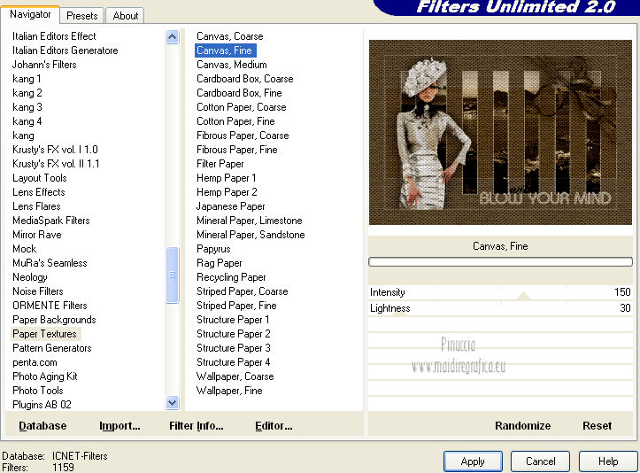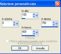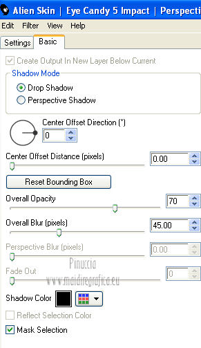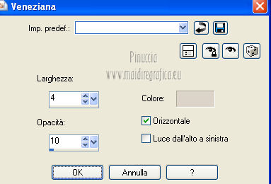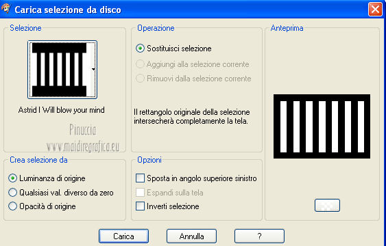 qui puoi trovare qualche risposta ai tuoi dubbi. Se l'argomento che ti interessa non è presente, ti prego di segnalarmelo. Per tradurre questo tutorial ho usato PSP X. Questo tutorial è una creazione di ©Araemae e non può essere copiato su altri siti nè essere offerto per il download. Lo stesso vale per la mia traduzione. Il materiale viene da vari gruppi di condivisione. Il copyright appartiene ai rispettivi autori. Grazie ai creatori dei tubes che mettono a disposizione il loro lavoro in vari gruppi di condivisione. Occorrente: A scelta un'immagine di sfondo. Il resto del materiale qui Grazie: per il tube Gerry e per il wordart Beth. Filtri: consulta, se necessario, la mia sezione filtri qui Filters Unlimited 2.0 qui Alien Skin Eye Candy 5 Impact qui ![]() se stai usando altri colori, sei libero di sperimentare le modalità di miscelatura più adatte Metti le selezioni nella cartella Selezioni. 1. Scegli due colori dal tuo tube. Imposta il colore chiaro come colore di primo piano, e il colore scuro come colore di sfondo. ![]() Apri una nuova immagine trasparente 750 x 500 pixels, e riempila con il colore scuro.2. Livelli>Nuovo livello raster. Selezione>Carica/Salva selezione>Carica selezione da disco. Cerca e carica la selezione selectie Astrid I will blow your mind. ![]() Riempi la selezione con il colore chiaro.Selezione>Modifica>Contrai - 2 pixels. Premi sulla tastiera il tasto CANC. 3. Livelli>Nuovo livello raster. Apri l'immagine di sfondo e vai a Modifica>Copia. Torna al tuo lavoro e vai a Modifica>Incolla nella selezione. Cambia la modalità di miscelatura di questo livello in Luminanza (esistente). Selezione>Deseleziona. 4. Livelli>Nuovo livello raster. Attiva lo strumento Selezione ,clicca sull'icona Selezione personalizzata ![]() e imposta i seguenti settaggi: ![]() Riempi con il colore chiaro.Selezione>Modifica>Contrai - 2 pixels. Premi sulla tastiera il tasto CANC. Riempi con il colore scuro.Effetti>Effetti di trama>Veneziana - colore chiaro di primo piano. ![]() Cambia la modalità di miscelatura di questo livello in Luce diffusa. Selezione>Deseleziona. 5. Effetti>Effetti di bordo>Aumenta. Apri il tube "Gerry-Lady 307" e vai a Modifica>Copia. Torna al tuo lavoro e vai a Modifica>Incolla come nuovo livello. Immagine>Rifletti. Immagine>Ridimensiona, all'80%, tutti i livelli non selezionato. Sposta il tube a sinistra.Effetti>Plugins>Alien Skin Eye Candy 5 Impact - Perspective Shadow. ![]() 6. Apri "I will blow your mind" e vai a Modifica>Copia. Torna al tuo lavoro e vai a Modifica>Incolla come nuovo livello. Immagine>Ridimensiona, all'80%, tutti i livelli non selezionato. Sposta il testo in basso a destra.Cambia la modalità di miscelatura di questo livello in Luminanza (esistente). 7. Apri "Framewrap" e vai a Modifica>Copia. Torna al tuo lavoro e vai a Modifica>Incolla come nuovo livello. Immagine>Ridimensiona, all'80%, tutti i livelli non selezionato. Immagine>Ruota per gradi - 45 gradi a destra ![]() Sposta il nastro nell'angolo in alto a destra, vedi il mio esempio.Cambia la modalità di miscelatura di questo livello in Luminanza (esistente). Effetti>Plugins>Alien Skin Eye Candy 5 Impact - Perspective Shadow, con i settaggi precedenti. ![]() 8. Immagine>Aggiungi bordatura, 1 pixel, simmetriche, con il colore chiaro. Immagine>Aggiungi bordatura,50 pixels, simmetriche, con il colore scuro. Seleziona questo bordo con la bacchetta magica ![]() Effetti>Plugins>Filters Unlimited 2.0 - Paper Textures - Canvas Fine. ![]() Effetti>Effetti 3D>Smusso a incasso. ![]() Effetti>Effetti 3D>Sfalsa ombra. ![]() Ripeti l'Effetto Sfalsa ombra, cambiando verticale e orizzontale con -2. Selezione>Deseleziona. 9. Aggiungi il tuo nome e/o il tuo watermark su un nuovo livello. Livelli>Unisci>Unisci tutto e salva in formato jpg. ![]() Le vostre versioni. Grazie ![]() Mercedes ![]() Pat ![]() Se hai problemi o dubbi, o trovi un link non funzionante, o anche soltanto per un saluto, scrivimi. 10 Agosto 2012 |