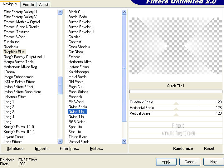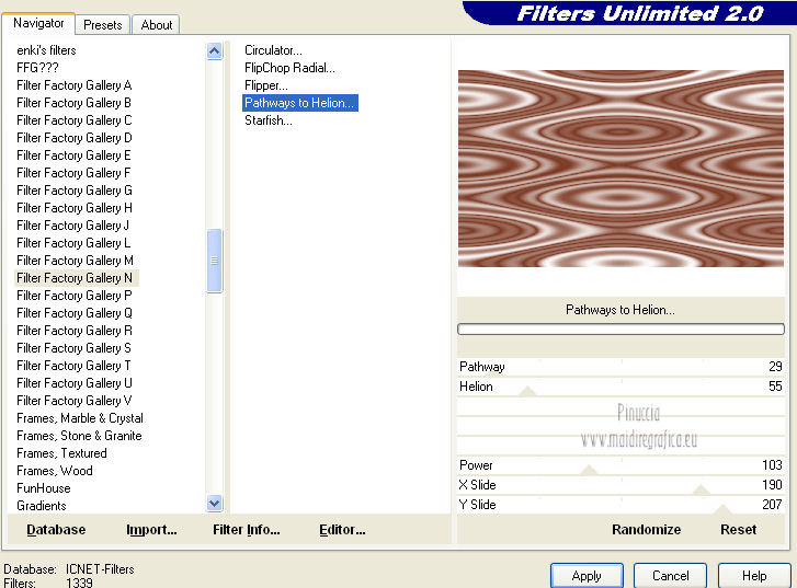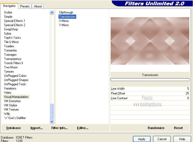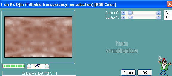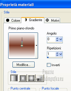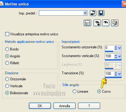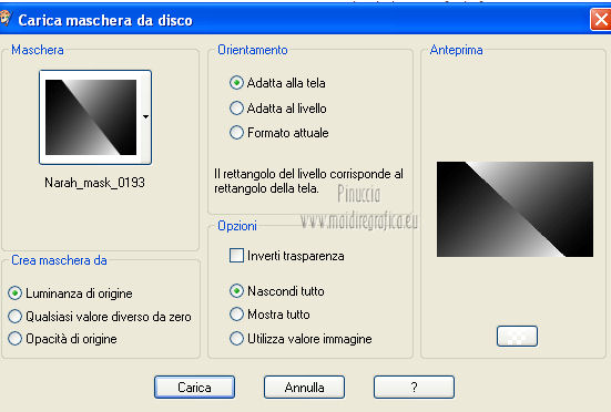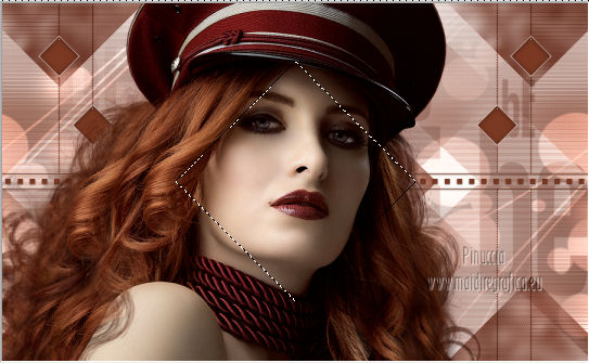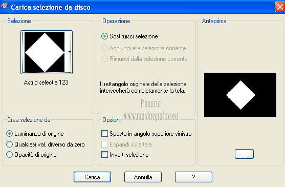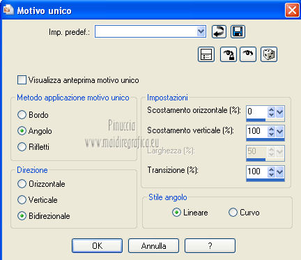 qui puoi trovare qualche risposta ai tuoi dubbi. Se l'argomento che ti interessa non è presente, ti prego di segnalarmelo. Per tradurre questo tutorial ho usato PSP X. Questo tutorial è una creazione di ©Araemae e non può essere copiato su altri siti nè essere offerto per il download. Lo stesso vale per la mia traduzione. Il materiale viene da vari gruppi di condivisione. Il copyright appartiene ai rispettivi autori. Grazie ai creatori dei tubes che mettono a disposizione il loro lavoro in vari gruppi di condivisione. Occorrente: Materiale qui Il tube della donna è di Yoka Filtri: consulta, se necessario, la mia sezione filtri qui Filters Unlimited 2.0 qui Filter Factory Gallery N - Pathways to Helion qui L&K landksiteofwonders - L&K's Djin qui Graphics Plus - Quick Tile I qui Simple - Diamonds qui Visual Manipulation - Transmission qui I filtri Factory Gallery per essere usati devono prima essere convertiti. Come fare vedi qui Si usano importandoli in Filters Unlimited (come fare vedi qui) ma possono funzionare anche da soli. Anche i filtri Graphics Plus, Simple e Visual Manipulation si possono usare da soli o importati in Filters Unlimited. ![]() Metti la selezione nella cartella Selezioni. Metti le maschere nella cartella Maschere. se stai usando altri colori, sei libero di sperimentare le modalità di miscelatura più adatte 1. Imposta il colore di primo piano con il colore bianco, e il colore di sfondo con un colore scelto dal tube. I miei colori. ![]() Passa il colore di primo piano a Gradiente, stile Lineare. ![]() Apri una nuova immagine trasparente 900 x 550 pixels, e riempila con il gradiente.2. Effetti>Plugins>Filters Unlimited 2.0 - Filter Factory Gallery N - Pathways to Helion. ![]() 3. Regola>Sfocatura>Sfocatura gaussiana - raggio 20. ![]() Livelli>Duplica. 4. Effetti>Plugins>L and K landksiteofwonders - L en K's Djin. ![]() Effetti>Effetti di bordo>Aumenta. 5. Livelli>Nuovo livello raster. Riporta il colore di primo piano da Gradiente al colore bianco iniziale. Riempi con il colore bianco.6. Livelli>Carica/Salva maschera>Carica maschera da disco. Cerca e carica la maschera "Narah Mask_0193". ![]() Livelli>Unisci>Unisci gruppo. 7. Effetti>Plugins>Filters Unlimited 2.0 - Graphics Plus - Quick Tile I. ![]() Livelli>Unisci>Unisci giù. 9. Effetti>Effetti di immagine>Motivo unico. ![]() 10. Effetti>Plugins>Filters Unlimited 2.0 - Visual Manipulation - Transmission. ![]() Livelli>Disponi>Sposta giù. 11. Attiva il livello superiore. Immagine>Ridimensiona, al 60%, tutti i livelli non selezionato. 12. Effetti>Plugins>Simple - Diamonds. Effetti>Effetti di bordo>Aumenta. Cambia la modalità di miscelatura di questo livello in Moltiplica. 13. Livelli>Nuovo livello raster. Attiva lo strumento Selezione ,clicca sull'icona Selezione personalizzata ![]() e imposta i seguenti settaggi: ![]() Riempi la selezione con il colore di sfondo.Selezione>Deseleziona. 14. Livelli>Carica/Salva maschera>Carica maschera da disco. Cerca e carica la maschera "Astrid masker 123". ![]() Livelli>Unisci>Unisci gruppo. 15. Effetti>Effetti di immagine>Motivo unico. ![]() Cambia la modalità di miscelatura di questo livello in Moltiplica e abbassa l'opacità al 35%. ![]() 16. Livelli>Nuovo livello raster. Riempi con il colore bianco di primo piano.Livelli>Carica/Salva maschera>Carica maschera da disco. Cerca e carica la maschera "Astrid masker 123a". ![]() Livelli>Unisci>Unisci gruppo. 17. Effetti>Effetti di immagine>Motivo unico. ![]() Cambia la modalità di miscelatura di questo livello in Indebolisci, e abbassa l'opacità al 40%. ![]() 18, Apri "Astrid deco 123" e vai a Modifica>Copia. Torna al tuo lavoro e vai a Modifica>Incolla come nuovo livello. 19. Effetti>Effetti di immagine>Scostamento. ![]() 20. Attiva lo strumento Penna ![]() linea di stile Punto, larghezza 2. ![]() 21. Inverti i colori della paletta. ![]() Tenendo premuto il tasto della maiuscola, per ottenere una linea perfettamente diritta, traccia una linea verticale dall'alto in basso, come nell'esempio. ![]() Livelli>Converti in livello raster. Cambia la modalità di miscelatura di questo livello in Moltiplica. 22. Livelli>Duplica. Sposta la seconda linea a destra, come nell'esempio.per facilitare lo spostamento, dopo aver attivato lo strumento, usa le frecce della tastiera. sull'uso delle frecce abbinato allo strumento Spostamento vedi qui ![]() 23. Livelli>Unisci>Unisci giù. Livelli>Duplica. Immagine>Rifletti. Livelli>Unisci>Unisci giù. Livelli>Disponi>Sposta giù. Rinomina questo livello "4 linee". ![]() 24. Attiva il livello superiore. Apri "Astrid deco 123a" e vai a Modifica>Copia. Torna al tuo lavoro e vai a Modifica>Incolla come nuovo livello. Lascialo come sta. 25. Attiva il livello "4 linee". ![]() 26. Attiva lo strumento Gomma ![]() e cancella la parte delle linee che copre il decoro. ![]() Risultato. ![]() 27. Attiva nuovamente il livello superiore. Selezione>Carica/Salva selezione>Carica selezione da disco. Cerca e carica la selezione "Astrid selectie 123". ![]() 28. Apri il tube "Yoka-Lady-RedHair18-1112" e vai a Modifica>Copia. Torna al tuo lavoro e vai a Modifica>Incolla come nuovo livello. 29. Posiziona il tube in modo che il viso sia visibile nell'area selezionata. ![]() Mantieni selezionato. 30. Livelli>Duplica. Selezione>Inverti. Premi sulla tastiera il tasto CANC. Mantieni sempre selezionato. 31. Cambia la modalità di miscelatura del livello sottostante in Moltiplica, e abbassa l'opacità al 45%. per cambiare le proprietà del livello non occorre attivare il livello. ![]() 32. Rimani posizionato sul livello superiore. Livelli>Nuovo livello raster. Selezione>Inverti. 33. Riempi la selezione con il colore bianco.Selezione>Modifica>Contrai - 2 pixels. Premi sulla tastiera il tasto CANC. Selezione>Deseleziona. 34. Apri il pennello "Astrid penseel 123". File>Esporta>Pennello personalizzato, assegna un nome al pennello e ok. 35. Livelli>Nuovo livello raster. Attiva lo strumento Pennello ![]() cerca e seleziona il pennell
