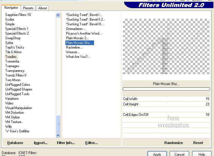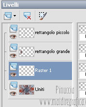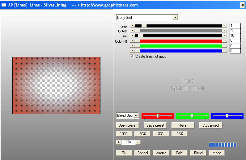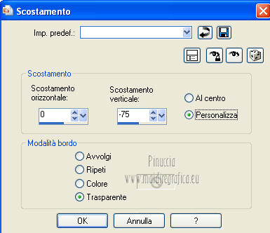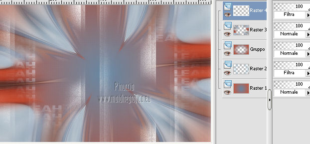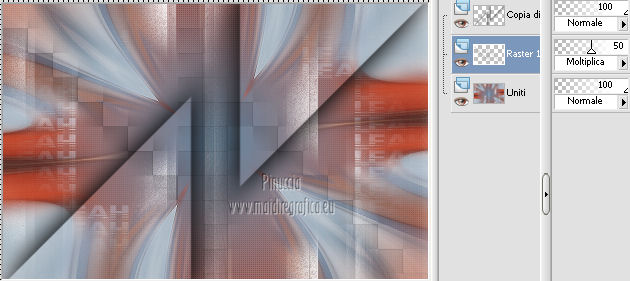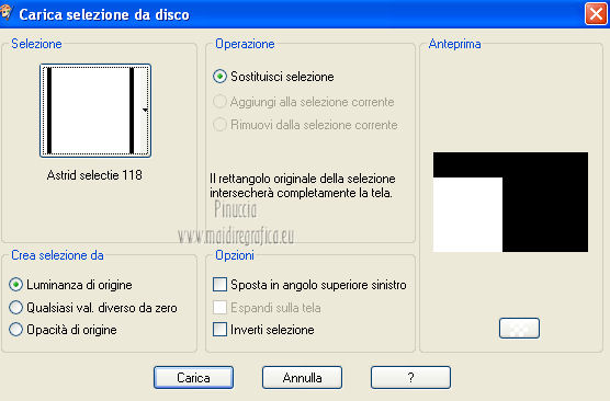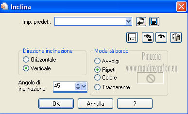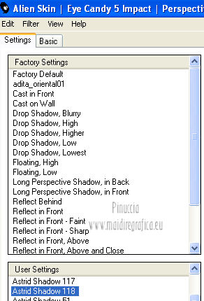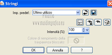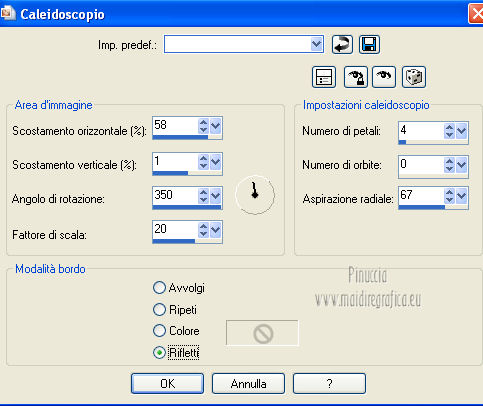 qui puoi trovare qualche risposta ai tuoi dubbi. Se l'argomento che ti interessa non è presente, ti prego di segnalarmelo. Per tradurre questo tutorial ho usato PSP X. Questo tutorial è una creazione di ©Araemae e non può essere copiato su altri siti nè essere offerto per il download. Lo stesso vale per la mia traduzione. Il materiale viene da vari gruppi di condivisione. Il copyright appartiene ai rispettivi autori. Grazie ai creatori dei tubes che mettono a disposizione il loro lavoro in vari gruppi di condivisione. Occorrente: Materiale qui Per il tube utilizzato grazie Athenais Filtri: consulta, se necessario, la mia sezione filtri qui Filters Unlimited 2.0 qui Toadies - Plan Mosaic Blur qui AP Lines - Lines SilverLining qui Alien Skin Eye Candy 5 Impact - Perspective Shadow qui I filtri Toadies si possono usare da soli o importati in Filters Unlimited. (come fare vedi qui) ![]() Metti il preset Astrid Shadow118 nella cartella del filtro: Alien Skin Eye Candy 5 Impact>Settings/Shadow. Cliccando sul file una o due volte (a seconda delle tue impostazioni) automaticamente il preset si installerà nella cartella corretta. Metti la maschera nella cartella Maschere. Metti la selezione nella cartella Selezioni. se stai usando altri colori, sei libero di sperimentare le modalità di miscelatura più adatte 1. Scegli due colori dal tuo tube. I miei colori. ![]() Passa il colore di primo piano a Gradiente, stile Sprazzo di luce: ![]() 2. Apri una nuova immagine trasparente 850 x 550 pixels, e riempila con il gradiente.3. Livelli>Duplica. Livelli>Carica/Salva maschera>Carica maschera da disco. Cerca e carica la maschera 20-20, con i seguenti settaggi. ![]() Livelli>Unisci>Unisci gruppo. 4. Effetti>Plugins>AP Lines - Lines SilverLining. ![]() 5. Apri "Astrid tekst 118" e vai a Modifica>Copia. Torna al tuo lavoro e vai a Modifica>Incolla come nuovo livello. Cambia la modalità di miscelatura di questo livello in Filtra. ![]() Livelli>Duplica. Effetti>Effetti di bordo>Aumenta. Livelli>Unisci>Unisci giù. Livelli>Disponi>Sposta giù. 6. Attiva il livello superiore. Apri il tube "Athe-FM453" e vai a Modifica>Copia. non chiuderlo perchè ti servirà ancora Torna al tuo lavoro e vai a Modifica>Incolla come nuovo livello. 7. Se stai usando un altro tube avrai un risultato differente. Se vuoi ottenere lo stesso effetto del mio esempio, usa il mio tube per questo passaggio, e poi colorizza il risultato con i tuoi colori Immagine>Ridimensiona, al 74%, tutti i livelli non selezionato. 8. Regola>Sfocatura>Sfocatura radiale. ![]() 9. Effetti>Effetti di riflesso>Caleidoscopio. ![]() 10. Effetti>Effetti di distorsione>Stringi (nelle versioni più recenti di PSP ha preso il nome Compressione). ![]() Effetti>Effetti di bordo>Aumenta. 11. Apri "Astrid deco 118" e vai a Modifica>Copia. Torna al tuo lavoro e vai a Modifica>Incolla come nuovo livello. Cambia la modalità di miscelatura di questo livello in Filtra. ![]() 12. Livelli>Unisci>Unisci visibile. 13. Livelli>Nuovo livello raster. Selezione>Carica/Salva selezione>Carica selezione da disco. Cerca e carica la selezione "Astrid selectie 118". ![]() 14. Effetti>Effetti 3D>Sfalsa ombra. ![]() Selezione>Deseleziona. 15. Livelli>Duplica. Immagine>Rifletti. Immagine>Capovolgi. Livelli>Unisci>Unisci giù. 16. Effetti>Effetti geometrici>Inclina. ![]() 17. Livelli>Duplica. Attiva il livello sottostante dell'originale. 18. Effetti>Plugins>Filters Unlimited 2.0 - Toadies - Plain Mosaic Blur, con i settaggi standard. ![]() 19. Immagine>Rifletti. Cambia la modalità di miscelatura di questo livello in Moltiplica, e abbassa l'opacità al 50%. ![]() 20. Apri "Astrid deco 118a" e vai a Modifica>Copia. Torna al tuo lavoro e vai a Modifica>Incolla come nuovo livello. Cambia la modalità di miscelatura di questo livello Rafforza. 21. Livelli>Unisci>Unisci visibile. 22. Livelli>Duplica. Regola>Sfocatura>Sfocatura gaussiana - raggio 25. ![]() 23. Immagine>Ridimensiona, al 20%, tutti i livelli non selezionato. 24. Immagine>Ruota per gradi - 90 gradi a destra. ![]() Effetti>Effetti di bordo>Aumenta. 25. Effetti>Effetti di immagine>Scostamento. ![]() Rinomina questo livello "rettangolo grande". 26. Livelli>Duplica. Immagine>Ridimensiona, al 35%, tutti i livelli non selezionato. Regola>Messa a fuoco>Metti a fuoco. Rinomina questo livello "rettangolo piccolo". 27. Imposta il colore di primo piano con il colore bianco. Attiva lo strumento Penna ![]() linea di stile punto; larghezza 2 ![]() Traccia una linea dall'alto in basso, come nell'esempio, tenendo premuto il tasto della maiuscola per ottenere una linea perfettamente diritta. ![]() Livelli>Converti in livello raster. 28. Livelli>Disponi>Sposta giù - 2 volte. Questa dovrebbe essere la tua paletta. ![]() 29. Livelli>Duplica. Immagine>Rifletti. 30. Effetti>Effetti di distorsione>Onda. ![]() 31. Effetti>Effetti geometrici>Inclina, con i settaggi precedenti. ![]() Cambia la modalità di miscelatura di questo livello in Filtra. 32. Attiva il livello superiore (rettangolo piccolo). Effetti>Effetti di immagine>Scostamento. ![]() 33. Effetti>Effetti 3D>Sfalsa ombra. ![]() 34. Livelli>Duplica. Effetti>Effetti di immagine>Scostamento. ![]() 35. Di nuovo Livelli>Duplica. Effetti>Effetti di immagine>Scostamento, con i settaggi precedenti. ![]() 36. Attiva il livello "rettangolo grande". Effetti>Effetti 3D>Sfalsa ombra, con i settaggi precedenti. ![]() 37. Livelli>Unisci>Unisci visibile. 38. Apri "Astrid tekst 118a" e vai a Modifica>Copia. Torna al tuo lavoro e vai a Modifica>Incolla come nuovo livello. Sposta il testo come nell'esempio.![]() 39. Effetti>Effetti 3D>Sfalsa ombra, con i settaggi precedenti. ![]() 40. Livelli>Nuovo livello raster. Selezione>Seleziona tutto. Riempi la selezione con il colore nero.41. Selezione>Modifica>Contrai - 15 pixels. Premi sulla tastiera il tasto CANC. Selezione>Deseleziona. Cambia la modalità di miscelatura di questo livello in Luminanza (esistente), e abbassa l'opacità al 50%. 42. Attiva nuovamente i