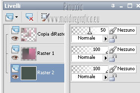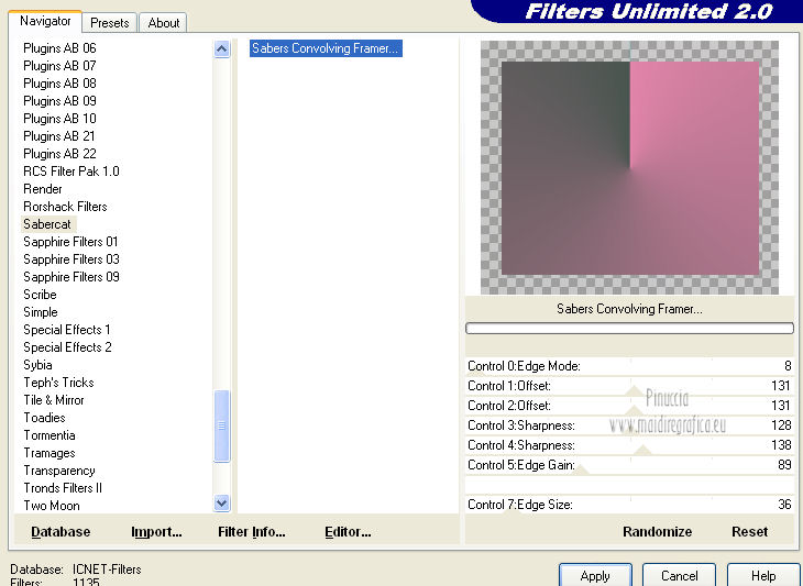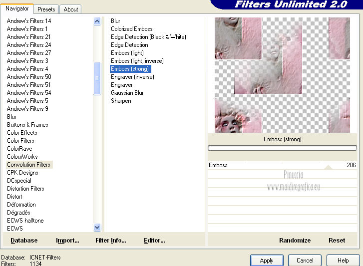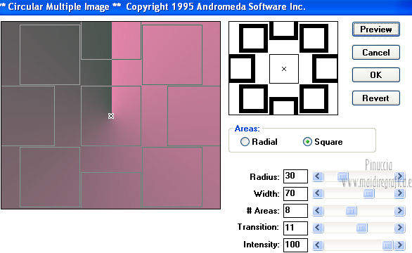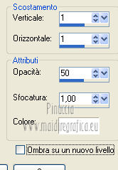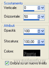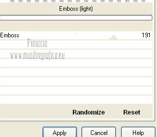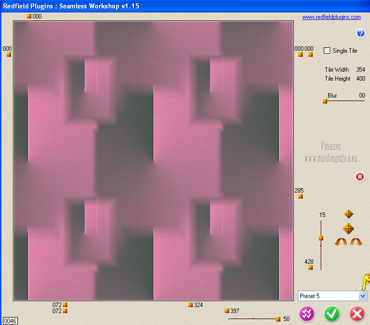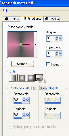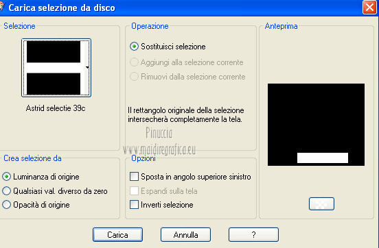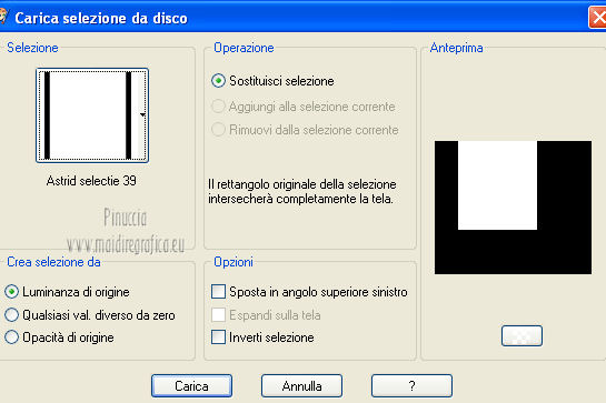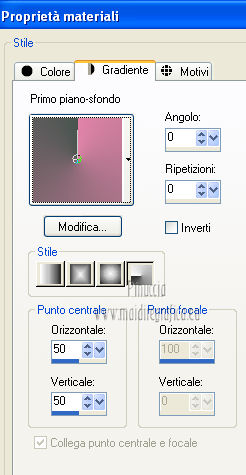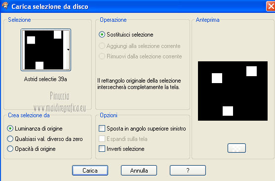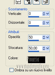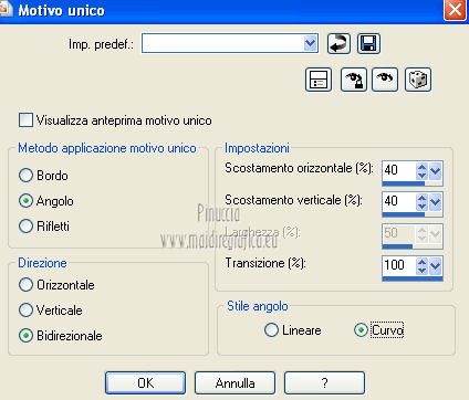 qui puoi trovare qualche risposta ai tuoi dubbi. Se l'argomento che ti interessa non è presente, ti prego di segnalarmelo. Per tradurre questo tutorial ho usato PSP X. Questo tutorial è una creazione di ©Araemae e non può essere copiato su altri siti nè essere offerto per il download. Lo stesso vale per la mia traduzione. Il materiale viene da vari gruppi di condivisione. Il copyright appartiene ai rispettivi autori. Grazie ai creatori dei tubes che mettono a disposizione il loro lavoro in vari gruppi di condivisione. Occorrente: Materiale qui Il tube della donna è di Kitty Filtri: consulta, se necessario, la mia sezione filtri qui Filters Unlimited 2.0 qui Redfield - Seamless Workshop qui Sabercat - Saber Convolving Framer qui Simple - Pizza Slice Mirror qui Andromeda - CMulti qui ![]() se stai usando altri colori, sei libero di sperimentare le modalità di miscelatura più adatte Apri il font e minimizzalo. Lo troverai nella lista dei font disponibili, quando ti servirà. Metti le selezioni nella cartella Selezioni. Scegli due colori dal tuo tube e imposta il colore di primo piano con il colore chiaro, e il colore di sfondo con il colore scuro. I miei colori. ![]() Passa il colore di primo piano a Gradiente di primo piano/sfondo, con i seguenti settaggi. ![]() 1. Apri una nuova immagine trasparente 700 x 600 pixels, e riempila con il gradiente.Livelli>Duplica. 2. Effetti>Plugins>Andromeda - CMulti... ![]() Effetti>Effetti di bordo>Aumenta. 3. Effetti>Plugins>Redfield - Seamless Workshop. Seleziona "preset 5" e ok. ![]() 4. Selezione>Carica/Salva selezione>Carica selezione da disco. Cerca e carica la selezione "Astrid selectie 39". ![]() 5. Apri il tube "Kittys-Nimf" e vai a Modifica>Copia. non chiuderlo perchè ti servirà ancora Torna al tuo lavoro e vai a Modifica>Incolla come nuovo livello. Posiziona il tube nell'area selezionata.Selezione>Inverti. Premi sulla tastiera il tasto CANC. Selezione>Deseleziona. Abbassa l'opacità di questo livello al 50%. Livelli>Unisci>Unisci giù. Abbassa l'opacità di questo livello al 50%. 6. Effetti>Effetti di immagine>Motivo unico. ![]() 7. Effetti>Plugins>Filters Unlimited 2.0 - Convolution Filters - Emboss(strong). ![]() 8. Attiva il livello inferiore (raster 1). Effetti>Plugins>Filters Unlimited 2.0 - Sabercat - Sabers Convolving Framer. ![]() 9. Livelli>Nuovo livello raster. Riempi con il colore di sfondo.Livelli>Disponi>Porta sotto. ![]() Attiva il livello Raster 1. ![]() Effetti>Effetti di bordo>Aumenta. 10. Attiva il livello superiore. Livelli>Nuovo livello raster. Selezione>Carica/Salva selezione>Carica selezione da disco. Cerca e carica la selezione "Astrid selectie 39a". ![]() Riempi con il colore di sfondo.Selezione>Deseleziona. Regola>Messa a fuoco>Metti a fuoco - 2 volte. 11. Livelli>Nuovo livello raster. Selezione>Carica/Salva selezione>Carica selezione da disco. Cerca e carica la selezione "Astrid selectie 39b". ![]() Riempi con il colore di primo piano.Selezione>Deseleziona. Effetti>Effetti di bordo>Aumenta. Abbassa l'opacità di questo livello al 50%. 12. Effetti>Plugins>Simple - Pizza Slice Mirror. 13. Effetti>Plugins>Filters Unlimited 2.0 - Convolution Filters - Emboss(light). ![]() 14. Apri il tube "39.Astrid Deco 39a" e vai a Modifica>Copia. Torna al tuo lavoro e vai a Modifica>Incolla come nuovo livello. 15. Apri il tube "39.Astrid Deco 39b" e vai a Modifica>Copia. Torna al tuo lavoro e vai a Modifica>Incolla come nuovo livello. Effetti>Effetti di immagine>Scostamento. ![]() Effetti>Effetti 3D>Sfalsa ombra, con il colore nero. ![]() 16. Apri il tube "39.Astrid Love tekst" e vai a Modifica>Copia. Torna al tuo lavoro e vai a Modifica>Incolla come nuovo livello. 17. Attiva nuovamente il tube "Kittys-Nimf" e vai a Modifica>Copia. Torna al tuo lavoro e vai a Modifica>Incolla come nuovo livello. Immagine>Ridimensiona, al 90%, tutti i livelli non selezionato. 18. Effetti>Effetti di immagine>Scostamento. ![]() 19. Effetti>Effetti 3D>Sfalsa ombra, con il colore di sfondo, ombra su nuovo livello selezionato. ![]() Rimani sul livello dell'ombra. 20. Effetti>Effetti di trama>Veneziana. ![]() Attiva il livello superiore. Livelli>Unisci>Unisci giù. Effetti>Effetti 3D>Sfalsa ombra, con il colore nero. ![]() 21. Selezione>Carica/Salva selezione>Carica selezione da disco. Cerca e carica la selezione "Astrid selectie 39c". ![]() Premi sulla tastiera il tasto CANC. Selezione>Deseleziona. 22. Attiva lo strumento Testo ![]() ![]() Scrivi "Let there be love" o quello che preferisci nella striscia sotto il tube. Livelli>Converti in livello raster. 23. Per posizionare correttamente il testo, premi il tasto K per attivare lo strumento Puntatore ![]() se stai usando PSP 9 il tasto D, valido per tutte le versioni, per attivare lo strumento Deformazione ![]() e nella barra superiore degli strumenti imposta manualmente le coordinate della posizione. ![]() 24. Livelli>Duplica - 2 volte. Attiva il livello originale del testo. Effetti>Effetti di distorsione>Vento - da destra, intensità 100. ![]() Attiva il livello della prima copia del testo. Effetti>Effetti di distorsione>Vento, da sinistra, intensità 100. ![]() 25. Attiva il livello superiore della seconda copia. Effetti>Effetti 3D>Sfalsa ombra, con il colore bianco. ![]() 26. Immagine>Aggiungi bordatura, 1 pixel, simmetriche, con il colore di primo piano. Immagine>Aggiungi bordatura, 50 pixels, simmetriche, con il colore di sfondo. Immagine>Aggiungi bordatura, 1 pixel, simmetriche, con il colore di primo piano. 27. Seleziona il bordo da 50 pixels con la bacchetta magica ![]() ![]() Passa il colore di primo piano a Gradiente. ![]() Riempi la selezione con il gradiente.Selezione>Deseleziona. 28. Aggiungi il tuo nome e/o il tuo watermark su un nuovo livello. Livelli>Unisci>Unisci tutto e salva in formato jpg. ![]() Se hai problemi o dubbi, o trovi un link non funzionante, o anche soltanto per un saluto, scrivimi. 26 Luglio 2012 |
