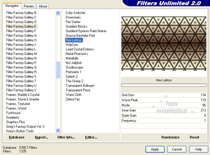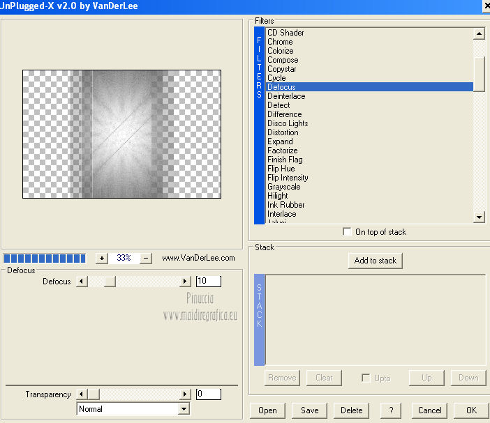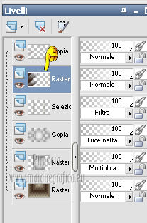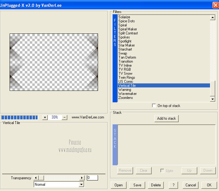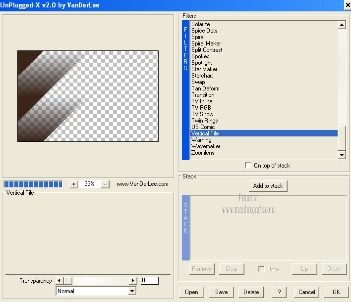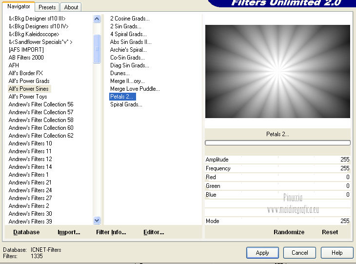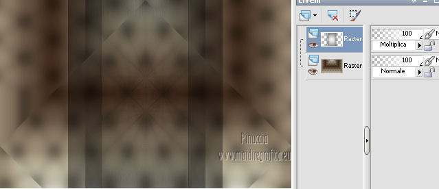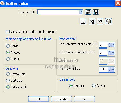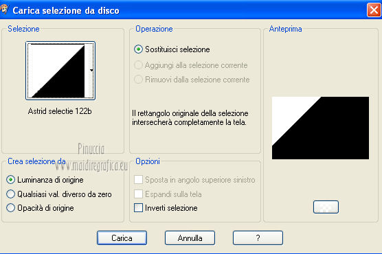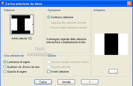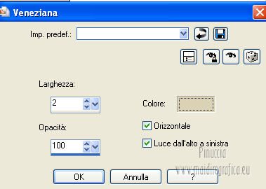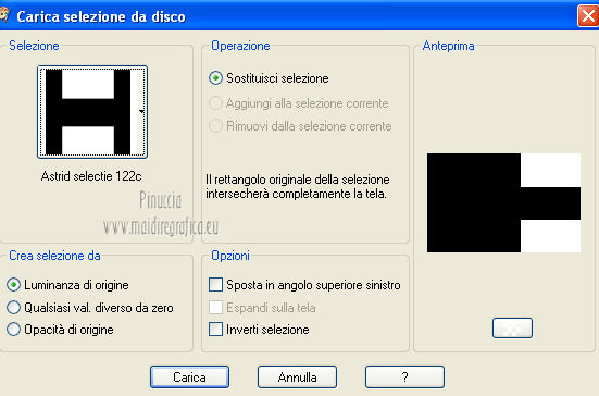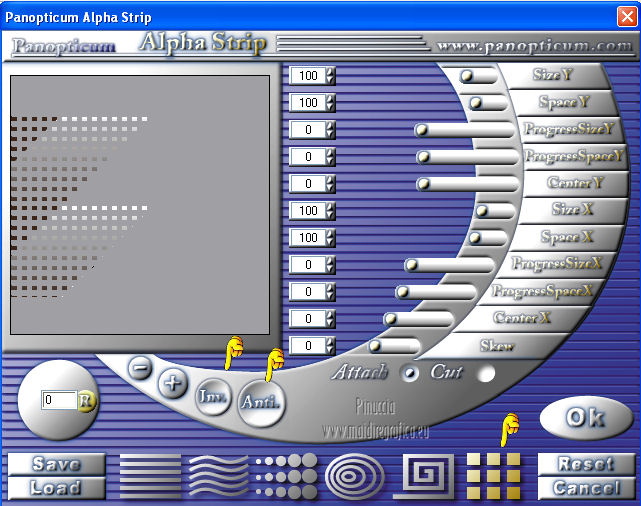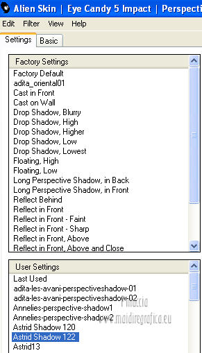 qui puoi trovare qualche risposta ai tuoi dubbi. Se l'argomento che ti interessa non è presente, ti prego di segnalarmelo. Per tradurre questo tutorial ho usato PSP X. Questo tutorial è una creazione di ©Araemae e non può essere copiato su altri siti nè essere offerto per il download. Lo stesso vale per la mia traduzione. Il materiale viene da vari gruppi di condivisione. Il copyright appartiene ai rispettivi autori. Grazie ai creatori dei tubes che mettono a disposizione il loro lavoro in vari gruppi di condivisione. Occorrente: Materiale qui Il tube della donna è di Gerry Filtri: consulta, se necessario, la mia sezione filtri qui Filters Unlimited 2.0 qui Filter Factory Gallery E - Hex Lattice qui Alf's Power Sines - Petals 2 (da importare in Filters Unlimited) qui VanDerLee - Unplugged-X qui Simple - Blintz qui Panopticum - PAN Alpha Strip qui AAA Frames - Foto Frame qui Alien Skin Eye Candy 5 Impact - Perspective Shadow qui I filtri Factory Gallery per essere usati devono prima essere convertiti. Come fare vedi qui Si usano importandoli in Filters Unlimited (come fare vedi qui) ma possono funzionare anche da soli. Anche i filtri Simple si possono usare da soli o importati in Filters Unlimited. ![]() Metti il preset "Astrid Shadow 122" nella cartella del filtro Alien Skin Eye Candy 5 Impact>Settings>Shadow. Cliccando sul file una o due volte (a seconda delle tue impostazioni), automaticamente il preset si installerà nella cartella corretta. perchè uno o due clic vedi qui Metti le selezioni nella cartella Selezioni. Metti la maschera nella cartella Maschere. se stai usando altri colori, sei libero di sperimentare le modalità di miscelatura più adatte 1. Scegli due colori dal tuo tube. Imposta il colore di primo piano con il colore chiaro, e il colore di sfondo con un colore scuro. I miei colori. ![]() Passa il colore di primo piano a Gradiente, stile Lineare. ![]() Apri una nuova immagine trasparente 850 x 550 pixels, e riempila con il gradiente.2. Effetti>Plugins>Filters Unlimited 2.0 - Filter Factory Gallery E - Hex Lattice. ![]() 3. Regola>Sfocatura>Sfocatura gaussiana - raggio 15. ![]() 4. Effetti>Plugins>Simple - Blintz. 5. Livelli>Nuovo livello raster. Riempi la selezione con il colore di primo piano.6. Effetti>Plugins>Filters Unlimited 2.0 - Alf's Power Sines - Petals 2. ![]() 7. Sullo stesso livello. Selezione>Carica/Salva selezione>Carica selezione da disco. Cerca e carica la selezione "Astrid selectie 122". ![]() Premi sulla tastiera il tasto CANC. Selezione>Deseleziona. 8. Efetti>Effetti di bordo>Aumenta - 2 volte. 9. Effetti>Plugins>VanDerLee - Unplugged-X - Defocus. ![]() 10. Regola>Messa a fuoco>Metti a fuoco. Cambia la modalità di miscelatura di questo livello in Moltiplica. ![]() 11. Livelli>Duplica. Effetti>Effetti di immagine>Motivo unico. ![]() Cambia la modalità di miscelatura di questo livello in Luce netta. 12. Sullo stesso livello. Selezione>Carica/Salva selezione>Carica selezione da disco. Cerca e carica la selezione "Astrid selectie 122a". ![]() Selezione>Innalza selezione a livello. Selezione>Deseleziona. 13. Effetti>Effetti di trama>Veneziana - colore di primo piano. ![]() Cambia la modalità di miscelatura di questo livello in Filtra. 14. Livelli>Duplica. Livelli>Unisci>Unisci giù. 15. Livelli>Nuovo livello raster. Selezione>Carica/Salva selezione>Carica selezione da disco. Cerca e carica la selezione "Astrid selectie 122b". ![]() Riempi la selezione con il colore di sfondo.Selezione>Deseleziona. 16. Effetti>Plugins>VanDerLee - Unplugged-X - Vertical Tile. ![]() 17. Livelli>Duplica. Effetti>Plugins>Panopticum - PAN Alpha Strip. ![]() 18. Effetti>Effetti di immagine>Motivo unico. ![]() 19. Attiva il livello sottostante. ![]() 20. Livelli>Duplica. Immagine>Rifletti. Livelli>Unisci>Unisci giù. Abbassa l'opacità di questo livello al 70%. 21. Attiva il livello superiore. Apri "Astrid penseel 122". File>Esporta>Pennello personalizzato - assegna un nome al pennello e ok. 22. Livelli>Nuovo livello raster. Riporta il colore di primo piano a Colore. Attiva lo strumento Pennello ![]() cerca e seleziona il pennello che hai appena esportato ![]() e applicalo contro il bordo destro, cliccando con il tasto sinistro del mouse, per usare il colore di primo piano. ![]() 23. Livelli>Duplica. Immagine>Rifletti. Livelli>Unisci>Unisci giù. Abbassa l'opacità di questo livello al 50%. 24. Apri "Astrid deco 122" e vai a Modifica>Copia. Torna al tuo lavoro e vai a Modifica>Incolla come nuovo livello. Lascialo come sta. 25. Livelli>Nuovo livello raster. Selezione>Carica/Salva selezione>Carica selezione da disco. Cerca e carica la selezione "Astrid selectie 122c". ![]() Riporta il colore di primo piano a Gradiente. ![]() Riempi la selezione con il gradiente.Selezione>Deseleziona. 26. Effetti>Effetti di immagine>Motivo unico. ![]() 27. Sullo stesso livello. Livelli>Carica/Salva maschera>Carica maschera da disco. Cerca e carica la maschera "20-20". ![]() Livelli>Unisci>Unisci gruppo. Effetti>Effetti di bordo>Aumenta. 28. Livelli>Duplica. Immagine>Rifletti. Livelli>Unisci>Unisci giù. 29. Apri "Astrid deco 122a" e vai a Modifica>Copia. Torna al tuo lavoro e vai a Modifica>Incolla come nuovo livello. 30. Effetti>Effetti di immagine>Scostamento. ![]() Cambia la modalità di miscelatura di questo livello in Luce netta. 31. Livelli>Nuovo livello raster. Selezione>Carica/Salva selezione>Carica selezione da disco. Cerca e carica la selezione "Astrid selectie 122d". ![]() Riempi la selezione con il colore di sfondo.Selezione>Deseleziona. 32. Effetti>Plugins>VanDerLee - Unplugged-X - Vertical Tile. ![]() 33. Apri "Astrid tekst 122" e vai a Modifica>Copia. Torna al tuo lavoro e vai a Modifica>Incolla come nuovo livello. 34. Effetti>Effetti di immagine>Scostamento. ![]() Abbassa l'opacità di questo livello al 40%. 35. Apri "Astrid deco122b" e vai a Modifica>Copia. Torna al tuo lavoro e vai a Modifica>Incolla come nuovo livello. Cambia la modalità di miscelatura di questo livello 