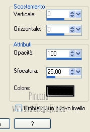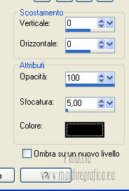 qui puoi trovare qualche risposta ai tuoi dubbi. Se l'argomento che ti interessa non è presente, ti prego di segnalarmelo. Per tradurre questo tutorial ho usato PSP X. Questo tutorial è una creazione di ©Araemae e non può essere copiato su altri siti nè essere offerto per il download. Lo stesso vale per la mia traduzione. Il materiale viene da vari gruppi di condivisione. Il copyright appartiene ai rispettivi autori. Grazie ai creatori dei tubes che mettono a disposizione il loro lavoro in vari gruppi di condivisione. Occorrente: Materiale qui Il tube è di Mirabelline L'artista è ©Gaëlle Boissonnard. Filtri: consulta, se necessario, la mia sezione filtri qui Filters Unlimited 2.0 qui PhotoEffex - Background Blur qui Ormente's Filters - PowerPlast qui Xero - Fuzzifier qui Mura's Meister - Copies qui Alien Skin Snap Art - Oil Paint qui Alien Skin Xenofex 2.0 - Lightning qui Ulead Effects - Particle qui FM Tile Tools - Blend Emboss qui ![]() se stai usando altri colori, sei libero di sperimentare le modalità di miscelatura più adatte 1. Scegli due colori contrastanti dal tuo tube. ![]() Passa il colore di primo piano a Gradiente. ![]() Apri una nuova immagine trasparente 750 x 600 pixels, e riempila con il gradiente.2. Livelli>Nuovo livello raster. Selezione>Seleziona tutto. Apri il tube " Mira_MLC_Gaelle_Boissonnard_bb218" e vai a Modifica>Copia. non chiuderlo perchè ti servirà ancora Torna al tuo lavoro e vai a Modifica>Incolla nella selezione. Selezione>Deseleziona. Livelli>Unisci>Unisci giù. 3. Effetti>Effetti di immagine>Motivo unico. ![]() 4. Effetti>Effetti di trama>Manto. ![]() 5. Effetti>Plugins>Filters Unlimited 2.0 - Paper Textures - Canvas Fine. ![]() 6. Livelli>Duplica. Chiudi questo livello e attiva il livello sottostante dell'originale. Effetti>Plugins>PhotoEffex - Background Blur. ![]() 7. Effetti>Plugins>Ormente's Filters - PowerPlast. ![]() 8. Effetti>Plugins>Xero - Fuzzifier. ![]() Regola>Messa a fuoco>Accentua messa a fuoco. 9. Apri e attiva il livello superiore. Immagine>Ridimensiona, all'80%, tutti i livelli non selezionato. Apri il tube "18zwartebloemen" e vai a Modifica>Copia. Torna al tuo lavoro e vai a Modifica>Incolla come nuovo livello. Immagine>Ridimensiona, all'80%, tutti i livelli non selezionato. Spostalo nell'angolo in basso a sinistra.![]() Livelli>Duplica. Immagine>Rifletti. Sposta questo tube in alto a destra.![]() Livelli>Unisci>Unisci giù. Regola>Messa a fuoco>Messa a fuoco passaggio alto. ![]() questo effetto non si trova in PSP 9; se stai usando questa versione, salta il passaggio, o usa Regola>Messa a fuoco>Metti a fuoco Effetti>Effetti di bordo>Aumenta - 2 volte. 10. Attiva il livello copia di Raster 1. Selezione>Seleziona tutto. Selezione>Mobile. Selezione>Immobilizza. Selezione>Inverti. Attiva il livello superiore - Raster 2. Premi sulla tastiera il tasto CANC. Livelli>Unisci>Unisci giù. Ancora Selezione>Inverti. 11. Effetti>Effetti di trama>Plastica morbida. ![]() 12. Effetti>Plugins>Xero - Fuzzifier, con i settaggi precedenti. 13. Regola>Aggiungi/Rimuovi disturbo>Aggiungi disturbo. ![]() 14. Effetti>Effetti 3D>Sfalsa ombra, con il colore nero. ![]() Modifica>Ripeti Sfalsa ombra. Selezione>Deseleziona. 15. Effetti>Plugins>Mura's Meister - Copies. ![]() Random significa casuale, per questo il risultato dell'effetto potrebbe essere diverso dal mio. 16. Attiva nuovamente il tube "Mira_MLC_Gaelle_Boissonnard_bb218" e vai a Modifica>Copia. Torna al tuo lavoro e vai a Modifica>Incolla come nuovo livello. Immagine>Ridimensiona, al 50%, tutti i livelli non selezionato. Regola>Messa a fuoco>Metti a fuoco. Effetti>Effetti 3D>Sfalsa ombra, con il colore nero. ![]() Modifica>Ripeti Sfalsa ombra. 17. Livelli>Duplica. Immagine>Rifletti. Immagine>Ridimensiona, al 65%, tutti i livelli non selezionato. Regola>Messa a fuoco>Metti a fuoco. Spostalo a sinistra.18. Livelli>Duplica. Immagine>Ridimensiona, al 65%, tutti i livelli non selezionato. Regola>Messa a fuoco>Metti a fuoco. Livelli>Disponi>Sposta giù. Attiva il livello superiore. Livelli>Unisci>Unisci giù. 19. Effetti>Plugins>Alien Skin Snap Art - Oil Paint. ![]() 20. Livelli>Nuovo livello raster. Effetti>Plugins>Alien Skin Xenofex 2.0 - Lightning. Settings: Straight from Above" con i seguenti settaggi. ![]() Sposta il fulmine contro il bordo superiore.21. Livelli>Nuovo livello raster. Attiva lo strumento Selezione , ellisse![]() Traccia una selezione come nell'esempio. ![]() rilasciando il tasto del mouse la selezione si allargherà per effetto della sfumatura. ![]() 22. Imposta il colore di primo piano con il colore nero, e il colore di sfondo con il colore bianco. Passa il colore di primo piano a Gradiente. ![]() Riempi la selezione con il gradiente.23. Effetti>Plugins>Ulead Effects - Particle seleziona Cloud e clicca su Load ![]() Seleziona Cloud 4 ![]() e avrai questo ![]() Se vuoi, puoi giocare un po' con i settaggi se vuoi ottenere un effetto differente. Selezione>Deseleziona. 24. Sposta la nuvola contro il bordo dell'immagine interna.![]() Immagine>Ruota per gradi - 2 gradi a sinistra. ![]() Se necessario, regola questi settaggi in base all'inclinazione dell'immagine centrale, che, come spiegato sopra, può essere differente a causa dell'effetto Random del filtro Copies 25. Apri il tube "18Lightning" e vai a Modifica>Copia. Torna al tuo lavoro e vai a Modifica>Incolla come nuovo livello. Spostalo in alto a sinistra.Effetti>Plugins>FM Tile Tools - Blend Emboss, con i settaggi standard. ![]() Effetti>Effetti 3D>Sfalsa ombra, con il colore bianco. ![]() Effetti>Effetti di bordo>Aumenta. 26. Immagine>Aggiungi bordatura, 2 pixels, simmetriche, con un colore a tua scelta. 27. Aggiungi il tuo nome e/o il tuo watermark su un nuovo livello. Livelli>Unisci>Unisci tutto e salva in formato jpg. ![]() Se hai problemi o dubbi, o trovi un link non funzionante, o anche soltanto per un saluto, scrivimi. 10 Agosto 2012 |