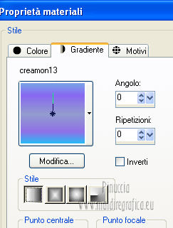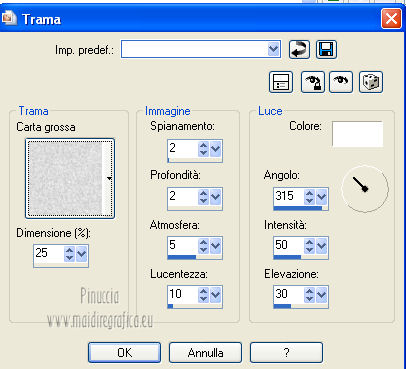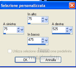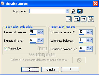 qui puoi trovare qualche risposta ai tuoi dubbi. Se l'argomento che ti interessa non è presente, ti prego di segnalarmelo. Per tradurre questo tutorial ho usato PSP X. Questo tutorial è una creazione di ©Araemae e non può essere copiato su altri siti nè essere offerto per il download. Lo stesso vale per la mia traduzione. Il materiale viene da vari gruppi di condivisione. Il copyright appartiene ai rispettivi autori. Grazie ai creatori dei tubes che mettono a disposizione il loro lavoro in vari gruppi di condivisione. Occorrente: Materiale qui Per il tube grazie Gerry. Filtri: consulta, se necessario, la mia sezione filtri qui FM Tile Tools qui Alien Skin Eye Candy 5 Impact qui Carolaine and Sensibility qui ![]() se stai usando altri colori, sei libero di sperimentare le modalità di miscelatura più adatte Metti il gradiente Creamon nella cartella Gradienti. 1. Apri una nuova immagine trasparente 600 x 550 pixels. Passa il colore di primo piano a Gradiente, e seleziona il gradiente Creamon 13, con i seguenti settaggi. ![]() Riempi l'immagine trasparente con il gradiente.2. Attiva lo strumento Selezione ,clicca sull'icona Selezione personalizzata ![]() e imposta i seguenti settaggi: ![]() 3. Effetti>Effetti di trama>Trama - seleziona la Trama Carta grossa (se stai usando le versioni più recenti di PSP Corel_15_024). ![]() 4. Selezione>Inverti. Effetti>Effetti 3D>Sfalsa ombra. ![]() Ripeti l'Effetto Sfalsa ombra, cambiando verticale e orizzontale con -1. Mantieni selezionato. 5. Apri il tube landschapstube e vai a Modifica>Copia. Torna al tuo lavoro e vai a Modifica>Incolla come nuovo livello. Posiziona il tube il tube come nel mio esempio.Selezione>Inverti. Premi sulla tastiera il tasto CANC. Selezione>Deseleziona. 7. Effetti>Plugins>FM Tile Tools - Blend emboss, con i settaggi standard. ![]() 8. Apri il tube con il testo "live life AstridDesign" e vai a Modifica>Copia. Torna al tuo lavoro e vai a Modifica>Incolla come nuovo livello. Spostalo in alto a sinistra(vedi il mio esempio). 9. Apri il tube "Gerry Sexy Lady 48" e vai a Modifica>Copia. Torna al tuo lavoro e vai a Modifica>Incolla come nuovo livello. Sposta il tube a destra.Effetti>Plugins>Alien Skin Eye Candy 5 Impact - Perspective Shadow. ![]() 10. Immagine>Aggiungi bordatura,5 pixels, simmetriche, con il colore nero. Livelli>Duplica. Immagine>Ridimensiona, all'80%, tutti i livelli non selezionato. 11. Attiva il livello inferiore. Effetti>Plugins>Carolaine en Sensibility - CS-Reflection. ![]() Effetti>Effetti di trama>Mosaico antico. ![]() 12. Attiva il livello superiore. Effetti>Plugins>Xero - Porcelain. ![]() 13. Immagine>Aggiungi bordatura, 5 pixels, simmetriche, con il colore nero. Aggiungi il tuo nome e/o il tuo watermark su un nuovo livello. Livelli>Unisci>Unisci tutto e salva in formato jpg. ![]() Se hai problemi o dubbi, o trovi un link non funzionante, o anche soltanto per un saluto, scrivimi. 10 Agosto 2012 |