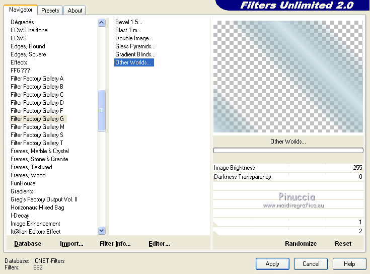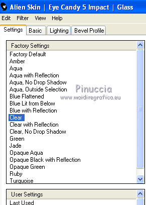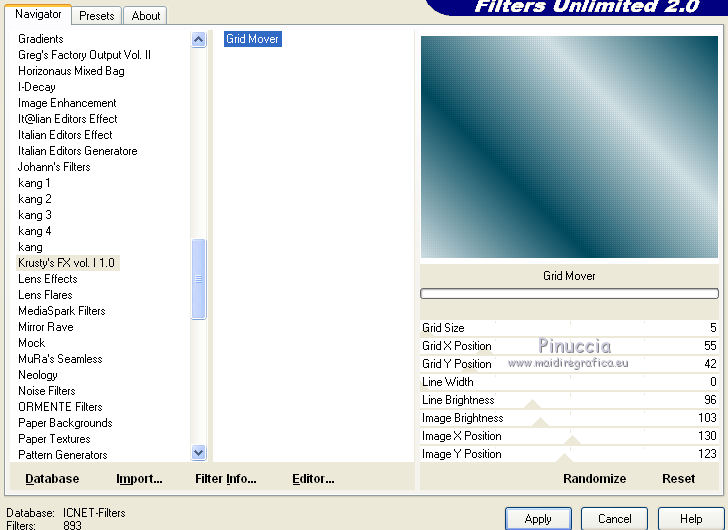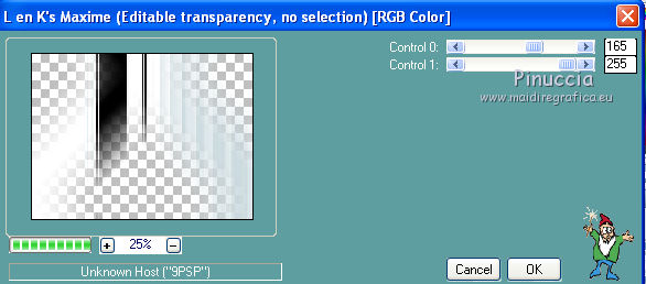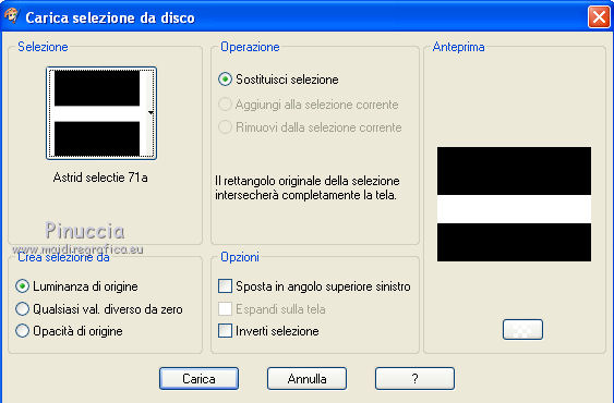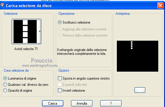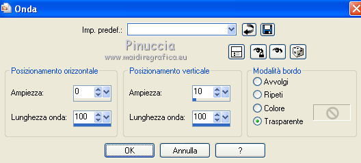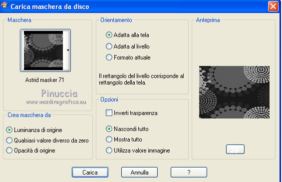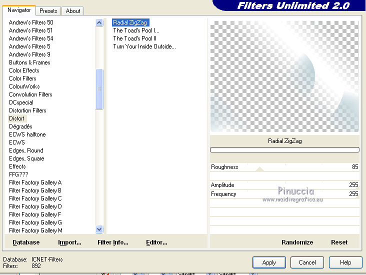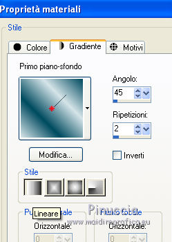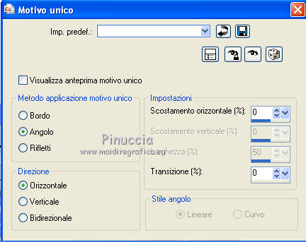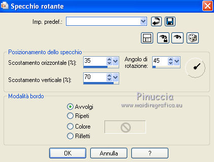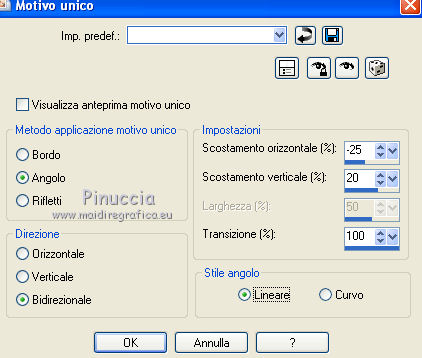 qui puoi trovare qualche risposta ai tuoi dubbi. Se l'argomento che ti interessa non è presente, ti prego di segnalarmelo. Per tradurre questo tutorial ho usato PSP X. Questo tutorial è una creazione di ©Araemae e non può essere copiato su altri siti nè essere offerto per il download. Lo stesso vale per la mia traduzione. Il materiale viene da vari gruppi di condivisione. Il copyright appartiene ai rispettivi autori. Grazie ai creatori dei tubes che mettono a disposizione il loro lavoro in vari gruppi di condivisione. Occorrente: Materiale qui Il tube della donna è di Gerry. Filtri: consulta, se necessario, la mia sezione filtri qui Alien Skin Eye Candy 5 Impact qui L&K - L&K Maxime qui Filters Unlimited 2.0 qui Filter Factory Gallery G - Other Worlds qui Krusty's FX vol. I 1.0 - Grid Mover qui Distort - Radial ZigZag qui I filtri Factory Gallery per essere usati devono prima essere convertiti. Come fare vedi qui Si usano importandoli in Filters Unlimited (come fare vedi qui) ma possono funzionare anche da soli. Anche i filtri Krusty e Distort si possono usare in entrambi i modi. ![]() Metti la maschera nella cartella Maschere. Metti le selezioni nella cartella Selezioni. se stai usando altri colori, sei libero di sperimentare le modalità di miscelatura più adatte 1. Scegli due colori dal tuoi tubes, e imposta il colore di primo piano con il colore chiaro, e il colore di sfondo con il colore scuro. Questi i miei colori. ![]() Passa il colore di primo piano a Gradiente, con i seguenti settaggi. ![]() Apri una nuova immagine trasparente 800 x 600 pixels, e riempila con il gradiente.2. Livelli>Duplica. Effetti>Plugins>Filters Unlimited 2.0 - Filter Factory Gallery G - Other Worlds. ![]() 3. Effetti>Plugins>Filters Unlimited - Distort - Radial ZigZag. ![]() 4. Livelli>Duplica. Immagine>Rifletti. 5. Chiudi il livello inferiore e rimani posizionato sul livello superiore. Livelli>Unisci>Unisci visibile. Riapri il livello inferiore e rimani sempre sul livello superiore. 6. Effetti>Plugins>L&K - L&K Maxime. ![]() 7. Effetti>Effetti di immagine>Motivo unico. ![]() Effetti>Effetti di bordo>Aumenta. 8. Attiva il livello inferiore. Effetti>Plugins>Filters Unlimited 2.0 - Krusty's FX vol. I 1.0 - Grid Mover. ![]() 9. Effetti>Effetti di riflesso>Specchio rotante. ![]() 10. Livelli>Duplica Immagine>Capovolgi. Effetti>Effetti di bordo>Aumenta. Cambia la modalità di miscelatura di questo livello in Moltiplica. 11. Livelli>Nuovo livello raster. Riempi con il colore di sfondo.12. Livelli>Carica/Salva maschera>Carica maschera da disco. Cerca e carica la maschera "Astrid masker 71". ![]() Livelli>Unisci>Unisci gruppo. Cambia la modalità di miscelatura di questo livello in Moltiplica. 13. Livelli>Nuovo livello raster. Selezione>Carica/Salva selezione>Carica selezione da disco. Cerca e carica la selezione "Astrid selectie 71". ![]() Riempi la selezione con il colore di primo piano.Selezione>Modifica>Contrai - 1 pixel. Riempi la selezione con il colore di sfondo.Selezione>Deseleziona. 14. Livelli>Duplica. Attiva il livello sottostante dell'originale. Effetti>Effetti di distorsione>Vento - da sinistra - intensità 100. ![]() Cambia la modalità di miscelatura di questo livello in Filtra. Attiva il livello superiore. 15. Livelli>Nuovo livello raster. Selezione>Carica/Salva selezione>Carica selezione da disco. Cerca e carica la selezione "Astrid selectie 71a". ![]() Riempi la selezione con con il gradiente iniziale.Selezione>Deseleziona. Effetti>Effetti di bordo>Aumenta. 16. Effetti>Effetti di distorsione>Onda. ![]() 17. Effetti>Effetti di immagine>Motivo unico. ![]() Cambia la modalità di miscelatura di questo livello in Moltiplica. 18. Livelli>Duplica. Cambia la modalità di miscelatura di questo livello in Filtra. ![]() 19. Apri il tube "Astrid tekst 71" e vai a Modifica>Copia. Torna al tuo lavoro e vai a Modifica>Incolla come nuovo livello. 20. Effetti>Effetti di immagine>Scostamento. ![]() 21. Effetti>Effetti di distorsione>Onda. ![]() 22. Effetti>Effetti di immagine>Motivo unico. ![]() 23. Attiva lo strumento Pennello ![]() seleziona il pennello +arrotondato (nelle versioni più recenti Corel_01_003). ![]() ![]() Applica il pennello al centro dei cerchi scuri, cliccando con il tasto sinistro del mouse per usare il colore di primo piano. ![]() 24. Effetti>Plugins>Alien Skin Eye Candy 5 Impact - Glass. Seleziona il preset Clear e ok. ![]() Cambia la modalità di miscelatura di questo livello in Filtra. 25. Livelli>Unisci>Unisci tutto. Immagine>Ridimensiona, al 75%, tutti i livelli selezionato. 26. Immagine>Aggiungi bordatura, 1 pixel, simmetriche, con il colore di sfondo. Immagine>Aggiungi bordatura, 1 pixel, simmetriche, con il colore di primo piano. Immagine>Aggiungi bordatura, 65 pixels, simmetriche, con il colore di sfondo. Livelli>Innalza livello di sfondo. 27. Apri il tube "Gerry-sexylady89-23 jan 2012" e vai a Modifica>Copia. Torna al tuo lavoro e vai a Modifica>Incolla come nuovo livello. Immagine>Rifletti. Immagine>Ridimensiona, al 70%, tutti i livelli non selezionato. 28. Effetti>Plugins>Alien Skin Eye Candy 5 Impact - Perspective Shadow, seleziona il preset Drop Shadow, Blurry e ok. ![]() 29. Sposta il tube sul bordo interno.![]() 30. Attiva lo strumento Gomma ![]() e cancella la parte di tube (e l'ombra) esterni al bordo. ![]() 31. Livelli>Unisci>Unisci tutto. Immagine>Aggiungi bordatura, 1 pixel, simmetriche, con il colore di primo piano. Immagine>Aggiungi bordatura, 1 pixel, simmetriche, con il colore di sfondo. 32. Aggiungi il tuo nome e/o il tuo watermark su un nuovo livello. 33. Livelli>Unisci>Unisci tutto e salva in formato jpg. ![]() Le votre versioni. Grazie ![]() ![]() Kamelius ![]() Se hai problemi o dubbi, o trovi un link non funzionante, o anche soltanto per un saluto, scrivimi. 7 Marzo 2012 |