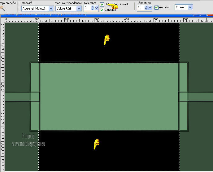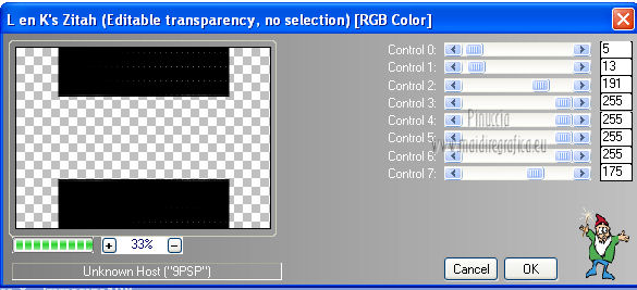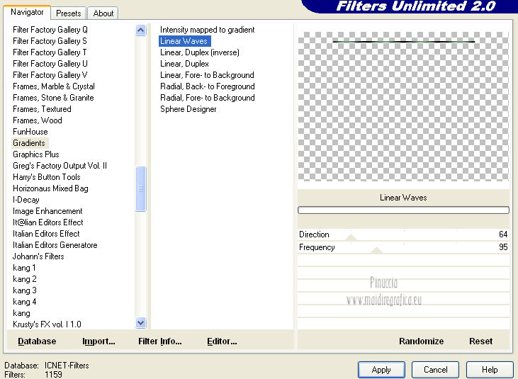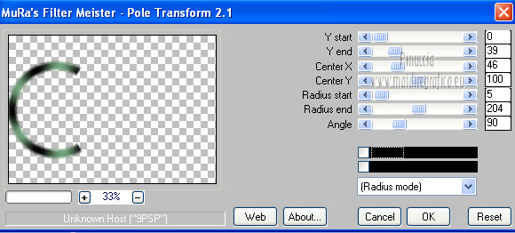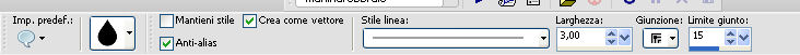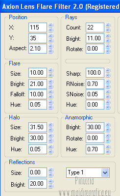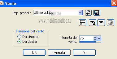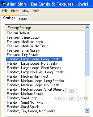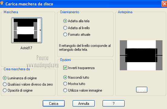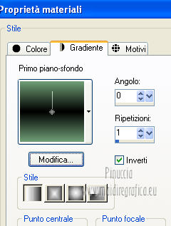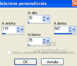 qui puoi trovare qualche risposta ai tuoi dubbi. Se l'argomento che ti interessa non è presente, ti prego di segnalarmelo. Per tradurre questo tutorial ho usato PSP X. Questo tutorial è una creazione di ©Araemae e non può essere copiato su altri siti nè essere offerto per il download. Lo stesso vale per la mia traduzione. Il materiale viene da vari gruppi di condivisione. Il copyright appartiene ai rispettivi autori. Grazie ai creatori dei tubes che mettono a disposizione il loro lavoro in vari gruppi di condivisione. Occorrente: Materiale qui Il tube è di @nn. Grazie. Filtri: consulta, se necessario, la mia sezione filtri qui Filters Unlimited 2.0 qui Mura's Meister - Pole Transform 2.1 qui Axion - LensFlare qui AAA Frames - Foto Frame qui Mura's Meister - Copies qui Alien Skin Eye Candy 5 Textures - Swirl qui FM Tile Tools - Blend Emboss qui L&K - L&K Zitah qui ![]() se stai usando altri colori, sei libero di sperimentare le modalità di miscelatura più adatte Metti la maschera nella cartella Maschere. 1. Scegli un colore dal tuo tube e impostalo come colore di primo piano. Imposta il colore di sfondo con il colore nero. ![]() Apri una nuova immagine trasparente 700 x 500 pixels, e riempila con il colore di primo piano.Livelli>Nuovo livello raster. Riempi con il colore nero.2. Livelli>Carica/Salva maschera>Carica maschera da disco. Cerca e carica la maschera "Astrid 17". ![]() Livelli>Unisci>Unisci gruppo. Rinomina questo livello "maschera". 3. Attiva lo strumento Bacchetta magica ![]() e clicca sulle due strisce nere per selezionarle. ![]() Livelli>Nuovo livello raster. Riempi la selezione con il colore di sfondo.Selezione>Deseleziona. 4. Effetti>Plugins>L&K's - L&K's Zitah. ![]() 5. Attiva il livello "maschera". Clicca nel rettangolo centrale con la bacchetta magica ![]() ![]() Attiva il livello superiore. Livelli>Nuovo livello raster. Riempi il livello con il colore di primo piano.Effetti>Effetti di trama>Veneziana - colore nero. ![]() Selezione>Deseleziona. 6. Attiva nuovamente il livello "Maschera". Clicca con la bacchetta magica nei quattro angoli per selezionarli.![]() Attiva il livello Raster 1. Effetti>Plugins>Alien Skin Eye Candy 5 Texture - Swirl. ![]() Regola>Morbidezza>Accentua attenuazione. Selezione>Deseleziona. 7. Attiva ancora il livello superore. Livelli>Nuovo livello raster. Attiva lo strumento Forme predefinite ![]() e seleziona la forma "Goccia" con i seguenti settaggi. ![]() Traccia la forma in alto a sinistra, come nell'esempio. ![]() Livelli>Converti in livello raster. 8. Effetti>Plugins>Mura's Meister - Copies. ![]() 9. Effetti>Effetti di distorsione>Vento - da destra intensità 75. ![]() 10. Effetti>Effetti di bordo>Aumenta. Livelli>Duplica. Immagine>Rifletti. 11. Livelli>Nuovo livello raster. Attiva lo strumento Selezione ,clicca sull'icona Selezione personalizzata ![]() e imposta i seguenti settaggi: ![]() Riempi la selezione con il colore di primo piano.Selezione>Deseleziona. 12. Effetti>Plugins>Filters Unlimited 2.0 - Gradients - Linear Waves. ![]() 13. Effetti>Plugins>Mura's Meister - Pole Transform 2.1 ![]() Effetti>Effetti di bordo>Aumenta. Livelli>Duplica. Immagine>Rifletti. Livelli>Unisci>Unisci giù. Abbassa l'opacità di questo livello al 35%. Effetti>Effetti di bordo>Aumenta. 14. Effetti>Plugins>FM Tile Tools - Blend Emboss, con i settaggi standard. ![]() 15. Livelli>Nuovo livello raster. Effetti>Plugins>Axion - Lensflare. ![]() Livelli>Duplica. Immagine>Rifletti. Livelli>Unisci>Unisci giù. 16. Apri il tube "@nn_040707_face_112_Kryan2_tdstudio" e vai a Modifica>Copia. Torna al tuo lavoro e vai a Modifica>Incolla come nuovo livello. Immagine>Ridimensiona, all'80%, tutti i livelli non selezionato. Spostalo 17. Effetti>Effetti 3D>Sfalsa ombra, con il colore nero. ![]() Modifica>Ripeti Sfalsa ombra. 18. Livelli>Nuovo livello raster. Attiva lo strumento Testo e scegli un font.Per il mio esempio ho usato il font Trubble Inverti i colori nella paletta dei materiali. Chiudi il colore di primo piano, e passa il colore di sfondo a Gradiente. ![]() In basso a destra, scrivi "Longing" o quello che preferisci. Livelli>Converti in livello raster. Effetti>Effetti 3D>Sfalsa ombra, con il colore nero. ![]() 19. Immagine>Aggiungi bordatura, 1 pixel, simmetriche, con il colore nero. Immagine>Aggiungi bordatura, 30 pixels, simmetriche, con il colore di primo piano. Effetti>Plugins>AAA Frames - Foto Frame. ![]() 20. Aggiungi il tuo nome e/o il tuo watermark su un nuovo livello. Livelli>Unisci>Unisci tutto e salva in formato jpg. ![]() Se hai problemi o dubbi, o trovi un link non funzionante, o anche soltanto per un saluto, scrivimi. 10 Agosto 2012 |