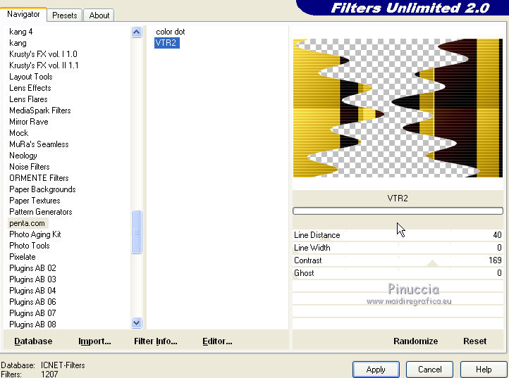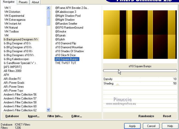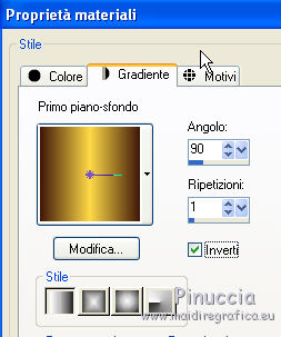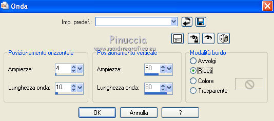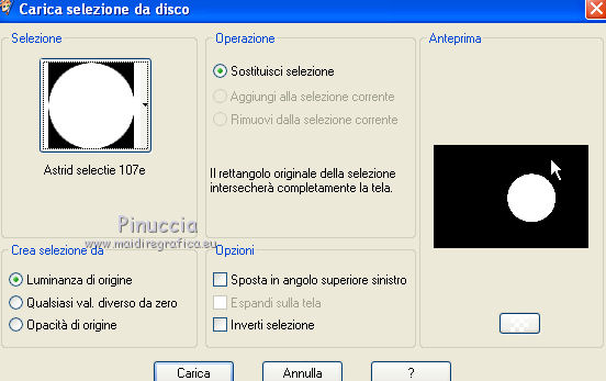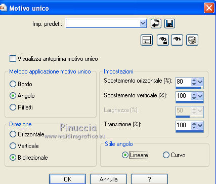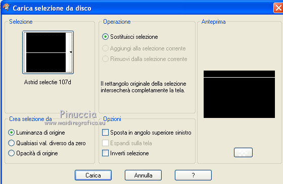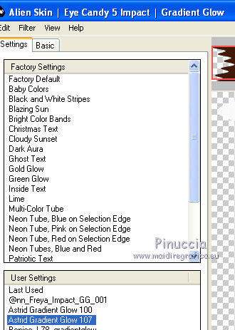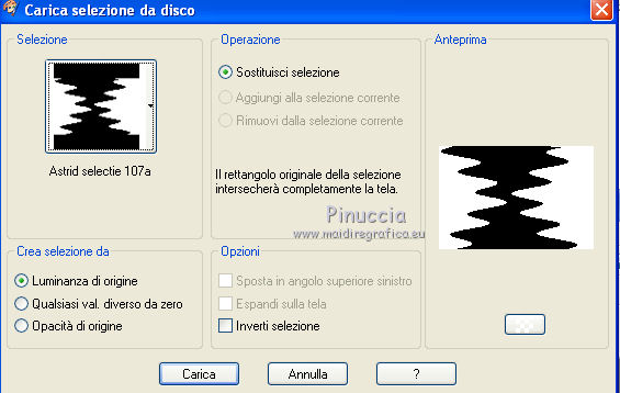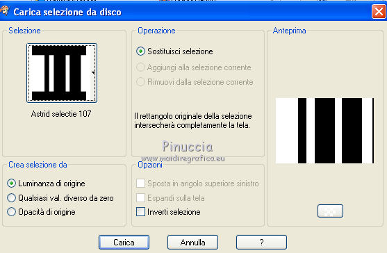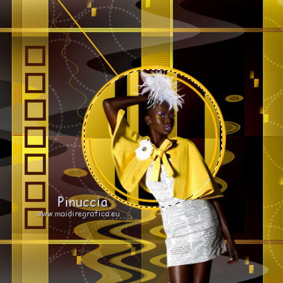 qui puoi trovare qualche risposta ai tuoi dubbi. Se l'argomento che ti interessa non è presente, ti prego di segnalarmelo. Per tradurre questo tutorial ho usato PSP X. Questo tutorial è una creazione di ©Araemae e non può essere copiato su altri siti nè essere offerto per il download. Lo stesso vale per la mia traduzione. Il materiale viene da vari gruppi di condivisione. Il copyright appartiene ai rispettivi autori. Grazie ai creatori dei tubes che mettono a disposizione il loro lavoro in vari gruppi di condivisione. Occorrente: Materiale qui Per il tube utilizzato grazie Annelies Filtri: consulta, se necessario, la mia sezione filtri qui Filters Unlimited 2.0 qui Plugin Galaxy - Alpha Tool qui Penta.com - VTR2 qui &<Background Designers IV> - sf10 Square Bumps (da importare in Unlimited) qui Alien Skin Eye Candy 5 Impact qui I filtri Penta.com si possono usare da soli o importati in Filters Unlimited 2.0 ![]() Metti il preset nella cartella del filtro Alien Skin Eye Candy 5 Impact>Settings>Gradient glow. Cliccando sul file, automaticamente il preset si installerà nella cartella corretta. Metti le selezioni nella cartella Selezioni. se stai usando altri colori, sei libero di sperimentare le modalità di miscelatura più adatte 1. Scegli due colori dal tuo tube, imposta il colore di primo piano con il colore chiaro, e il colore di sfondo con il colore scuro. I miei colori: ![]() Apri una nuova immagine trasparente 900 x 600 pixels. 2. Selezione>Carica/Salva selezione>Carica selezione da disco. Cerca e carica la selezione "Astrid selectie 107". ![]() Riempi la selezione con il colore di primo piano.3. Selezione>Inverti. Riempi la selezione con il colore di sfondo.Selezione>Deseleziona. 4. Effetti>Plugins>Filters Unlimited 2.0 &<Background Designer IV> - sf10 Square Bumps. ![]() Regola>Messa a fuoco>Accentua messa a fuoco. 5. Livelli>Duplica. Effetti>Plugins>Plugin Galaxy - Alpha Tool. ![]() 6. Immagine>Capovolgi. Effetti>Plugins>Alien Skin Eye Candy 5 Impact - Perspective Shadow. Seleziona il preset Drop Shadow Blurry e ok. ![]() 7. Attiva il livello inferiore. Selezione>Carica/Salva selezione>Carica selezione da disco. Cerca e carica la selezione "Astrid selectie 107a". ![]() Selezione>Innalza selezione a livello. 9. Effetti>Plugins>Filters Unlimited 2.0 - Penta.com - VTR2. ![]() Cambia la modalità di miscelatura di questo livello in Luce netta. Selezione>Deseleziona. 10. Attiva il livello superiore. Livelli>Nuovo livello raster. Selezione>Carica/Salva selezione>Carica selezione da disco. Cerca e carica la selezione "Astrid selectie 107b". ![]() Riempi la selezione con il colore di sfondo.11. Effetti>Plugins>Alien Skin Eye Candy 5 Impact - Gradient Glow. Seleziona il preset Astrid Gradient Glow 107 e ok. ![]() Selezione>Deseleziona. 12. Effetti>Effetti di immagine>Motivo unico. ![]() Abbassa l'opacità di questo livello al 30%. 13. Apri "Astrid deco 107" e vai a Modifica>Copia. Torna al tuo lavoro e vai a Modifica>Incolla come nuovo livello. Cambia la modalità di miscelatura di questo livello in Filtra. 14. Livelli>Nuovo livello raster. Selezione>Carica/Salva selezione>Carica selezione da disco. Cerca e carica la selezione "Astrid selectie 107c". ![]() Riempi la selezione con il colore di sfondo.Selezione>Modifica>Contrai - 6 pixels. Premi sulla tastiera il tasto CANC. Selezione>Deseleziona. 14. Passa il colore di primo piano a Gradiente. ![]() 15. Livelli>Nuovo livello raster. Selezione>Carica/Salva selezione>Carica selezione da disco. Cerca e carica la selezione "Astrid selectie 107d". ![]() Riempi la selezione con il gradiente.Regola>Messa a fuoco>Accentua messa a fuoco. Selezione>Deseleziona. 16. Livelli>Duplica. Immagine>Capovolgi. 17. Apri "Astrid deco 107a" e vai a Modifica>Copia. Torna al tuo lavoro e vai a Modifica>Incolla come nuovo livello. Cambia la modalità di miscelatura di questo livello in Luce diffusa, e abbassa l'opacità al 70%. 18. Attiva il livello inferiore. Modifica>Copia. Attiva nuovamente il livello superiore. Livelli>Nuovo livello raster. Selezione>Carica/Salva selezione>Carica selezione da disco. Cerca e carica la selezione "Astrid selectie 107e". ![]() Modifica>Incolla nella selezione. Selezione>Deseleziona. 19. Apri "Astrid deco 107b" e vai a Modifica>Copia. Torna al tuo lavoro e vai a Modifica>Incolla come nuovo livello. Spostalo come nell'esempio.![]() Livelli>Unisci>Unisci giù. 20. Livelli>Duplica, e attiva il livello sottostante dell'originale. Effetti>Effetti di distorsione>Onda. ![]() Abbassa l'opacità di questo livello al 50%. Attiva nuovamente il livello superiore. 21. Selezione>Carica/Salva selezione>Carica selezione da disco. Carica nuovamente la selezione "Astrid selectie 107e". ![]() 22. Apri il tube "Alies 9VR25-woman-02072012" e vai a Modifica>Copia. non chiuderlo. Lo userai ancora Torna al tuo lavoro e vai a Modifica>Incolla come nuovo livello. Posiziona il tube nell'area selezionata.![]() Selezione>Inverti. Premi sulla tastiera il tasto CANC. Selezione>Deseleziona. Abbassa l'opacità di questo livello al 45%. 23. Apri "Astrid tekst 107" e vai a Modifica>Copia. Torna al tuo lavoro e vai a Modifica>Incolla come nuovo livello. Posiziona il testo come nell'esempio.![]() 24. Attiva nuovamente il tube "Alies 9VR25-woman-02072012" e vai a Modifica>Copia. Torna al tuo lavoro e vai a Modifica>Incolla come nuovo livello. Immagine>Ridimensiona, al 90%, tutti i livelli non selezionato. Immagine>Rifletti. Spostalo a sinistra, come nel mio esempio.25. Effetti>Plugins>Alien Skin Eye Candy 5 Impact - Perspective Shadow, con i settaggi precedenti. ![]() 26. Immagine>Aggiungi bordatura, 1 pixel, simmetriche, con il colore di sfondo. Immagine>Aggiungi bordatura, 10 pixels, simmetriche, con il colore di primo piano. 27. Aggiungi il tuo nome e/o il tuo watermark su un nuovo livello. Livelli>Unisci>Unisci tutto e salva in formato jpg. Per questo esempio ho usato un tube di Mary. ![]() ![]() Se hai problemi o dubbi, o trovi un link non funzionante, o anch