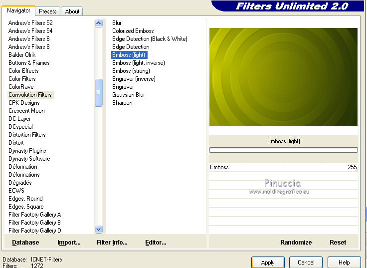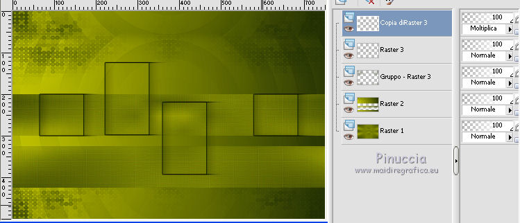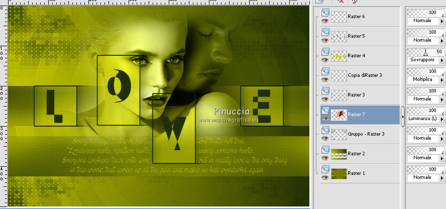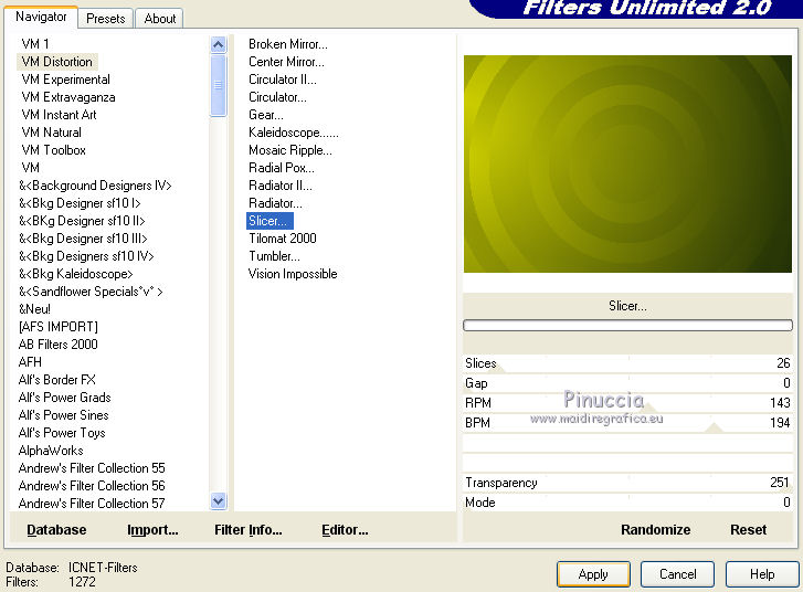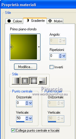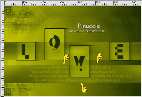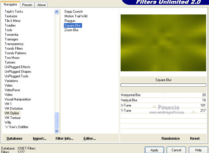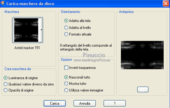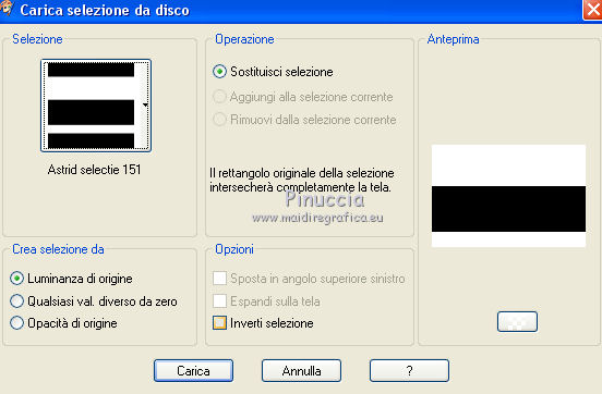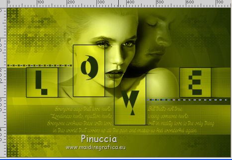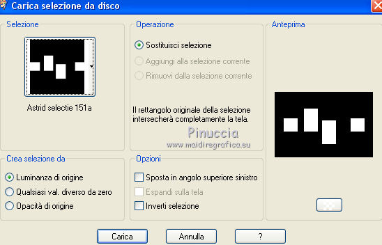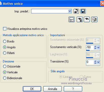 qui puoi trovare qualche risposta ai tuoi dubbi. Se l'argomento che ti interessa non è presente, ti prego di segnalarmelo. Questo tutorial è stato creato con PSPX5 e tradotto con PSPX, ma può essere eseguito anche con le altre versioni di PSP. Dalla versione X4, il comando Immagine>Rifletti è stato sostituito con Immagine>Capovolgi in orizzontale, e il comando Immagine>Capovolgi con Immagine>Capovolgi in verticale. Nelle versioni X5 e X6, le funzioni sono state migliorate rendendo disponibile il menu Oggetti. Con la versione X7 sono tornati i comandi Immagine>Rifletti e Immagine>Capovolgi, ma con nuove funzioni. Vedi la scheda sull'argomento qui Occorrente: Materiale qui Per il tube utilizzato grazie Nicole. Filtri: consulta, se necessario, la mia sezione filtri qui Filters Unlimited 2.0 qui VM Stylize - Square Blur qui VM Distortion Slicer qui I filtri VM Stylize e VM Distortion si possono usare da soli o importati in Filters Unlimited (come fare vedi qui) Se un filtro fornito appare con questa icona ![]() se stai usando altri colori, sei libero di sperimentare le modalità di miscelatura più adatte Nelle ultime versioni di PSP non c'è il gradiente di primo piano/sfondo (Corel_06_029) Trovi i gradienti delle versioni precedenti qui Metti i pennelli nella cartella Pennelli. Attenzione, ogni pennello è composto da due files che non devono essere separati. Vedi gli appunti sui pennelli qui Metti le selezioni nella cartella Selezioni. Metti la maschera nella cartella Maschere. 1. Scegli due colori tono su tono dal tuo tube. I miei colori. ![]() Passa il colore di primo piano a Gradiente di primo piano/sfondo, stile Sprazzo di luce. ![]() Apri una nuova immagine trasparente 750 x 500 pixels, e riempila con il gradiente.2. Effetti>Plugins>Filters Unlimited 2.0 - Tile & Mirror - Kaleidoscope 1. ![]() 3. Effetti>Plugins>Filters Unlimited 2.0 - VM Stylize - Square Blur. ![]() 4. Effetti>Effetti di bordo>Aumenta - 2 volte. 5. Livelli>Nuovo livello raster. Riempi il livello con il gradiente.6. Effetti>Plugins>Filters Unlimited 2.0 - VM Distortion - Slicer ![]() 7. Effetti>Plugins>Filters Unlimited 2.0 - Convolution Filters - Emboss (light) ![]() 8. Sullo stesso livello. Attiva lo strumento Selezione ![]() (non importa il tipo di selezione impostato, perchè con la selezione personalizzata si ottiene sempre un rettangolo) clicca sull'icona Selezione personalizzata ![]() e imposta i seguenti settaggi. ![]() Premi sulla tastiera il tasto CANC ![]() Selezione>Deseleziona. 9. Effetti>Effetti di immagine>Motivo unico. ![]() 10. Livelli>Nuovo livello raster. Selezione>Carica/Salva selezione>Carica selezione da disco. Cerca e carica la selezione "Astrid selectie 151". ![]() 11. Riempi la selezione con il colore di sfondo.Selezione>Deseleziona. 12. Livelli>Carica/Salva maschera>Carica maschera da disco. Cerca e carica la maschera "Astrid masker 151". ![]() Livelli>Unisci>Unisci gruppo. 13. Livelli>Nuovo livello raster. Selezione>Carica/Salva selezione>Carica selezione da disco. Cerca e carica la selezione "Astrid selectie 151a". ![]() 14. Riempi la selezione con il colore di sfondo.Selezione>Modifica>Contrai - 2 pixels. Premi sulla tastiera il tasto CANC. Selezione>Deseleziona. 15. Livelli>Duplica. Effetti>Effetti di distorsione>Vento - da sinistra, intensità 75. ![]() Cambia la modalità di miscelatura di questo livello in Moltiplica. ![]() Livelli>Duplica. 16. Livelli>Nuovo livello raster. Selezione>Carica/Salva selezione>Carica selezione da disco. Carica nuovamente la selezione "Astrid selectie 151a". ![]() 17. Selezione>Modifica>Contrai - 2 pixels. Riporta il colore di primo piano a Colore. Riempi la selezione con il colore di primo piano.Selezione>Deseleziona. Cambia la modalità di miscelatura di questo livello in Sovrapponi, e abbassa l'opacità al 50%. 18. Apri "Astrid Tekst 151" e vai a Modifica>Copia. Torna al tuo lavoro e vai a Modifica>Incolla come nuovo livello. Posiziona il testo come nell'esempio.![]() 19. Apri "Astrid Tekst 151a" e vai a Modifica>Copia. Torna al tuo lavoro e vai a Modifica>Incolla come nuovo livello. Posiziona il testo come nell'esempio.![]() 20. Apri il tube "129304187055_couples_nikita" e vai a Modifica>Copia. Torna al tuo lavoro e vai a Modifica>Incolla come nuovo livello. Spostalo un po' più in alto.21. Livelli>Disponi>Sposta giù e ripeti finchè il livello non sarà sopra la maschera. Cambia la modalità di miscelatura di questo livello in Luminanza (esistente). ![]() 22. Attiva il livello superiore. Livelli>Nuovo livello raster. Attiva lo strumento Pennello ![]() cerca e seleziona il pennello "Astrid penseel 151" ![]() Applica il pennello cliccando con il tasto destro del mouse per usare il colore di sfondo. ![]() Cambia la modalità di miscelatura di questo livello in Moltiplica. 23. Livelli>Nuovo livello raster. Attiva lo strumento Pennello ![]() cerca e seleziona il pennello "Astrid penseel 151a" ![]() Applica il pennello cliccando con il tasto sinistro del mouse per usare il colore di primo piano. ![]() Cambia la modalità di miscelatura di questo livello in Filtra. 24. Livelli>Nuovo livello raster. Attiva lo strumento Pennello ![]() cerca e seleziona il pennello "Astrid penseel 151b" ![]() Applica il pennello cliccando con il tasto destro del mouse per usare il colore di sfondo. ![]() Cambia la modalità di miscelatura di questo livello in Luce diffusa. 25. Immagine>Aggiungi bordatura, 5 pixels, simmetriche, colore di sfondo. Immagine>Aggiungi bordatura, 1 pixel, simmetriche, colore di primo piano. Immagine>Aggiungi bordatura, 15 pixels, simmetriche, colore di sfondo. 26. Firma il tuo lavoro su un nuovo livello. Livelli>Unisci>Unisci tutto e salva in formato jpg. ![]() Se hai problemi o dubbi, o trovi un link non funzionante, o anche soltanto per un saluto, scrivimi. 21 Luglio 2016 |