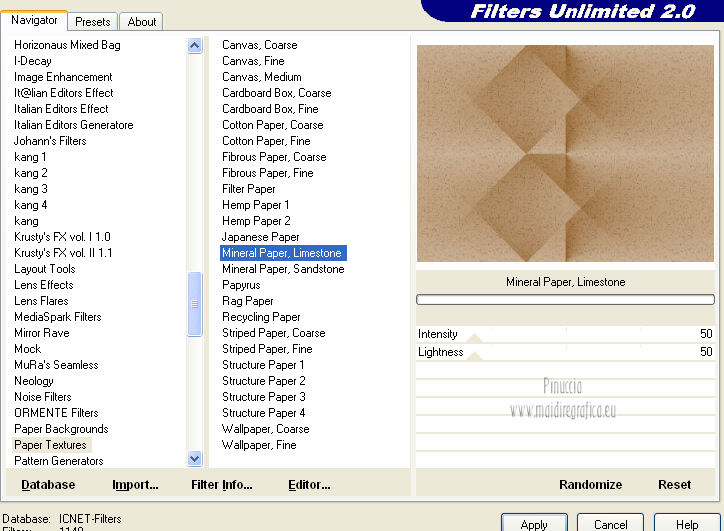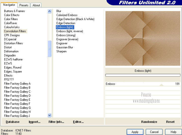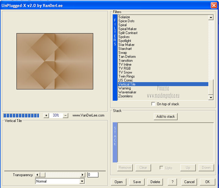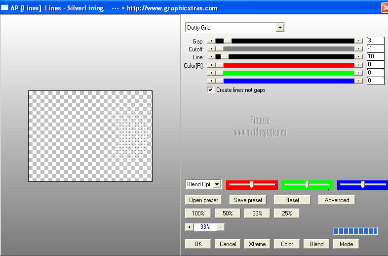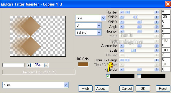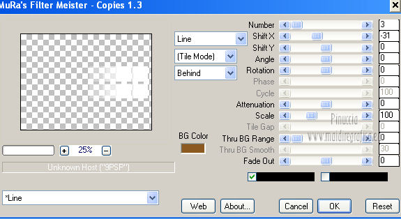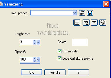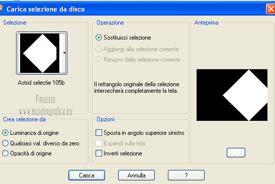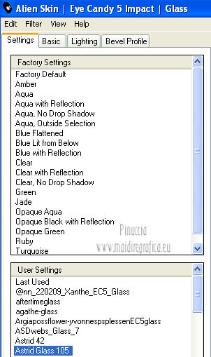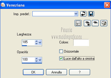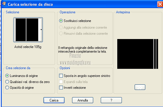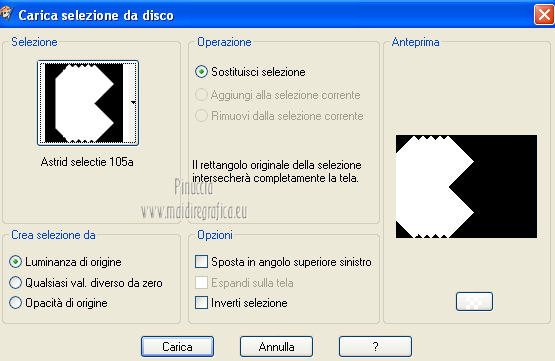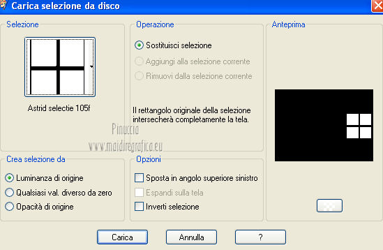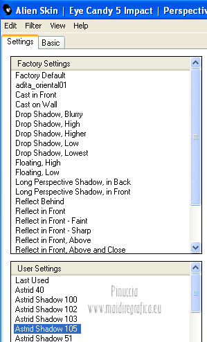 qui puoi trovare qualche risposta ai tuoi dubbi. Se l'argomento che ti interessa non è presente, ti prego di segnalarmelo. Per tradurre questo tutorial ho usato PSP X. Questo tutorial è una creazione di ©Araemae e non può essere copiato su altri siti nè essere offerto per il download. Lo stesso vale per la mia traduzione. Il materiale viene da vari gruppi di condivisione. Il copyright appartiene ai rispettivi autori. Grazie ai creatori dei tubes che mettono a disposizione il loro lavoro in vari gruppi di condivisione. Occorrente: Materiale qui Il tube della donna è di Joanie Filtri: consulta, se necessario, la mia sezione filtri qui Filters Unlimited 2.0 qui VanDerLee Unplugged X qui AP Lines - Lines SilverLining qui Alien Skin Eye Candy 5 Impact - Perspective Shadow qui Mura's Meister - Copies qui ![]() Metti i preset "Astrid Shadow 104" e "Astrid Glass 105" nelle rispettiva cartelle del filtro. Con un doppio clic sul file, il preset sarà automaticamente installato nella cartella corretta. Metti le selezioni nella cartella Selezioni. se stai usando altri colori, sei libero di sperimentare le modalità di miscelatura più adatte 1. Scegli un colore chiaro dal tube o usa il colore bianco e impostalo come colore di primo piano. Scegli un colore scuro e impostalo come colore di sfondo. I miei colori: ![]() Passa il colore di primo piano a Gradiente, stile Radiale, con i seguenti settaggi. ![]() Apri una nuova immagine trasparente 750 x 550 pixels, e riempila con il gradiente.2. Effetti>Plugins>Simple - Pizza Slice Mirror. 3. Effetti>Plugins>VanDerLee - Unplugged-X - Vertical Tile. ![]() 4. Selezione>Carica/Salva selezione>Carica selezione da disco. Cerca e carica la selezione "Astrid selectie 105". ![]() 5. Selezione>Innalza selezione a livello. Selezione>Deseleziona. 6. Attiva il livello inferiore. Effetti>Plugins>Filters Unlimited 2 - Paper Textures - Mineral Paper, Limestone. ![]() 7. Effetti>Plugins>Filters Unlimited 2 - Convolution Filters - Emboss (Light). ![]() 8. Attiva il livello superiore. Effetti>Plugins>Mura's Meister - Copies. ![]() 9. Effetti>Effetti di trama>Veneziana. ![]() 10. Selezione>Carica/Salva selezione>Carica selezione da disco. Cerca e carica la selezione "Astrid selectie 105a". ![]() 11. Effetti>Effetti 3D>Sfalsa ombra. ![]() Selezione>Deseleziona. Cambia la modalità di miscelatura di questo livello in Luminanza. 12. Livelli>Nuovo livello raster. Selezione>Carica/Salva selezione>Carica selezione da disco. Cerca e carica la selezione "Astrid selectie 105b". ![]() 13. Riempi la selezione con il colore di sfondo.Selezione>Deseleziona. Cambia la modalità di miscelatura di questo livello in Moltiplica, e abbassa l'opacità al 75%. 14. Livelli>Nuovo livello raster. Selezione>Carica/Salva selezione>Carica selezione da disco. Cerca e carica la selezione "Astrid selectie 105c". ![]() 15. Riempi la selezione con il colore di sfondo.Selezione>Deseleziona. Cambia la modalità di miscelatura di questo livello in Moltiplica, e abbassa l'opacità al 50%. 16. Livelli>Nuovo livello raster. Selezione>Carica/Salva selezione>Carica selezione da disco. Cerca e carica la selezione "Astrid selectie 105d". ![]() 17. Riempi la selezione con il colore bianco di primo piano.Selezione>Deseleziona. 18. Livelli>Nuovo livello raster. Attiva lo strumento Aerografo ![]() ![]() Clicca, con il tasto sinistro del mouse per usare il colore di primo piano, sui punti indicati nella schermata. ![]() 20. Effetti>Plugins>Alien Skin Eye Candy 5 Impact - Glass. Seleziona il preset "Astrid Glass 105" e ok. ![]() Cambia la modalità di miscelatura di questo livello in Luminanza. 21. Livelli>Nuovo livello raster. Selezione>Carica/Salva selezione>Carica selezione da disco. Cerca e carica la selezione "Astrid selectie 105e". ![]() 22. Riempi la selezione con il colore di sfondo.Selezione>Deseleziona. 23. Livelli>Duplica. Effetti>Effetti di trama>Veneziana. ![]() 24. Livelli>Disponi>Sposta giù. Effetti>Effetti di distorsione>Vento - da sinistra, intensità 100. ![]() 25. Selezione>Carica/Salva selezione>Carica selezione da disco. Cerca e carica nuovamente la selezione "Astrid selectie 105d". ![]() Premi sulla tastiera il tasto CANC. Selezione>Deseleziona. 26. Attiva il livello superiore. Livelli>Nuovo livello raster. Selezione>Carica/Salva selezione>Carica selezione da disco. Cerca e carica la selezione "Astrid selectie 105f". ![]() 27. Riempi la selezione con il colore bianco di primo piano.Selezione>Deseleziona. Effetti>Effetti di bordo>Aumenta. 28. Livelli>Duplica. Regola>Sfocatura>Sfocatura radiale. ![]() 29. Effetti>Plugins>AP Lines - Lines SilverLining. ![]() Livelli>Disponi>Sposta giù. 30. Attiva il livello superiore. Effetti>Plugins>Mura's Meister - Copies. ![]() 31. Livelli>Nuovo livello raster. Selezione>Carica/Salva selezione>Carica selezione da disco. Cerca e carica la selezione "Astrid selectie 105g". ![]() 32. Riempi la selezione con il colore di sfondo.Selezione>Deseleziona. Cambia la modalità di miscelatura di questo livello in Moltiplica. Regola>Messa a fuoco>Metti a fuoco. 33. Apri "Astrid Deco 105" e vai a Modifica>Copia. Torna al tuo lavoro e vai a Modifica>Incolla come nuovo livello. Lascialo come sta. E' già correttamente posizionato. 34. Apri "Astrid Deco 105a" e vai a Modifica>Copia. Torna al tuo lavoro e vai a Modifica>Incolla come nuovo livello. Lascialo come sta. E' già correttamente posizionato. 35. Apri "Astrid Deco 105b" e vai a Modifica>Copia. Torna al tuo lavoro e vai a Modifica>Incolla come nuovo livello. Spostalo a destra, vicino al bordo.Cambia la modalità di miscelatura di questo livello in Moltiplica. 36. Apri "Astrid tekst 105". e vai a Modifica>Copia. Torna al tuo lavoro e vai a Modifica>Incolla come nuovo livello. 37. Effetti>Effetti di immagine>Scostamento. ![]() Mantieni la modalità di miscelatura di questo livello in Sovrapponi, opacità 50%. 38. Apri "Astrid tekst 105a" e vai a Modifica>Copia. Torna al tuo lavoro e vai a Modifica>Incolla come nuovo livell