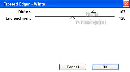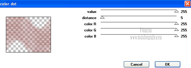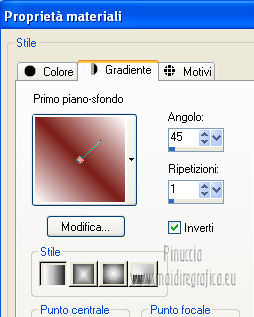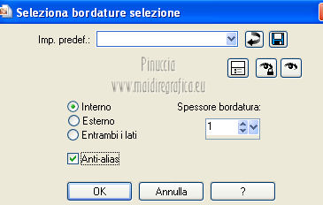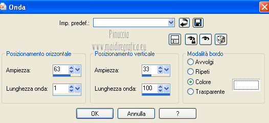 qui puoi trovare qualche risposta ai tuoi dubbi. Se l'argomento che ti interessa non è presente, ti prego di segnalarmelo. Per tradurre questo tutorial ho usato PSP X. Questo tutorial è una creazione di ©Araemae e non può essere copiato su altri siti nè essere offerto per il download. Lo stesso vale per la mia traduzione. Il materiale viene da vari gruppi di condivisione. Il copyright appartiene ai rispettivi autori. Grazie ai creatori dei tubes che mettono a disposizione il loro lavoro in vari gruppi di condivisione. Occorrente: Materiale qui Il tube della donna è di Choulene. Il tube "1252518475_noel" è di Nikita. Filtri: consulta, se necessario, la mia sezione filtri qui Penta.com - Color Dot qui Photo Tools - Frosted Edger White qui Alien Skin Eye Candy 5 Impact qui Xero - Porcelain qui Transparency - Eliminate White qui ![]() Metti la maschera nella cartella Maschere. se stai usando altri colori, sei libero di sperimentare le modalità di miscelatura più adatte 1. Imposta il colore di primo piano con un colore scuro scelto dal tube, e il colore di sfondo con il colore bianco. ![]() Apri una nuova immagine trasparente 750 x 600 pixels, e riempila con il colore di primo piano.2. Livelli>Nuovo livello raster. Selezione>Seleziona tutto. Apri il tube "1252518475_noel" e vai a Modifica>Copia. Torna al tuo lavoro e vai a Modifica>Incolla nella selezione. Selezione>Deseleziona. Regola>Sfocatura>Sfocatura gaussiana - raggio 20. ![]() 3. Livelli>Nuovo livello raster. Passa il colore di primo piano a Gradiente. ![]() Riempi il livello con il gradiente.4. Effetti>Effetti di distorsione>Onda. ![]() 5. Effetti>Plugins>Transparency - Eliminate White. 6. Effetti>Plugins>Penta.com - Color dot. ![]() 7. Livelli>Carica/Salva maschera>Carica maschera da disco. Cerca e carica la maschera 20-20. ![]() Livelli>Unisci>Unisci gruppo. 8. Livelli>Nuovo livello raster. Selezione>Seleziona tutto. Selezione>Modifica>Contrai - 75 pixels. 9. Selezione>Modifica>Seleziona bordature selezione. ![]() Riempi con il colore bianco.Selezione>Deseleziona. Rinomina questo livello "bordo bianco". 10. Modifica>Incolla come nuovo livello (il tube 1252518475_noel è ancora in memoria). Immagine>Ridimensiona, all'80%, tutti i livelli non selezionato. Modifica>Ripeti Ridimensiona. Spostalo in basso a sinistra contro il bordo bianco.Effetti>Effetti di bordo>Aumenta. 11. Apri il tube "Kerstboom1" e vai a Modifica>Copia. Torna al tuo lavoro e vai a Modifica>Incolla come nuovo livello. Immagine>Rifletti. Spostalo a destra, vedi l'esempio sotto.![]() 12. Attiva il livello "bordo bianco". Attiva lo strumento Bacchetta magica ![]() e clicca all'interno dei bordi. Attiva il livello dell'albero. Selezione>Inverti. Premi sulla tastiera il tasto CANC. Selezione>Deseleziona. 13. Apri il tube "Kerstbal" e vai a Modifica>Copia. Torna al tuo lavoro e vai a Modifica>Incolla come nuovo livello. Spostalo in alto a sinistra contro il bordo bianco.14. Apri il tube "Chou noel sexy dress" e vai a Modifica>Copia. Torna al tuo lavoro e vai a Modifica>Incolla come nuovo livello. Spostalo un po' più a sinistra.15. Effetti>Plugins>Alien Skin Eye Candy 5 Impact - Perspective Shadow. Seleziona il preset Drop Shadow Blurry e ok. ![]() 16. Attiva lo strumento Selezione , rettangolo,e seleziona la parte inferiore del tube fuori dal bordo. ![]() Premi sulla tastiera il tasto CANC. 17. Attiva nuovamente il livello "bordo bianco", e clicca nel bordo esterno con la bacchetta magica ![]() Livelli>Nuovo livello raster. Riempi la selezione con il colore di primo piano.18. Effetti>Plugins>Photo Tools - Frosted Edger White. ![]() Selezione>Deseleziona. 19. Immagine>Aggiungi bordatura, 1 pixel, simmetriche, con il colore bianco. Immagine>Aggiungi bordatura, 75 pixels, simmetriche, con il colore di primo piano. 20. Apri il tube "23.MerryChristmastekst" e vai a Modifica>Copia. Torna al tuo lavoro e vai a Modifica>Incolla come nuovo livello. Effetti>Effetti di immagine>Scostamento. ![]() 21. Livelli>Unisci>Unisci tutto. Immagine>Ridimensiona, all'80%, tutti i livelli selezionato. 22. Effetti>Plugins>Xero - Porcelain. ![]() 23. Aggiungi il tuo nome e/o il tuo watermark su un nuovo livello. Livelli>Unisci>Unisci tutto e salva in formato jpg. ![]() ![]() Se hai problemi o dubbi, o trovi un link non funzionante, o anche soltanto per un saluto, scrivimi. 10 Agosto 2012 |