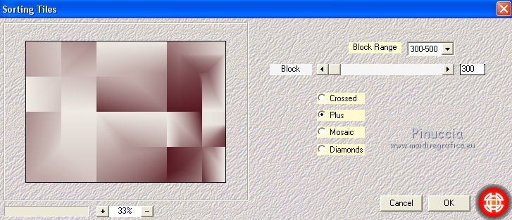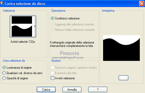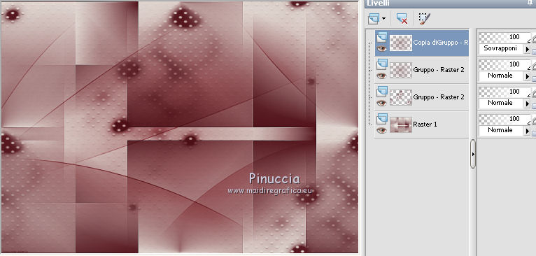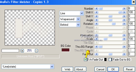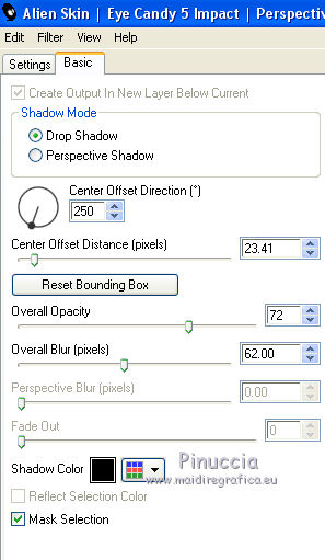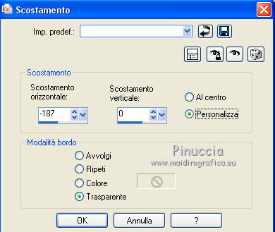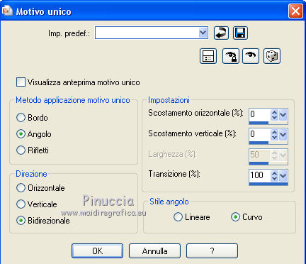qui puoi trovare qualche risposta ai tuoi dubbi. Se l'argomento che ti interessa non è presente, ti prego di segnalarmelo. Per tradurre questo tutorial ho usato PSP X. Questo tutorial è una creazione di ©Araemae e non può essere copiato su altri siti nè essere offerto per il download. Lo stesso vale per la mia traduzione. Il materiale viene da vari gruppi di condivisione. Il copyright appartiene ai rispettivi autori. Grazie ai creatori dei tubes che mettono a disposizione il loro lavoro in vari gruppi di condivisione. Occorrente: Materiale qui Per il tube usato grazie Annelies Filtri: consulta, se necessario, la mia sezione filtri qui Filters Unlimited 2.0 qui VM Toolbox - MirrororriM qui L&K landksiteofwonders - L&K's Zitah qui Mura's Meister - Copies qui Mehdi - Sorting Tiles qui Alien Skin Eye Candy 5 Impact - Perspective Shadow, Backlight qui I filtri VM Toolbox si possono usare da soli o importati in Filters Unlimited. (come fare vedi qui). Se un filtro fornito appare con questa icona Se non vuoi sentire la musica premi il tasto ESC ![]() Metti i preset Cliccando sul file una o due volte (a seconda delle tue impostazioni), automaticamente il preset si installerà nella cartella corretta. perchè uno o due clic vedi qui Metti le selezioni nella cartella Selezioni. Metti le maschere nella cartella Maschere. se stai usando altri colori, sei libero di sperimentare le modalità di miscelatura più adatte 1. Scegli due colori dal tuo tube e imposta il colore di primo piano con un colore chiaro, e il colore di sfondo con un colore scuro. I miei colori ![]() Passa il colore di primo piano a Gradiente, stile Radiale. ![]() Apri una nuova immagine trasparente 850 x 600 pixels, e riempila con il gradiente.2. Effetti>Plugins>Mehdi - Sorting Tiles ![]() Effetti>Effetti di bordo>Aumenta. 3. Effetti>Effetti di immagine>Motivo unico. ![]() 4. Effetti>Plugins>Filters Unlimited 2.0 - VM Toolbox - MirrororriM. ![]() 5. Livelli>Nuovo livello raster. Riempi il livello con il colore di sfondo.Livelli>Carica/Salva maschera>Carica maschera da disco. Cerca e carica la maschera "Astrid masker 132". ![]() Livelli>Unisci>Unisci gruppo. 6. Livelli>Nuovo livello raster. Riempi il livello con il colore di sfondo.Livelli>Carica/Salva maschera>Carica maschera da disco. Cerca e carica la maschera "Astrid masker 132a". ![]() Livelli>Unisci>Unisci gruppo. 7. Livelli>Duplica. Cambia la modalità di miscelatura di questo livello in Sovrapponi. ![]() 8. Livelli>Nuovo livello raster. Selezione>Carica/Salva selezione>Carica selezione da disco. Cerca e carica la selezione "Astrid selectie 132". ![]() 9. Riempi la selezione con il colore di sfondo.Selezione>Modifica>Contrai - 1 pixel. Riporta il colore di primo piano al colore iniziale. Riempi la selezione con il colore di primo piano.Selezione>Deseleziona. 10. Effetti>Plugins>Mura's Meister - Copies con alcune versioni le scritte non sono visibili ![]() 11. Attiva lo strumento Bacchetta magica ![]() con i seguenti settaggi. ![]() Clicca nel rettangolo per selezionarlo. ![]() Premi sulla tastiera il tasto CANC ![]() Selezione>Deseleziona. 12. Effetti>Effetti di immagine>Motivo unico, con i settaggi precedenti. ![]() Cambia la modalità di miscelatura di questo livello in Sovrapponi. ![]() Livelli>Duplica. 13. Apri "Astrid tekst 132" e vai a Modifica>Copia. Torna al tuo lavoro e vai a Modifica>Incolla come nuovo livello. 14. Effetti>Effetti di immagine>Scostamento. ![]() 15. Livelli>Duplica. Effetti>Effetti di immagine>Motivo unico, con i settaggi precedenti. ![]() 16. Livelli>Unisci>Unisci visibile. 17. Livelli>Nuovo livello raster. Selezione>Carica/Salva selezione>Carica selezione da disco. Cerca e carica la selezione "Astrid selectie 132a". ![]() 18. Effetti>Effetti 3D>Sfalsa ombra, colore di sfondo. ![]() Selezione>Deseleziona. 19. Effetti>Plugins>Alien Skin Eye Candy5 Impact - Backlight. Seleziona il preset astrid-132 e ok. ![]() Questi i settaggi che, in caso di problemi con il preset, puoi impostare manualmente. ![]() Se stai usando altri colori, regola i settaggi sotto Color: cliccando sull'icona dei cubetti si attiva il menu dei colori, e questo ti consente di scegliere i tuoi colori. ![]() 20. Livelli>Duplica. Cambia la modalità di miscelatura di questo livello in Moltiplica, e abbassa l'opacità al 50%. Attiva il livello sottostante. ![]() 21. Effetti>Plugins>L & K landksiteofwonders - L & K's Zitah. ![]() Cambia la modalità di miscelatura di questo livello in Sovrapponi. 22. Apri "Astrid Deco 132" e vai a Modifica>Copia. Torna al tuo lavoro e vai a Modifica>Incolla come nuovo livello. Spostalo in alto a sinistra.![]() Cambia la modalità di miscelatura di questo livello in Luce netta. 23. Modifica>Incolla come nuovo livello (il tube è ancora in memoria). Immagine>Ridimensiona, all'80%, tutti i livelli non selezionato Spostalo a destra, come nell'esempio.![]() Cambia la modalità di miscelatura di questo livello in Luce netta. 24. Apri il tube "Alies 1VR548-woman-20062013" e vai a Modifica>Copia. Torna al tuo lavoro e vai a Modifica>Incolla come nuovo livello. Immagine>Ridimensiona, all'80%, tutti i livelli non selezionato. Spostalo in basso a destra, contro il bordo.25. Effetti>Plugins>Alien Skin Eye Candy5 Impact - Perspective Shadow. Seleziona il preset astrid-132 e ok. ![]() Questi i settaggi che, in caso di problemi con il preset, puoi impostare manualmente. ![]() 26. Immagine>Ridimensiona, all'80%, tutti i livelli selezionato. Regola>Messa a fuoco>Metti a fuoco. 27. Immagine>Aggiungi bordatura, 1 pixel, simmetriche, con il colore di sfondo. Immagine>Aggiungi bordatura, 2 pixels, simmetriche, con il colore di primo piano. Immagine>Aggiungi bordatura, 1 pixel, simmetriche, con il colore di sfondo. Immagine>Aggiungi bordatura, 75 pixels, simmetriche, con il colore di primo piano. 28. Aggiungi il tuo nome e/o il tuo watermark su un nuovo livello. Livelli>Unisci>Unisci tutto e salva in formato jpg. Per questo esempio ho usato un tube di Gabry ![]() ![]() L